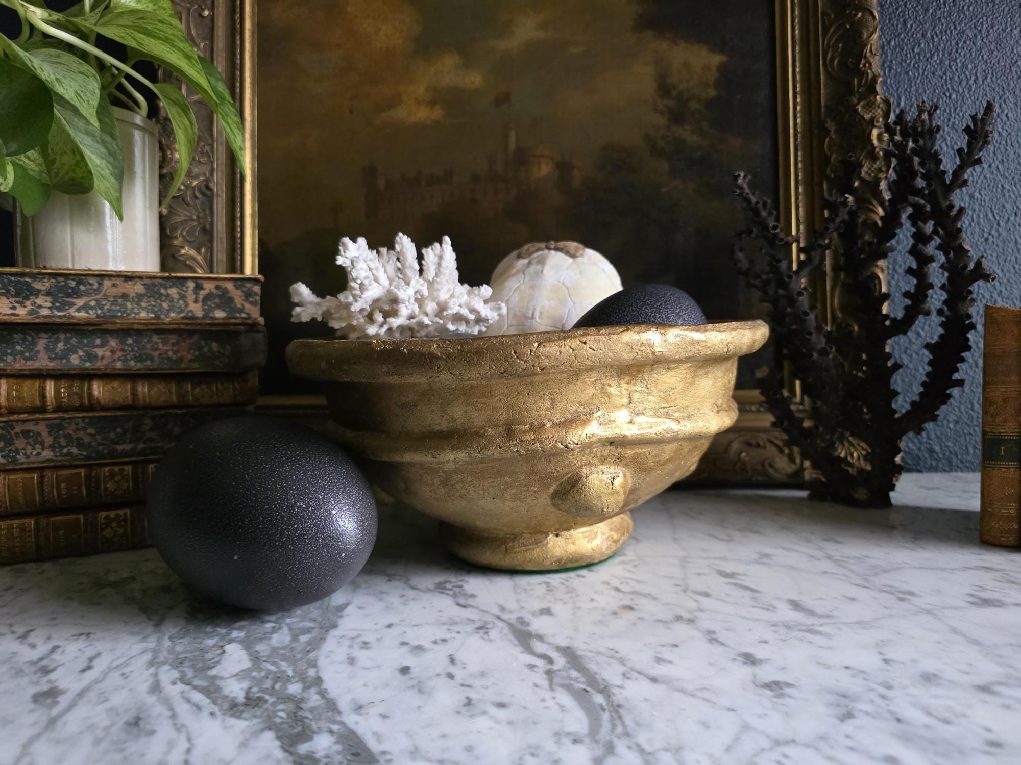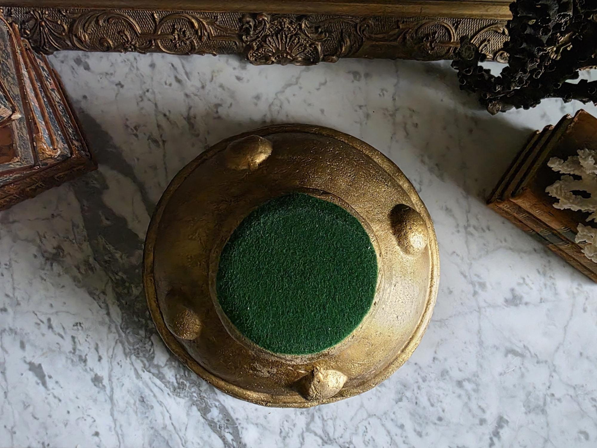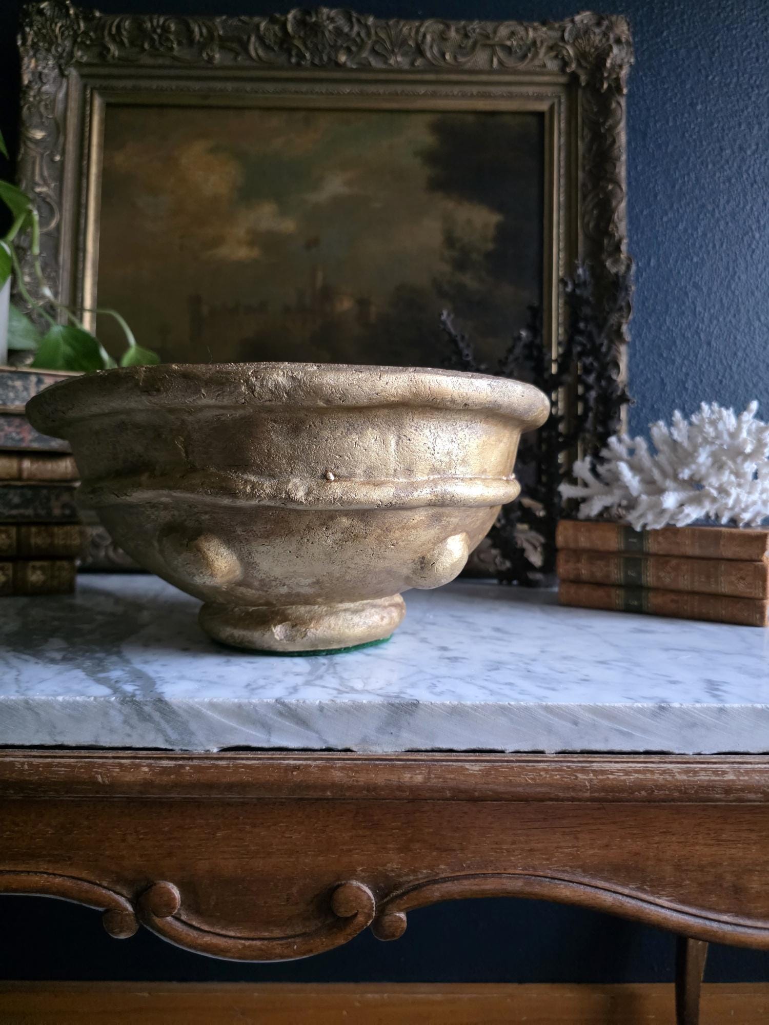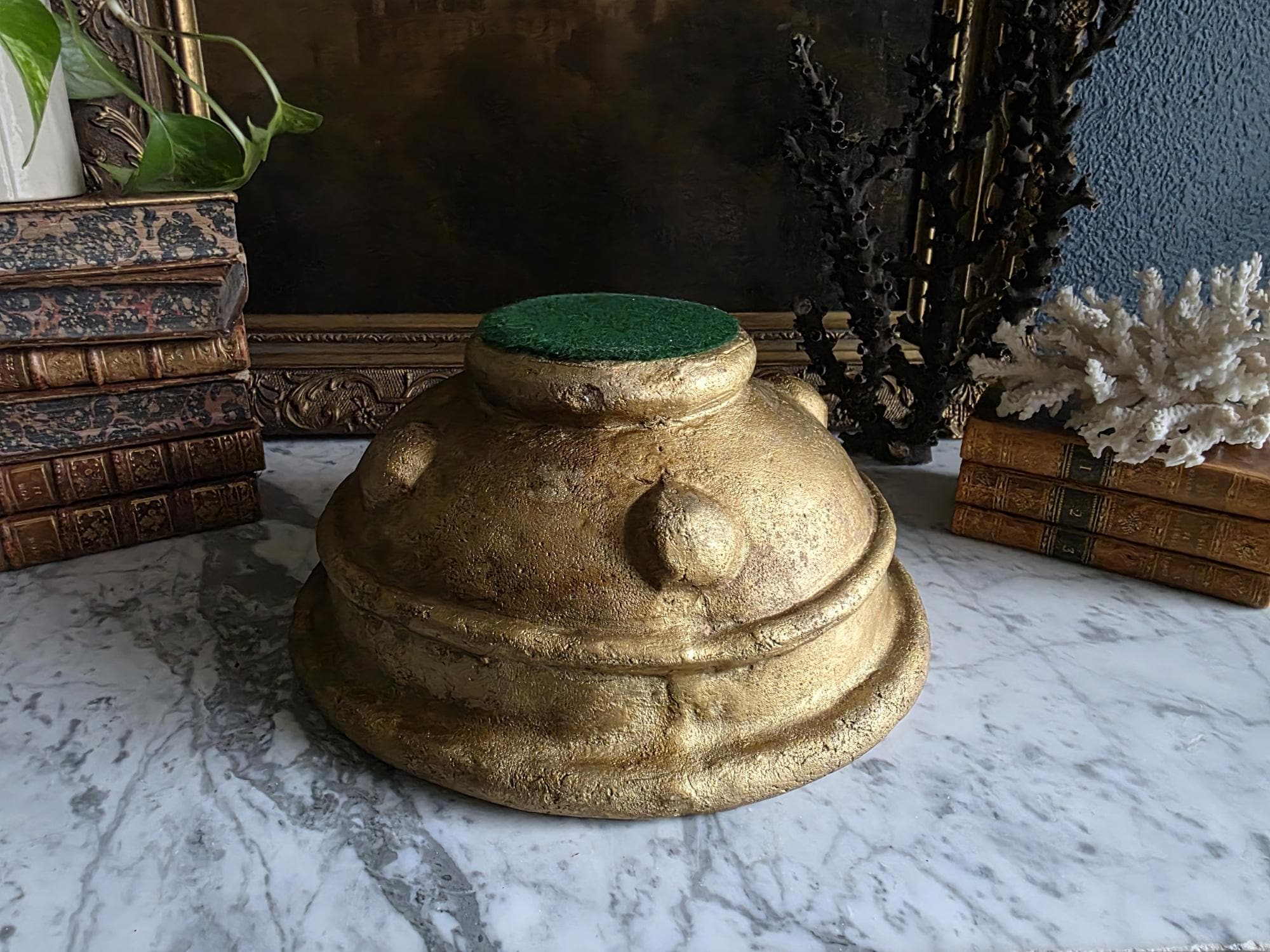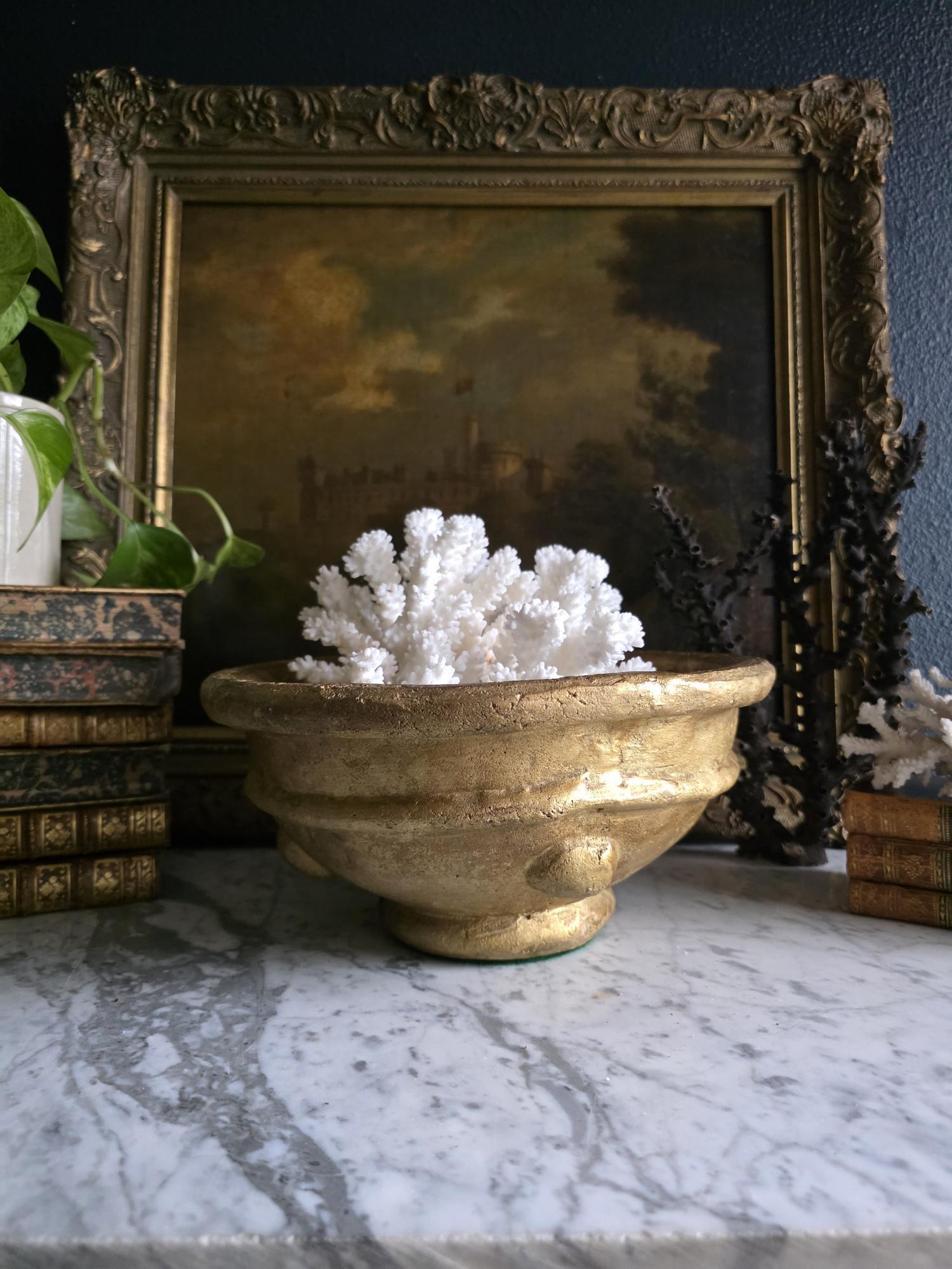 Make a bold, sculptural statement with this heavy vintage (likely mid-century Italian) ceramic bowl, featuring a striking brutalist design and a heavily textured metallic gold finish. Sitting on a sturdy pedestal foot, the wide bowl is encircled by a distinct horizontal ridge and adorned with flattened, applied ceramic knob studs around its lower half. The rustic gilding gives the piece the illusion of cast bronze or gilded concrete, adding incredible warmth and a Hollywood Regency-meets-brutalist edge to any space. The underside is finished with a protective green felt pad, making this substantial piece table-ready as a dramatic centerpiece, fruit bowl, or an elegant entryway catch-all.