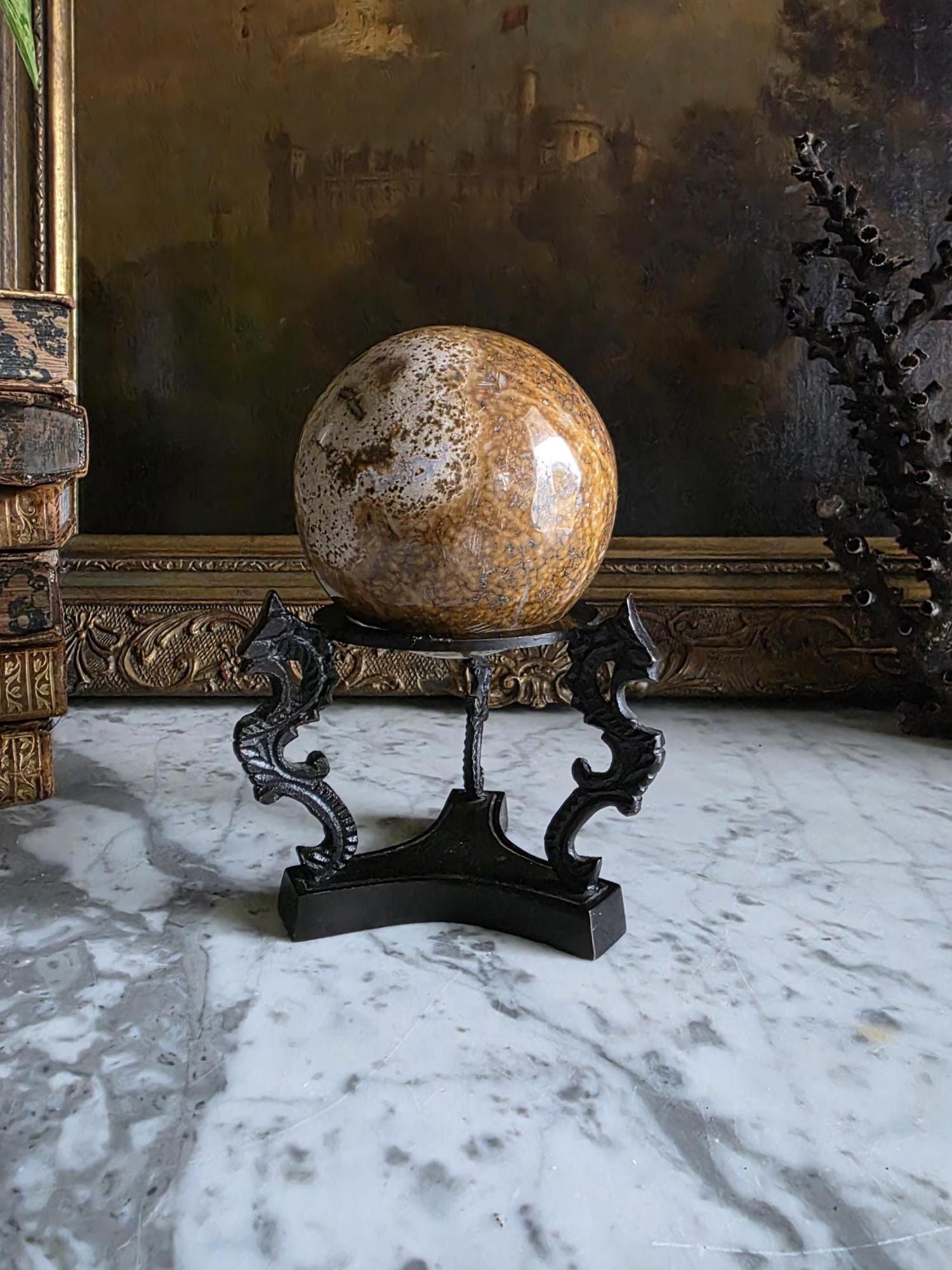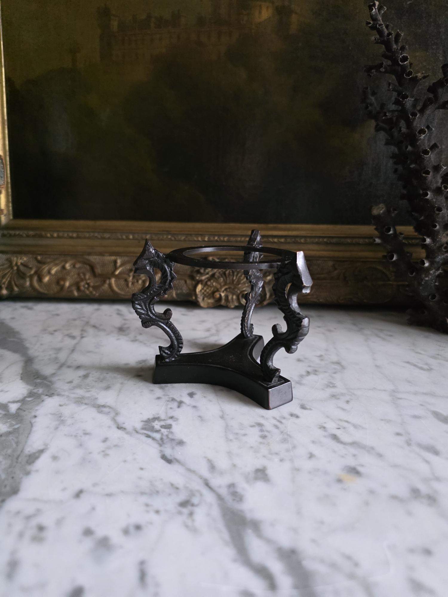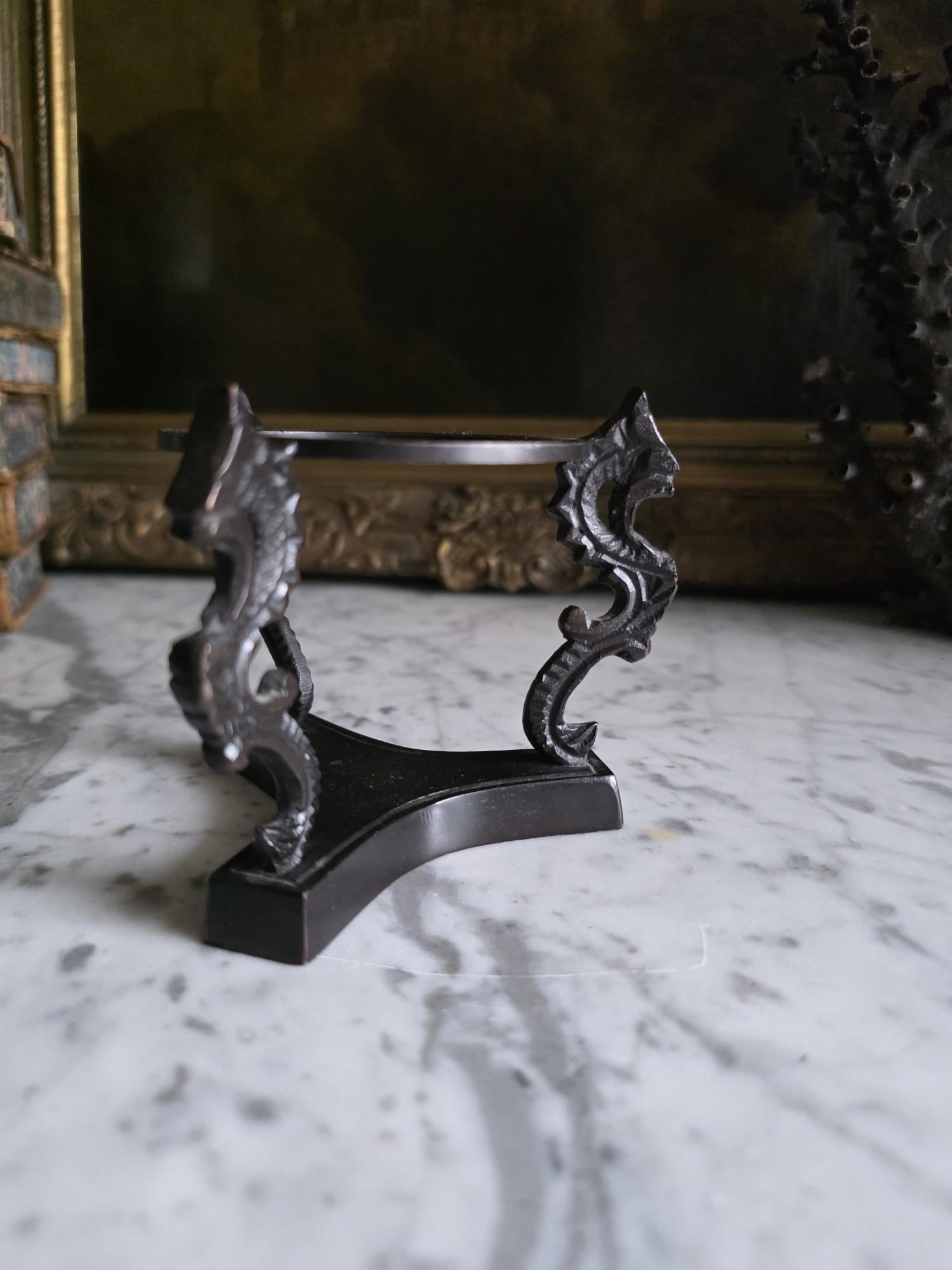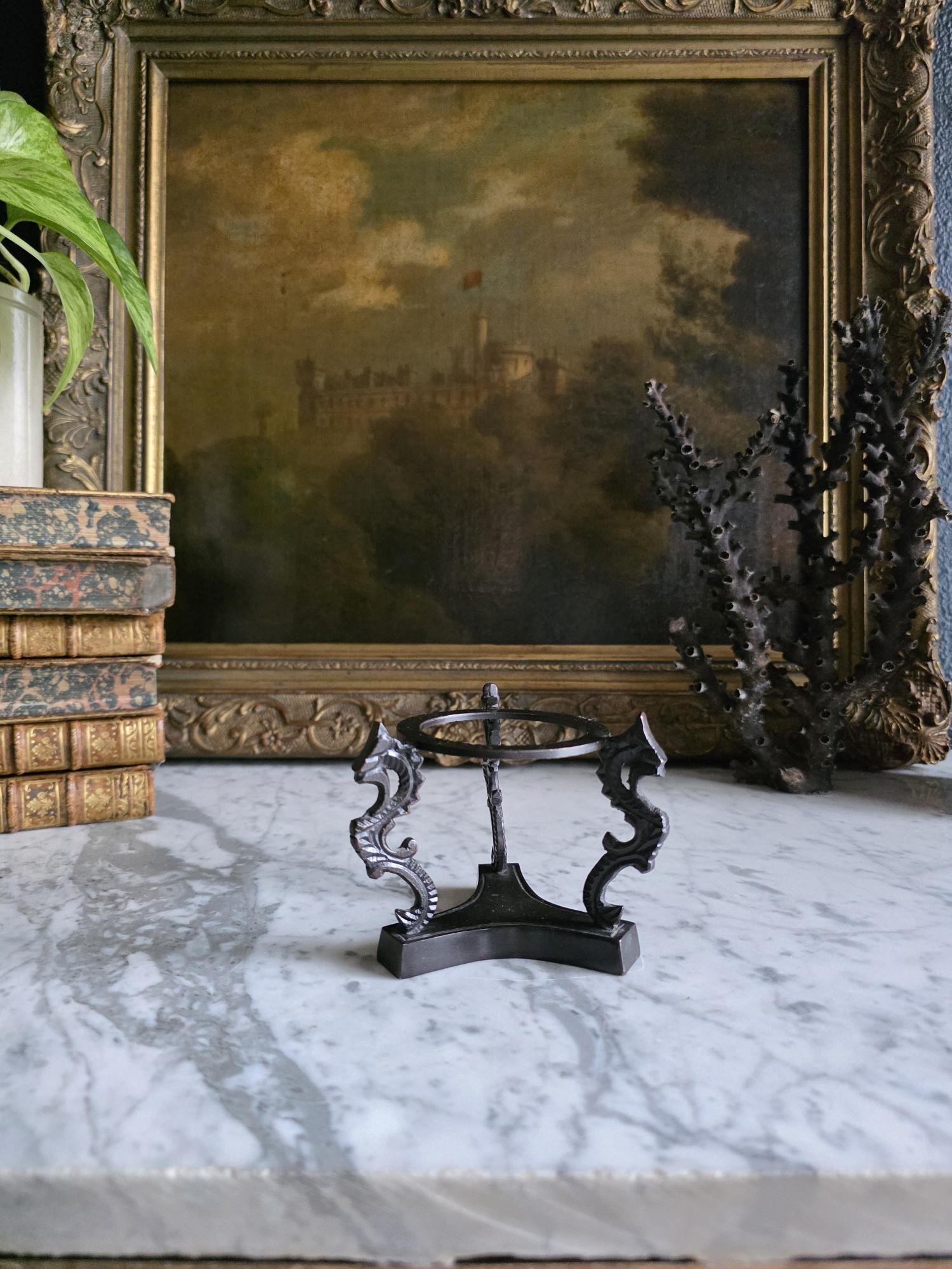Showcase your favorite geological treasures with a touch of mythological intrigue using this striking vintage cast metal sphere stand. Resting on a solid, trilobal base, the pedestal features three highly detailed supports cast in the shape of stylized dragons or sea serpents. Their curving, scaled backs gracefully hold aloft a central display ring, creating a dramatic, elevated stage for whatever sits inside. The dark, patinated metal—likely cast iron or a heavy brass alloy—gives the piece substantial weight and a distinct "cabinet of curiosities" aesthetic. Perfectly sized to cradle polished crystal spheres, mineral orbs, or small gazing balls, this ornate holder brings a touch of dark academia, Victorian gothic, or eclectic Hollywood Regency style to any curated shelf or desk vignette.