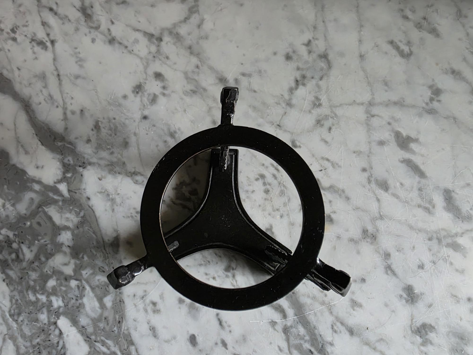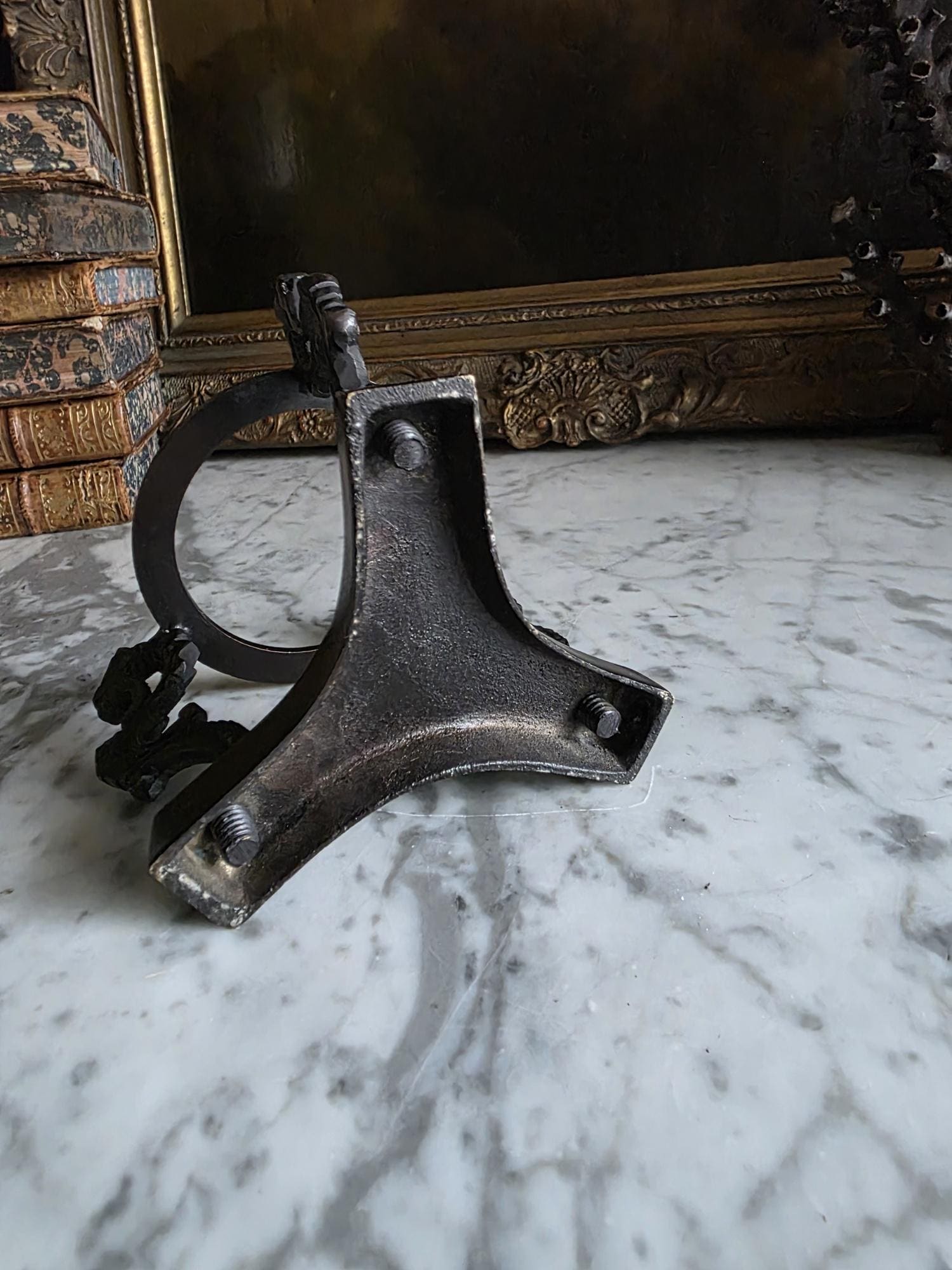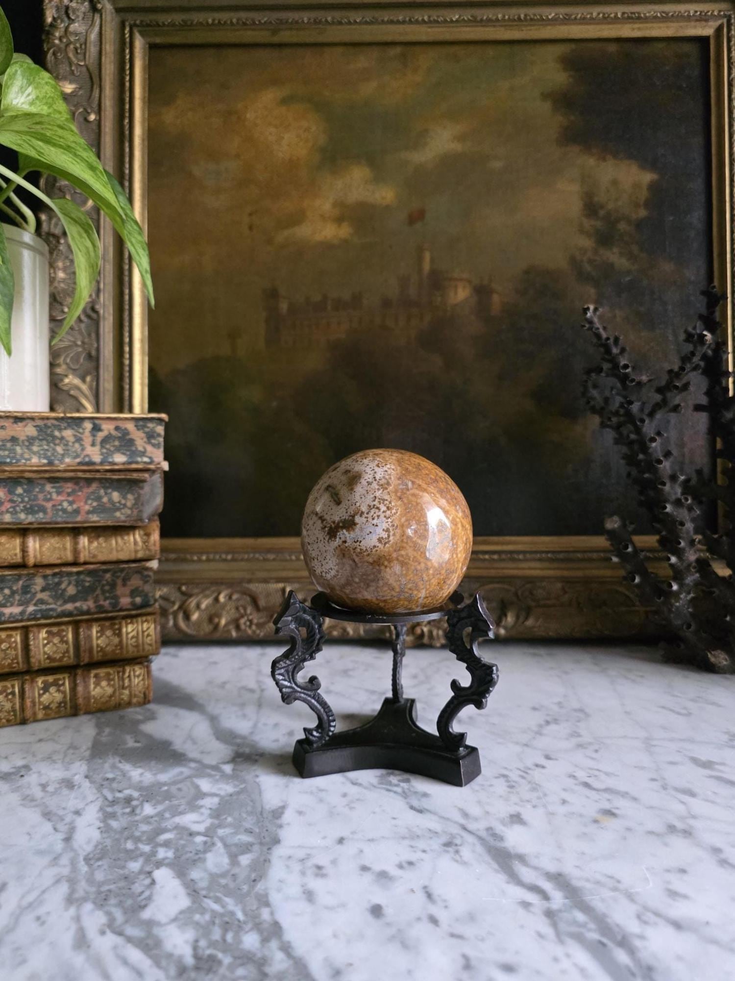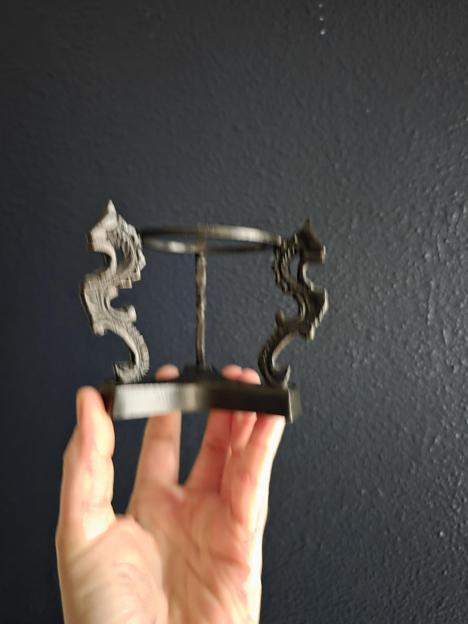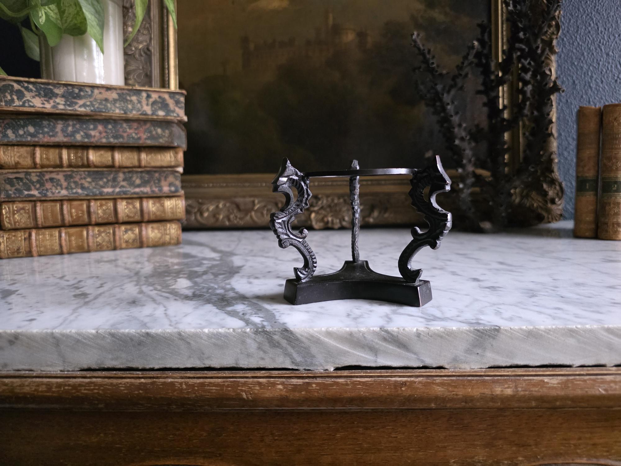 Showcase your favorite geological treasures with a touch of mythological intrigue using this striking vintage cast metal sphere stand. Resting on a solid, trilobal base, the pedestal features three highly detailed supports cast in the shape of stylized dragons or sea serpents. Their curving, scaled backs gracefully hold aloft a central display ring, creating a dramatic, elevated stage for whatever sits inside. The dark, patinated metal—likely cast iron or a heavy brass alloy—gives the piece substantial weight and a distinct "cabinet of curiosities" aesthetic. Perfectly sized to cradle polished crystal spheres, mineral orbs, or small gazing balls, this ornate holder brings a touch of dark academia, Victorian gothic, or eclectic Hollywood Regency style to any curated shelf or desk vignette.