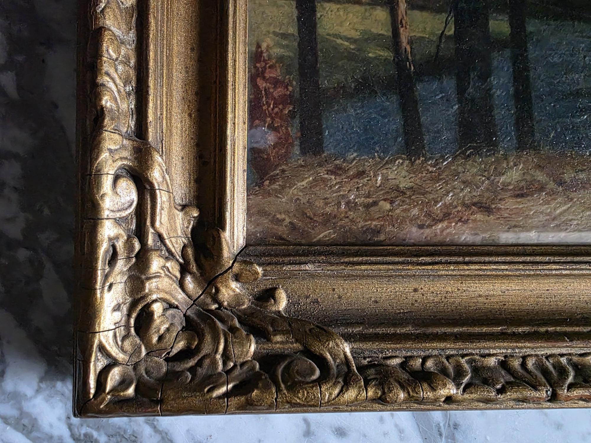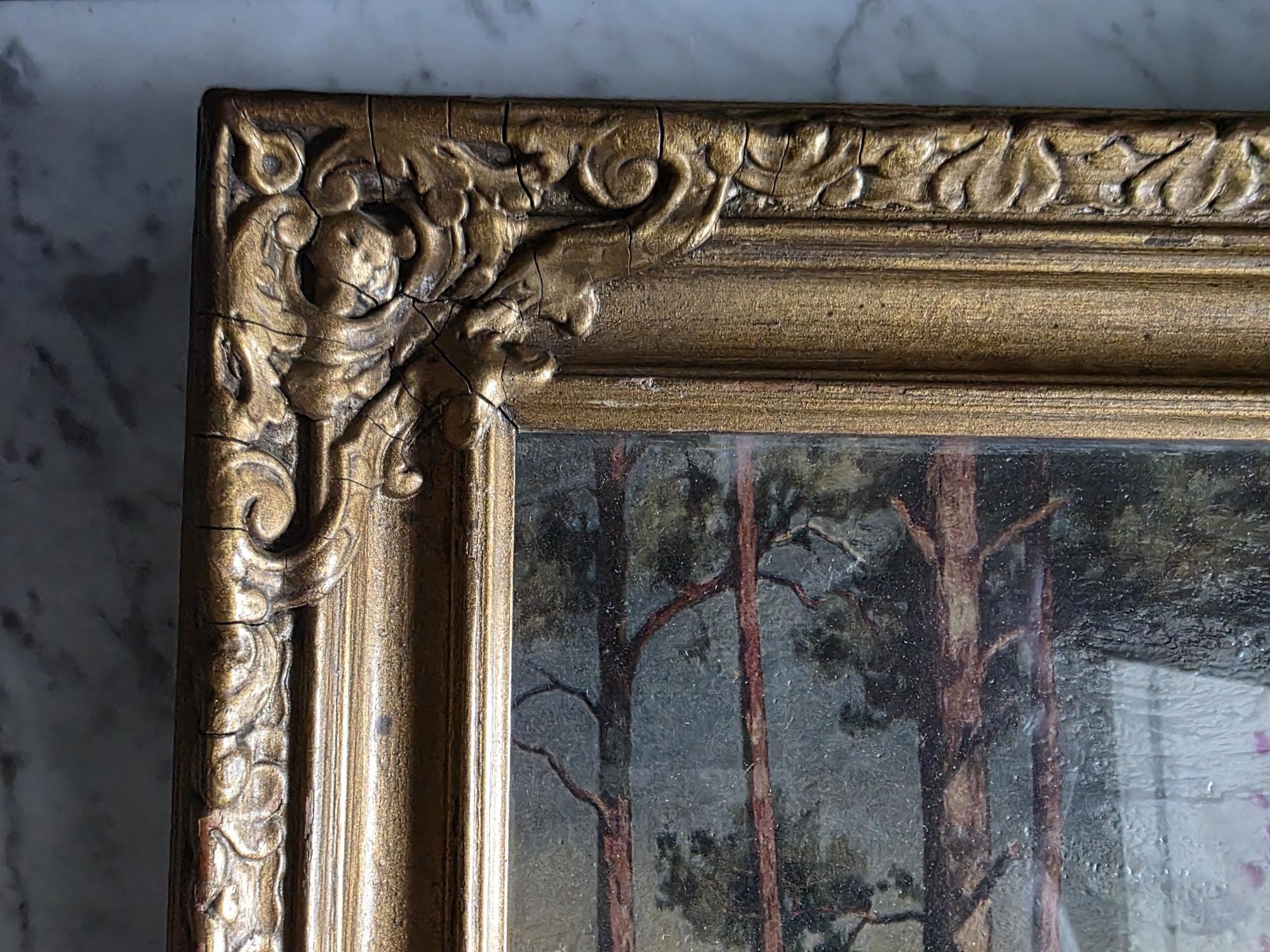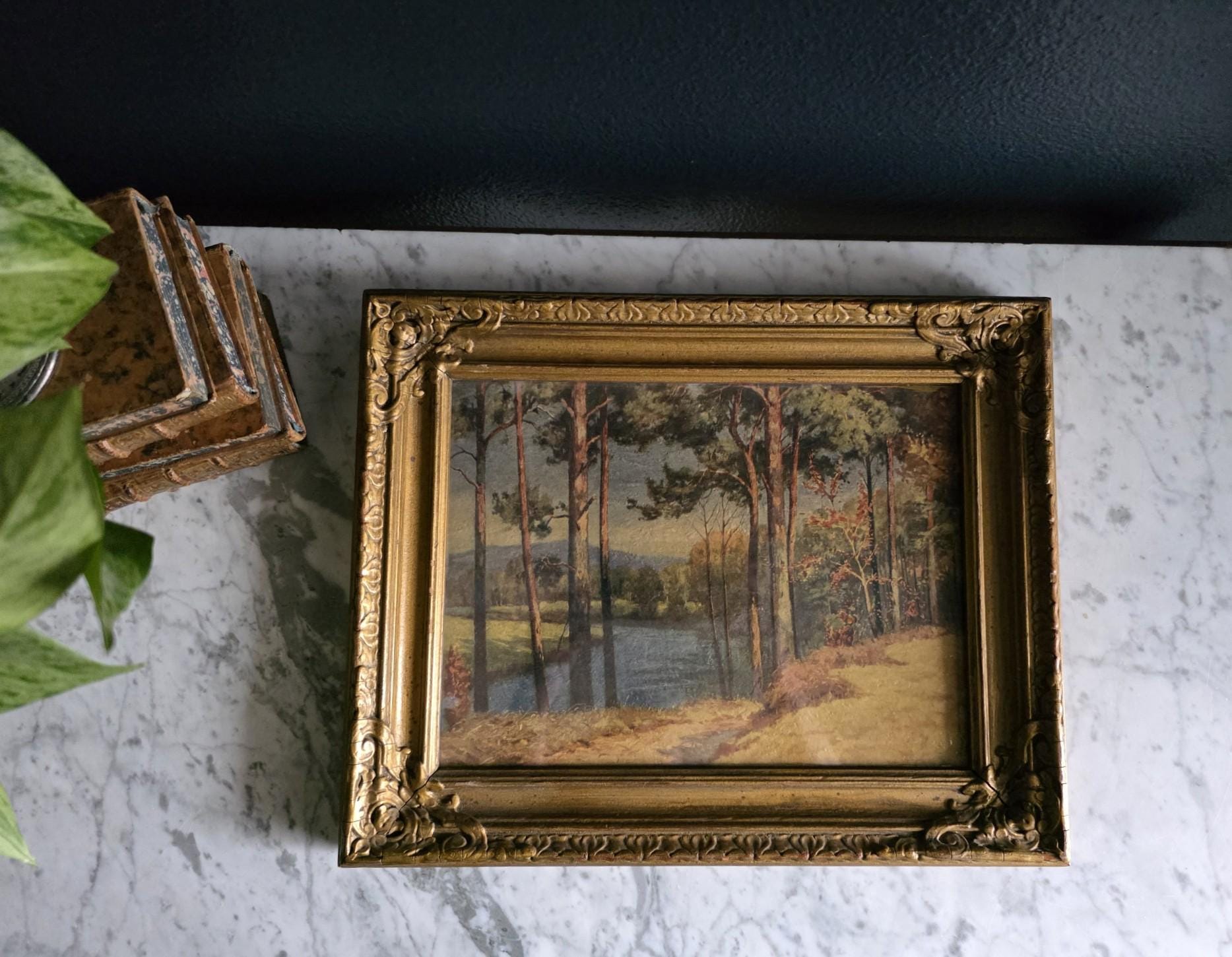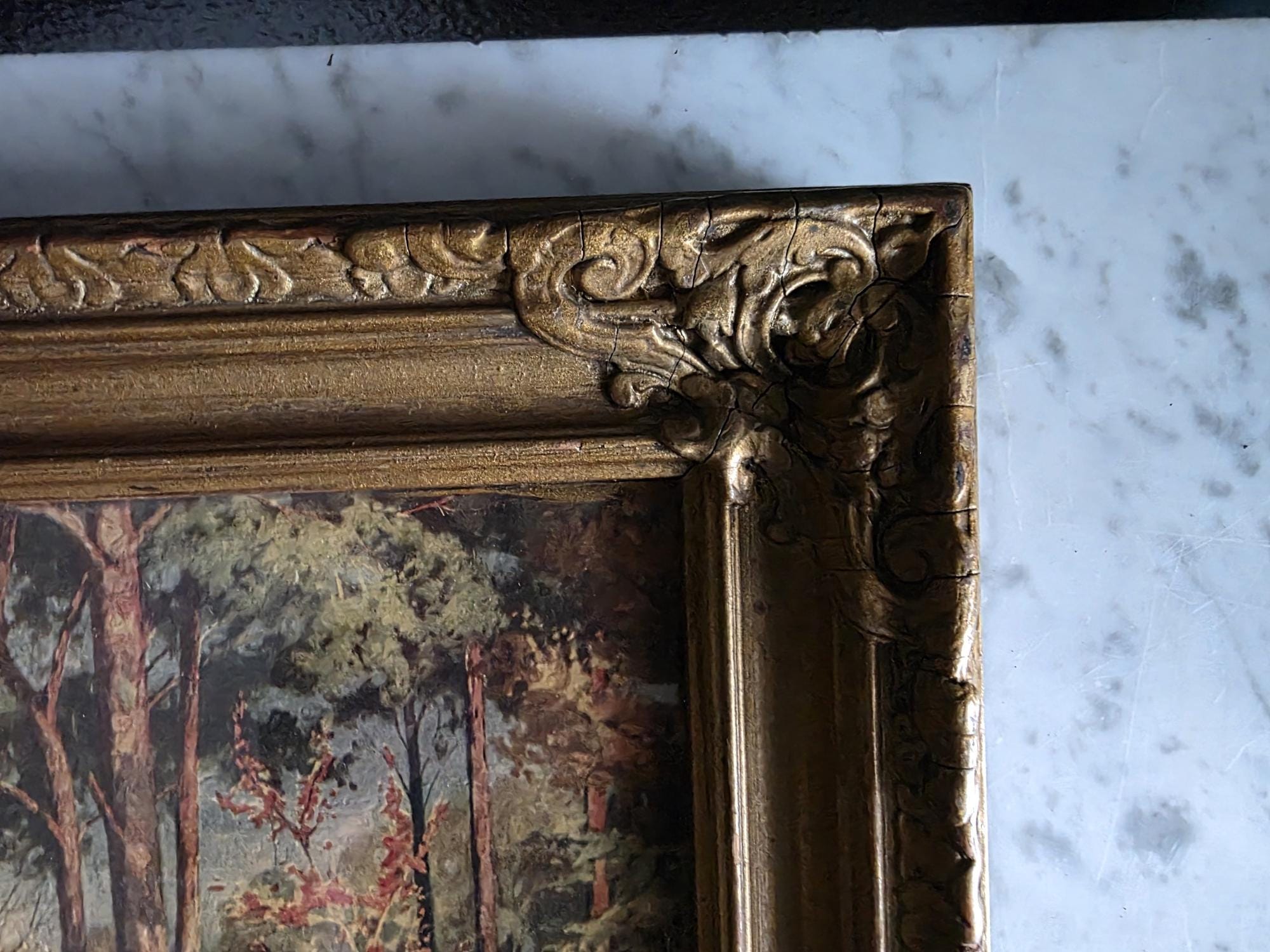The artwork is perfectly complemented by its stunning antique wood frame, finished in a beautifully aged gold tone. The frame features intricate, deeply carved details in the corners (expected age-related cracks) and along the inner edge, enhancing the overall antique charm of the piece. The back of the frame shows its history, with aged backing paper and a sturdy wire, making it ready to hang and enjoy in your home. This piece is perfect for adding a touch of vintage character and serene landscape beauty to a gallery wall, a cozy study, or above a mantelpiece.