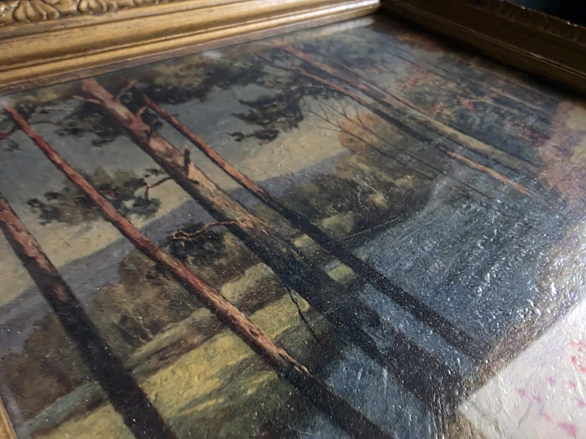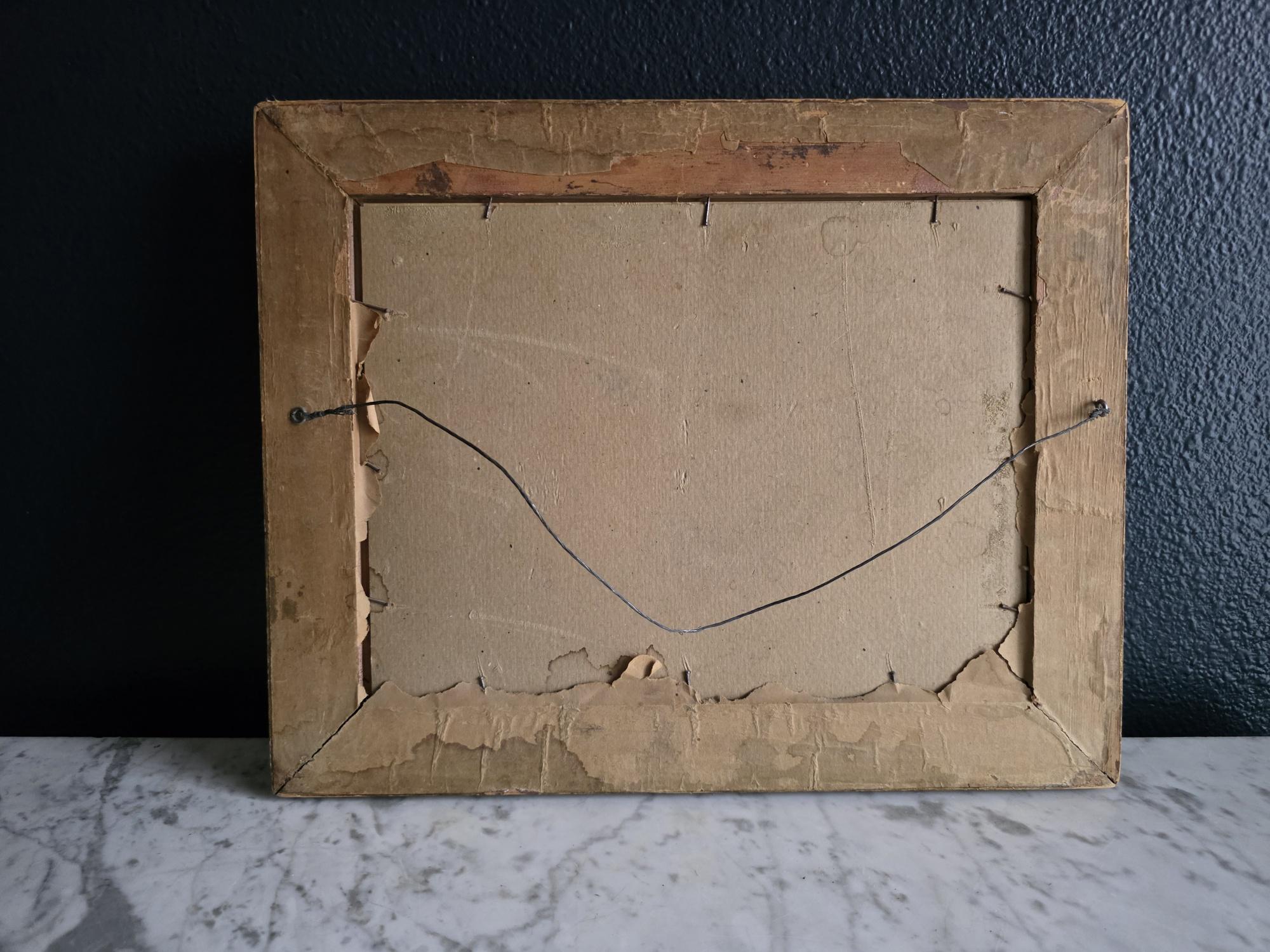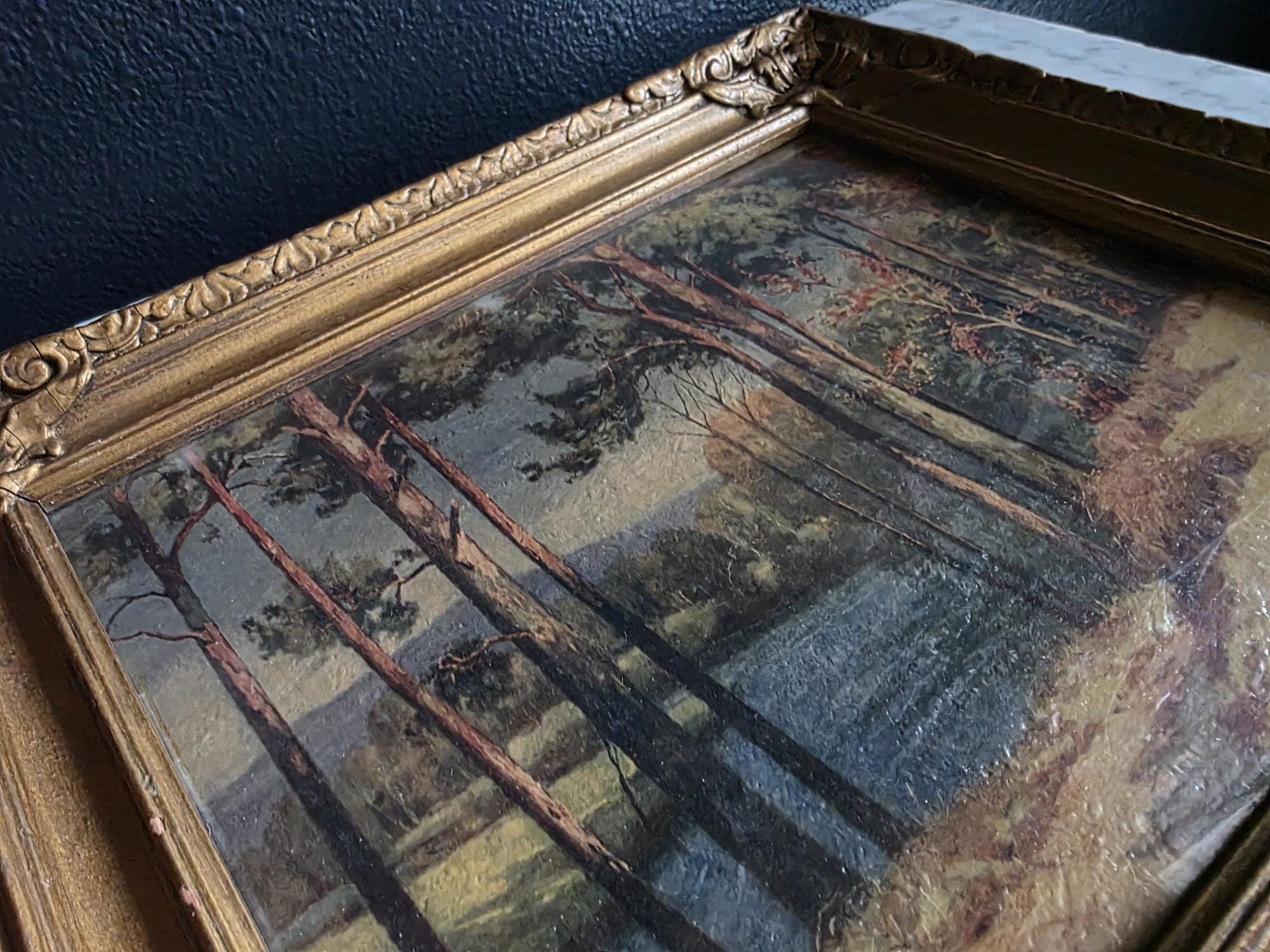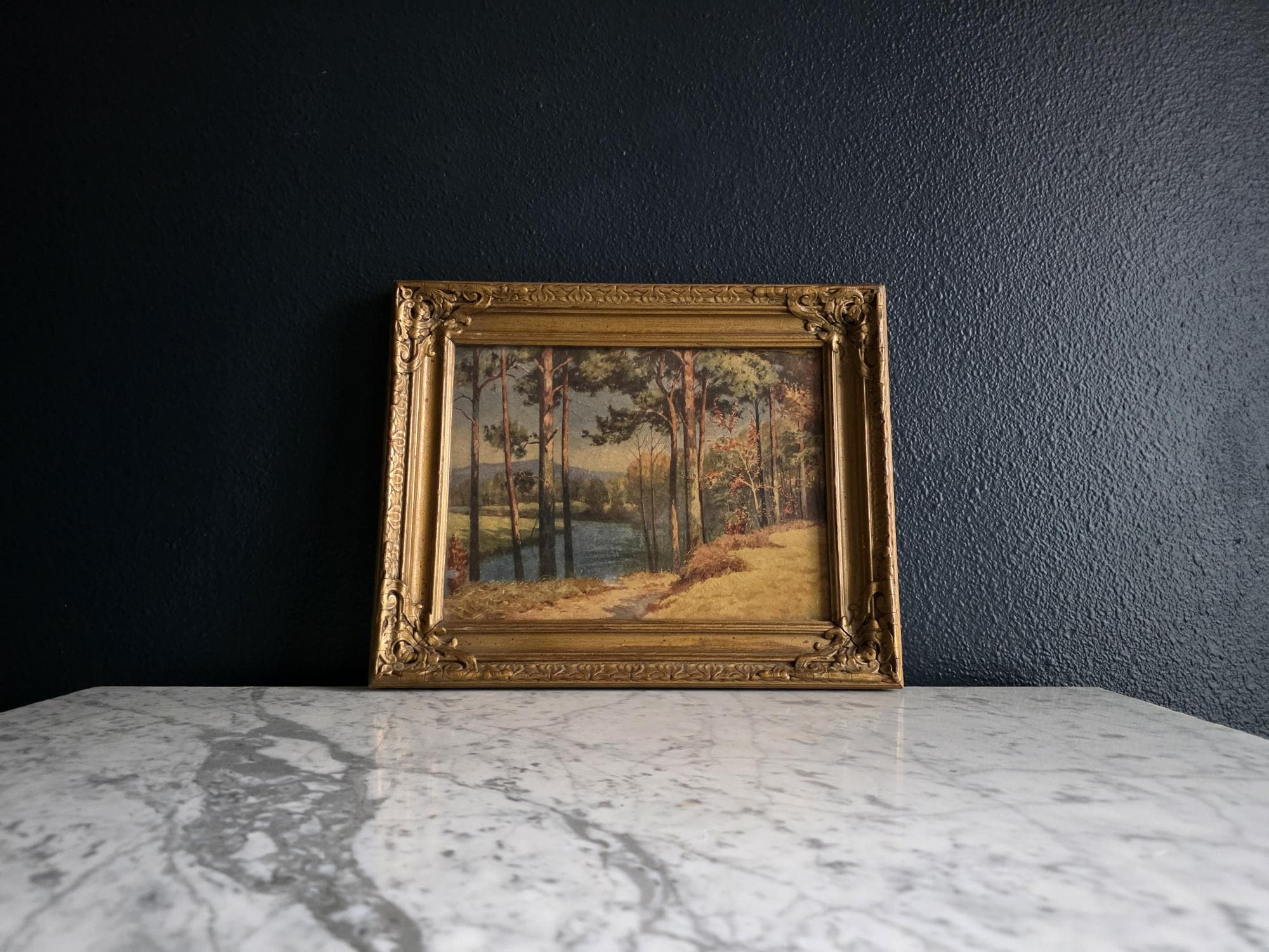 The artwork is perfectly complemented by its stunning antique wood frame, finished in a beautifully aged gold tone. The frame features intricate, deeply carved details in the corners (expected age-related cracks) and along the inner edge, enhancing the overall antique charm of the piece. The back of the frame shows its history, with aged backing paper and a sturdy wire, making it ready to hang and enjoy in your home. This piece is perfect for adding a touch of vintage character and serene landscape beauty to a gallery wall, a cozy study, or above a mantelpiece.