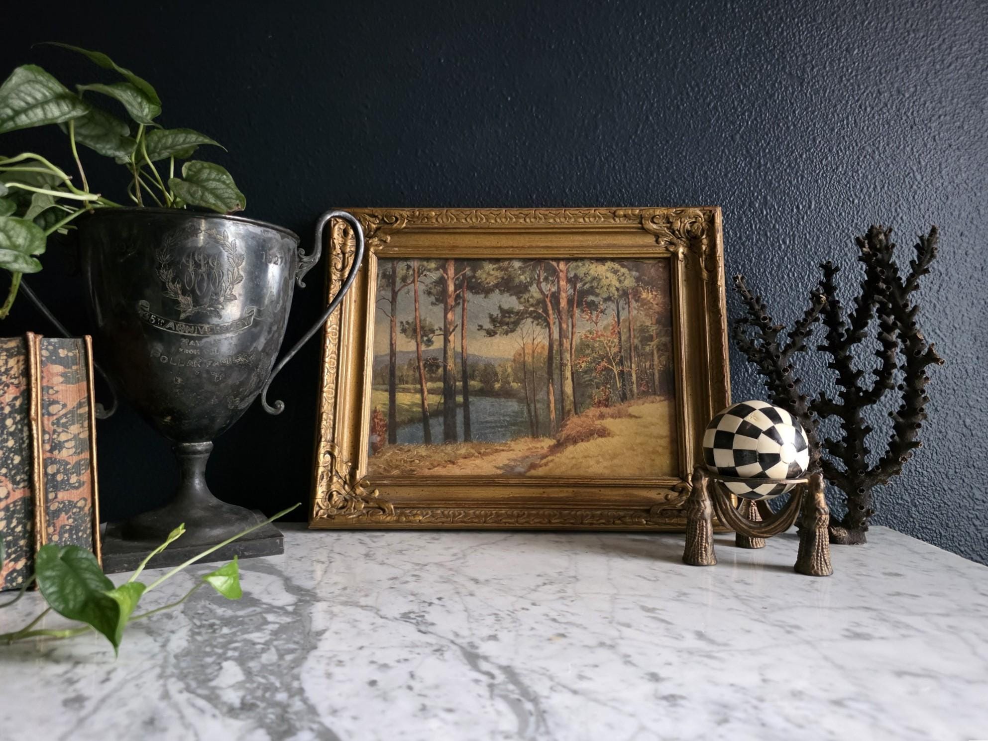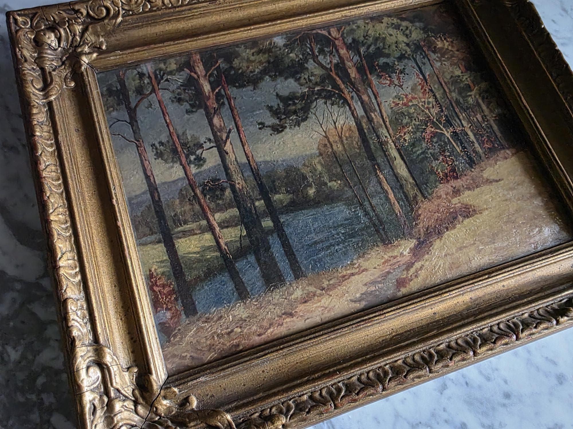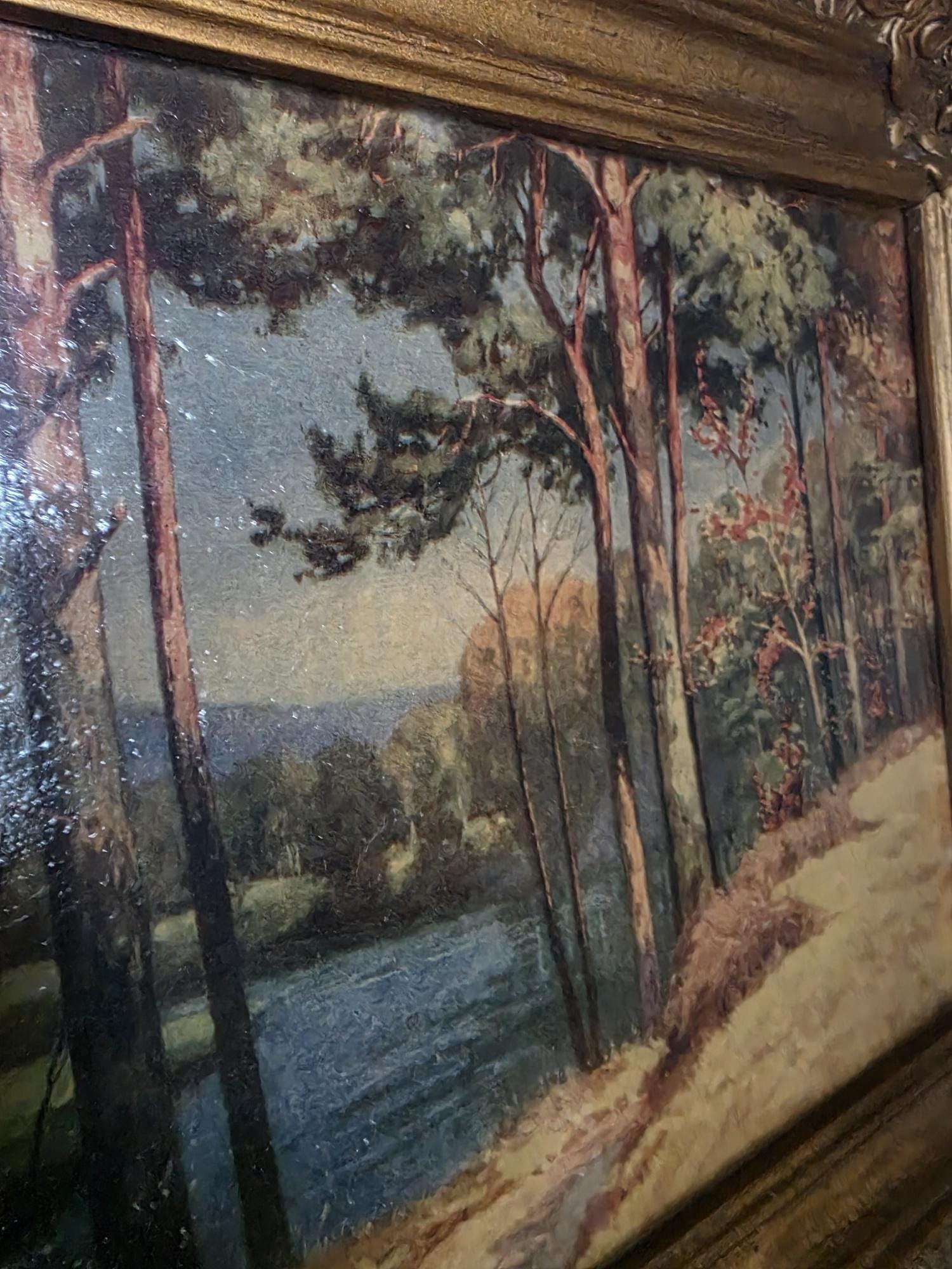 Immerse yourself in the quiet beauty of nature with this captivating antique textured print, beautifully presented in an ornate wood frame. The artwork showcases a tranquil landscape scene, featuring tall, slender trees framing a calm body of water with rolling hills in the distance. The print itself boasts a unique, highly textured surface that mimics the look and feel of an original oil painting, complete with visible "brushstrokes" that add depth and dimension to the classic scene. The rich, warm color palette of greens, browns, and soft blues evokes a sense of nostalgia and timeless elegance.