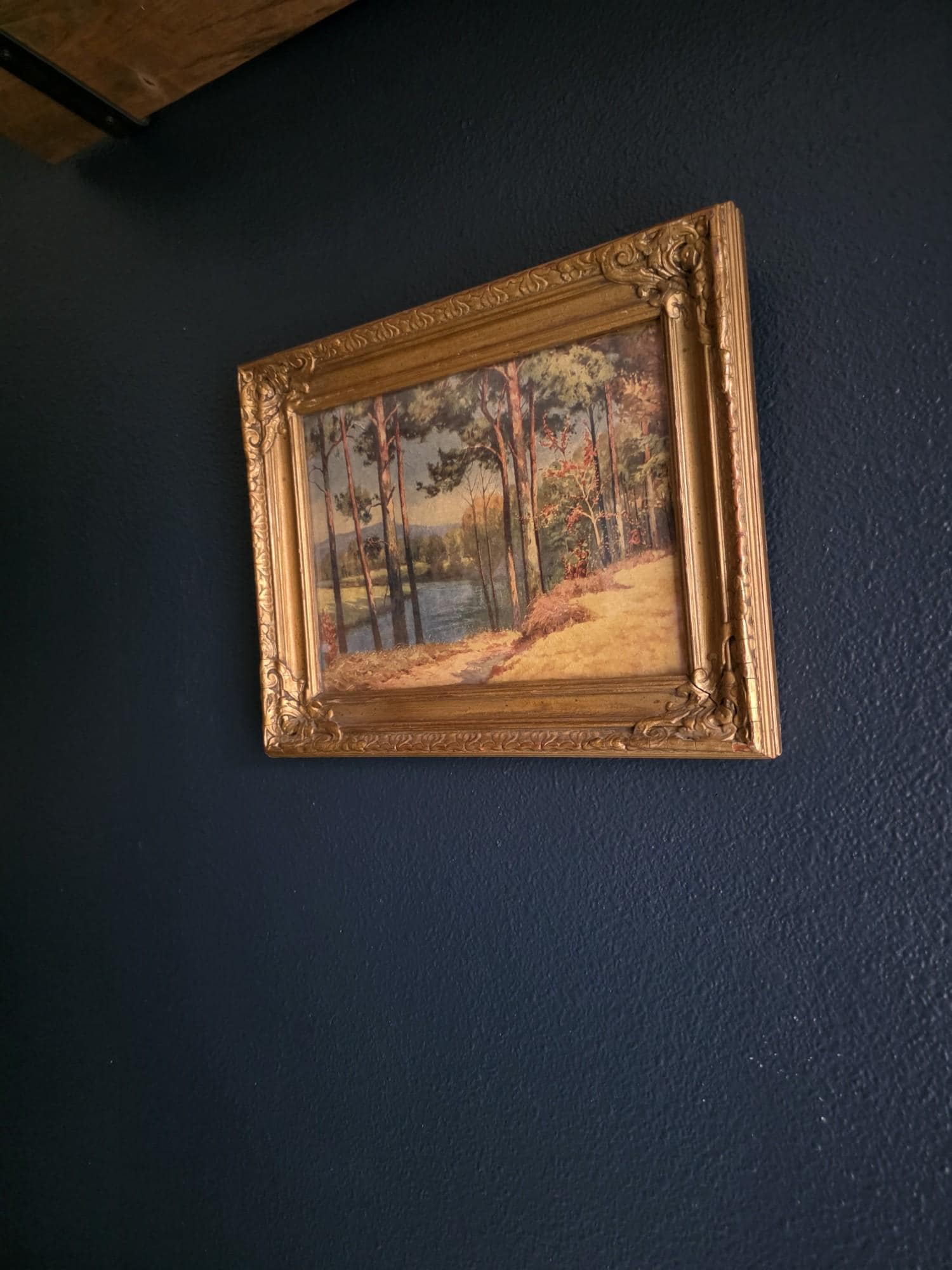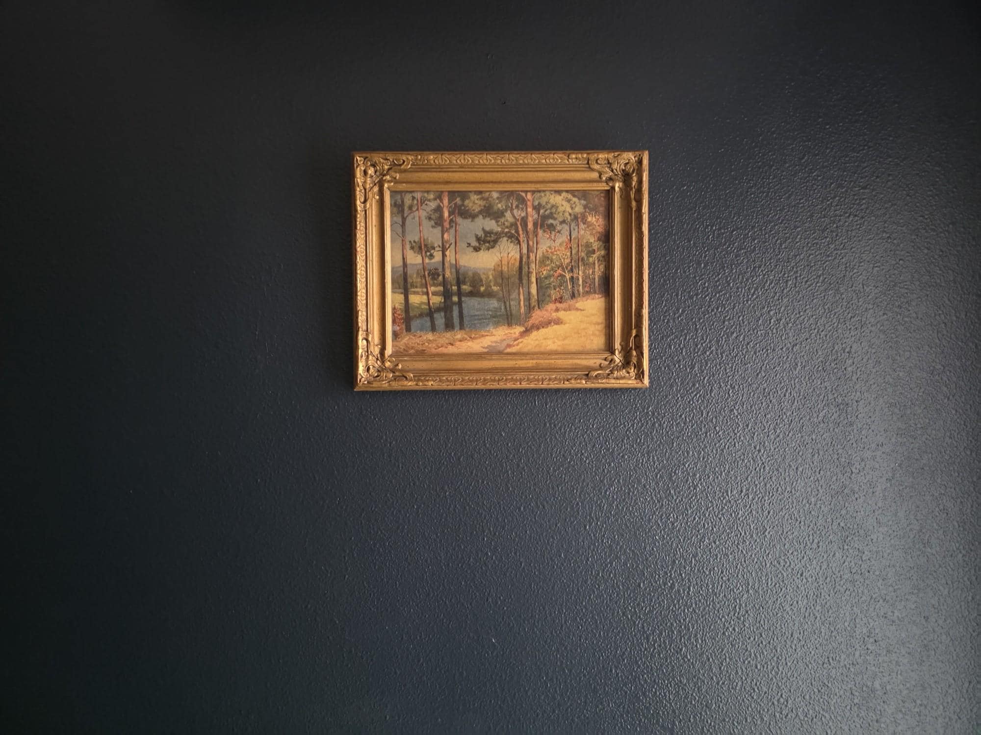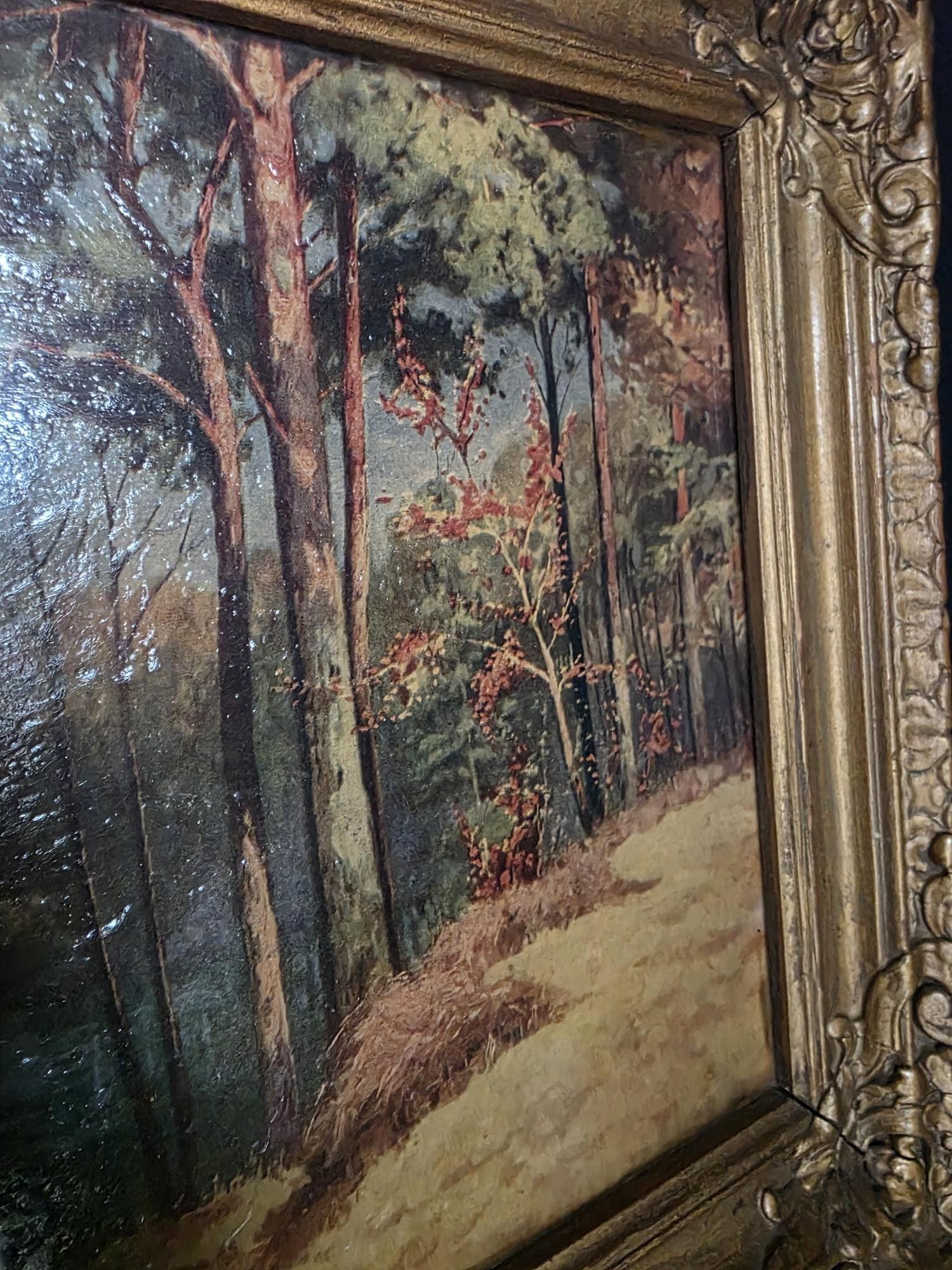 Immerse yourself in the quiet beauty of nature with this captivating antique textured print, beautifully presented in an ornate wood frame. The artwork showcases a tranquil landscape scene, featuring tall, slender trees framing a calm body of water with rolling hills in the distance. The print itself boasts a unique, highly textured surface that mimics the look and feel of an original oil painting, complete with visible "brushstrokes" that add depth and dimension to the classic scene. The rich, warm color palette of greens, browns, and soft blues evokes a sense of nostalgia and timeless elegance.