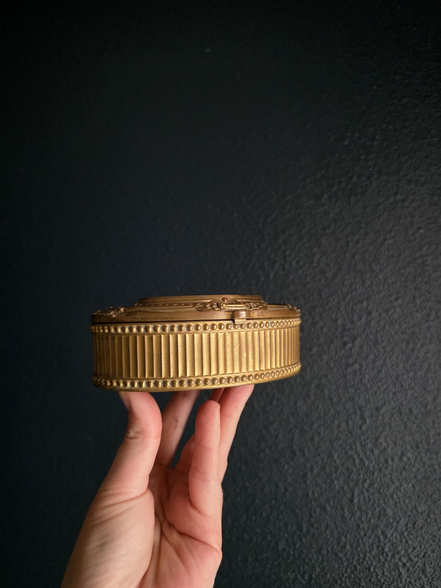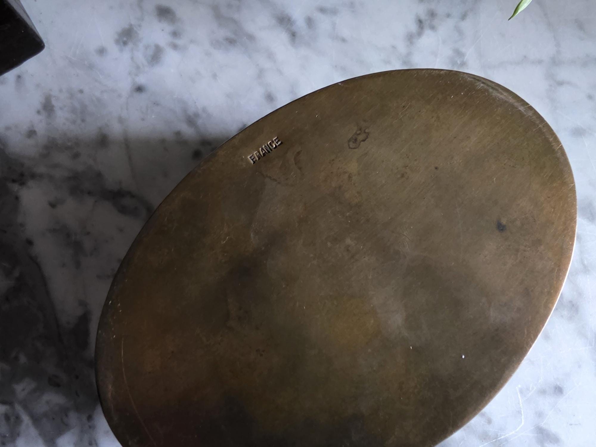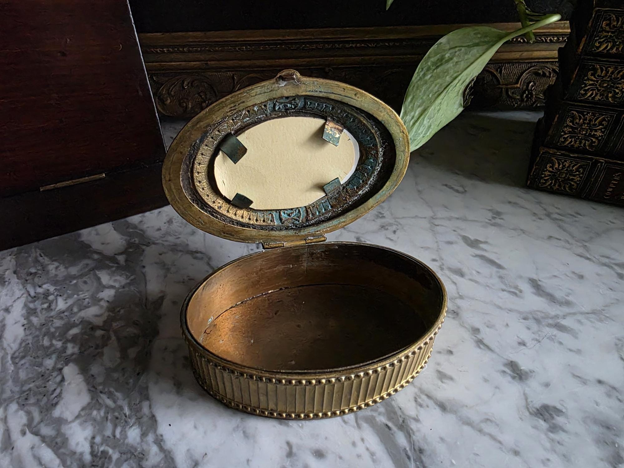 Stamped "FRANCE" on the underside, this authentic antique piece carries a rich, aged patina. The exterior boasts a warm, mellowed brassy-bronze tone, while the unlined interior reveals natural oxidation and touches of green verdigris that beautifully illustrate its genuine age and history. Whether used to safeguard your favorite rings, small treasures, or displayed as a standalone statement piece, this lidded box is a perfect addition for lovers of Dark Academia, French Country, or traditional antique decor styles.