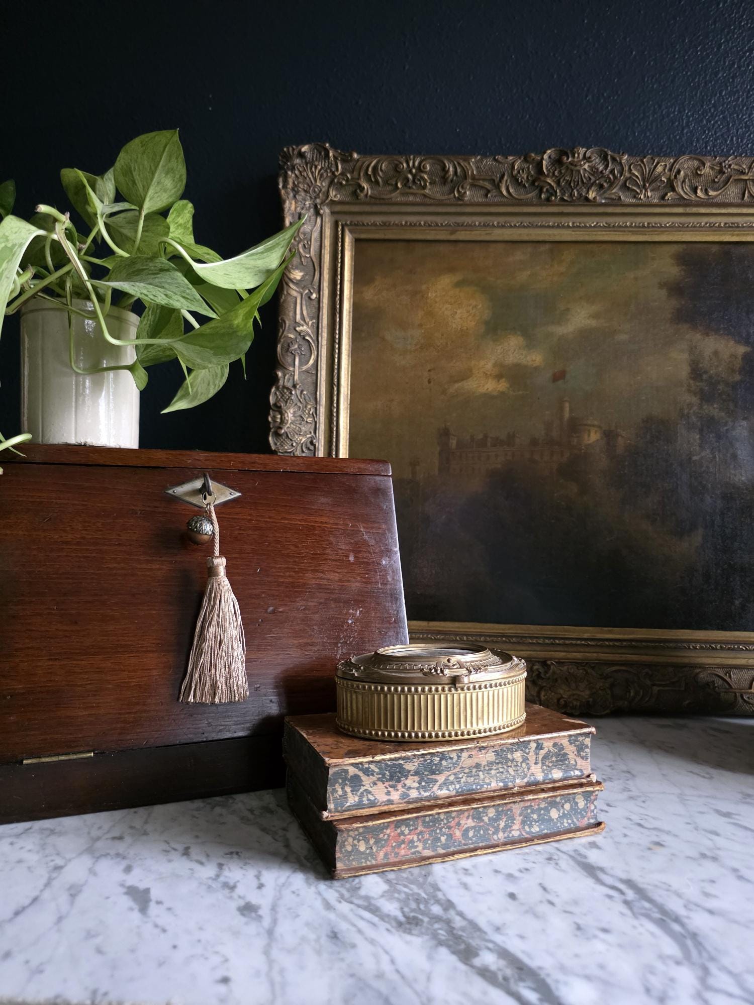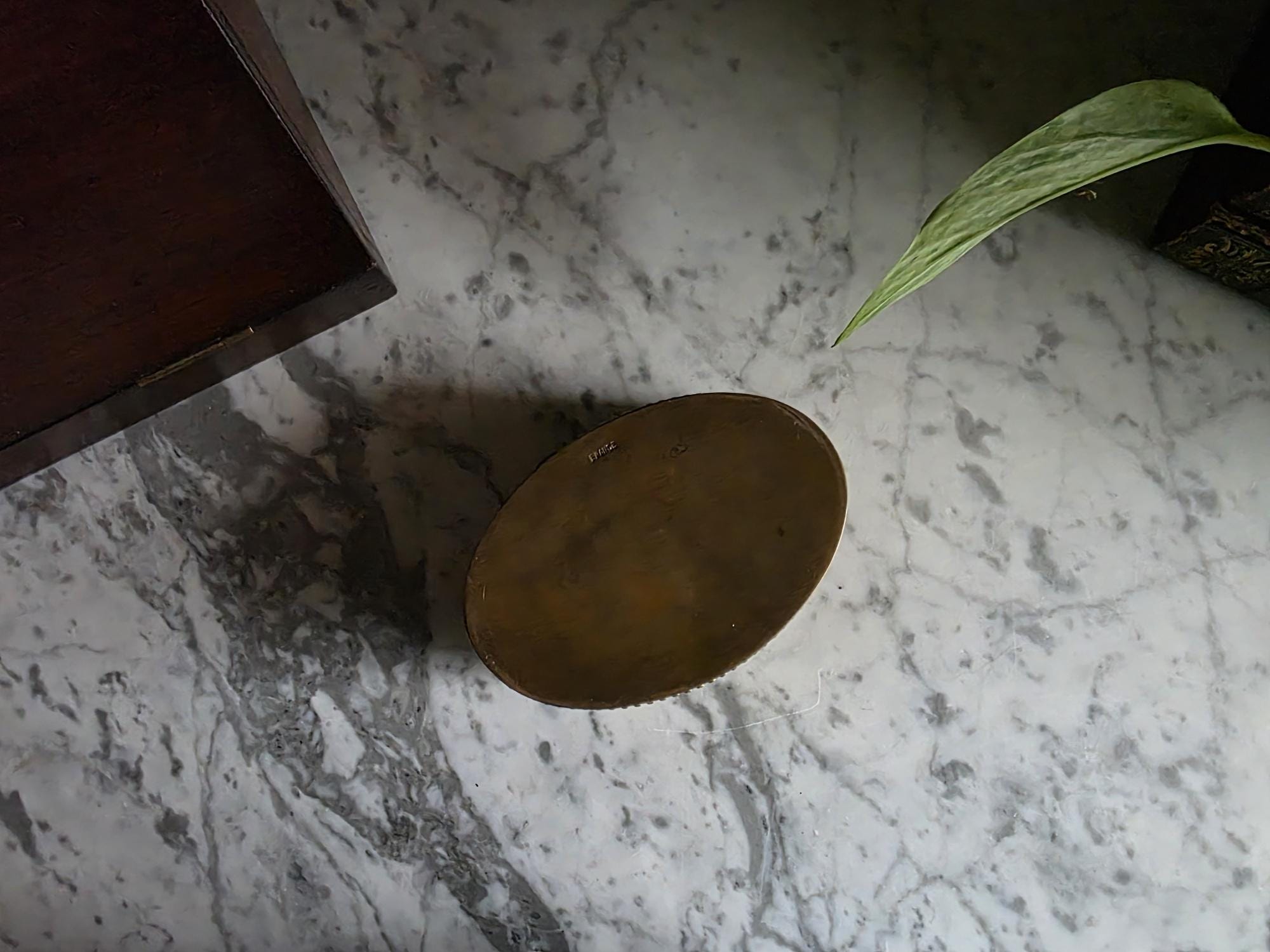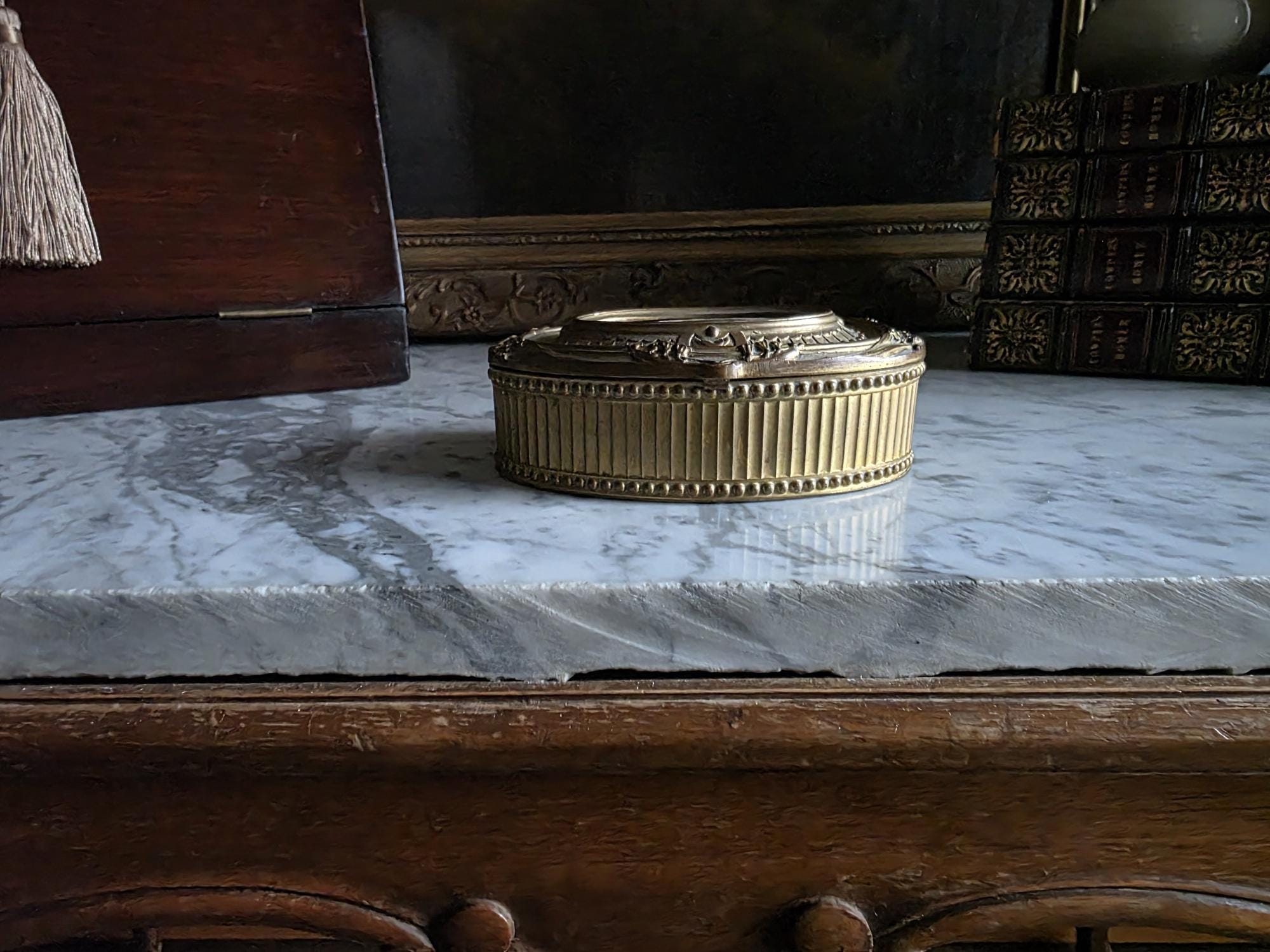 Stamped "FRANCE" on the underside, this authentic antique piece carries a rich, aged patina. The exterior boasts a warm, mellowed brassy-bronze tone, while the unlined interior reveals natural oxidation and touches of green verdigris that beautifully illustrate its genuine age and history. Whether used to safeguard your favorite rings, small treasures, or displayed as a standalone statement piece, this lidded box is a perfect addition for lovers of Dark Academia, French Country, or traditional antique decor styles.