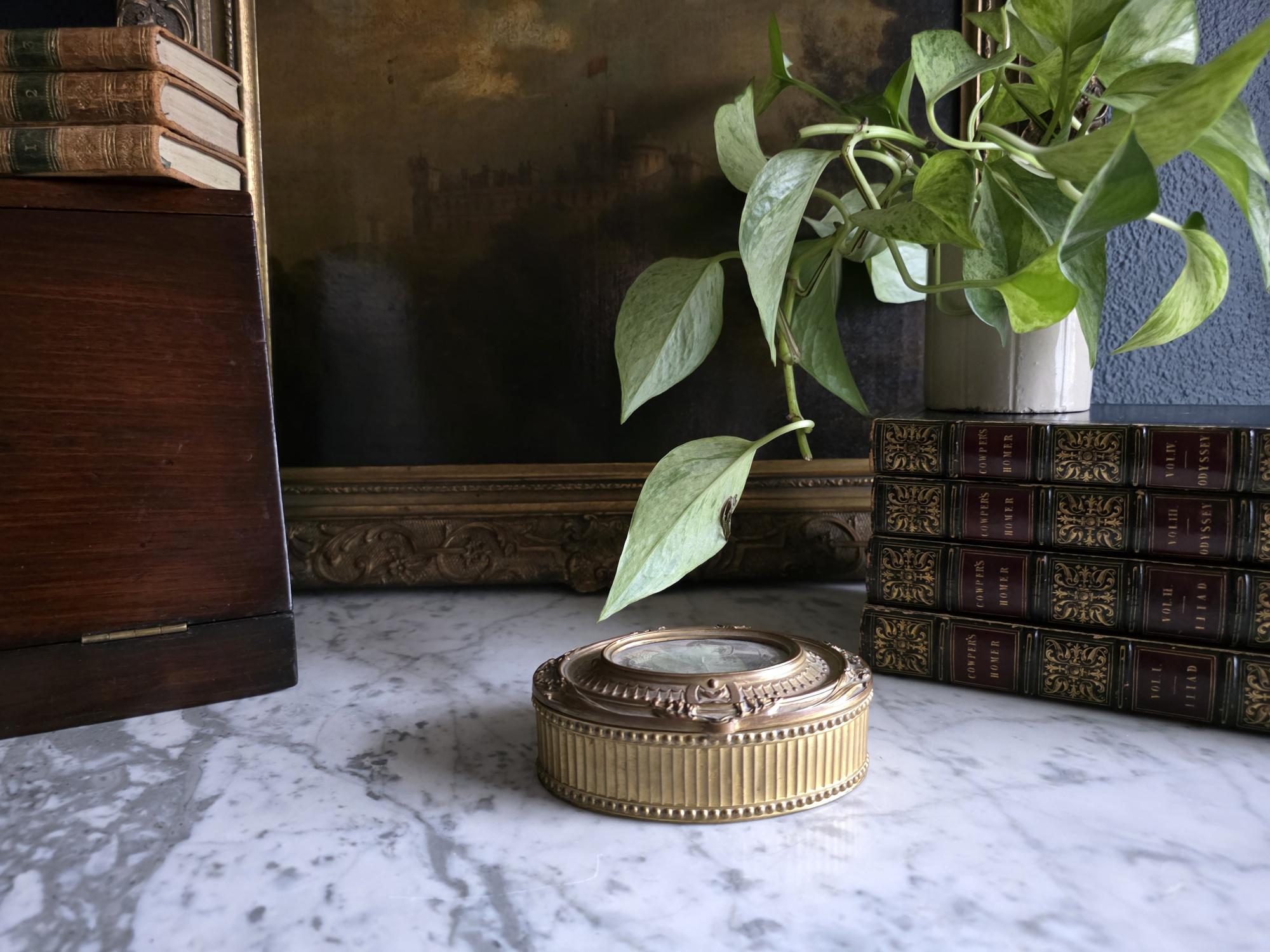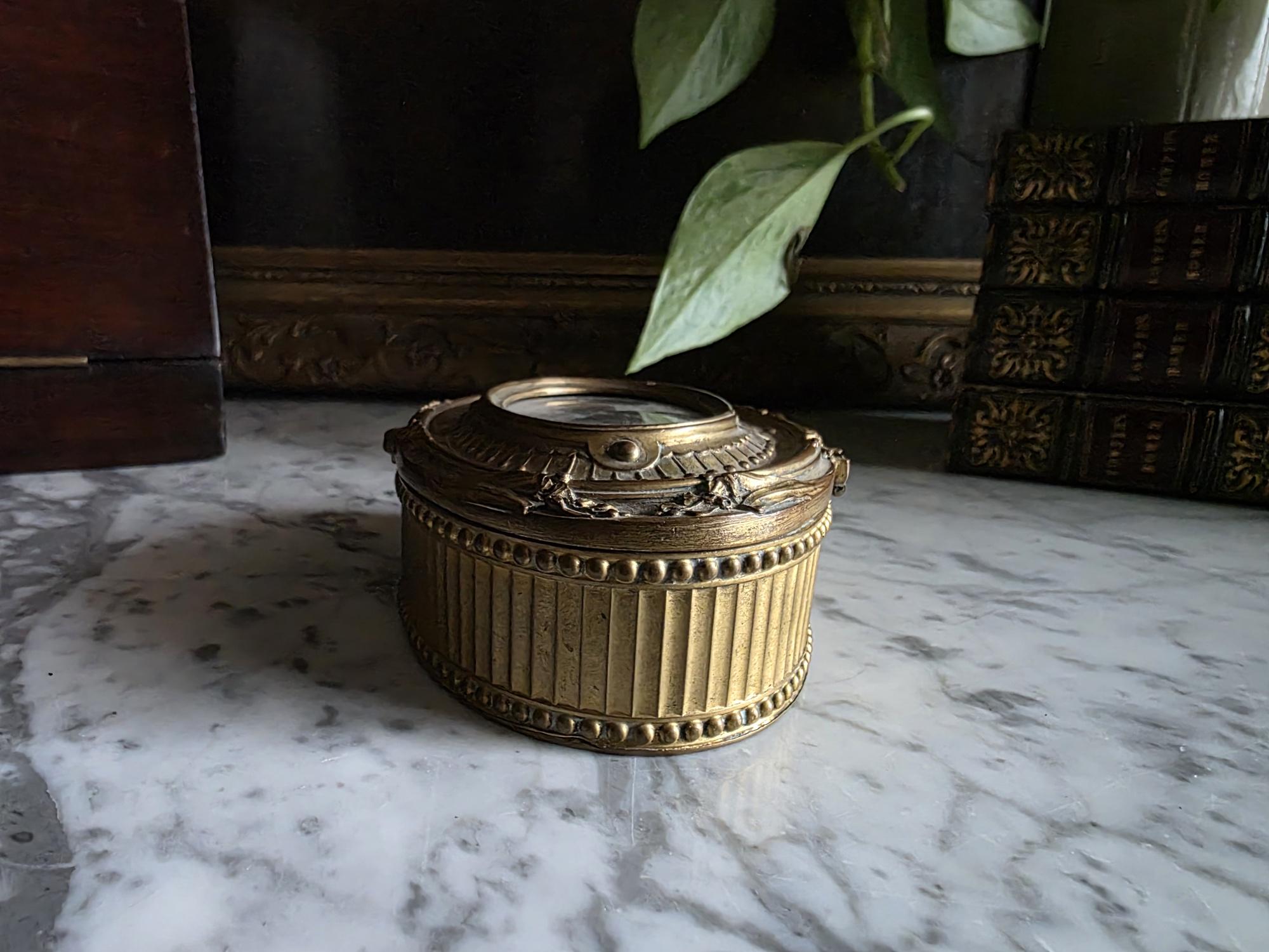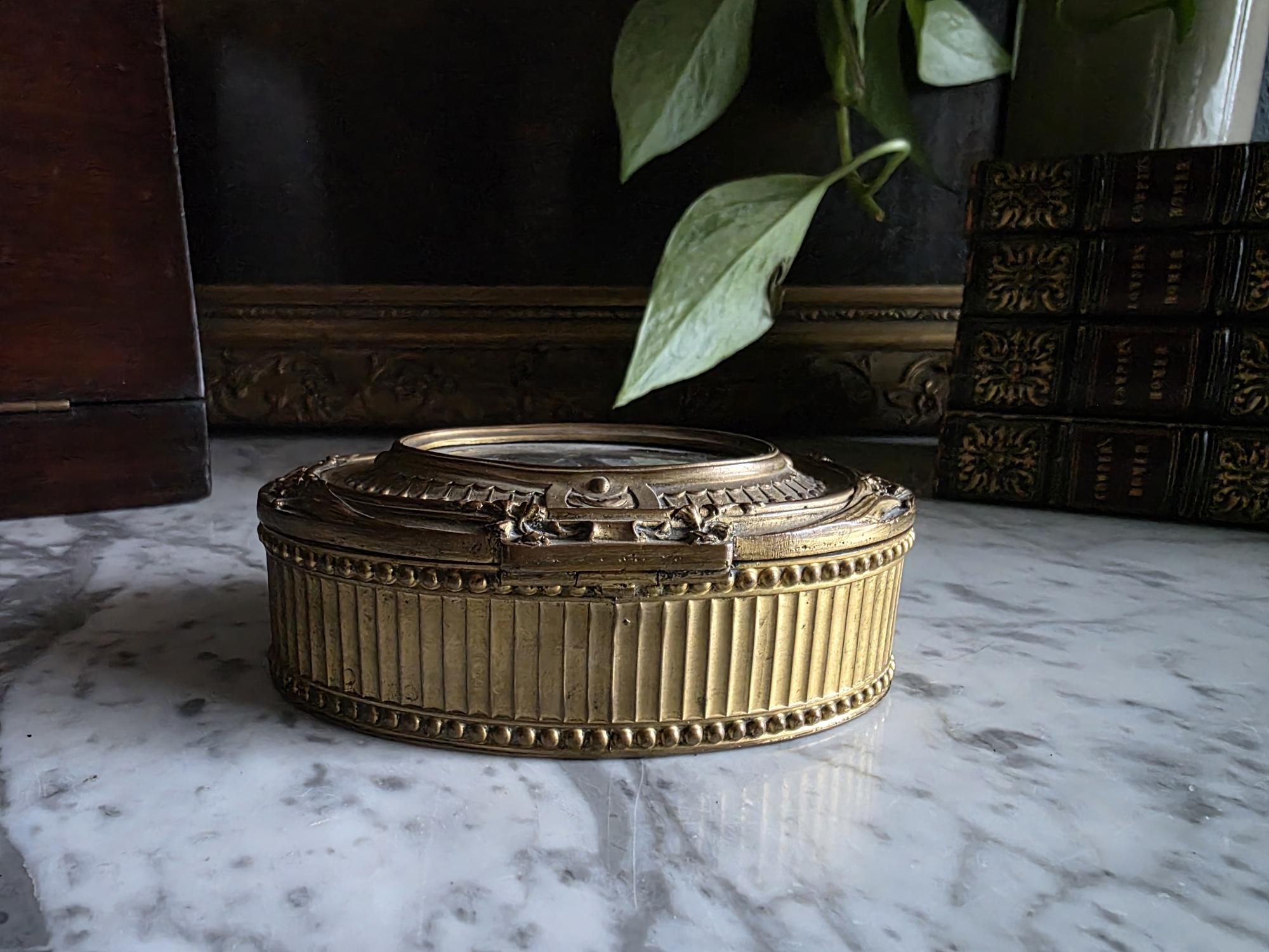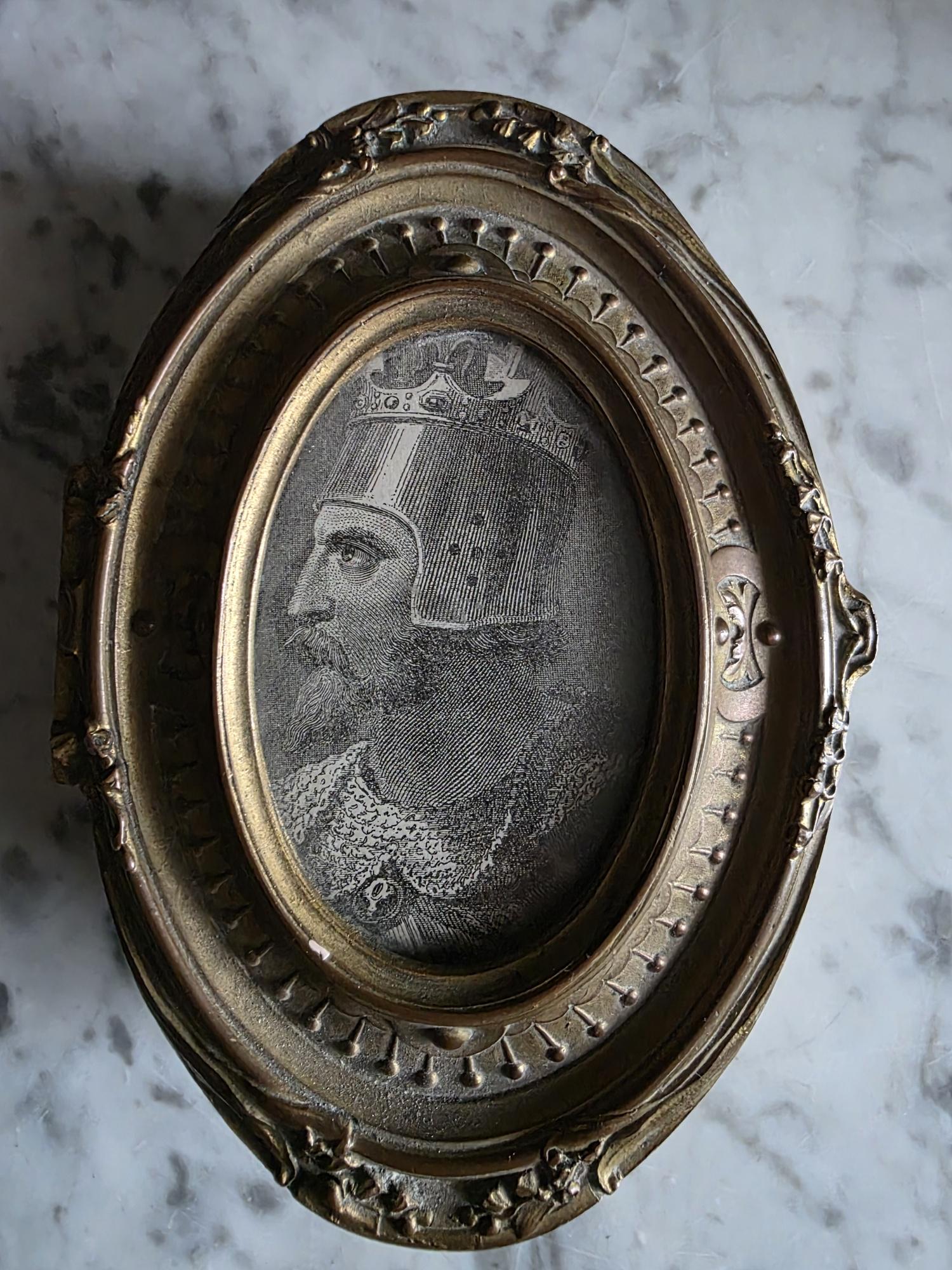 Add a touch of regal elegance to your vanity, desk, or bedside table with this exquisite antique French bronze trinket box. The stunning oval box features a beautifully detailed body with classical fluted sides, framed by delicate beading along both the top and bottom edges. It's true focal point is the ornate hinged lid, which showcases a captivating inset print of a historical royal figure Edward of Woodstock, known to history as the Black Prince or the Black Prince (the eldest son of King Edward III of England) the Black displayed beneath glass. This striking portrait is surrounded by an intricately cast bronze border complete with neoclassical ribbon, swag, and bow motifs.