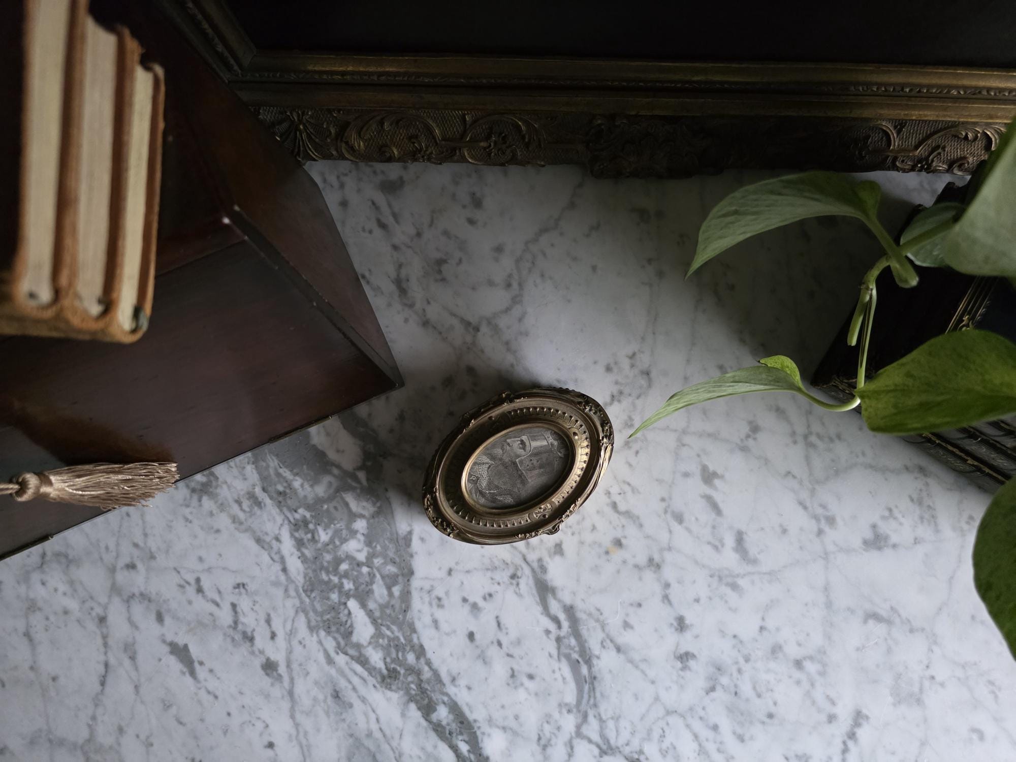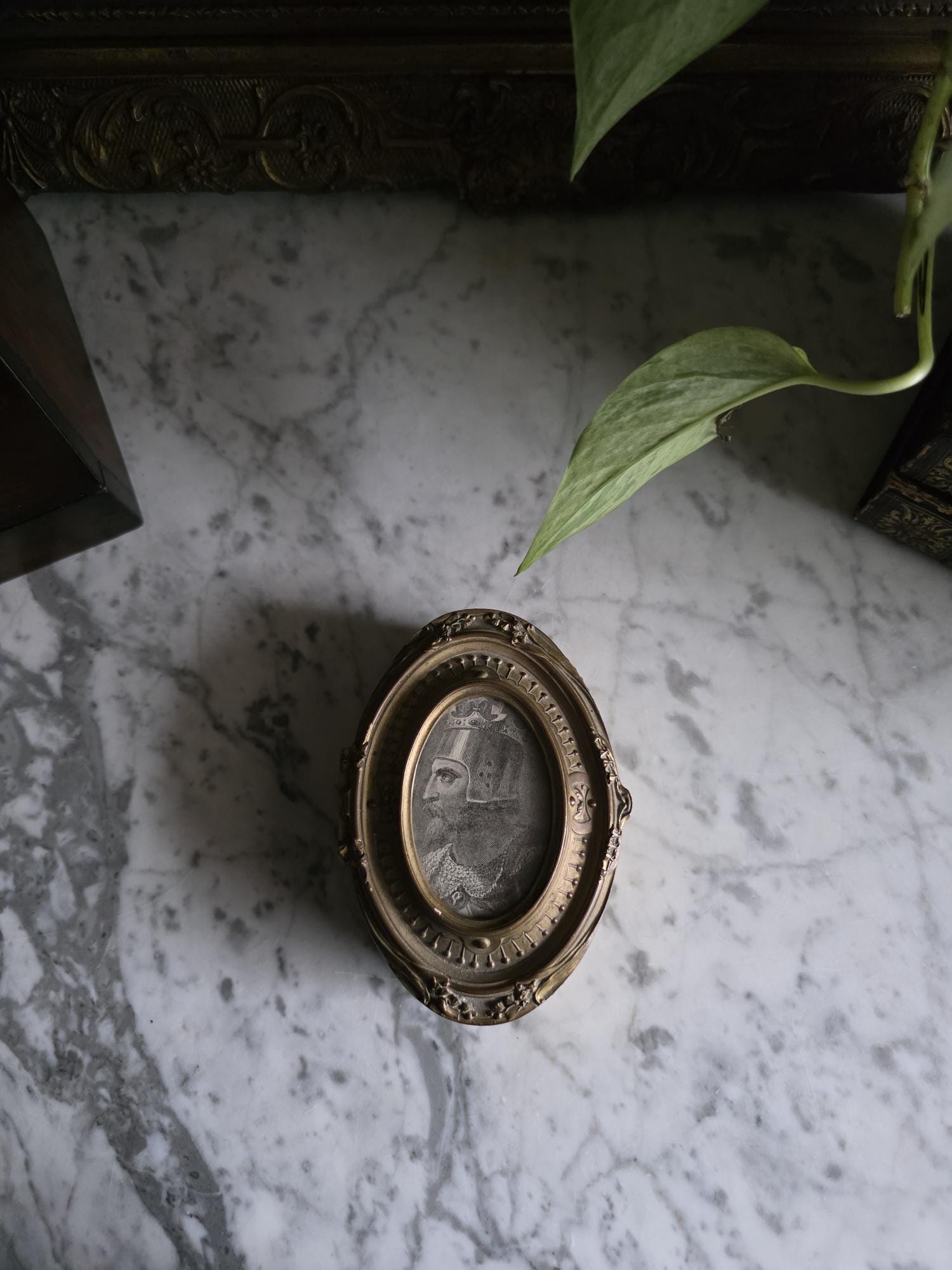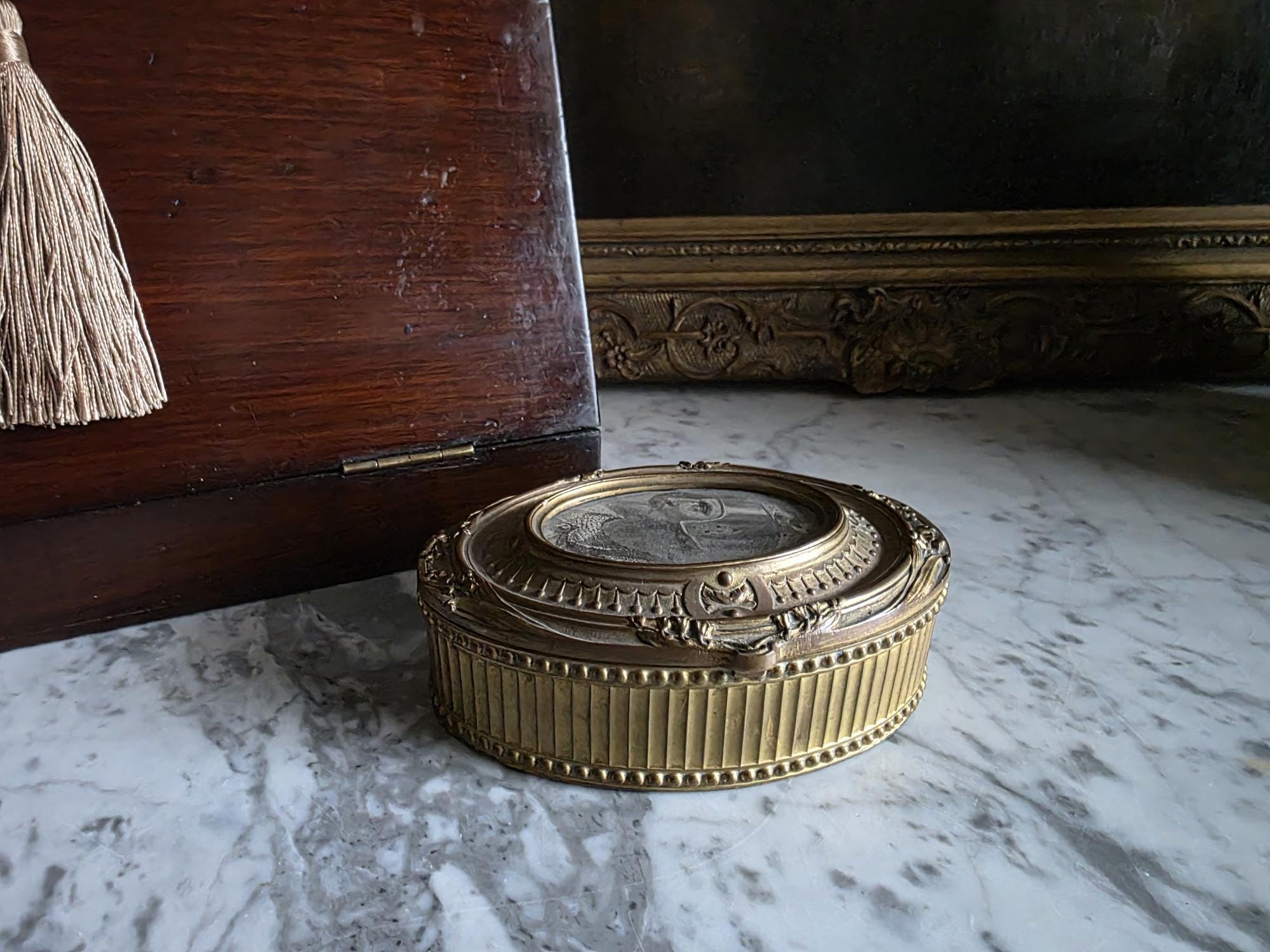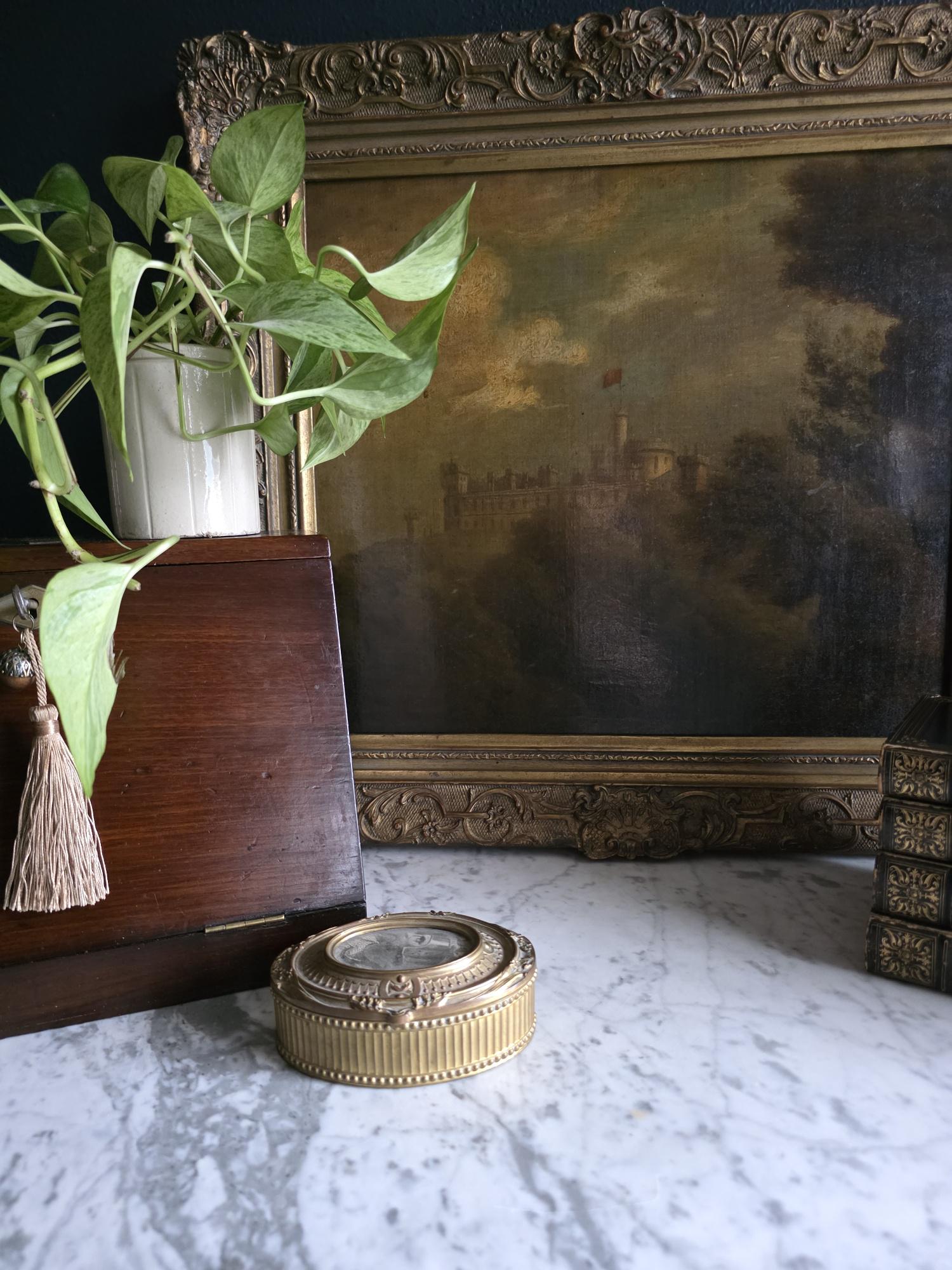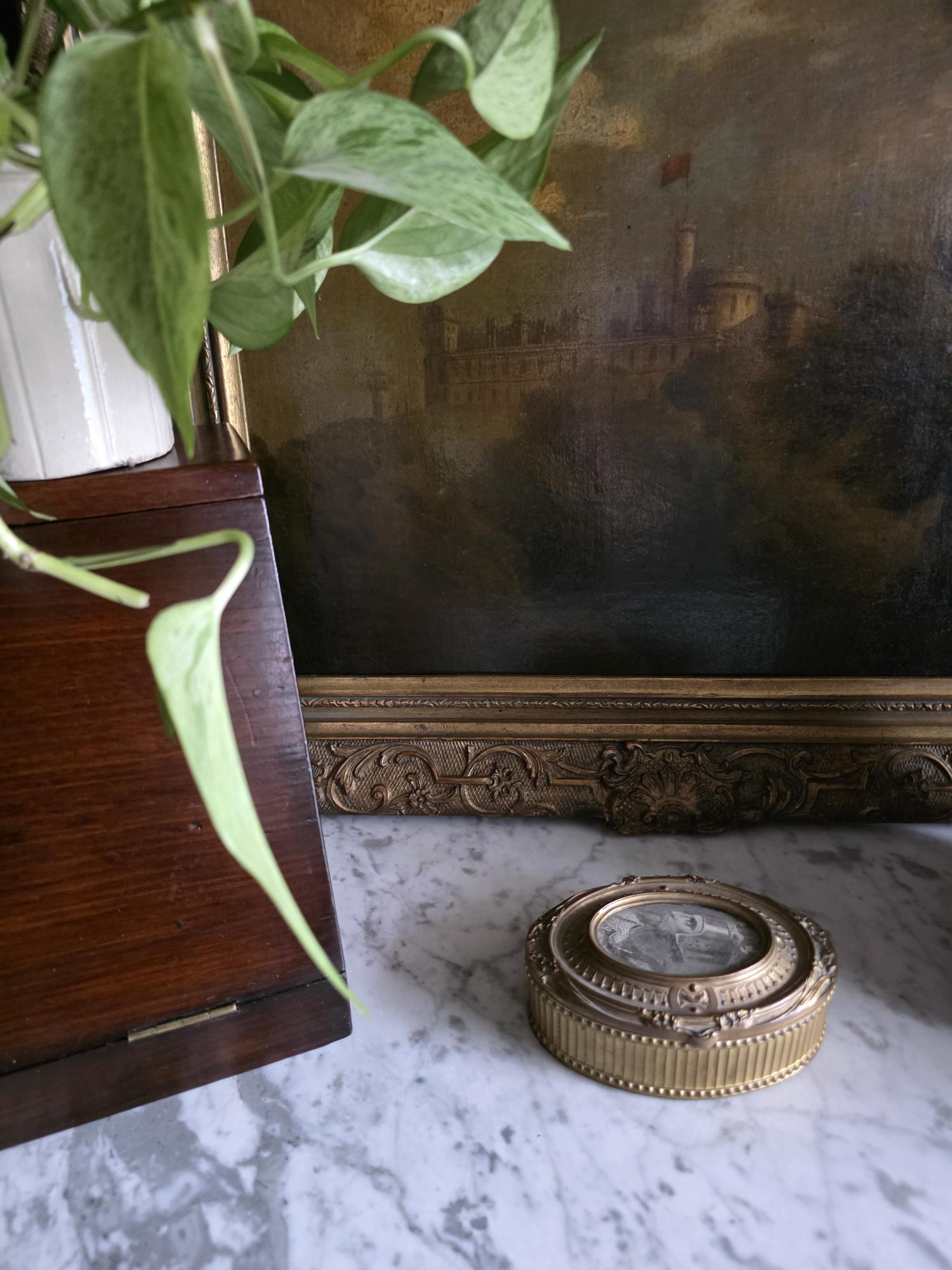 Add a touch of regal elegance to your vanity, desk, or bedside table with this exquisite antique French bronze trinket box. The stunning oval box features a beautifully detailed body with classical fluted sides, framed by delicate beading along both the top and bottom edges. It's true focal point is the ornate hinged lid, which showcases a captivating inset print of a historical royal figure Edward of Woodstock, known to history as the Black Prince or the Black Prince (the eldest son of King Edward III of England) the Black displayed beneath glass. This striking portrait is surrounded by an intricately cast bronze border complete with neoclassical ribbon, swag, and bow motifs.