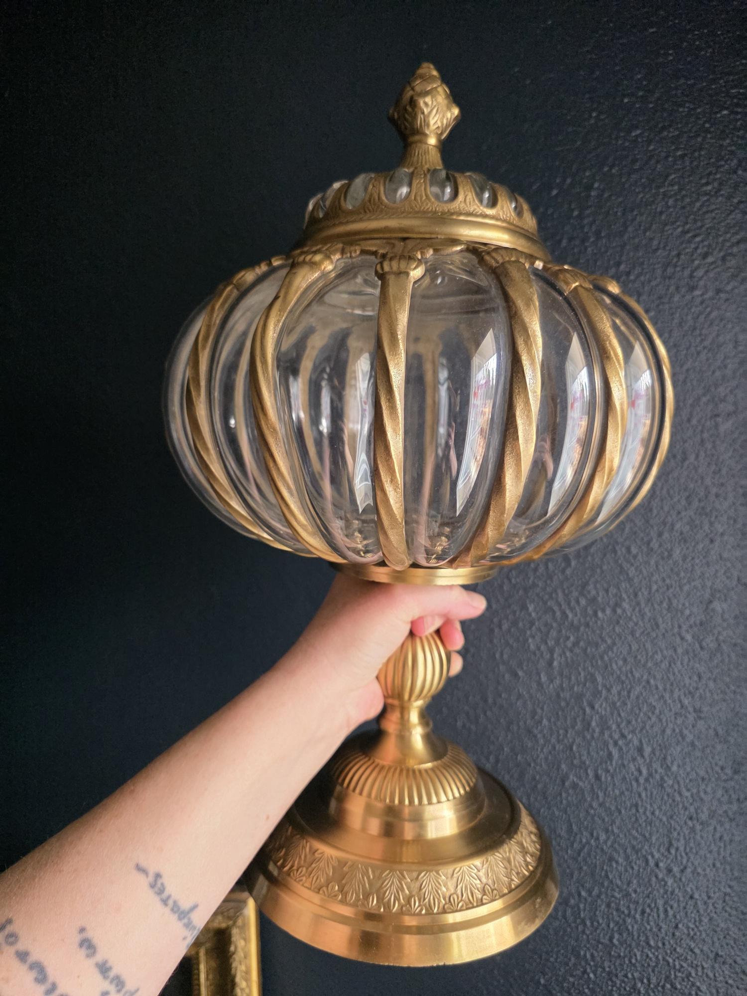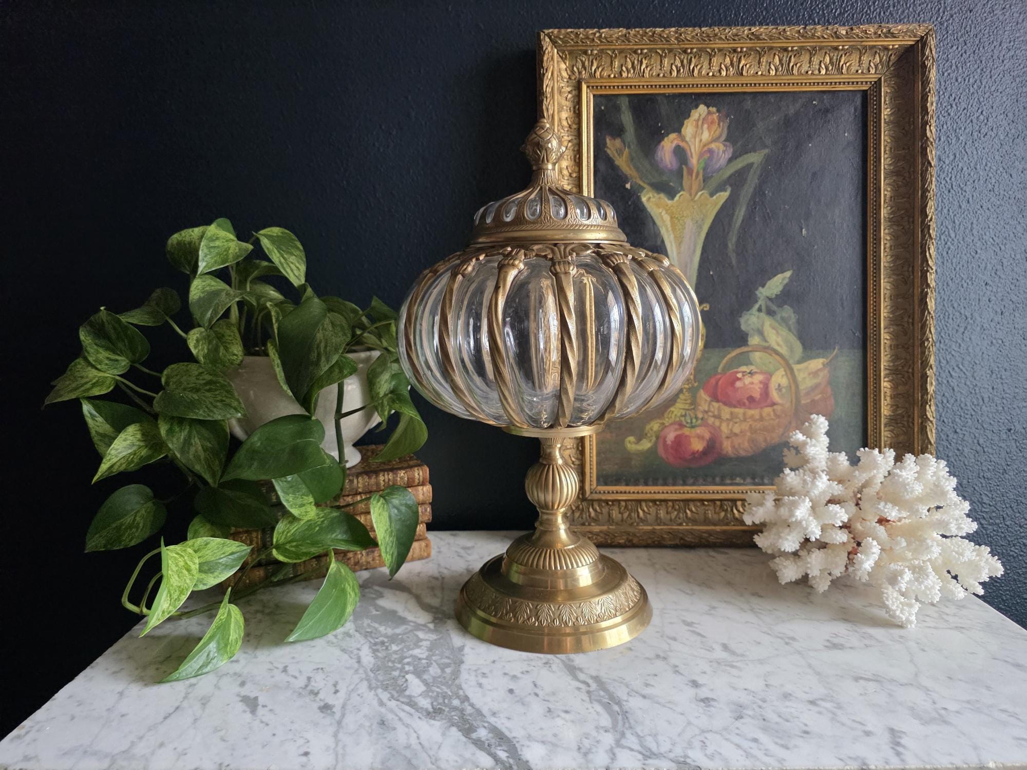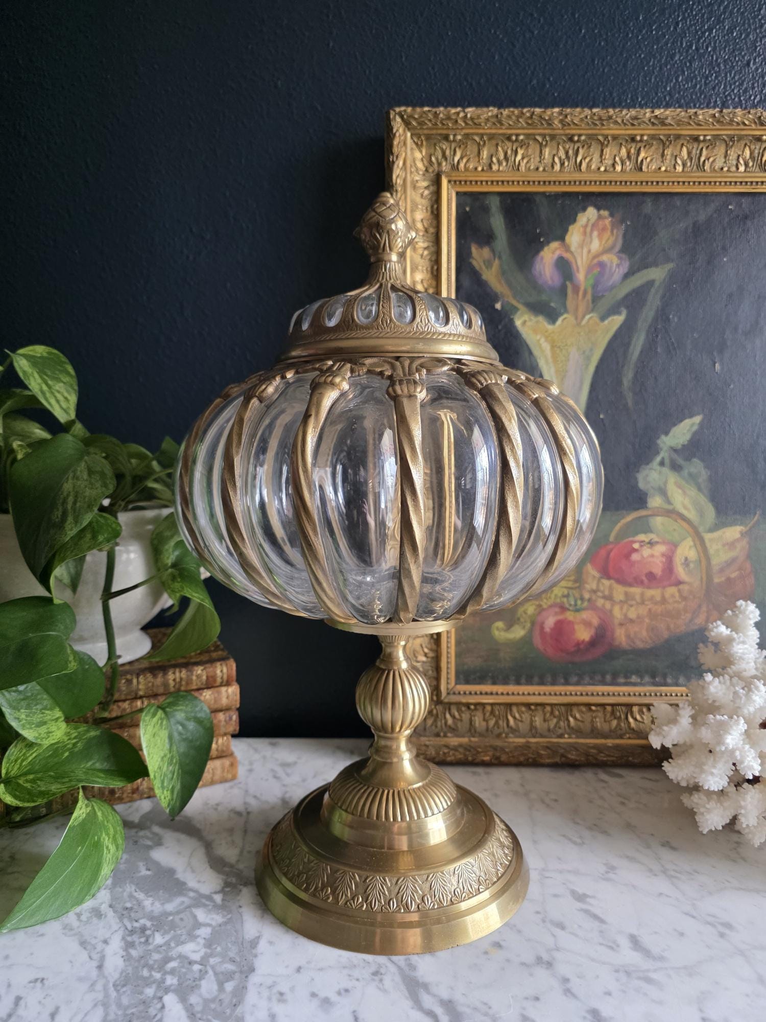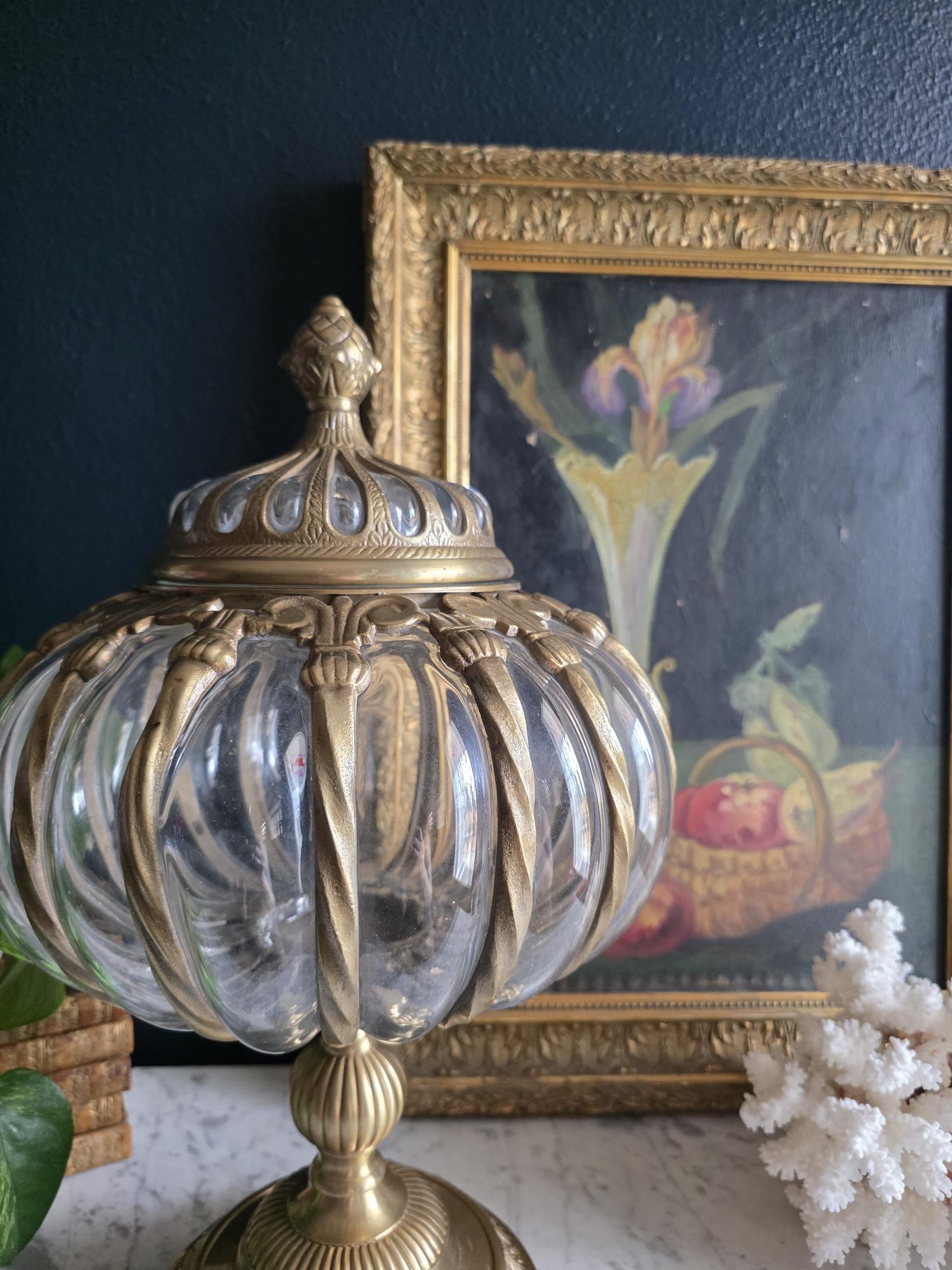 Make a grand statement with this stunning vintage lidded urn, featuring a beautiful combination of ornate cast brass metal and thick, ribbed optic clear glass. This substantial, oversized piece commands attention with its elegant, bulbous silhouette securely framed by beautifully twisted metal ribs. The intricate metalwork continues from top to bottom, boasting a decorative stylized finial on the lid, fluted accents on the pedestal stem, and a classically embossed leaf motif wrapping around the base. The clear, wavy glass gently catches the light, making it a spectacular standalone centerpiece, a unique apothecary-style display jar, or an opulent addition to a Hollywood Regency-inspired vignette. Retaining its original "Made in India" sticker on the underside, this heavy, well-crafted vessel features a warm, authentic patina and is in wonderful vintage condition. Whether gracing a mantelpiece, serving as a luxurious catchall, or simply standing as a sculptural work of art, this impressive jar brings instant vintage glamour to any space.