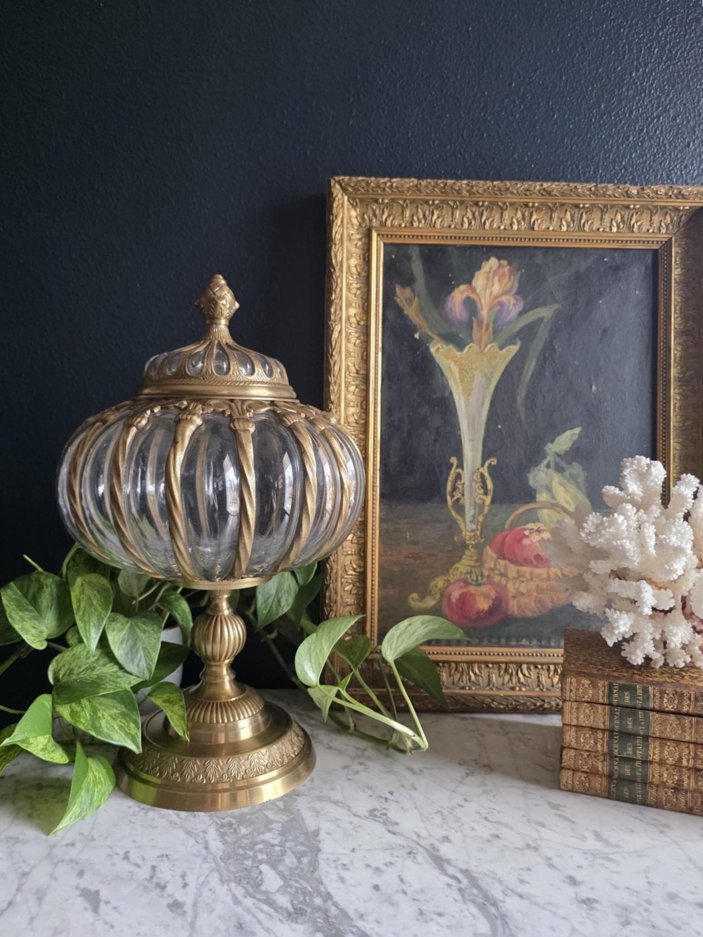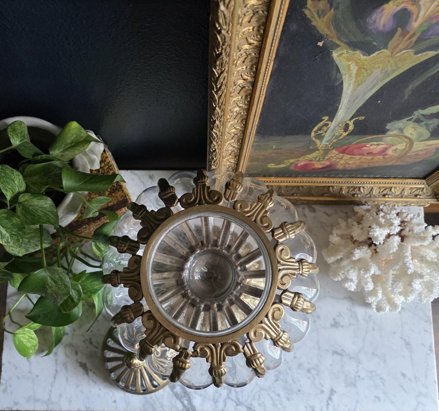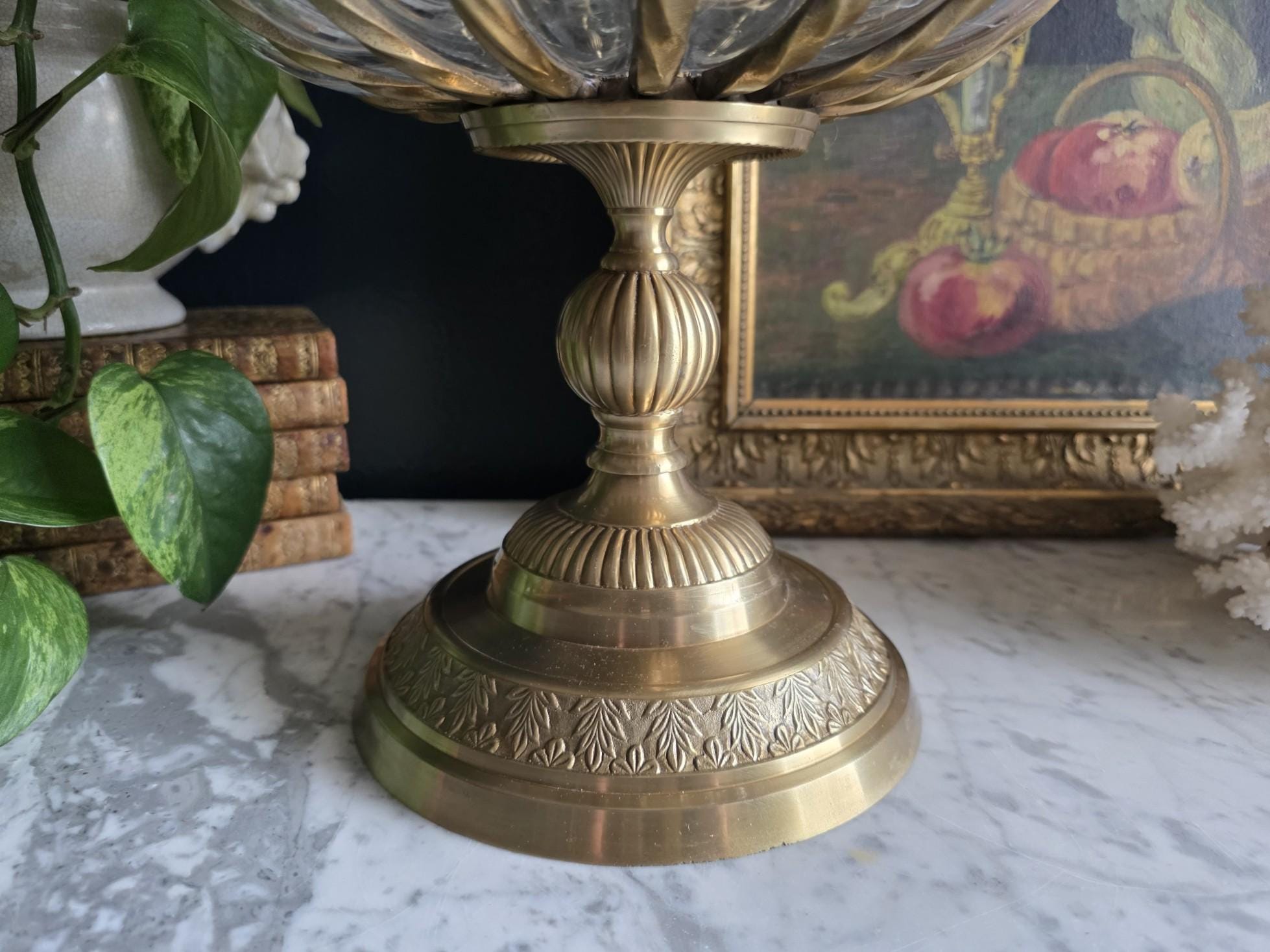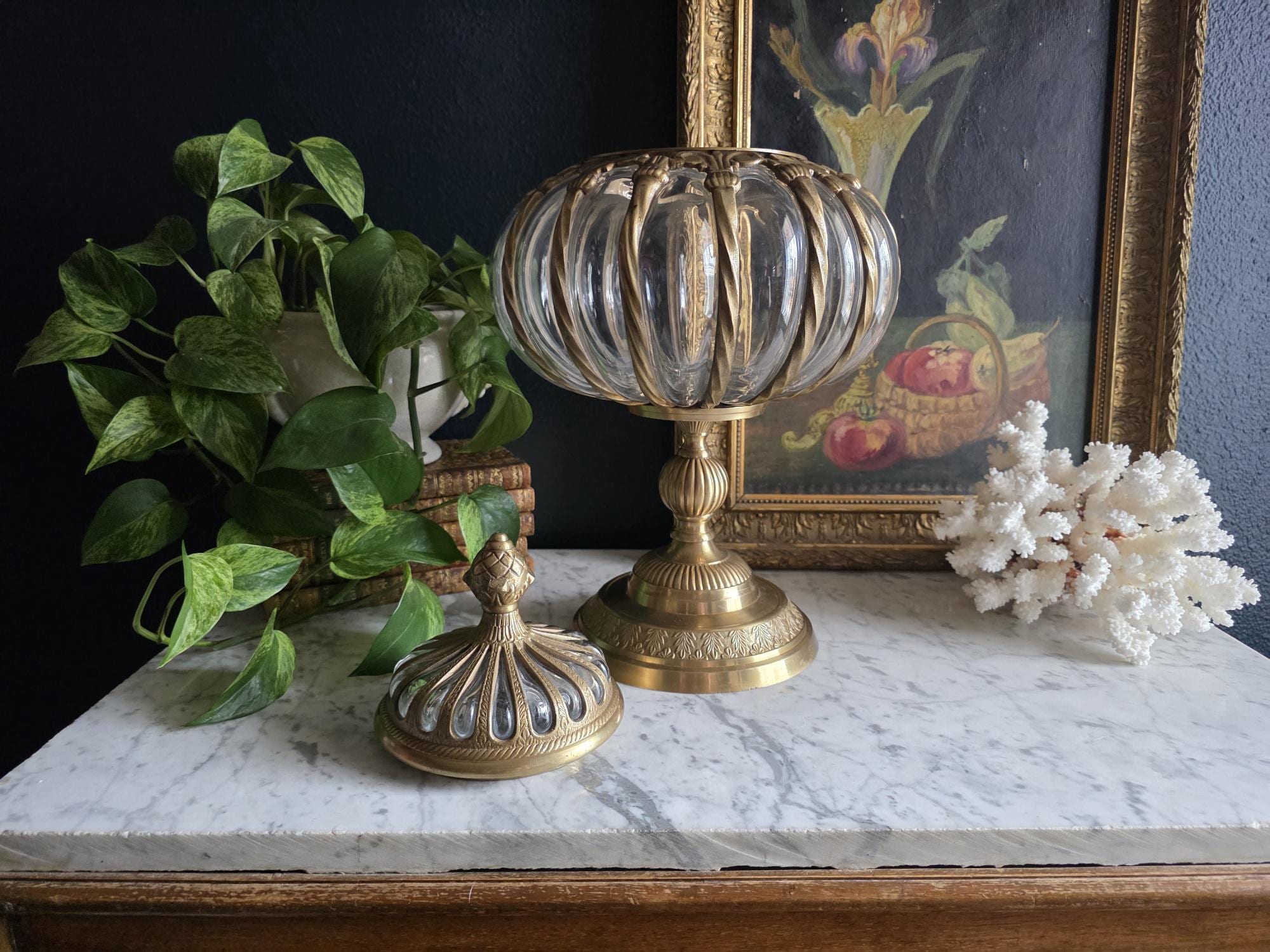 Make a grand statement with this stunning vintage lidded urn, featuring a beautiful combination of ornate cast brass metal and thick, ribbed optic clear glass. This substantial, oversized piece commands attention with its elegant, bulbous silhouette securely framed by beautifully twisted metal ribs. The intricate metalwork continues from top to bottom, boasting a decorative stylized finial on the lid, fluted accents on the pedestal stem, and a classically embossed leaf motif wrapping around the base. The clear, wavy glass gently catches the light, making it a spectacular standalone centerpiece, a unique apothecary-style display jar, or an opulent addition to a Hollywood Regency-inspired vignette. Retaining its original "Made in India" sticker on the underside, this heavy, well-crafted vessel features a warm, authentic patina and is in wonderful vintage condition. Whether gracing a mantelpiece, serving as a luxurious catchall, or simply standing as a sculptural work of art, this impressive jar brings instant vintage glamour to any space.