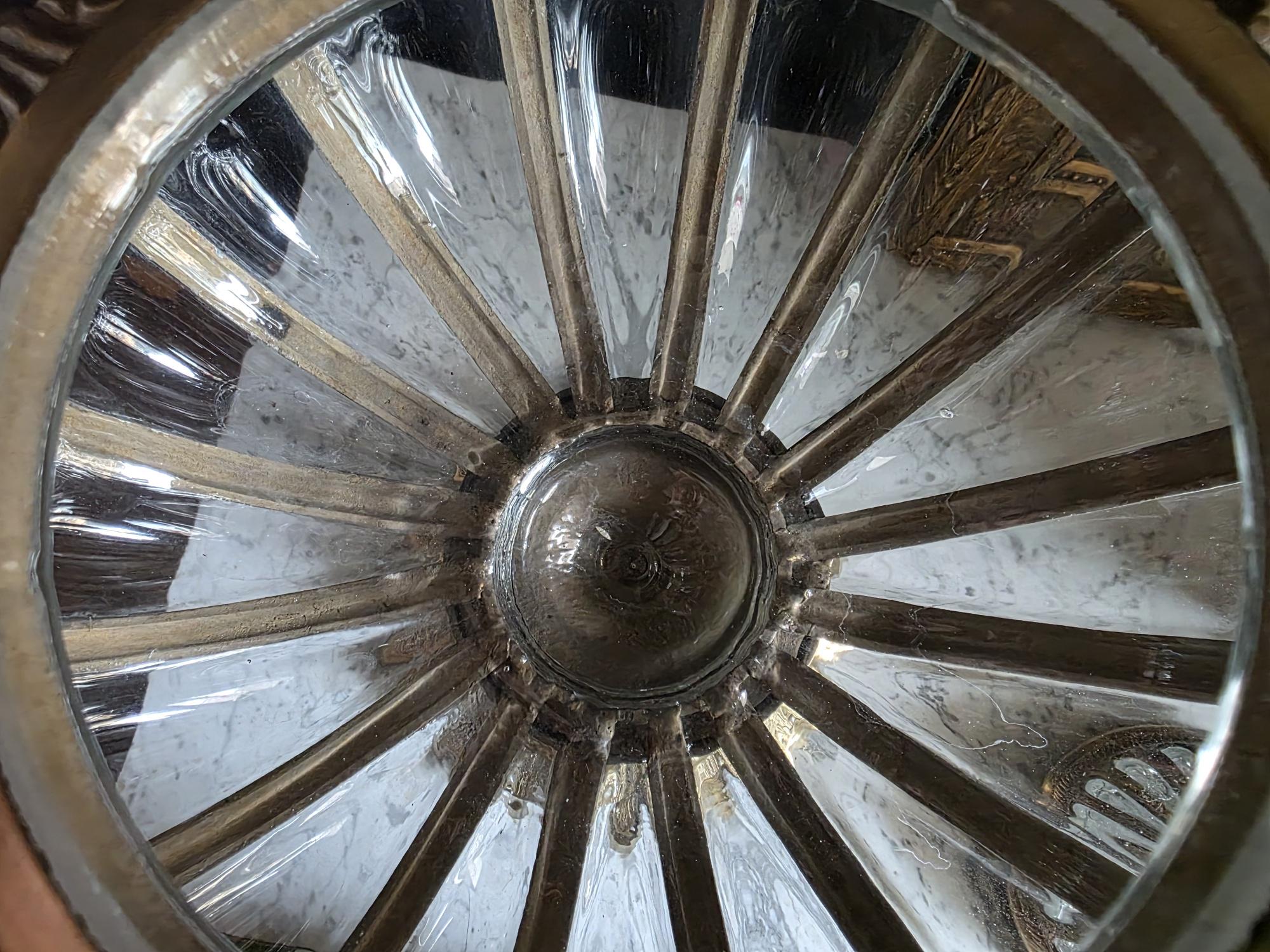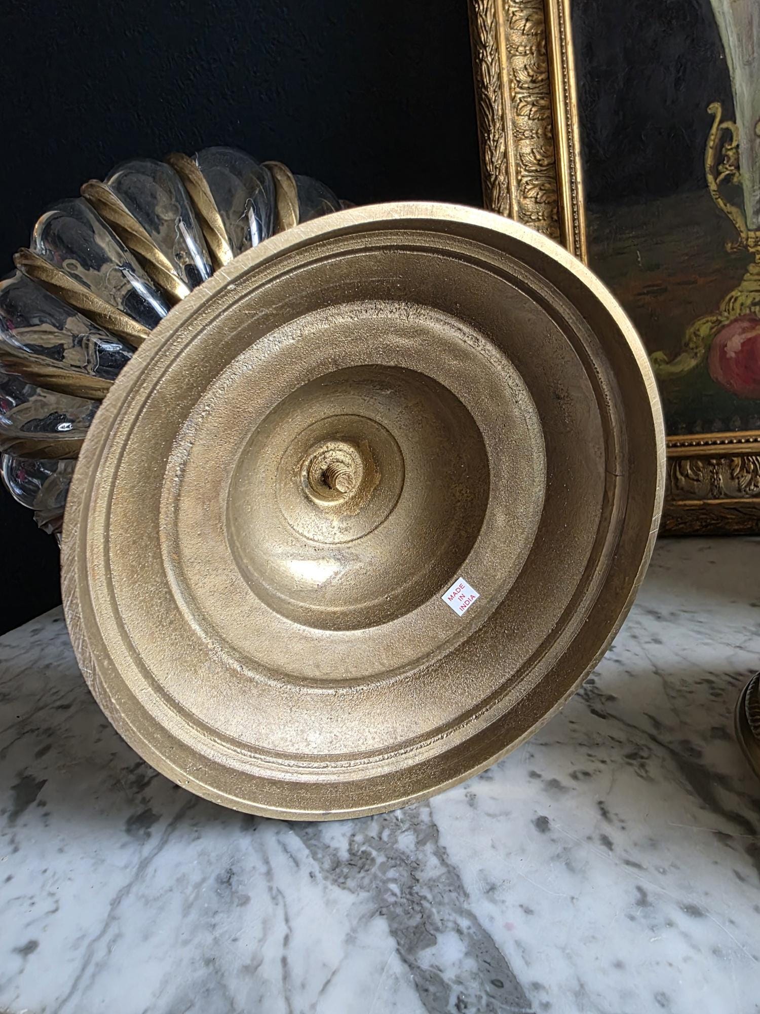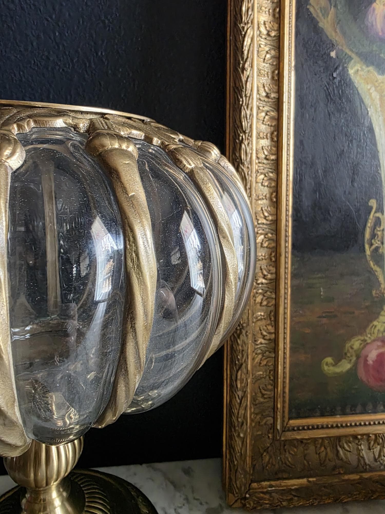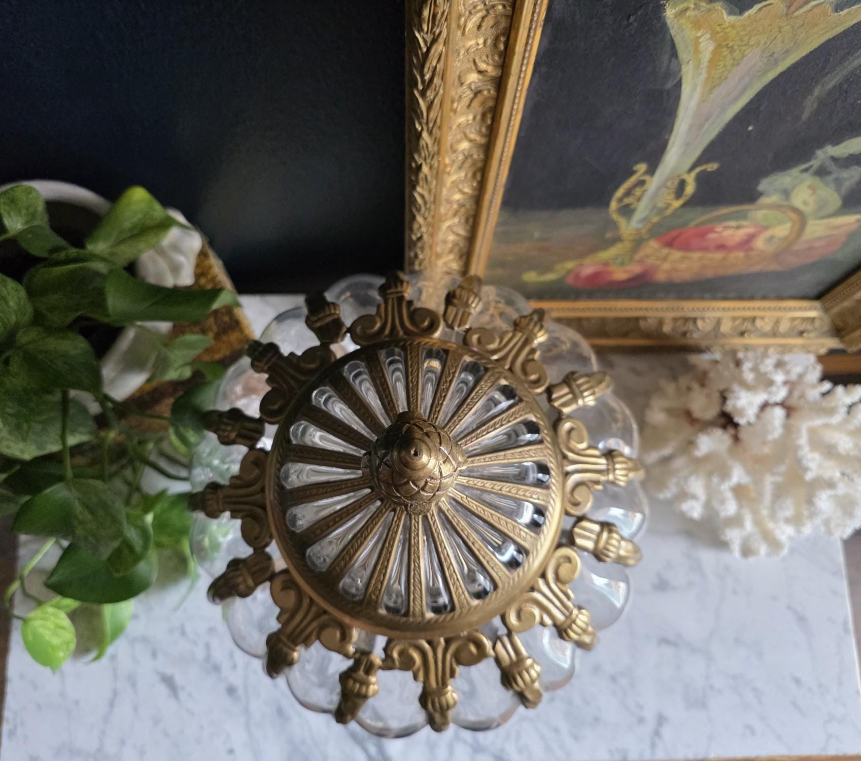 Make a grand statement with this stunning vintage lidded urn, featuring a beautiful combination of ornate cast brass metal and thick, ribbed optic clear glass. This substantial, oversized piece commands attention with its elegant, bulbous silhouette securely framed by beautifully twisted metal ribs. The intricate metalwork continues from top to bottom, boasting a decorative stylized finial on the lid, fluted accents on the pedestal stem, and a classically embossed leaf motif wrapping around the base. The clear, wavy glass gently catches the light, making it a spectacular standalone centerpiece, a unique apothecary-style display jar, or an opulent addition to a Hollywood Regency-inspired vignette. Retaining its original "Made in India" sticker on the underside, this heavy, well-crafted vessel features a warm, authentic patina and is in wonderful vintage condition. Whether gracing a mantelpiece, serving as a luxurious catchall, or simply standing as a sculptural work of art, this impressive jar brings instant vintage glamour to any space.