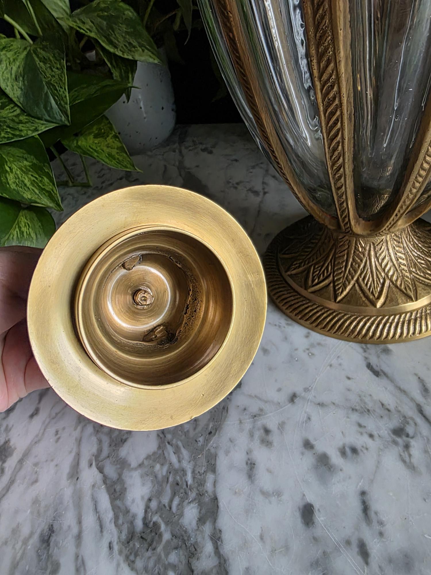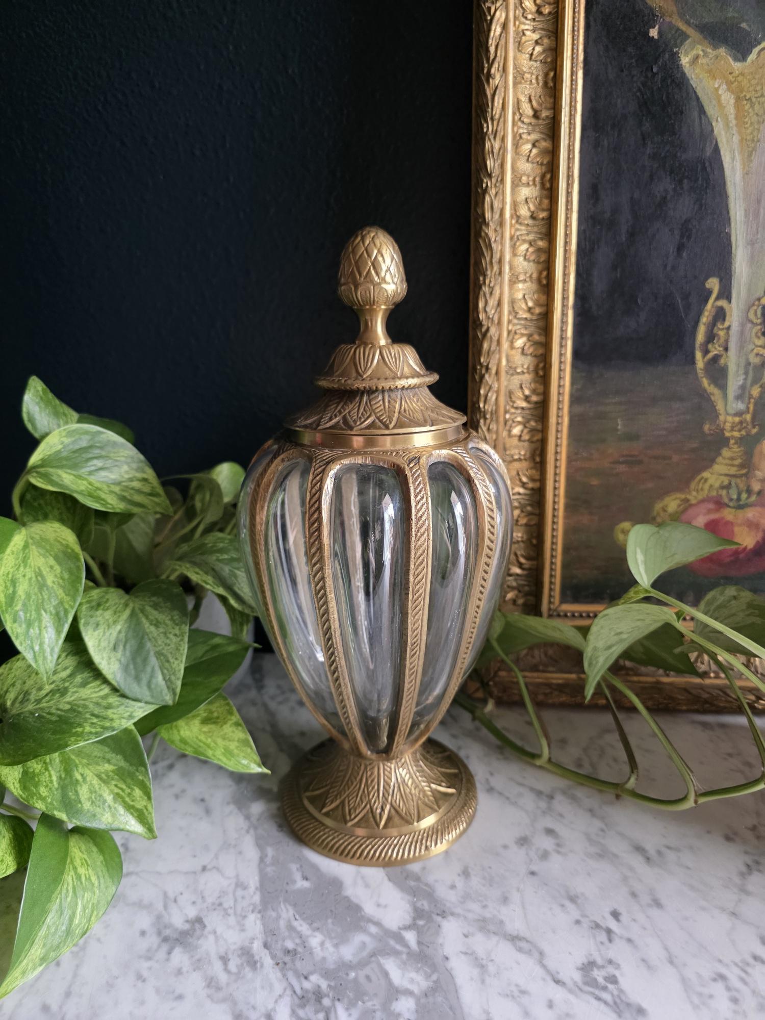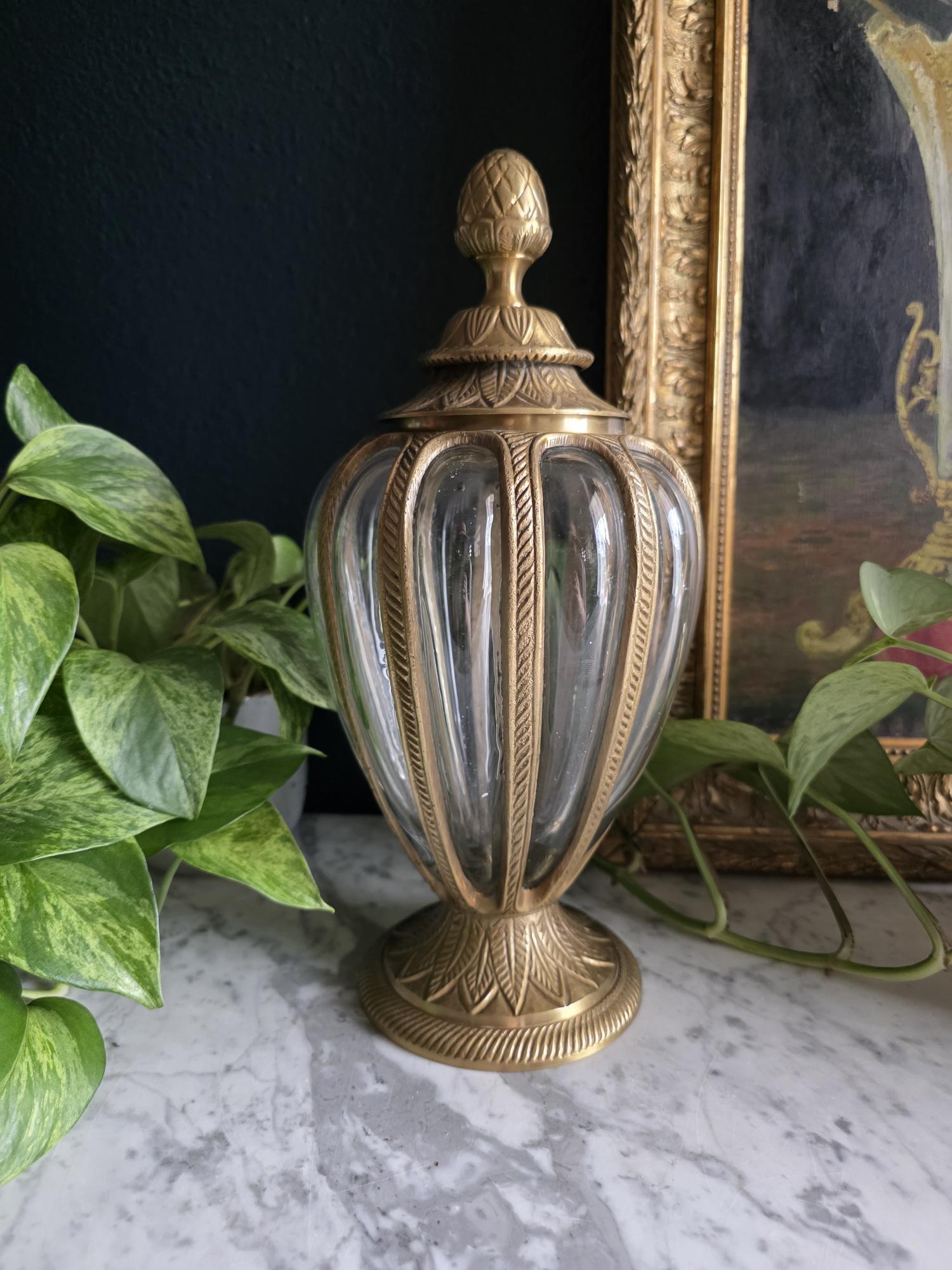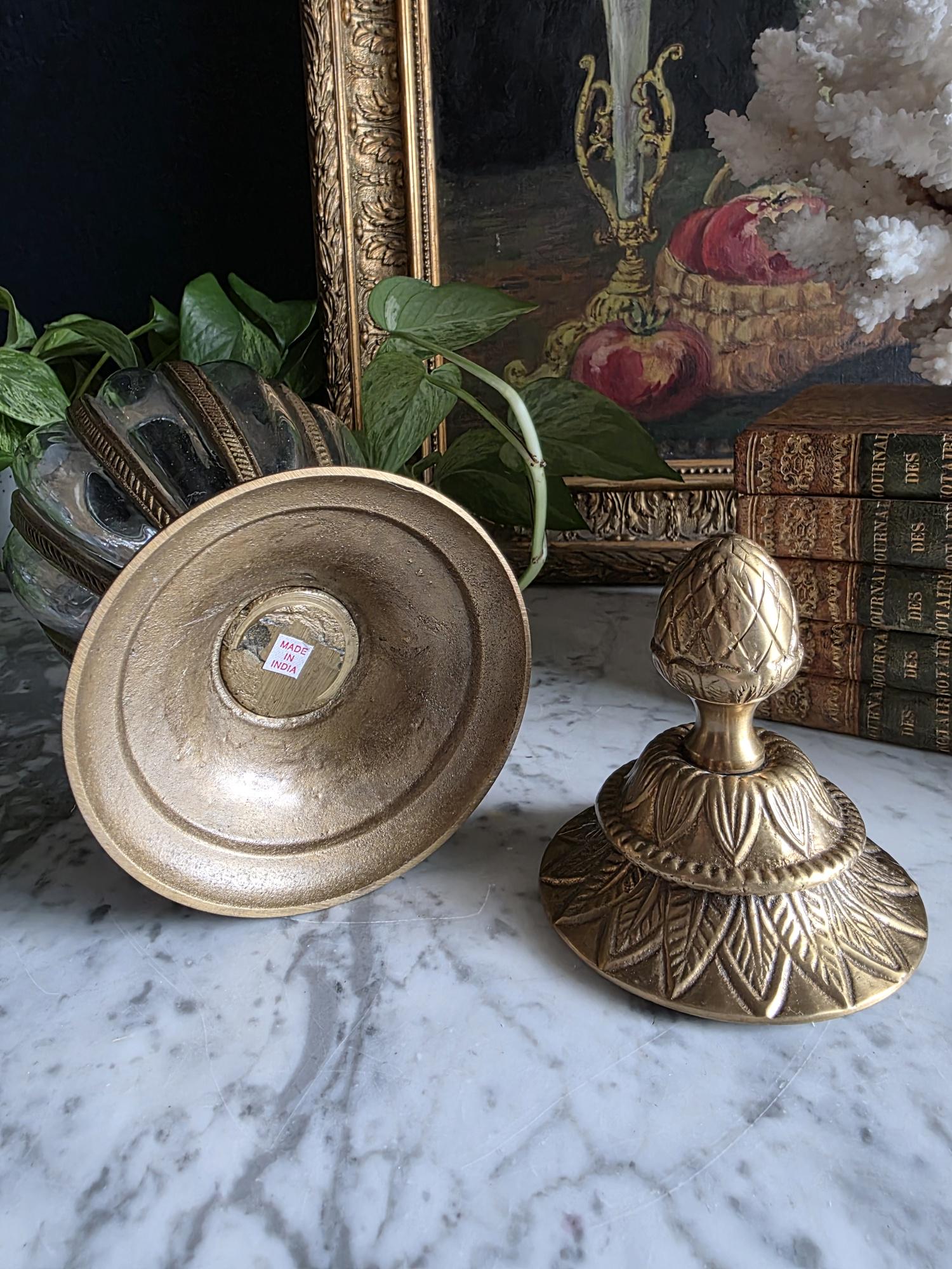 Add a touch of timeless elegance to your decor with this exquisite vintage cast brass and glass lidded urn. This striking piece features a graceful, elongated teardrop silhouette beautifully defined by heavy metal ribs that securely cage the thick, clear optic glass. The meticulous craftsmanship is showcased in its ornate details, from the striking stylized pinecone finial resting atop a lid adorned with an embossed leaf motif, to the matching flared pedestal base finished with a classic rope-twist edge. Catching the light beautifully, the ribbed glass makes this vessel a perfect standalone focal point, an elegant terrarium, or an opulent apothecary-style jar for your vanity or bookshelf. Retaining its original "Made in India" sticker on the underside, this substantial piece boasts a warm, authentic vintage patina and remains in wonderful condition. Whether you are leaning into Hollywood Regency glamour or classic traditional styling, this beautifully crafted urn adds an instant touch of sophisticated charm to any room.