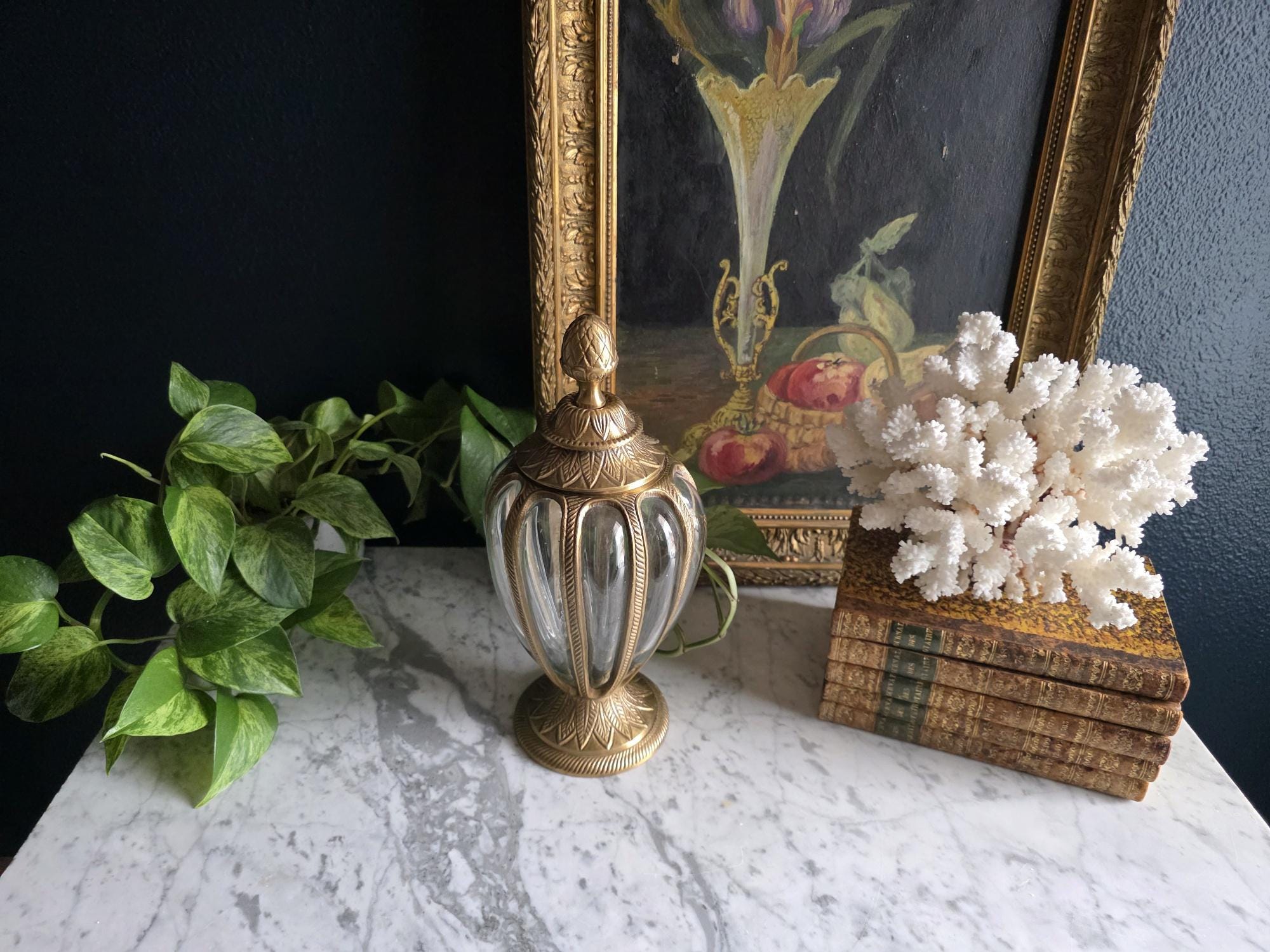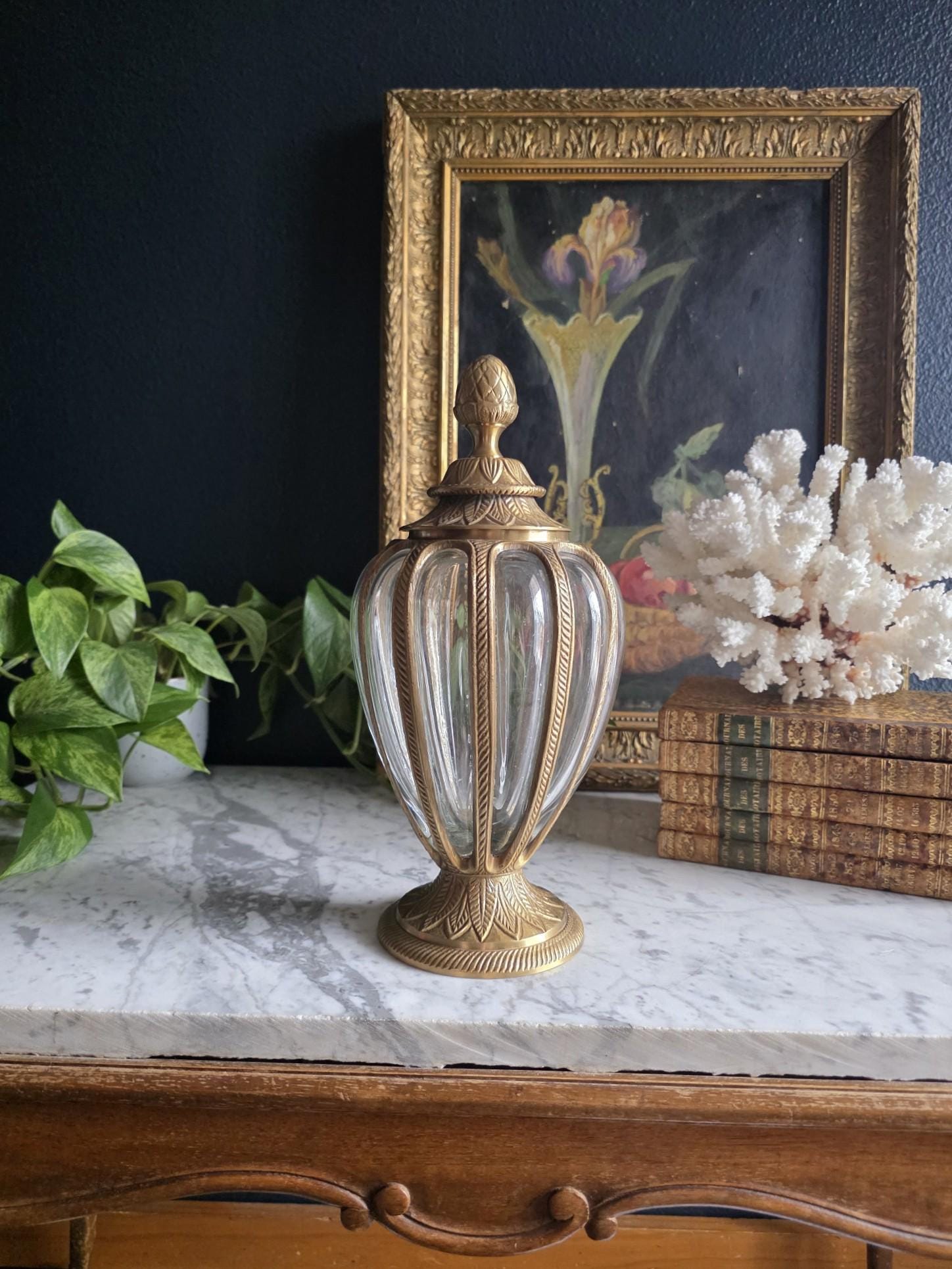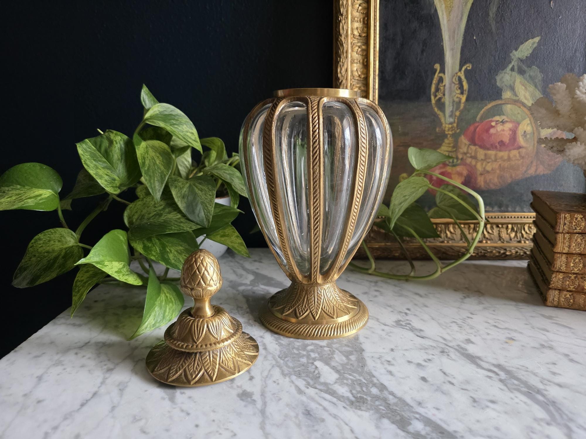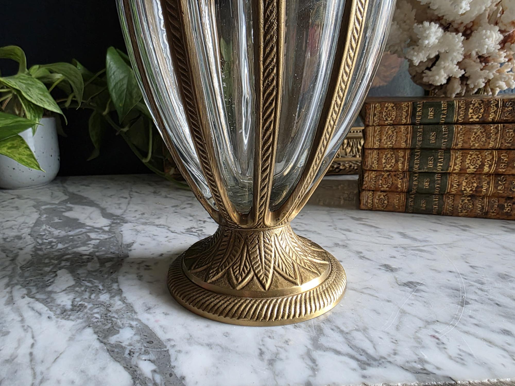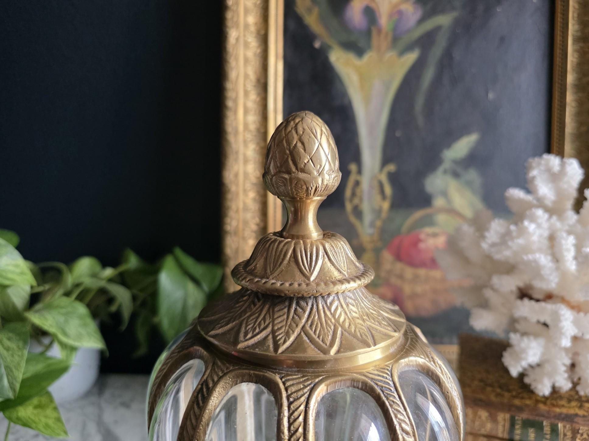 Add a touch of timeless elegance to your decor with this exquisite vintage cast brass and glass lidded urn. This striking piece features a graceful, elongated teardrop silhouette beautifully defined by heavy metal ribs that securely cage the thick, clear optic glass. The meticulous craftsmanship is showcased in its ornate details, from the striking stylized pinecone finial resting atop a lid adorned with an embossed leaf motif, to the matching flared pedestal base finished with a classic rope-twist edge. Catching the light beautifully, the ribbed glass makes this vessel a perfect standalone focal point, an elegant terrarium, or an opulent apothecary-style jar for your vanity or bookshelf. Retaining its original "Made in India" sticker on the underside, this substantial piece boasts a warm, authentic vintage patina and remains in wonderful condition. Whether you are leaning into Hollywood Regency glamour or classic traditional styling, this beautifully crafted urn adds an instant touch of sophisticated charm to any room.