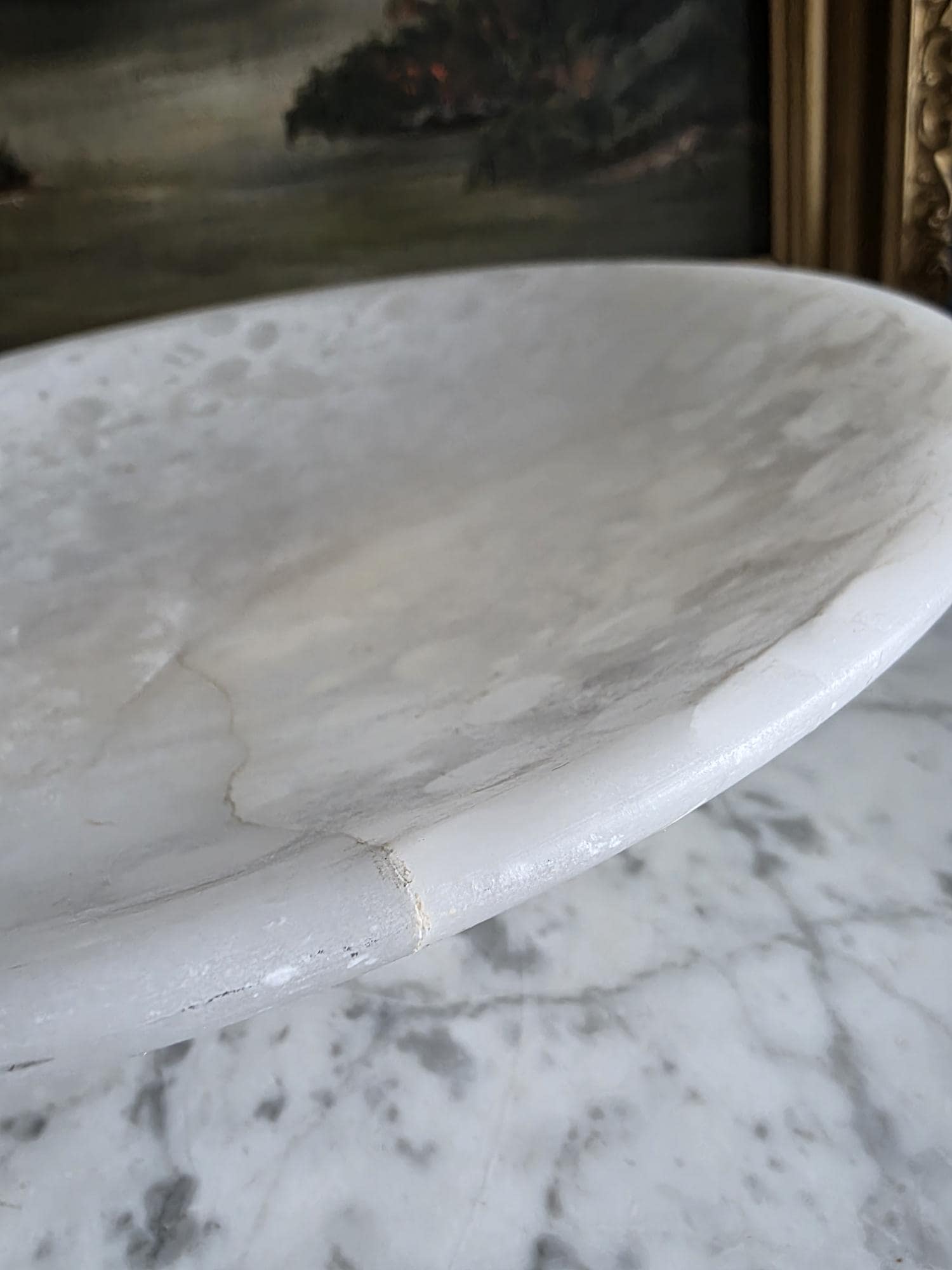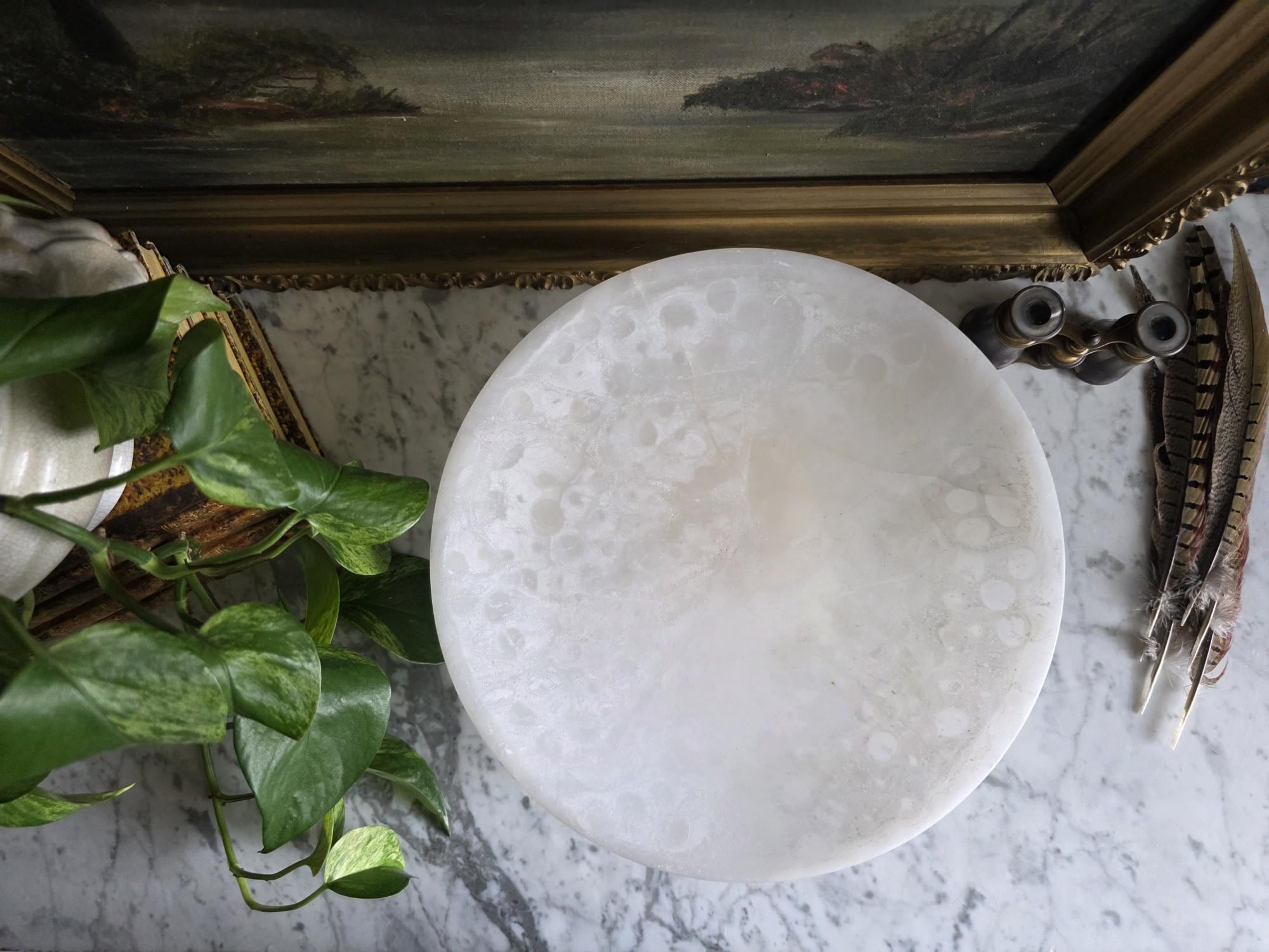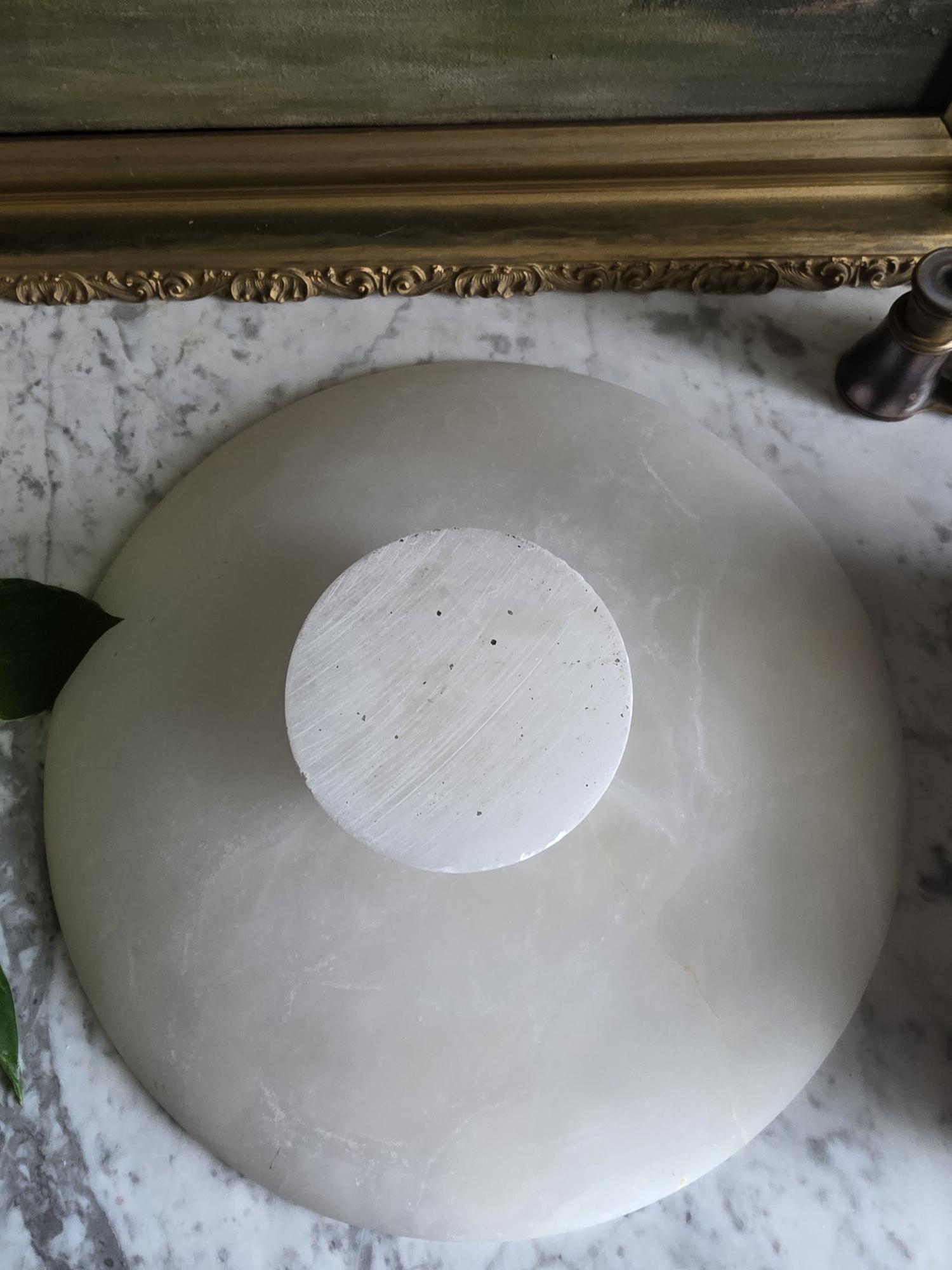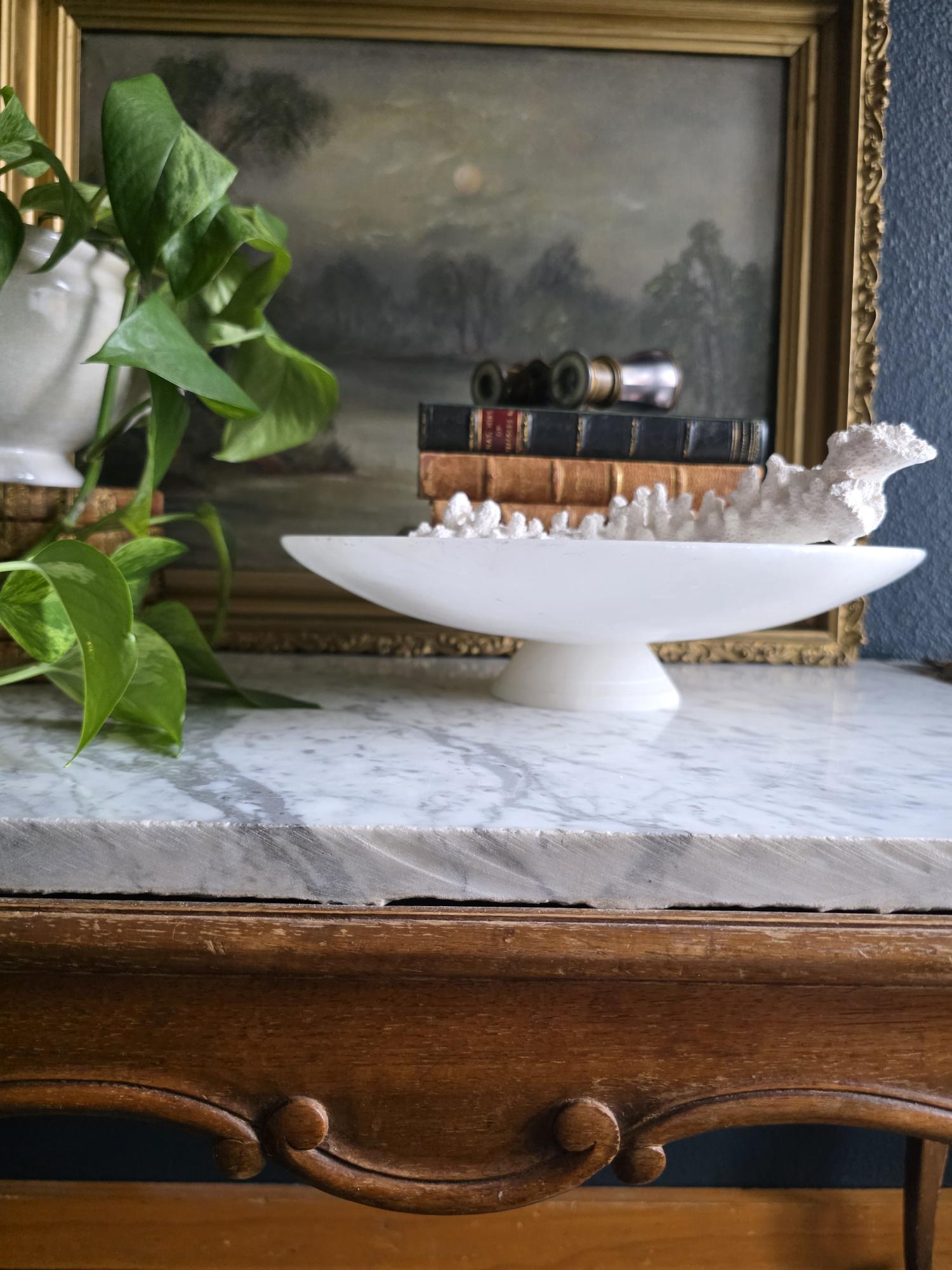 Presenting a beautifully substantial vintage white alabaster compote, featuring a wide, shallow bowl resting gracefully on a pedestal base. This striking piece showcases the mesmerizing natural beauty of carved alabaster, with characteristic semi-translucent, cloud-like orbicular patterns and subtle veining moving throughout the stone. The piece's neutral, creamy-white palette and elegant silhouette make it an incredibly versatile styling prop for modern organic, classical, or wabi-sabi interiors. Please note that this compote is in imperfect vintage condition and features a prominent, previously crack extending from the outer rim toward the center of the bowl. This crack is a notable flaw but does not compromise structural integrity. Additionally, it shows typical signs of age and handling, including minor surface wear, scuffs, and small flea-bite chips along the edges of the rim and the pedestal foot. Because of this wear, the compote is best suited for dry decorative use—making it a perfect sculptural catch-all for coral, dried botanicals, or decorative spheres.