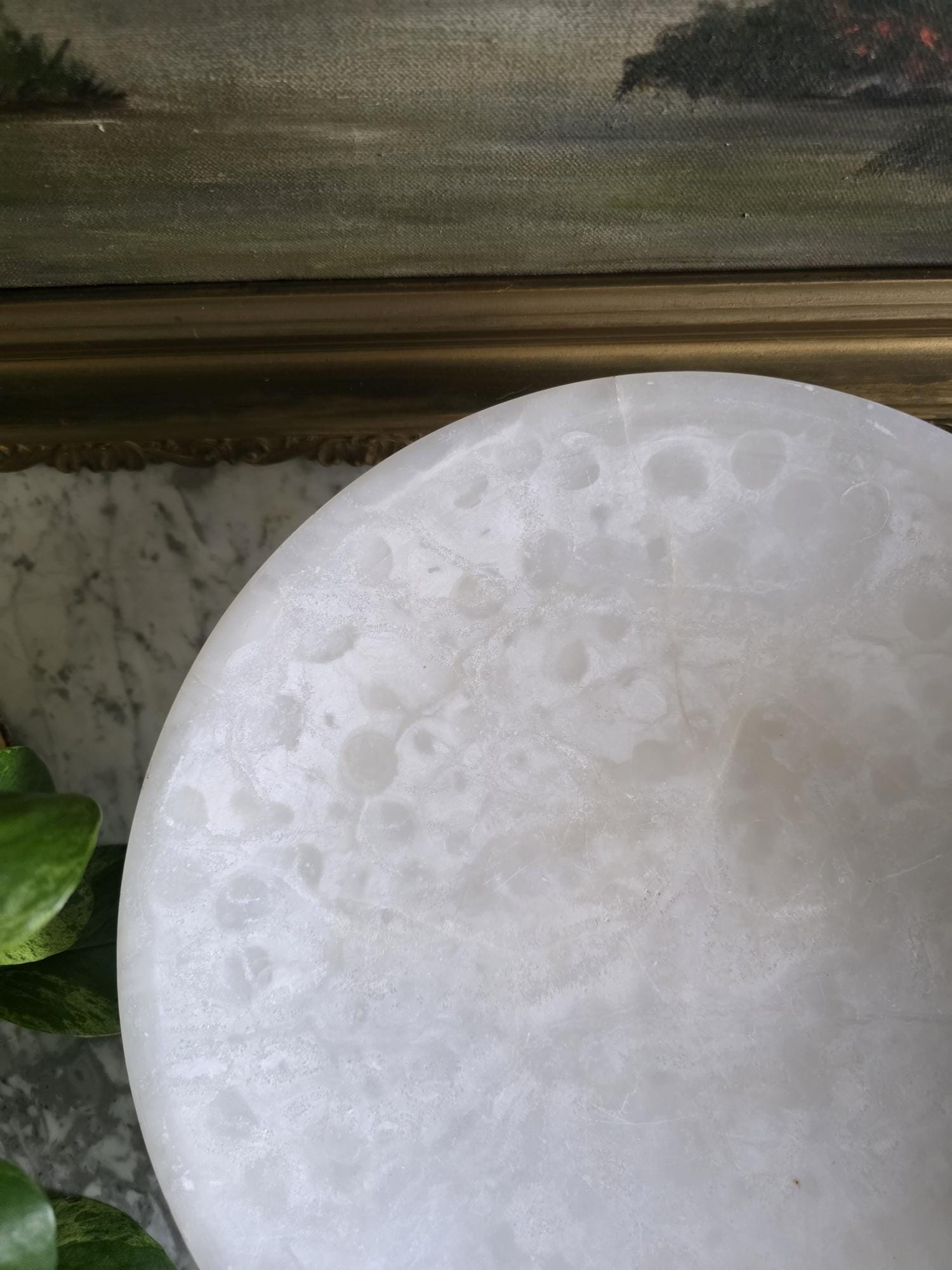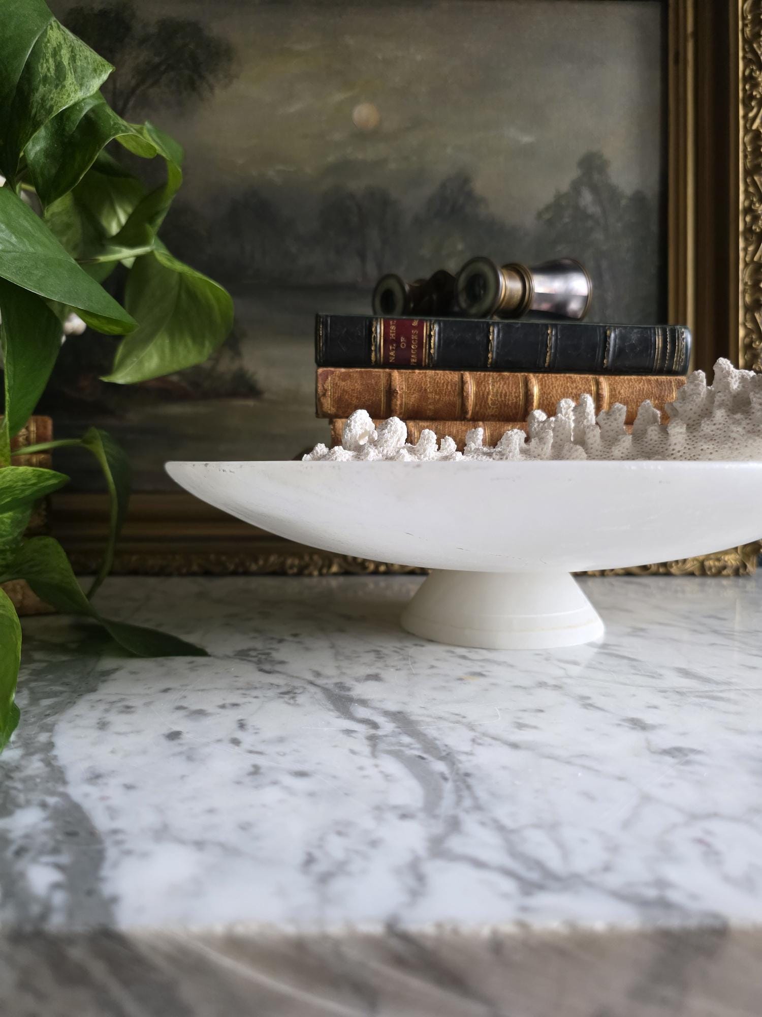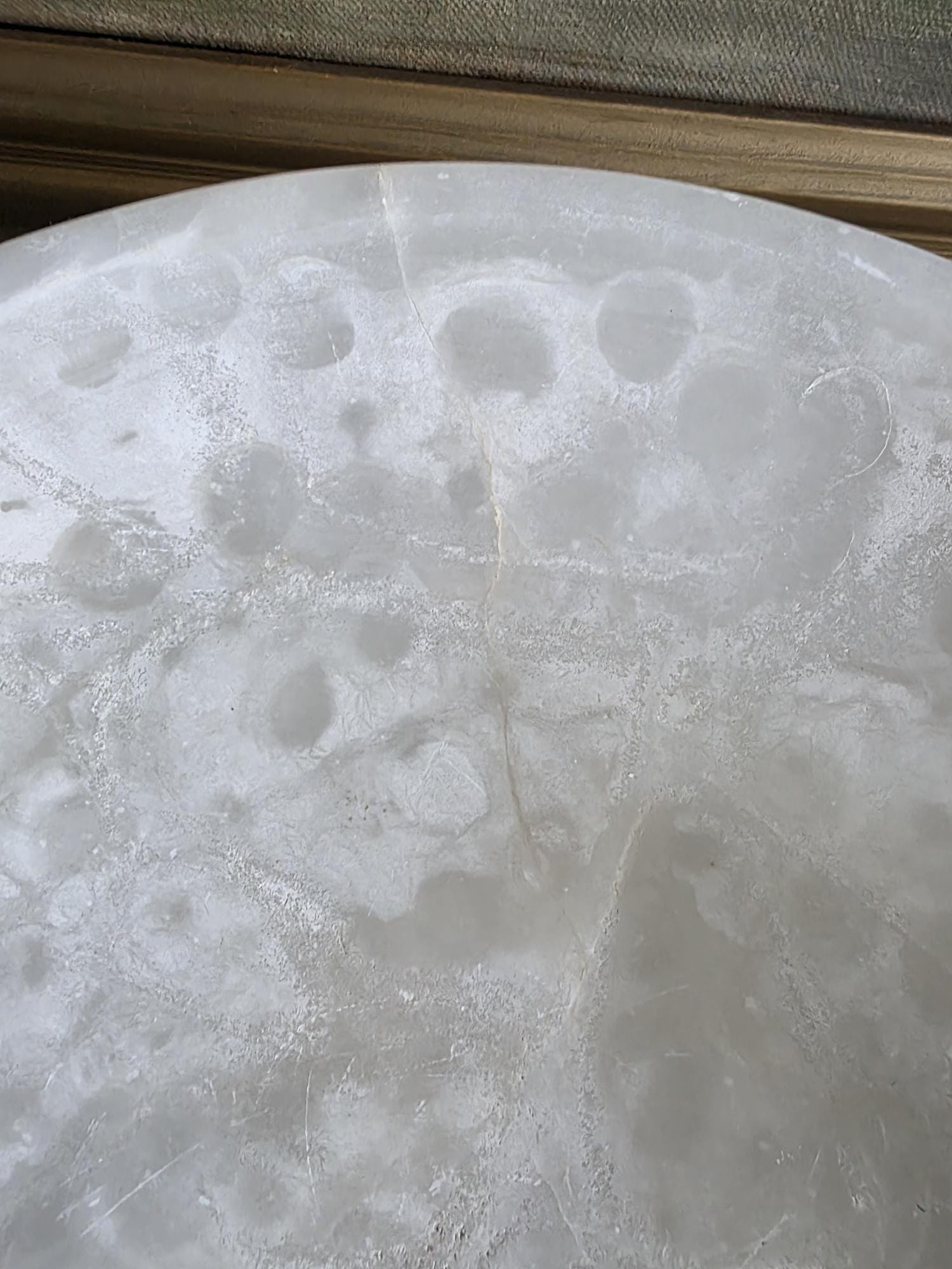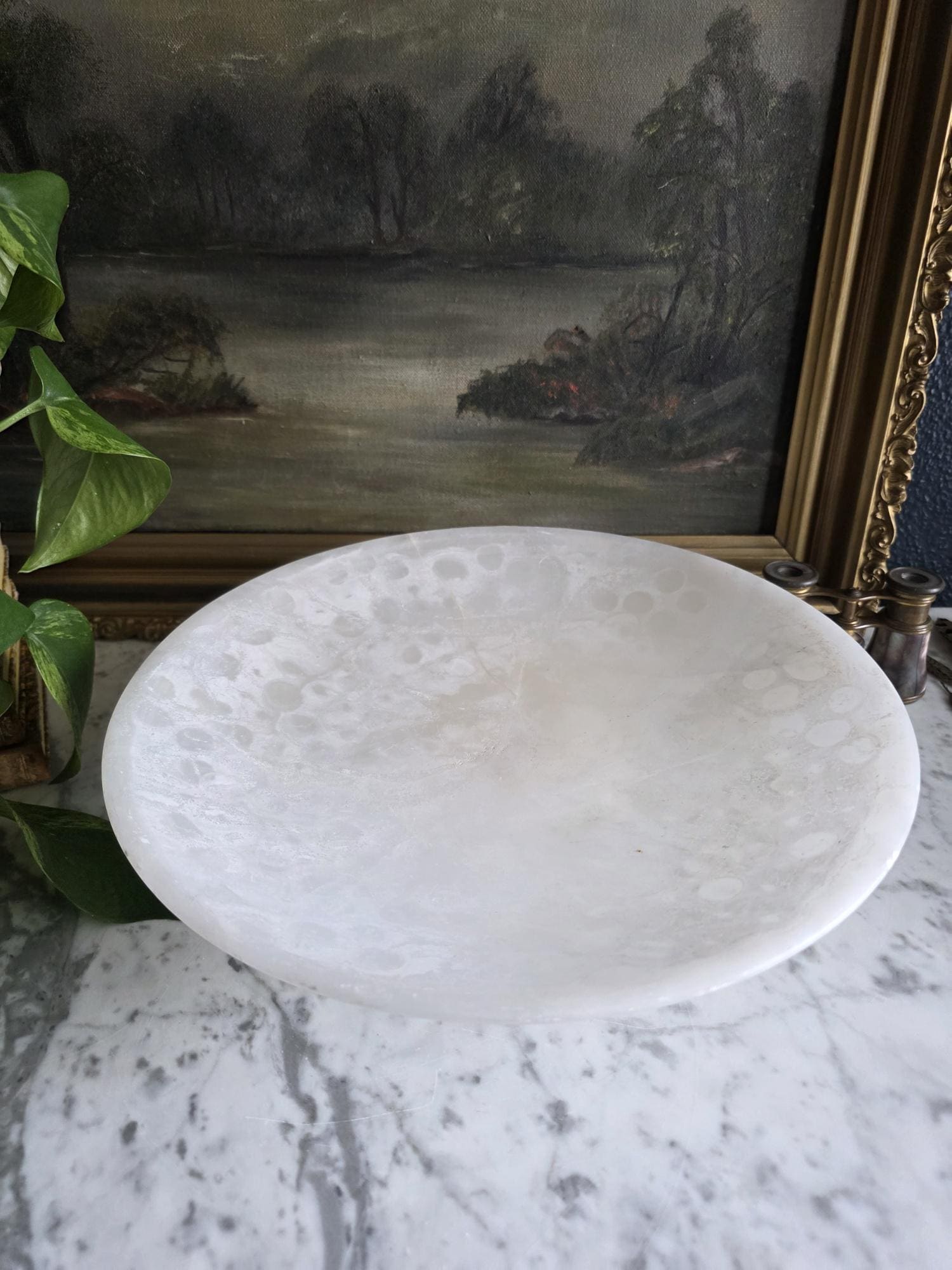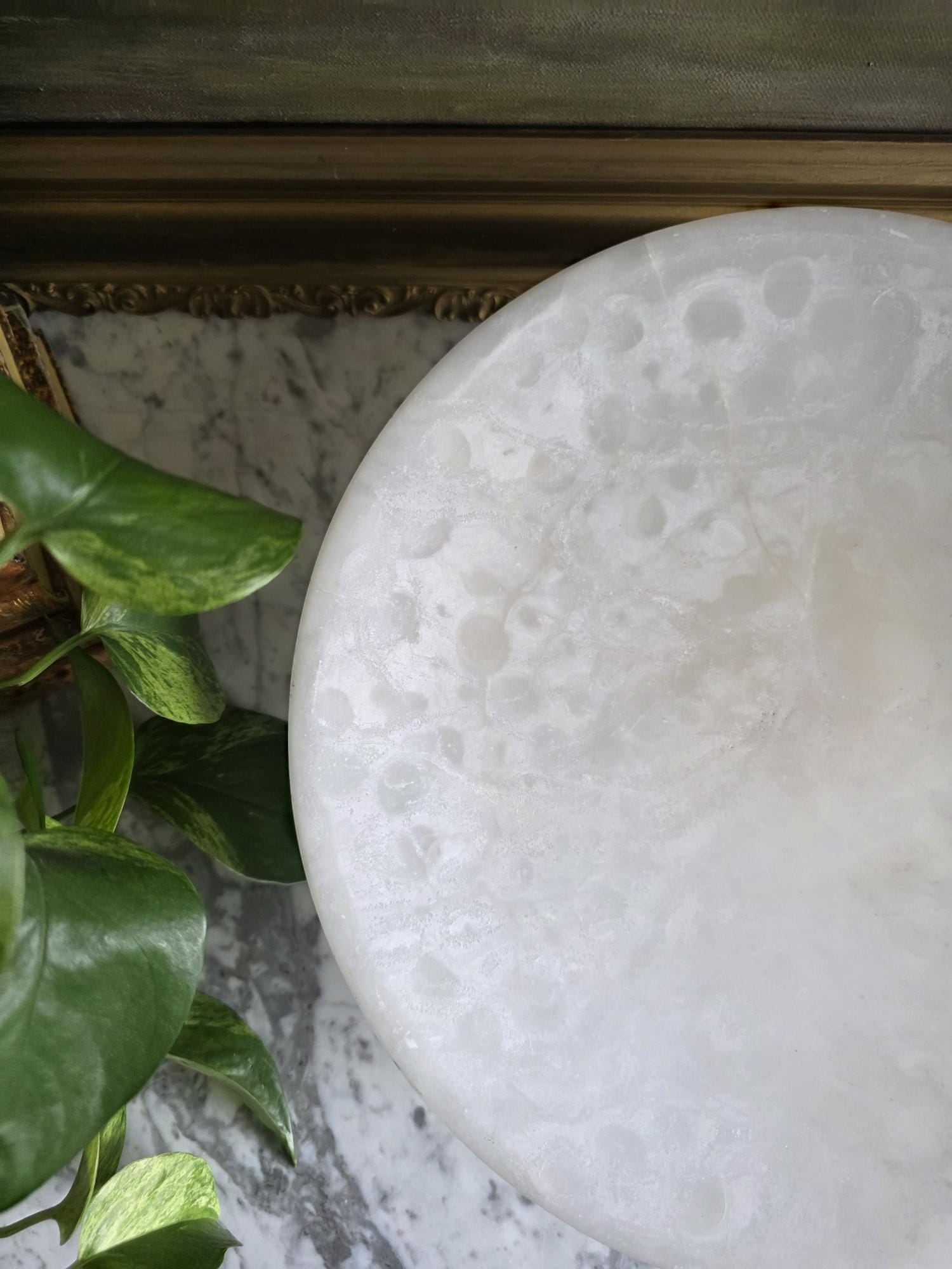 Presenting a beautifully substantial vintage white alabaster compote, featuring a wide, shallow bowl resting gracefully on a pedestal base. This striking piece showcases the mesmerizing natural beauty of carved alabaster, with characteristic semi-translucent, cloud-like orbicular patterns and subtle veining moving throughout the stone. The piece's neutral, creamy-white palette and elegant silhouette make it an incredibly versatile styling prop for modern organic, classical, or wabi-sabi interiors. Please note that this compote is in imperfect vintage condition and features a prominent, previously crack extending from the outer rim toward the center of the bowl. This crack is a notable flaw but does not compromise structural integrity. Additionally, it shows typical signs of age and handling, including minor surface wear, scuffs, and small flea-bite chips along the edges of the rim and the pedestal foot. Because of this wear, the compote is best suited for dry decorative use—making it a perfect sculptural catch-all for coral, dried botanicals, or decorative spheres.