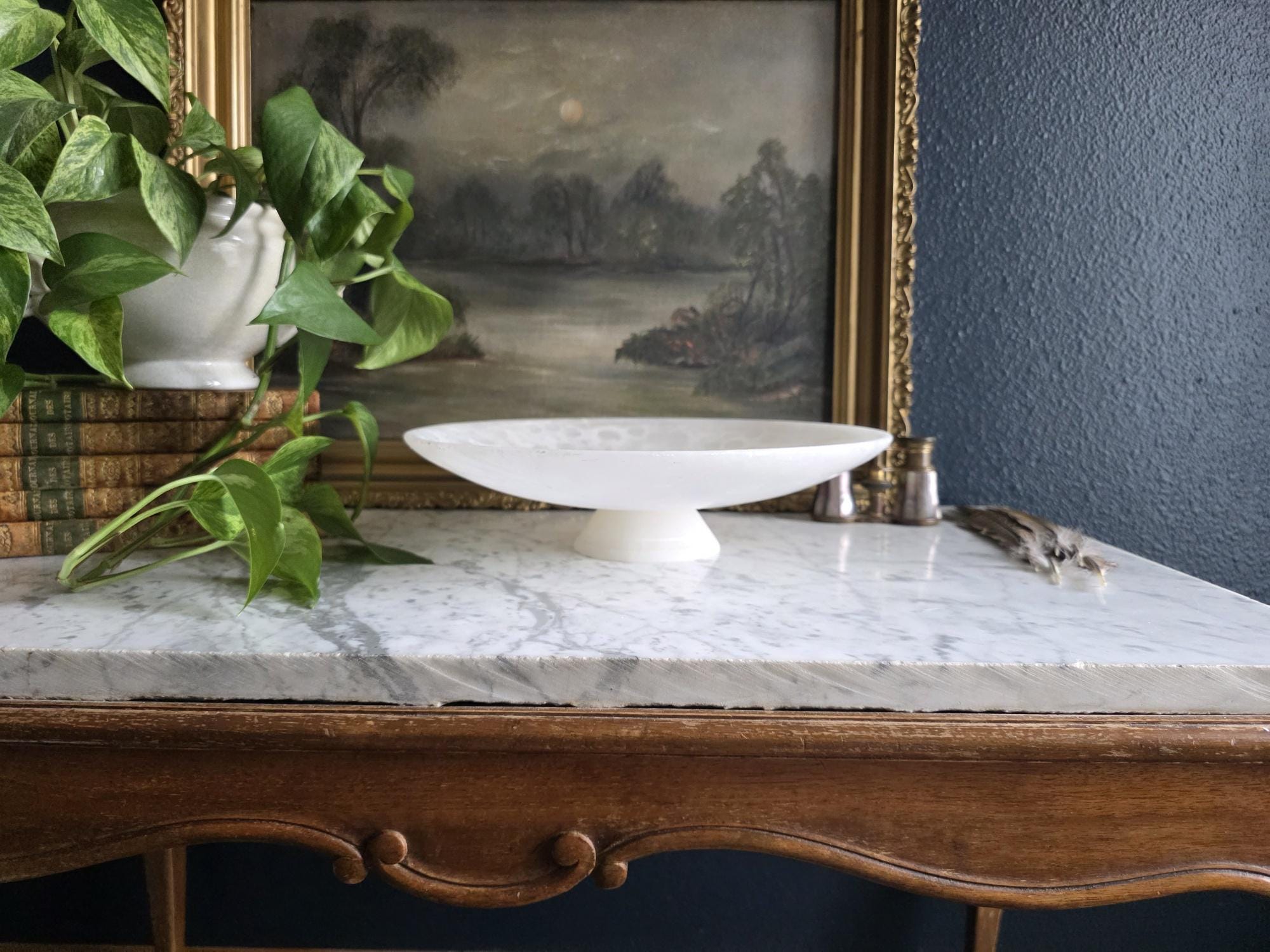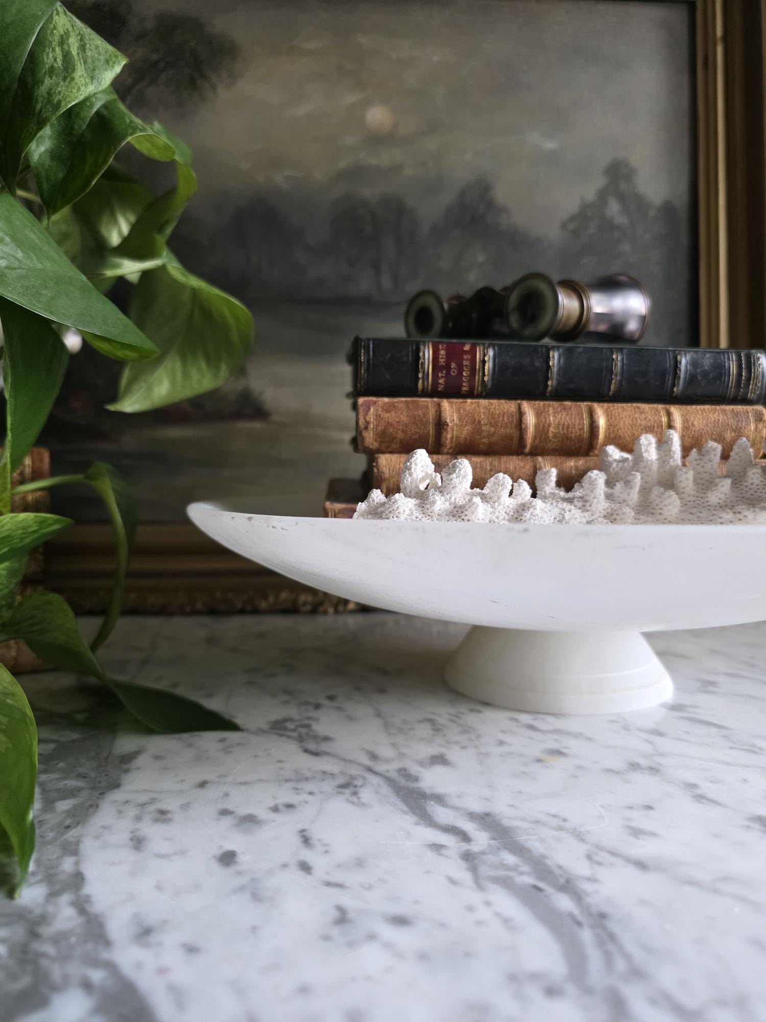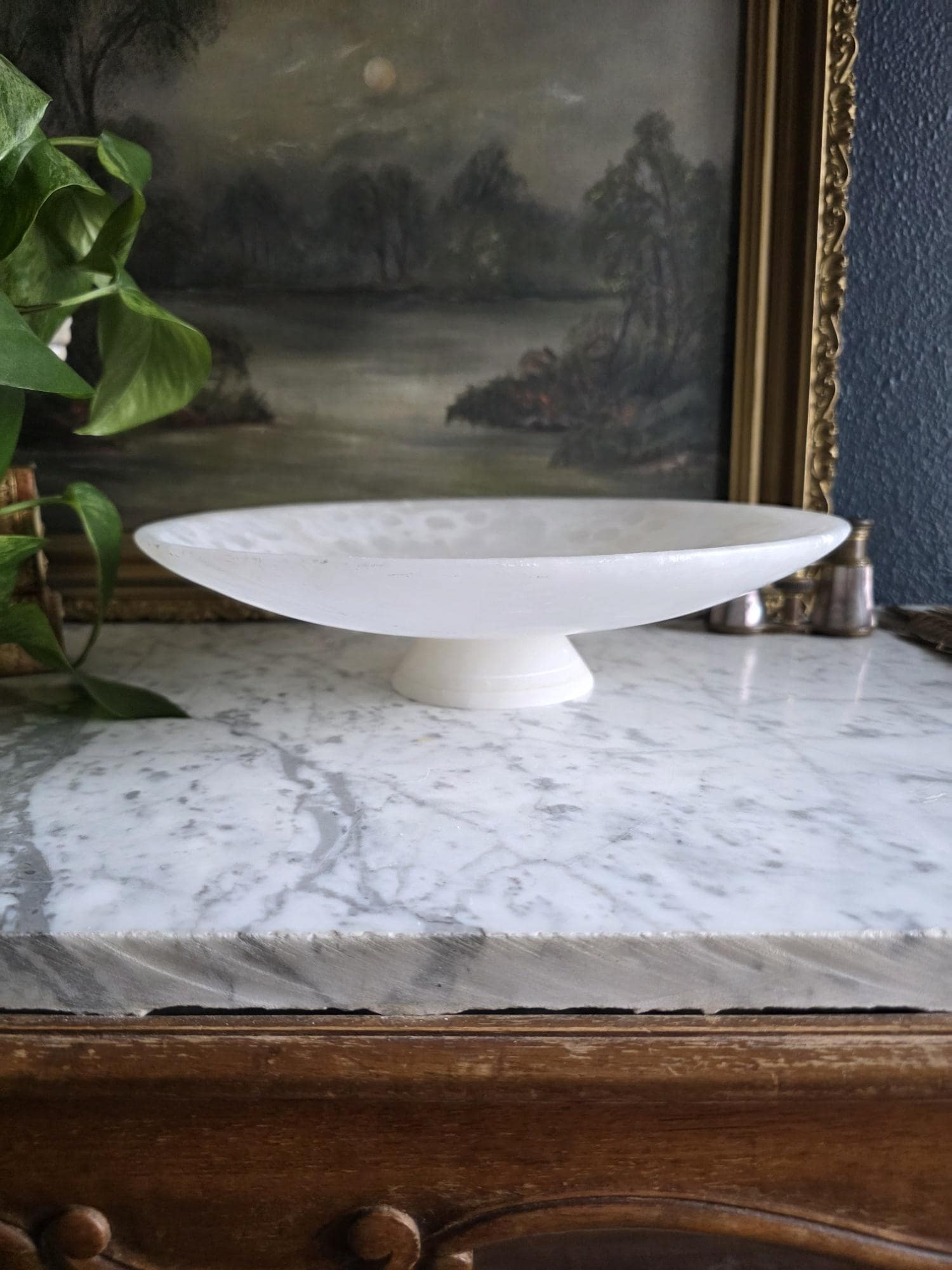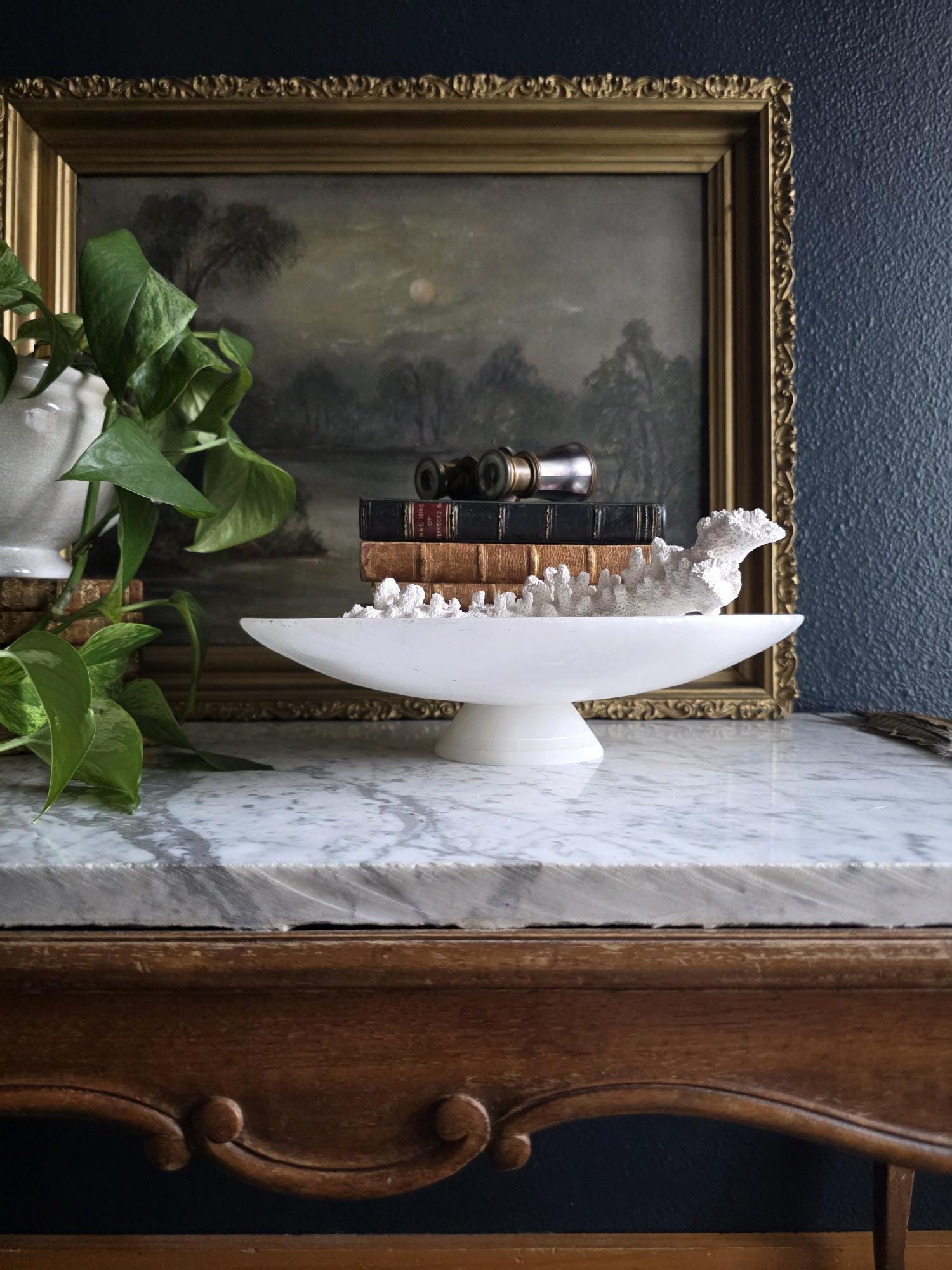 Presenting a beautifully substantial vintage white alabaster compote, featuring a wide, shallow bowl resting gracefully on a pedestal base. This striking piece showcases the mesmerizing natural beauty of carved alabaster, with characteristic semi-translucent, cloud-like orbicular patterns and subtle veining moving throughout the stone. The piece's neutral, creamy-white palette and elegant silhouette make it an incredibly versatile styling prop for modern organic, classical, or wabi-sabi interiors. Please note that this compote is in imperfect vintage condition and features a prominent, previously crack extending from the outer rim toward the center of the bowl. This crack is a notable flaw but does not compromise structural integrity. Additionally, it shows typical signs of age and handling, including minor surface wear, scuffs, and small flea-bite chips along the edges of the rim and the pedestal foot. Because of this wear, the compote is best suited for dry decorative use—making it a perfect sculptural catch-all for coral, dried botanicals, or decorative spheres.