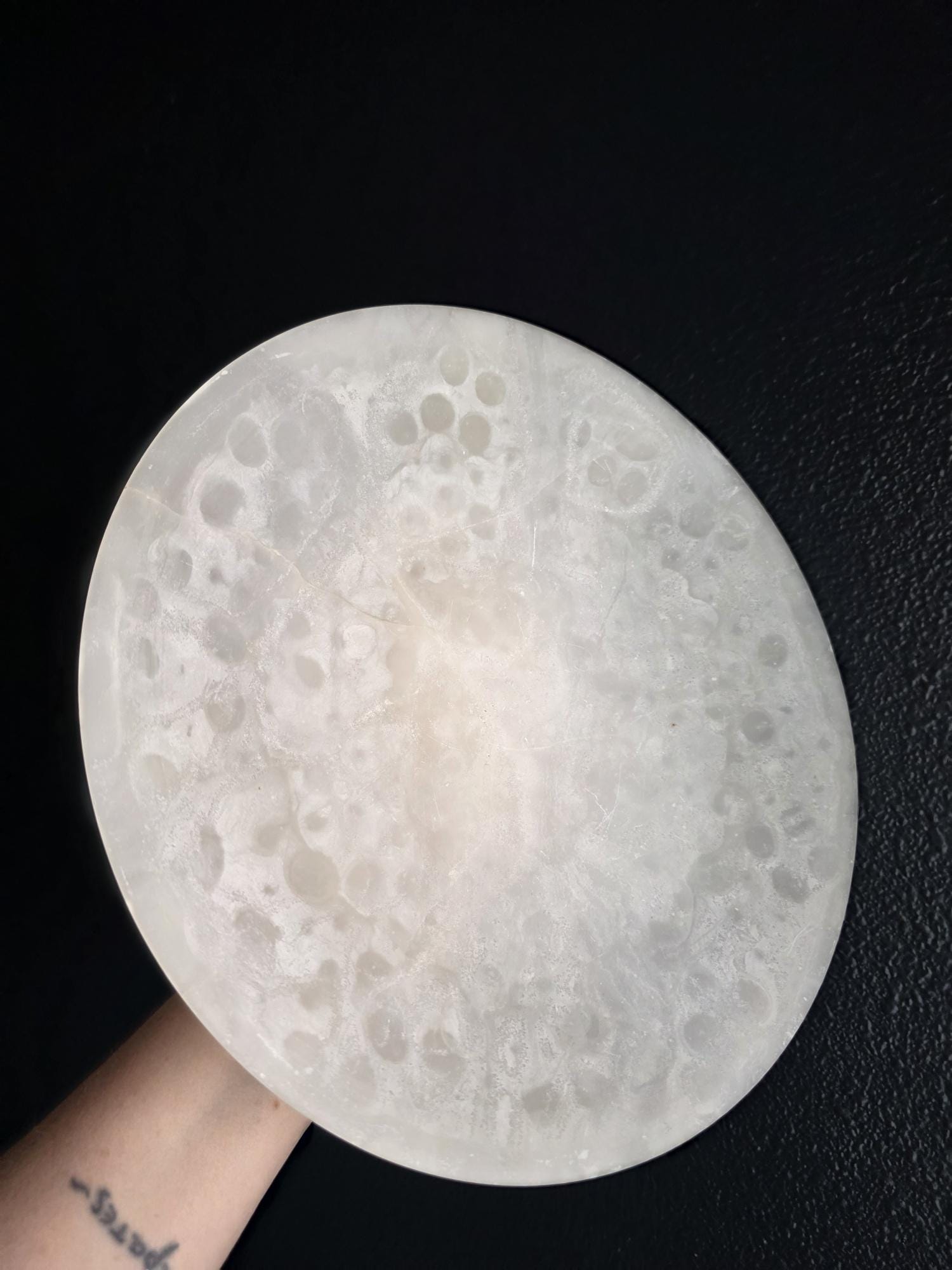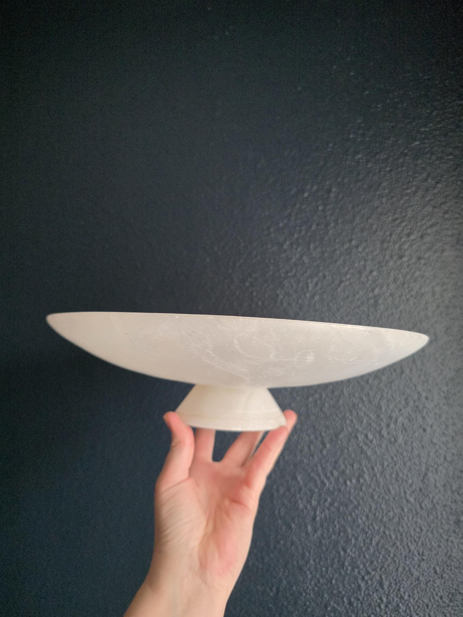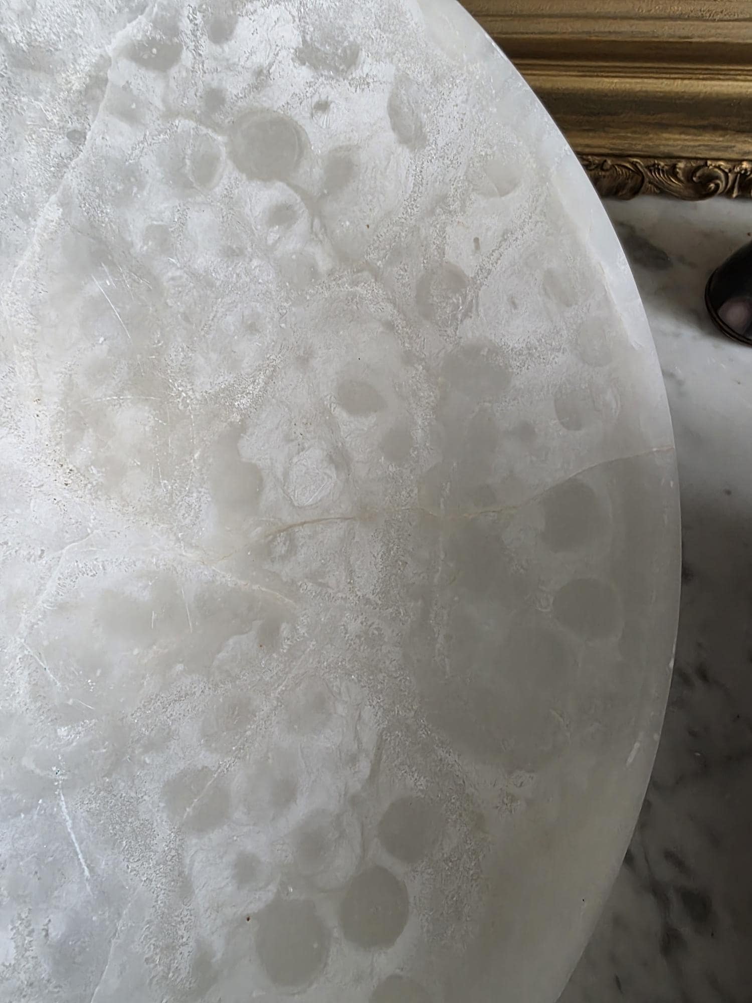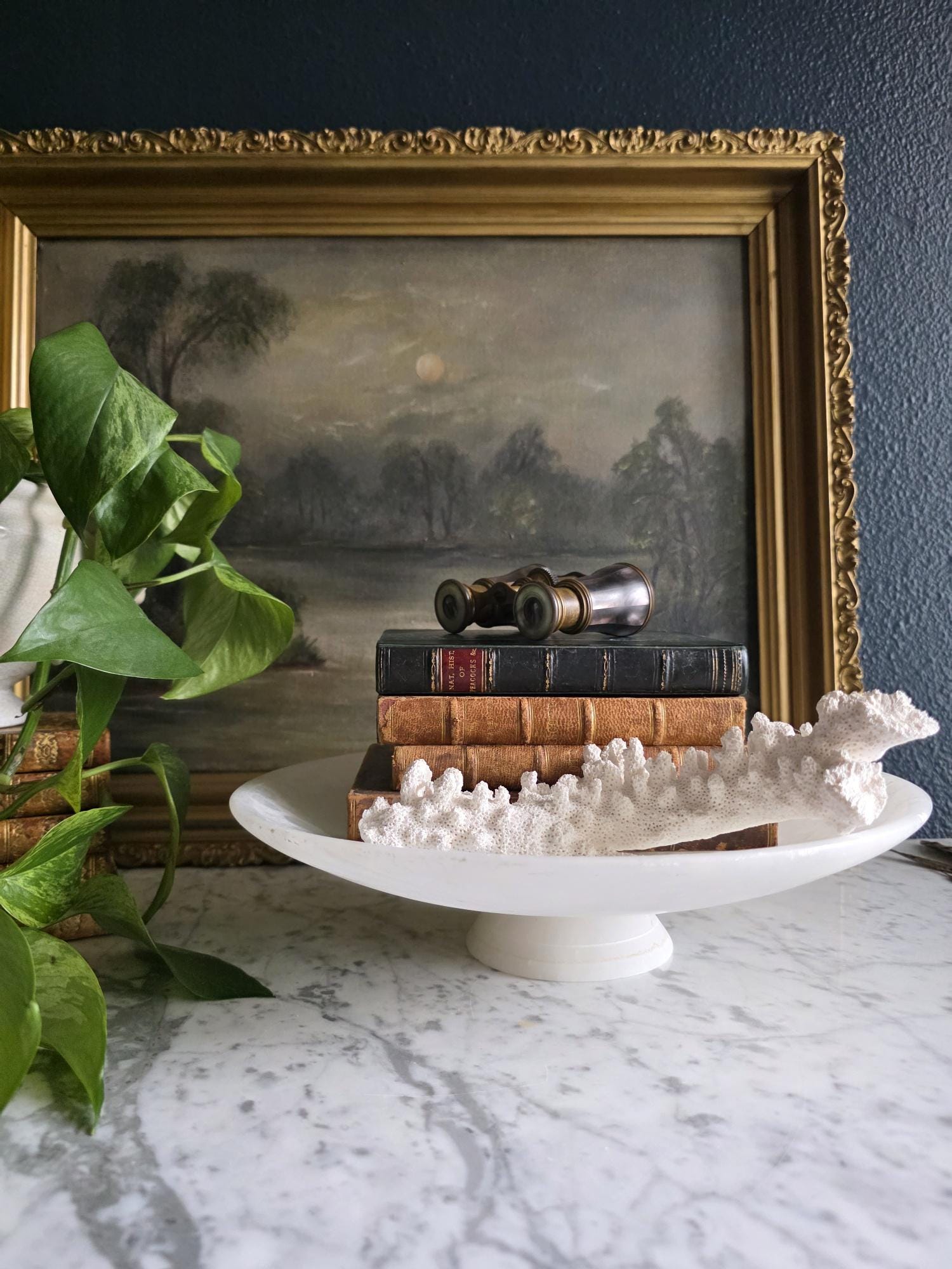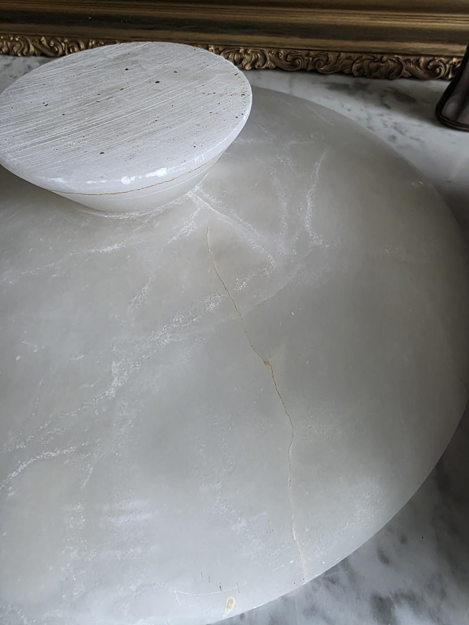 Presenting a beautifully substantial vintage white alabaster compote, featuring a wide, shallow bowl resting gracefully on a pedestal base. This striking piece showcases the mesmerizing natural beauty of carved alabaster, with characteristic semi-translucent, cloud-like orbicular patterns and subtle veining moving throughout the stone. The piece's neutral, creamy-white palette and elegant silhouette make it an incredibly versatile styling prop for modern organic, classical, or wabi-sabi interiors. Please note that this compote is in imperfect vintage condition and features a prominent, previously crack extending from the outer rim toward the center of the bowl. This crack is a notable flaw but does not compromise structural integrity. Additionally, it shows typical signs of age and handling, including minor surface wear, scuffs, and small flea-bite chips along the edges of the rim and the pedestal foot. Because of this wear, the compote is best suited for dry decorative use—making it a perfect sculptural catch-all for coral, dried botanicals, or decorative spheres.