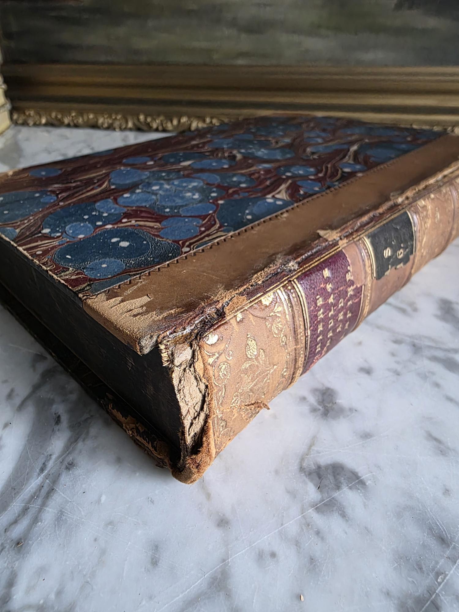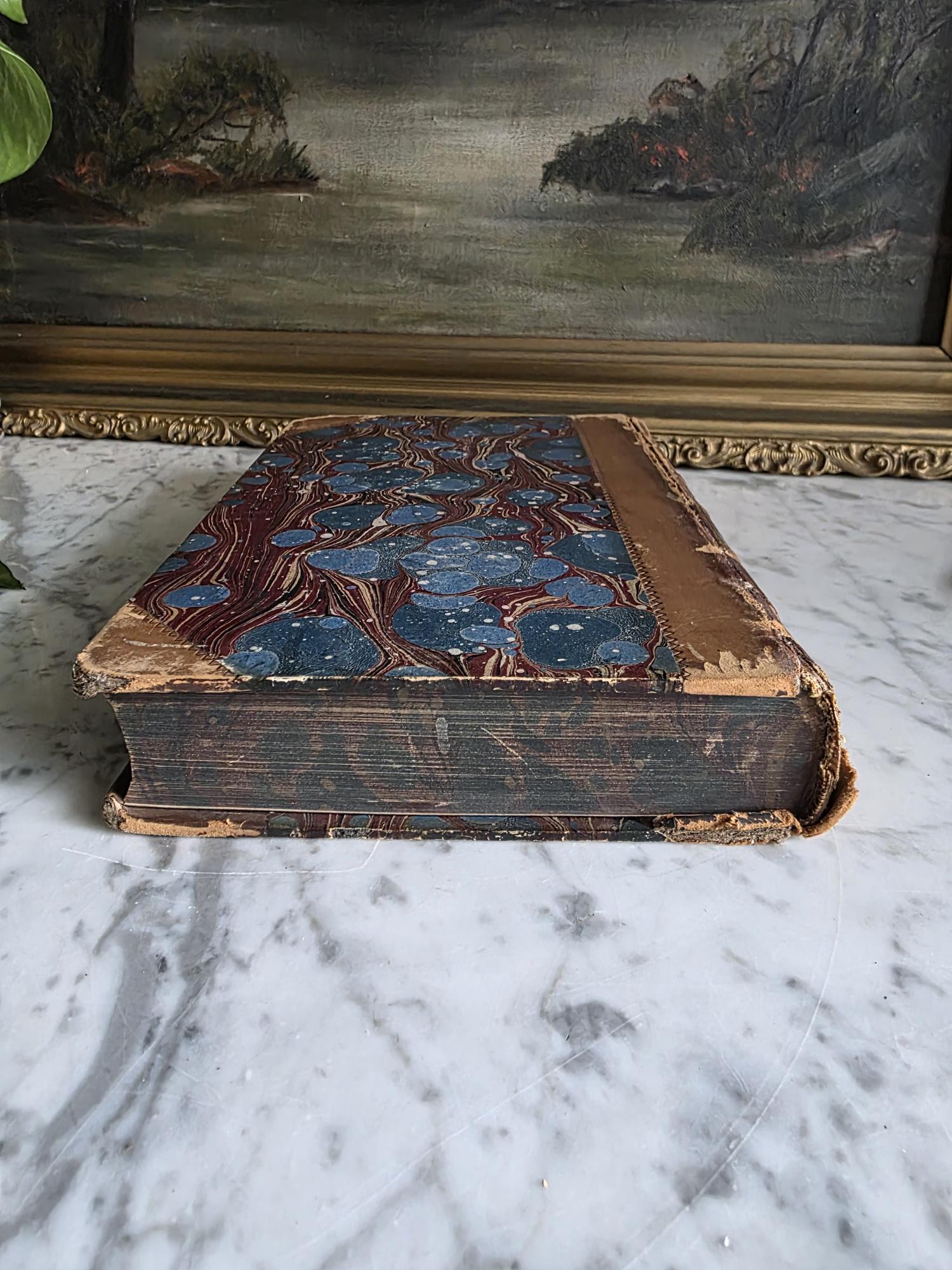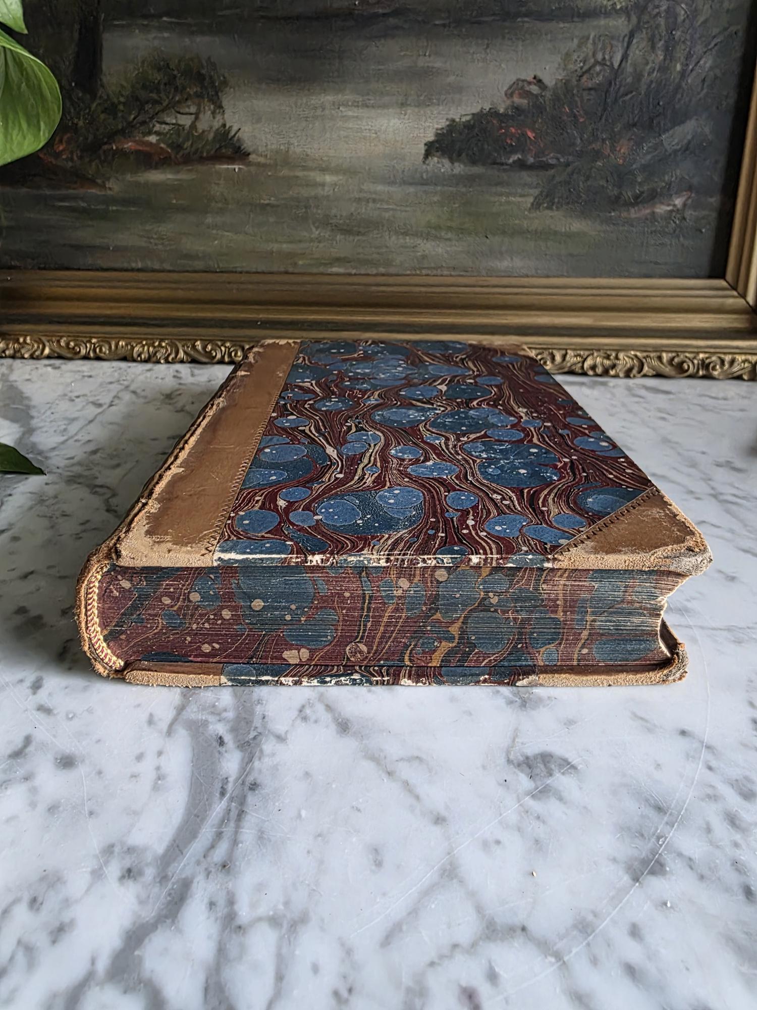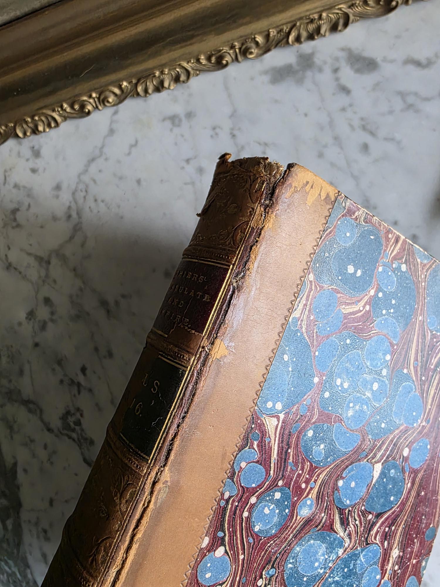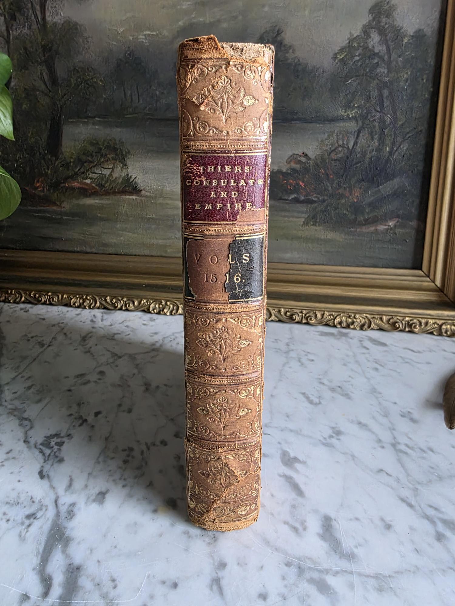Presenting a striking mid-19th-century half-leather volume of "History of the Consulate and the Empire of France Under Napoleon" by M. A. Thiers. Published in London by Willis and Sotheran in 1857, this piece (containing Volumes 15 and 16) is a beautiful example of classic Victorian bookbinding. It features an elegant half-leather binding over vibrant, multi-colored marbled paper boards, perfectly complemented by matching marbled page edges and an ornate spine heavily detailed with gold gilt tooling. Opening the front cover reveals a fascinating piece of provenance: a beautifully illustrated 1900 "Ex Libris" bookplate belonging to Robert Heysham Sayre of South Bethlehem, Pennsylvania. Please note that this 160-plus-year-old book is in authentic, weathered antique condition, making it a perfect addition to a "dark academia" display or a rustic home library. It exhibits noticeable wear, a reattached front board, including heavy rubbing and scuffing to the leather corners and spine joints, chipping at the spine ends, partial cracking along the outer hinges, and typical age-related toning and light foxing to the pages. Despite these structural imperfections, it remains a highly decorative and historically rich volume that brings instant texture and distinguished character to any shelf or tabletop vignette.