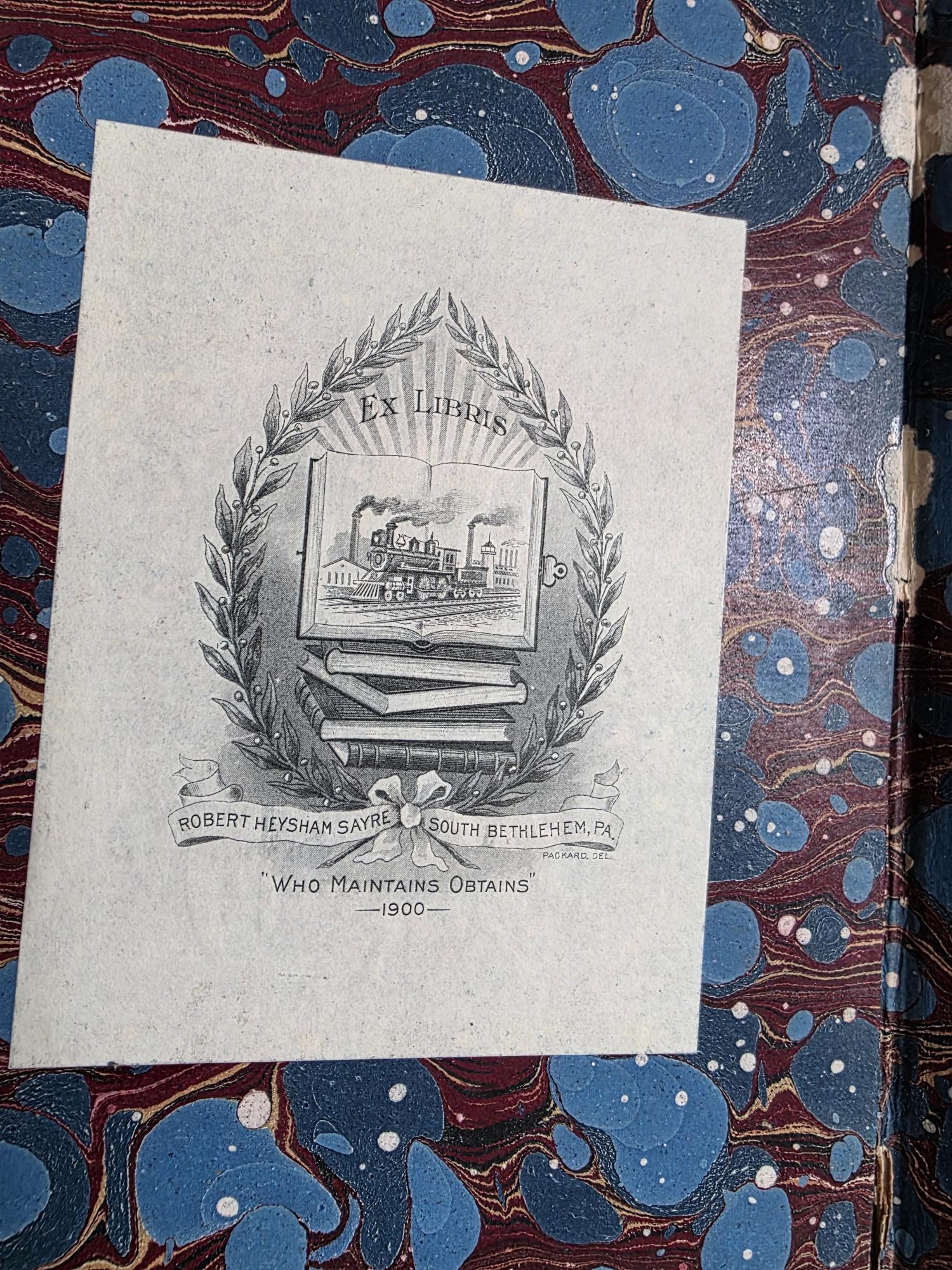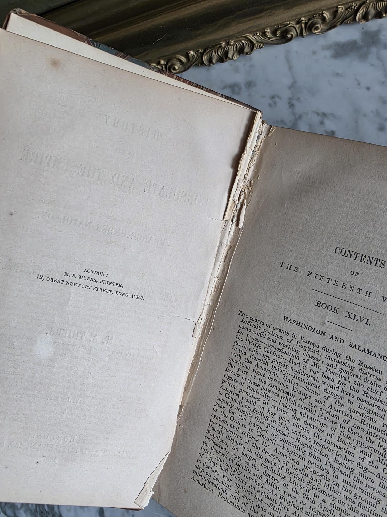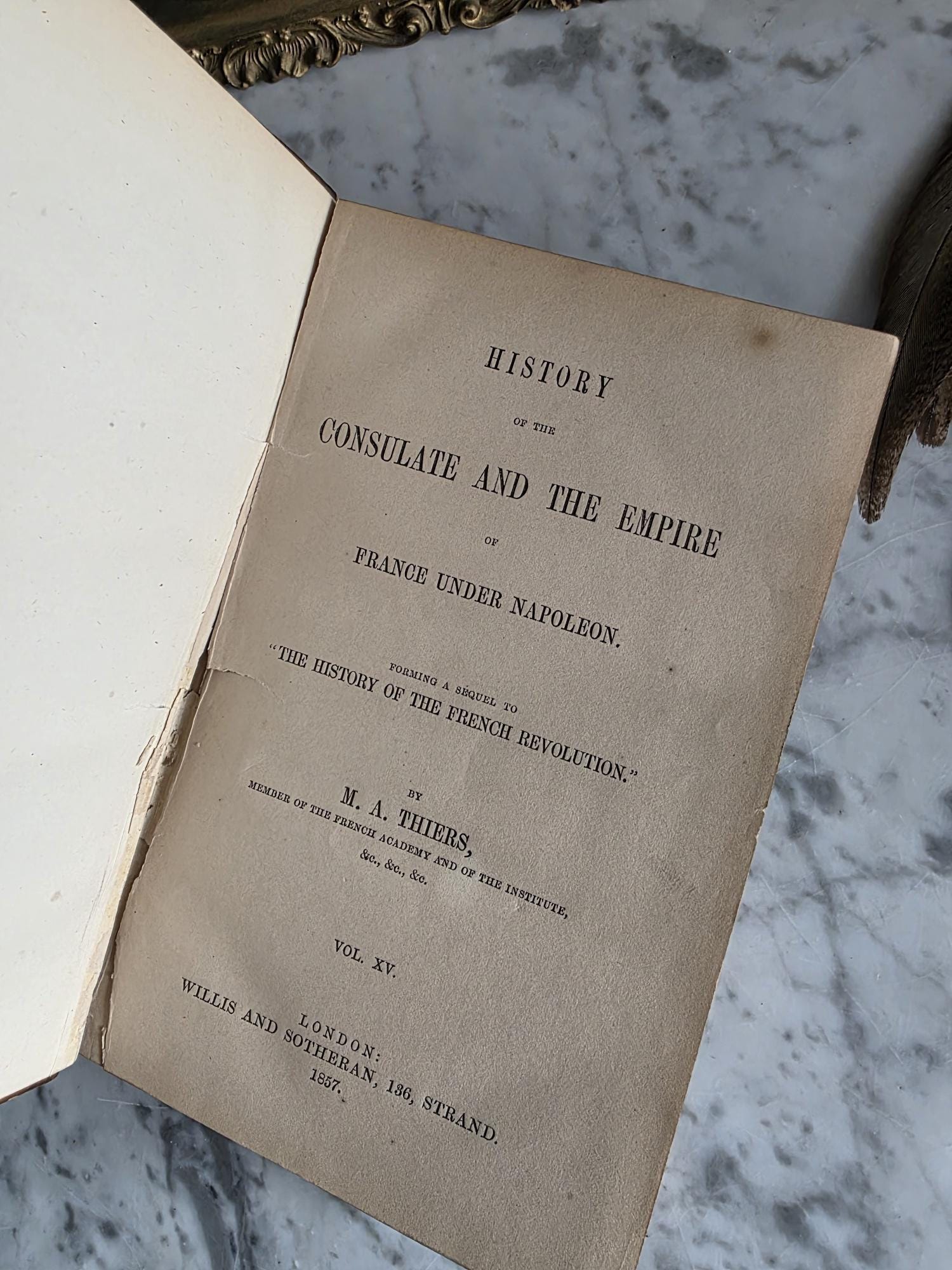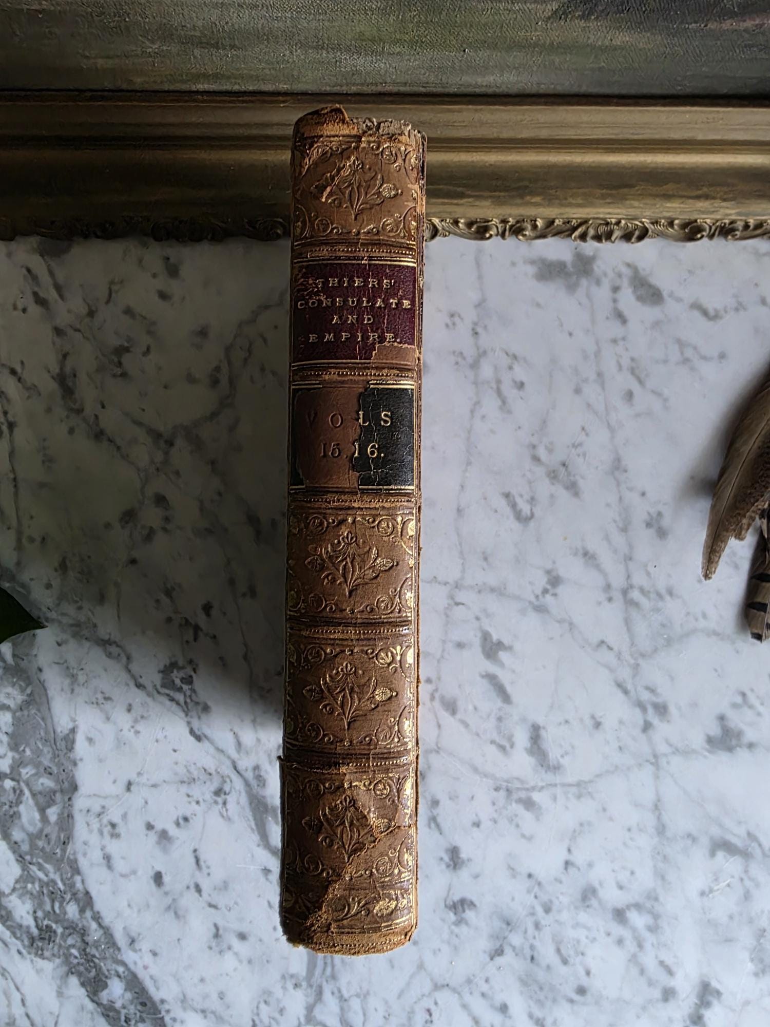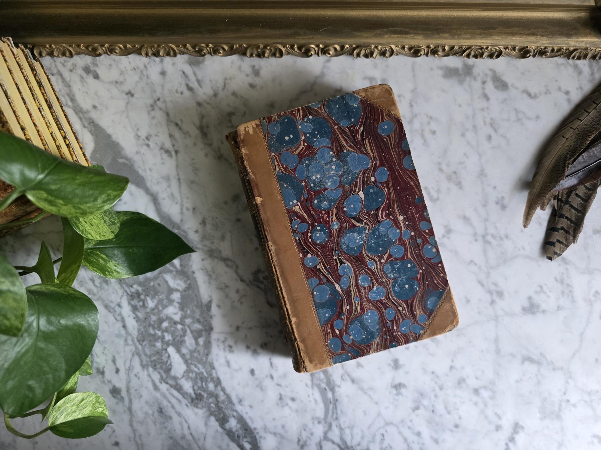 Presenting a striking mid-19th-century half-leather volume of "History of the Consulate and the Empire of France Under Napoleon" by M. A. Thiers. Published in London by Willis and Sotheran in 1857, this piece (containing Volumes 15 and 16) is a beautiful example of classic Victorian bookbinding. It features an elegant half-leather binding over vibrant, multi-colored marbled paper boards, perfectly complemented by matching marbled page edges and an ornate spine heavily detailed with gold gilt tooling. Opening the front cover reveals a fascinating piece of provenance: a beautifully illustrated 1900 "Ex Libris" bookplate belonging to Robert Heysham Sayre of South Bethlehem, Pennsylvania. Please note that this 160-plus-year-old book is in authentic, weathered antique condition, making it a perfect addition to a "dark academia" display or a rustic home library. It exhibits noticeable wear, a reattached front board, including heavy rubbing and scuffing to the leather corners and spine joints, chipping at the spine ends, partial cracking along the outer hinges, and typical age-related toning and light foxing to the pages. Despite these structural imperfections, it remains a highly decorative and historically rich volume that brings instant texture and distinguished character to any shelf or tabletop vignette.