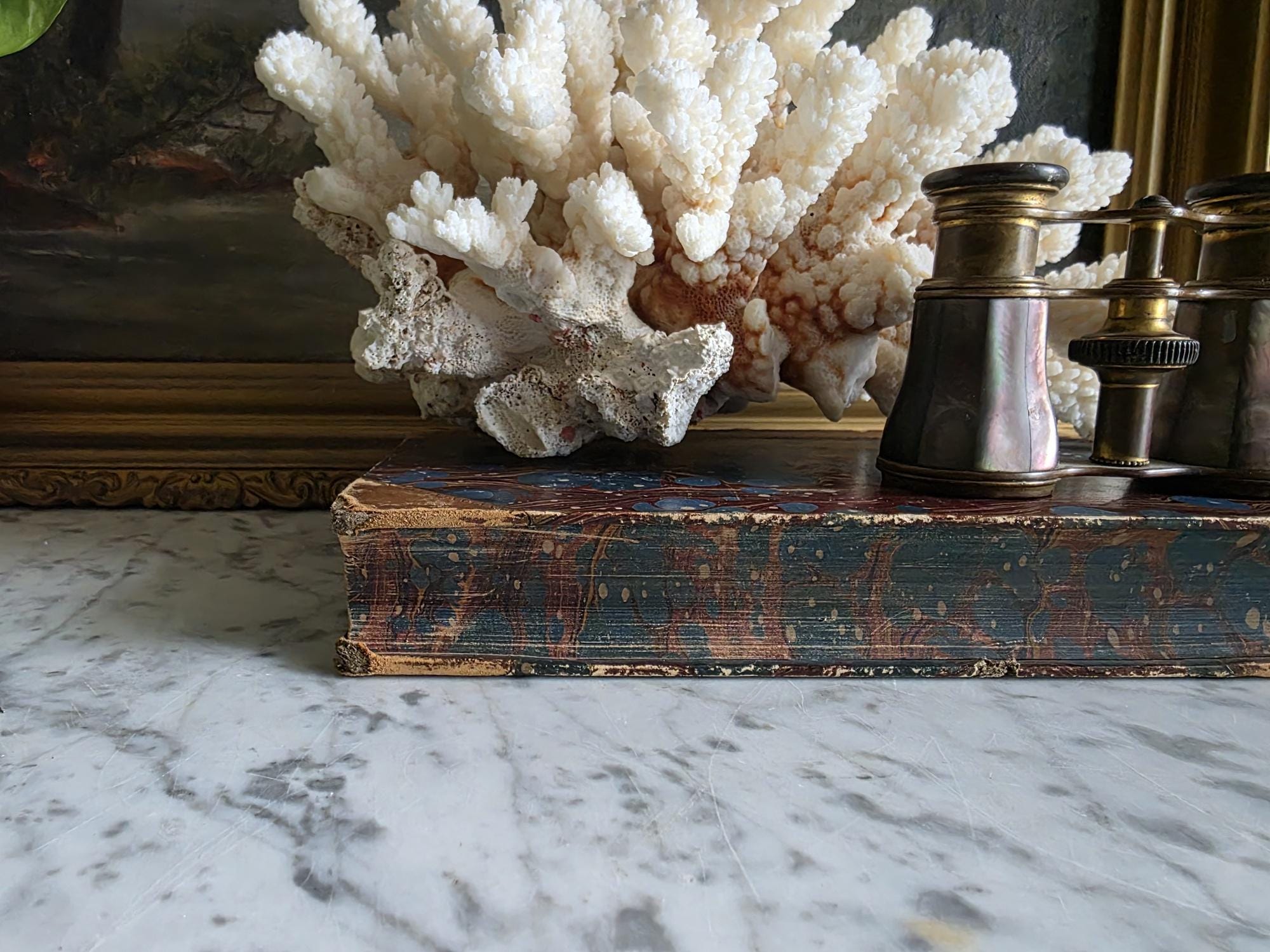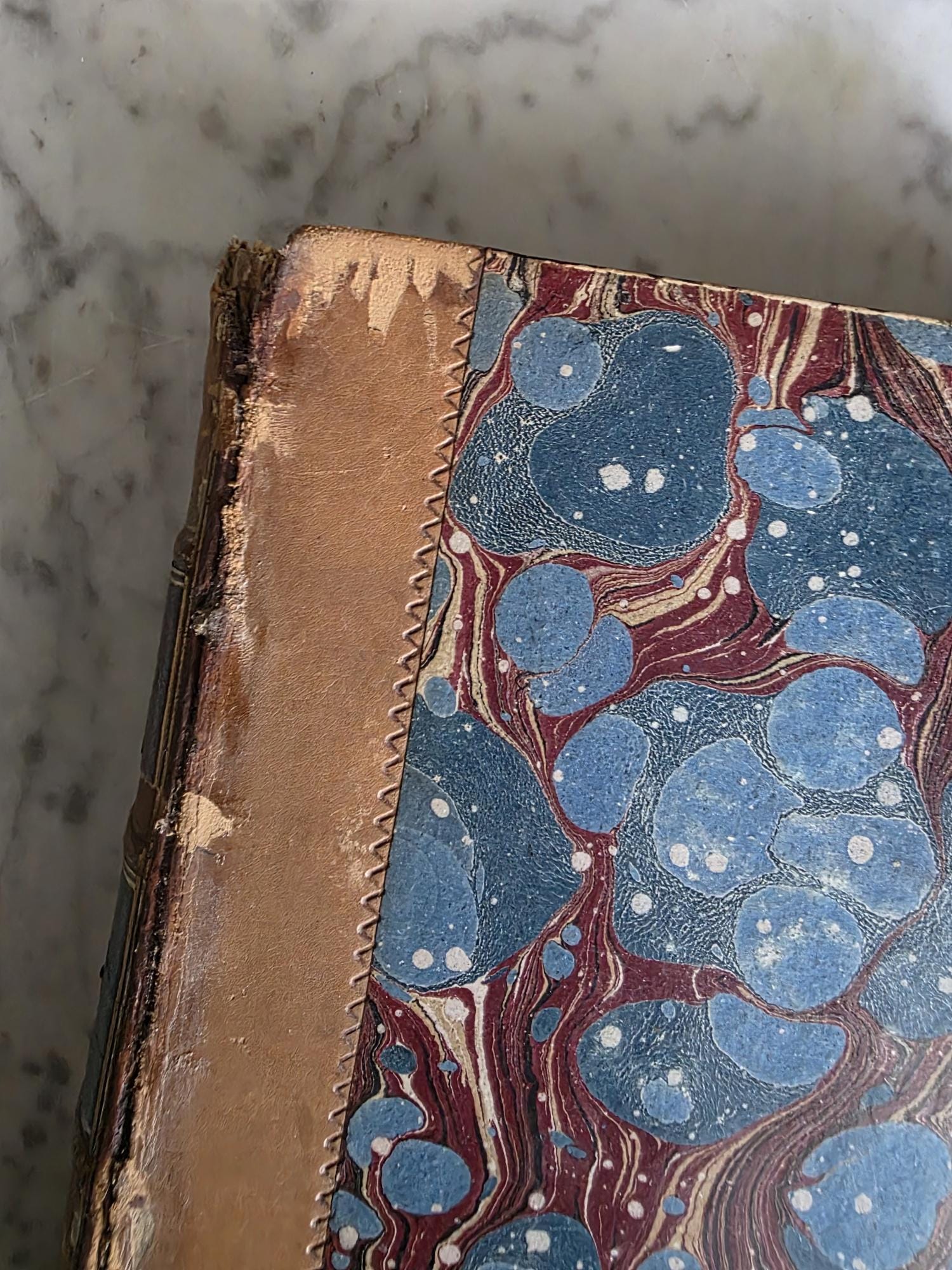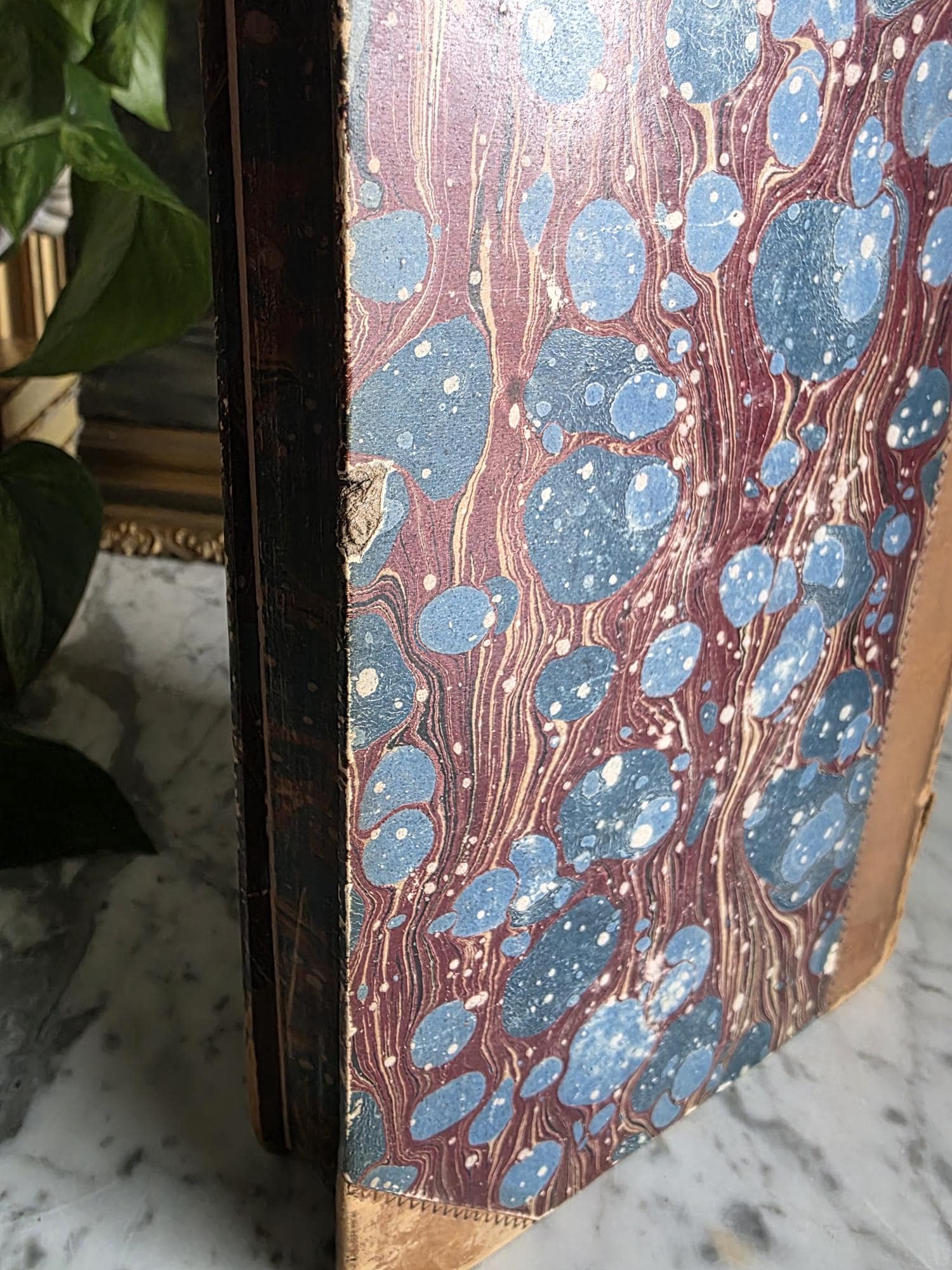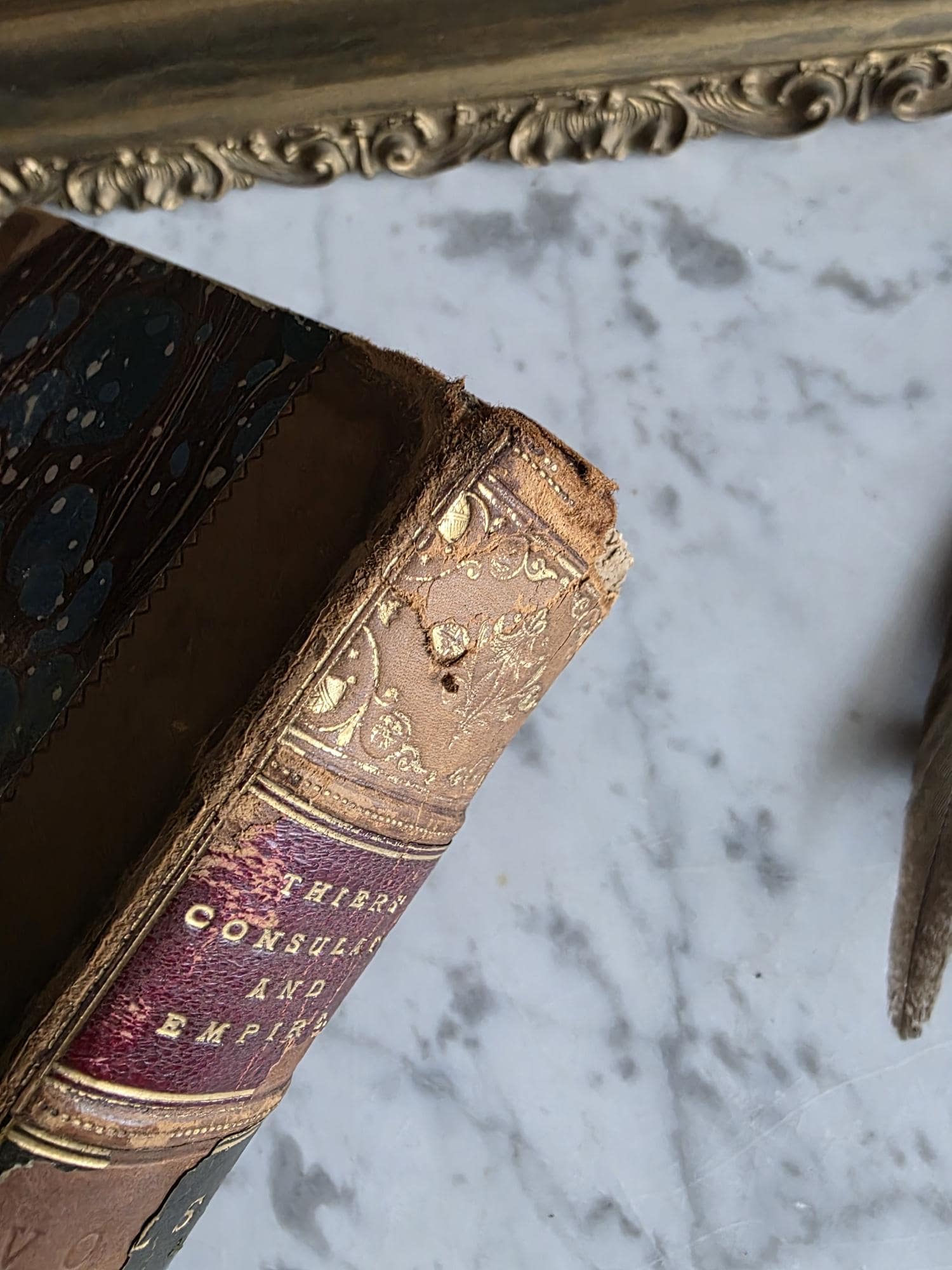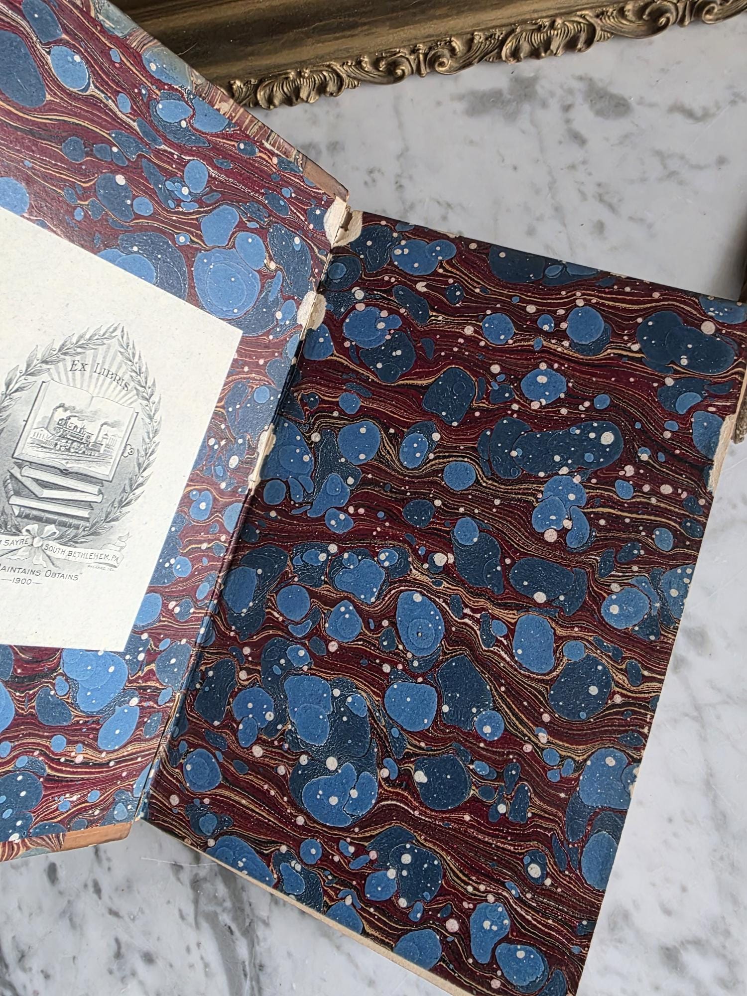 Presenting a striking mid-19th-century half-leather volume of "History of the Consulate and the Empire of France Under Napoleon" by M. A. Thiers. Published in London by Willis and Sotheran in 1857, this piece (containing Volumes 15 and 16) is a beautiful example of classic Victorian bookbinding. It features an elegant half-leather binding over vibrant, multi-colored marbled paper boards, perfectly complemented by matching marbled page edges and an ornate spine heavily detailed with gold gilt tooling. Opening the front cover reveals a fascinating piece of provenance: a beautifully illustrated 1900 "Ex Libris" bookplate belonging to Robert Heysham Sayre of South Bethlehem, Pennsylvania. Please note that this 160-plus-year-old book is in authentic, weathered antique condition, making it a perfect addition to a "dark academia" display or a rustic home library. It exhibits noticeable wear, a reattached front board, including heavy rubbing and scuffing to the leather corners and spine joints, chipping at the spine ends, partial cracking along the outer hinges, and typical age-related toning and light foxing to the pages. Despite these structural imperfections, it remains a highly decorative and historically rich volume that brings instant texture and distinguished character to any shelf or tabletop vignette.