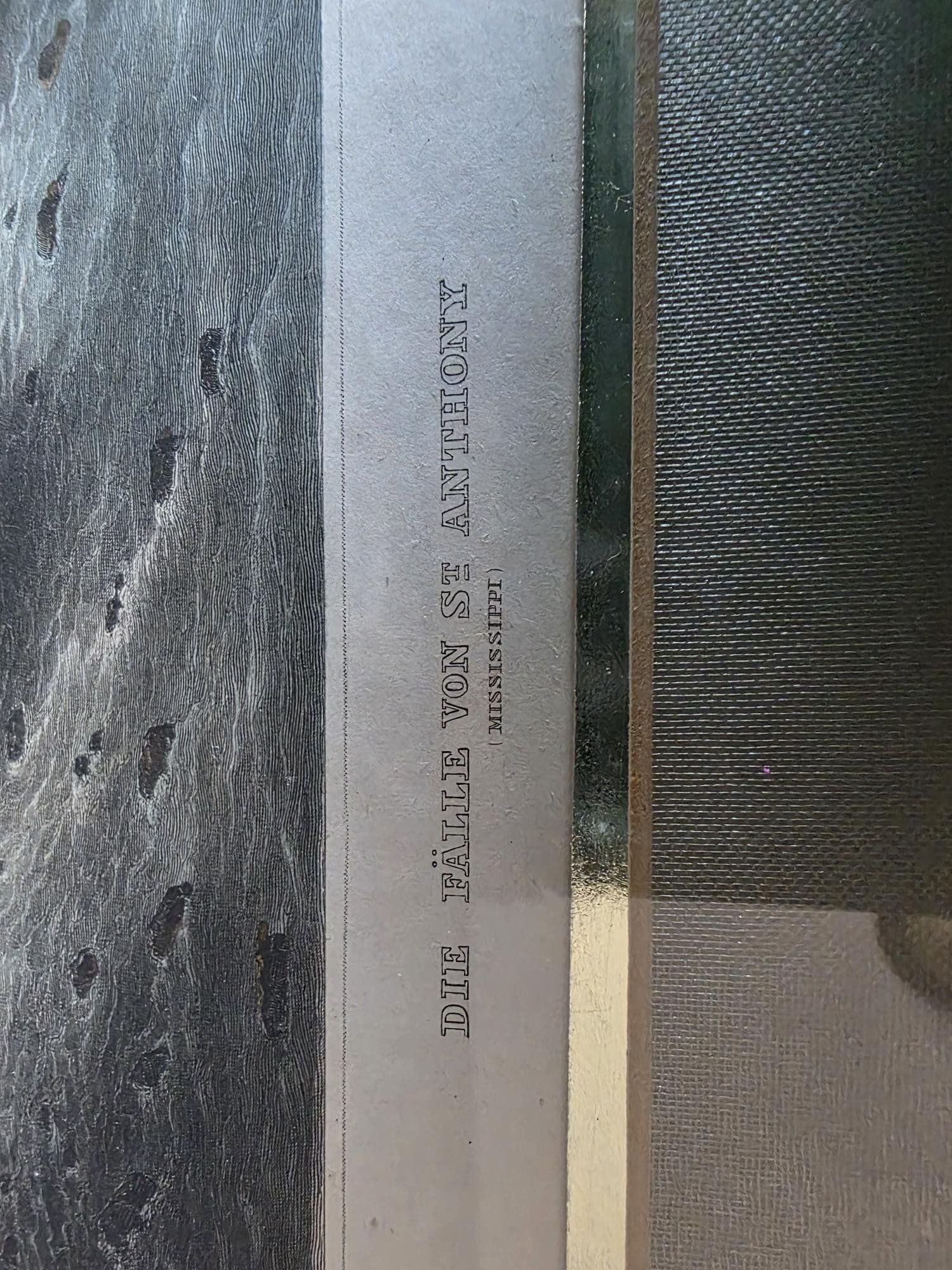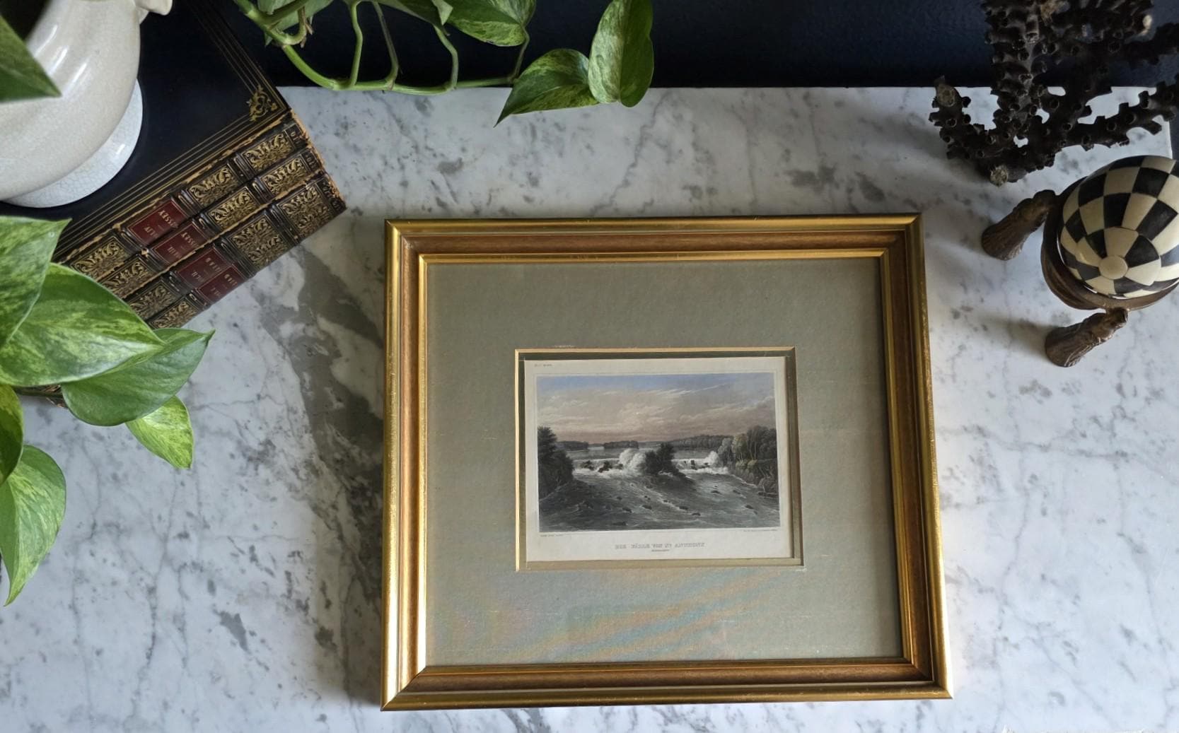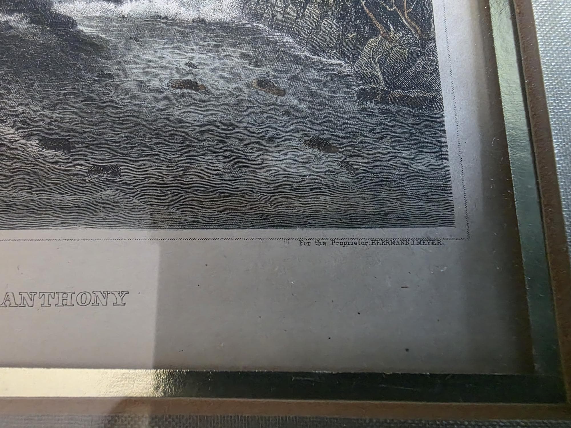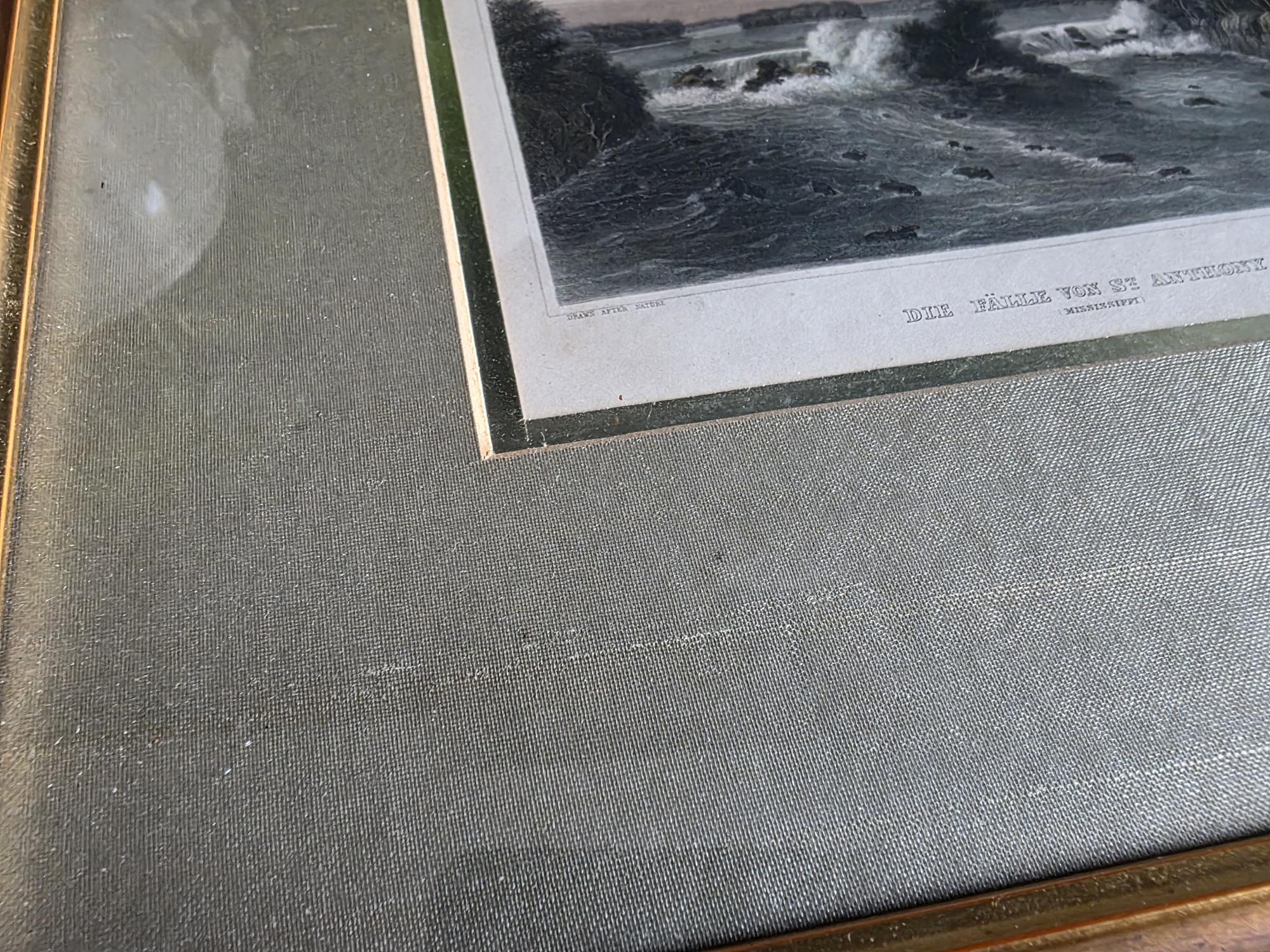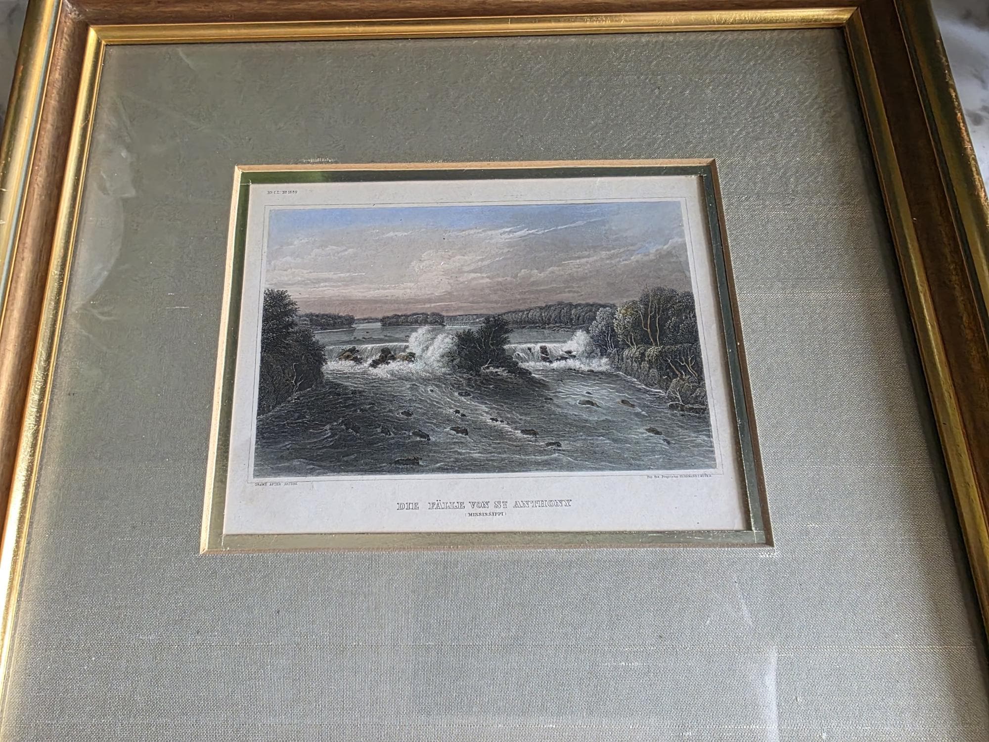 Presenting a beautifully framed, antique hand-colored steel engraving depicting the historic St. Anthony Falls on the Mississippi River. Titled "Die Fälle von St. Anthony (Mississippi)," this striking mid-19th-century piece was published by Herrmann J. Meyer (noted in the lower right margin) and proudly states it was "Drawn After Nature." The engraving captures a dynamic, historical view of the falls with rushing rapids, rocky outcroppings, and lushly forested riverbanks, all brought to life with delicate, hand-applied watercolor hues. The artwork is elegantly presented under glass in a classic gold-toned frame, complemented by a soft greenish-grey satin mat with a gold inner bevel that perfectly highlights the landscape's natural palette. The reverse features a secure wire hanger for easy wall mounting, along with some faint, old handwritten script along the bottom edge of the backing. This piece remains in wonderful antique condition, displaying a gentle, expected age-related toning to the paper that only enhances its authentic historical character, while the frame shows minimal wear consistent with careful handling. It is a stunning, sophisticated addition to a traditional gallery wall, a classical study, or any space celebrating early Americana.