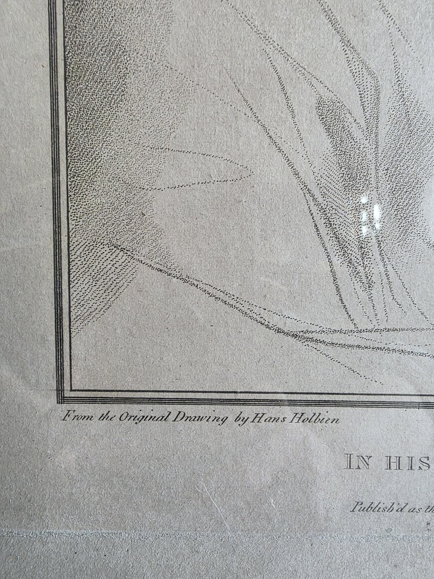 Presenting a remarkable piece of late 18th-century art history, this antique stipple engraving features the portrait of "Rich. L.d Chancellor" (Richard Rich, 1st Baron Rich), based on the original drawing by the legendary Tudor court painter Hans Holbein. Published on October 1, 1794, by John Chamberlaine, this piece was meticulously engraved by Francesco Bartolozzi, the esteemed Historical Engraver to His Majesty. The print is a genuine artifact from the highly regarded folio Imitations of Original Drawings by Hans Holbein in the Collection of His Majesty, a project designed to replicate the subtle, lifelike qualities of Holbein's original sketches held in the Royal Collection.