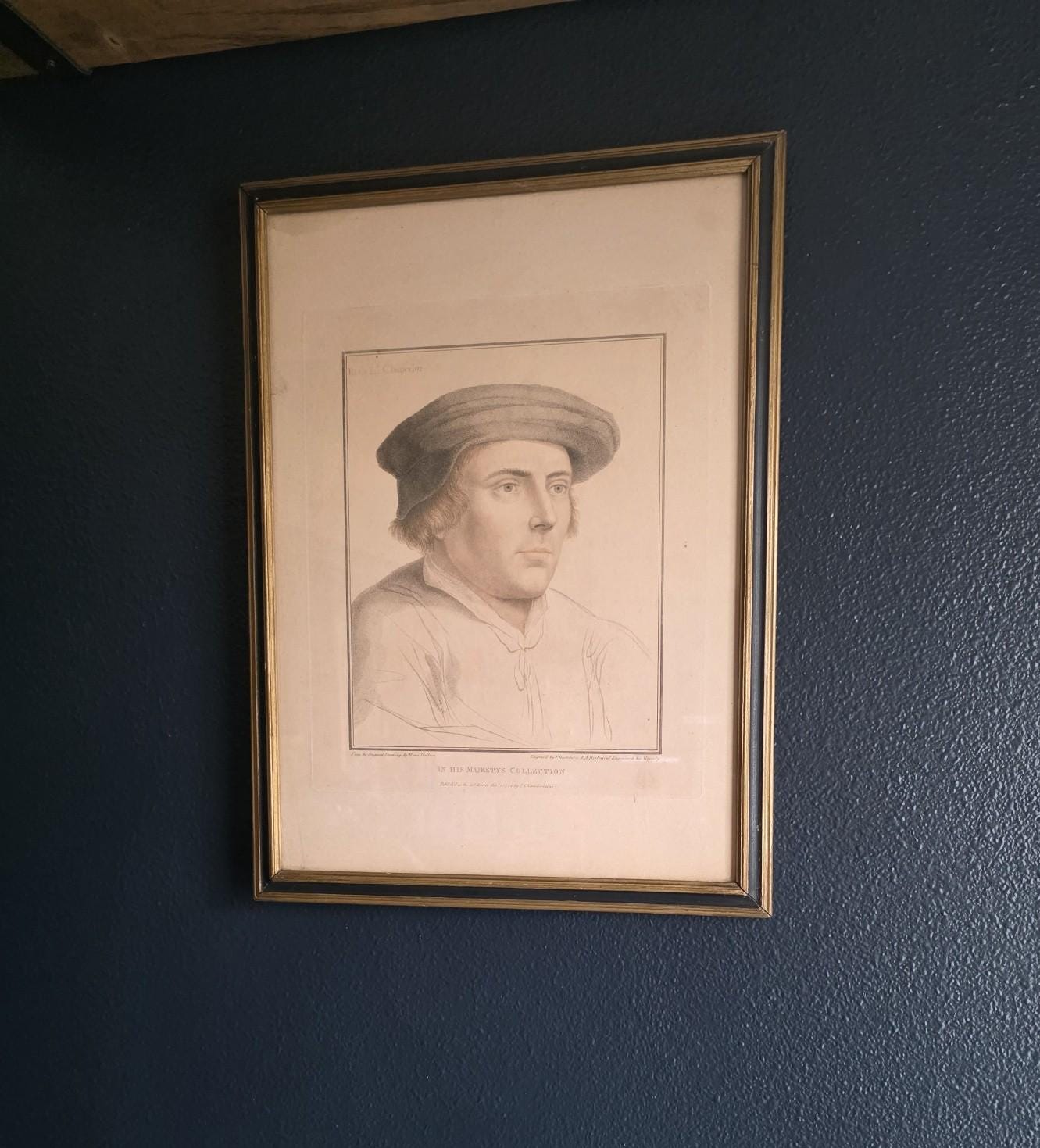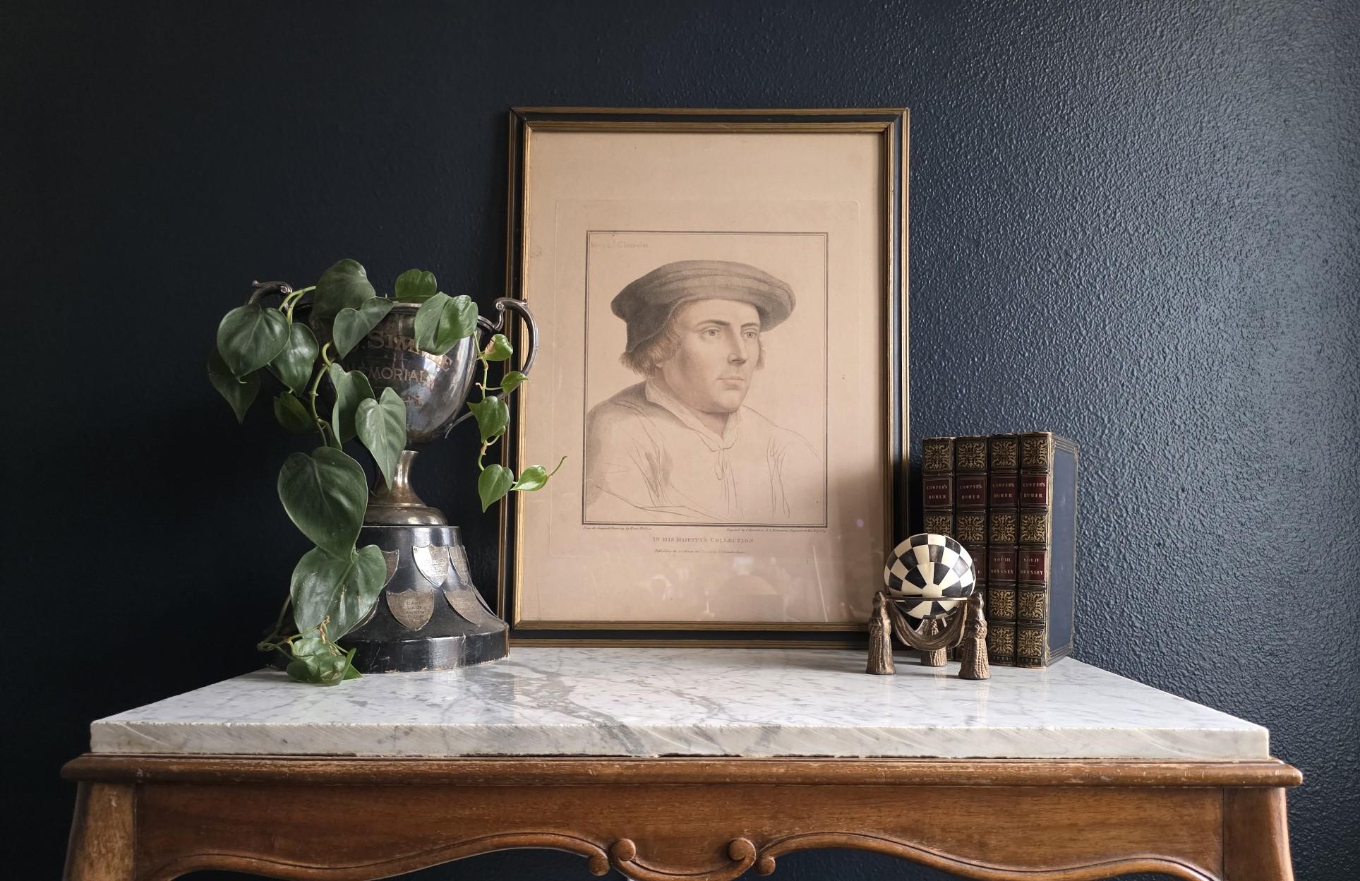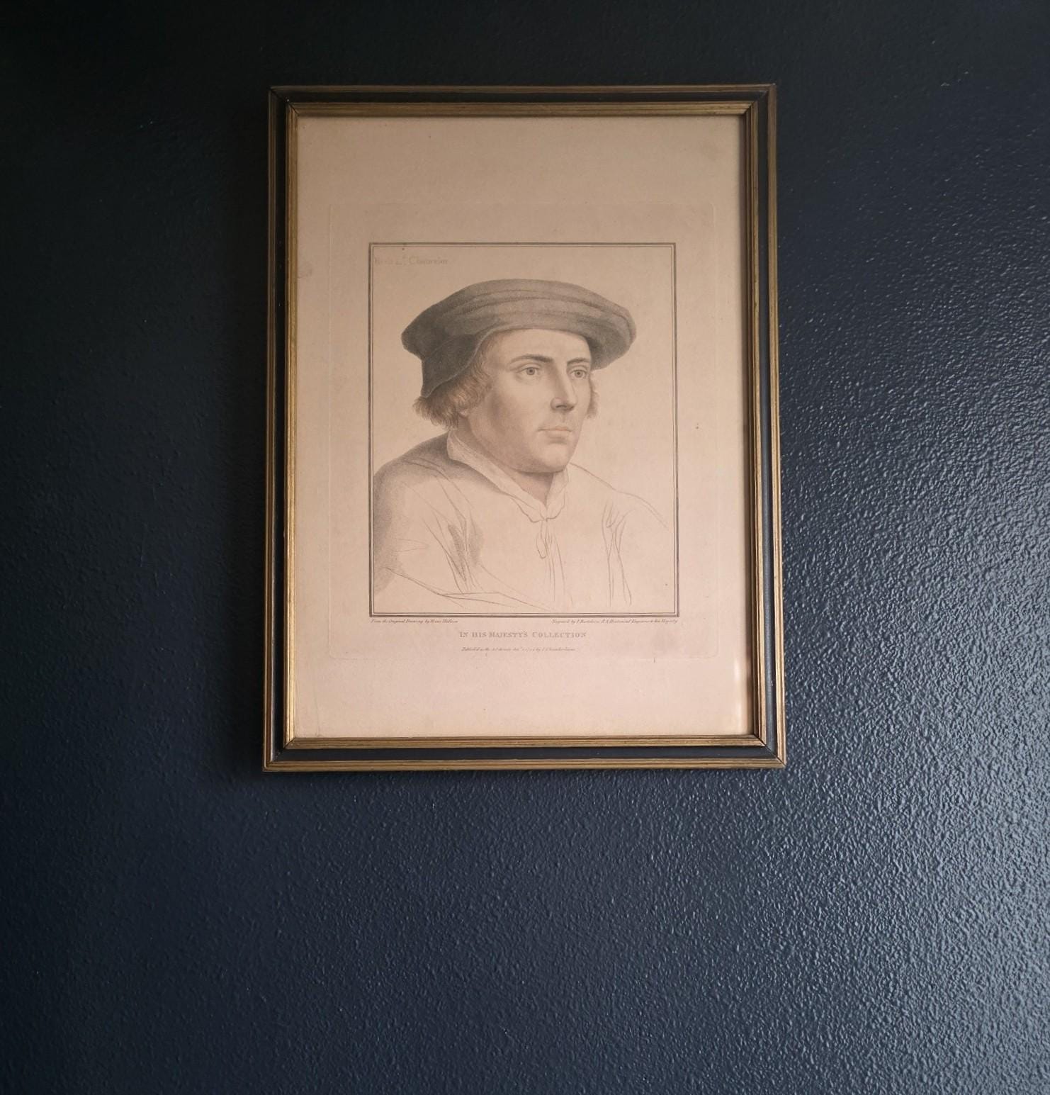 The portrait beautifully showcases Bartolozzi's mastery of the stipple engraving technique, rendering the Lord Chancellor's features with incredible softness, depth, and character. The artwork is housed in a handsome antique wooden frame featuring a dark painted finish and a delicate gilt inner border, perfectly complementing the gravitas of the Tudor subject. As expected with a piece over 200 years old, the print exhibits a warm, age-appropriate patina, including natural toning and minor foxing that authenticate its history. The reverse reveals an aged wooden frame assembly with old browned backing paper, vintage cloth tape reinforcements, and a wire hanger. This is an exceptional opportunity to acquire a verified 1794 Bartolozzi engraving of a prominent historical figure, perfect for elevating a gallery wall, a study, or a dark academia aesthetic.