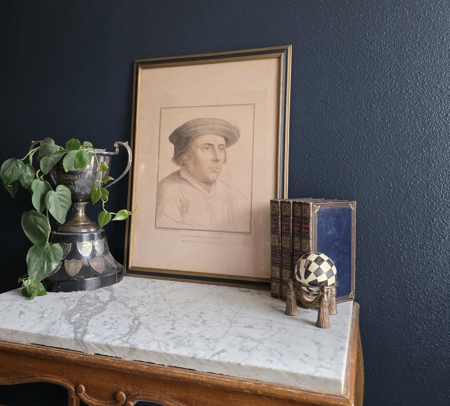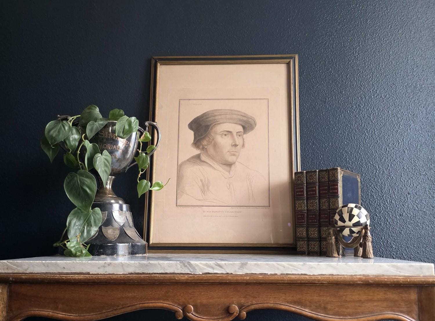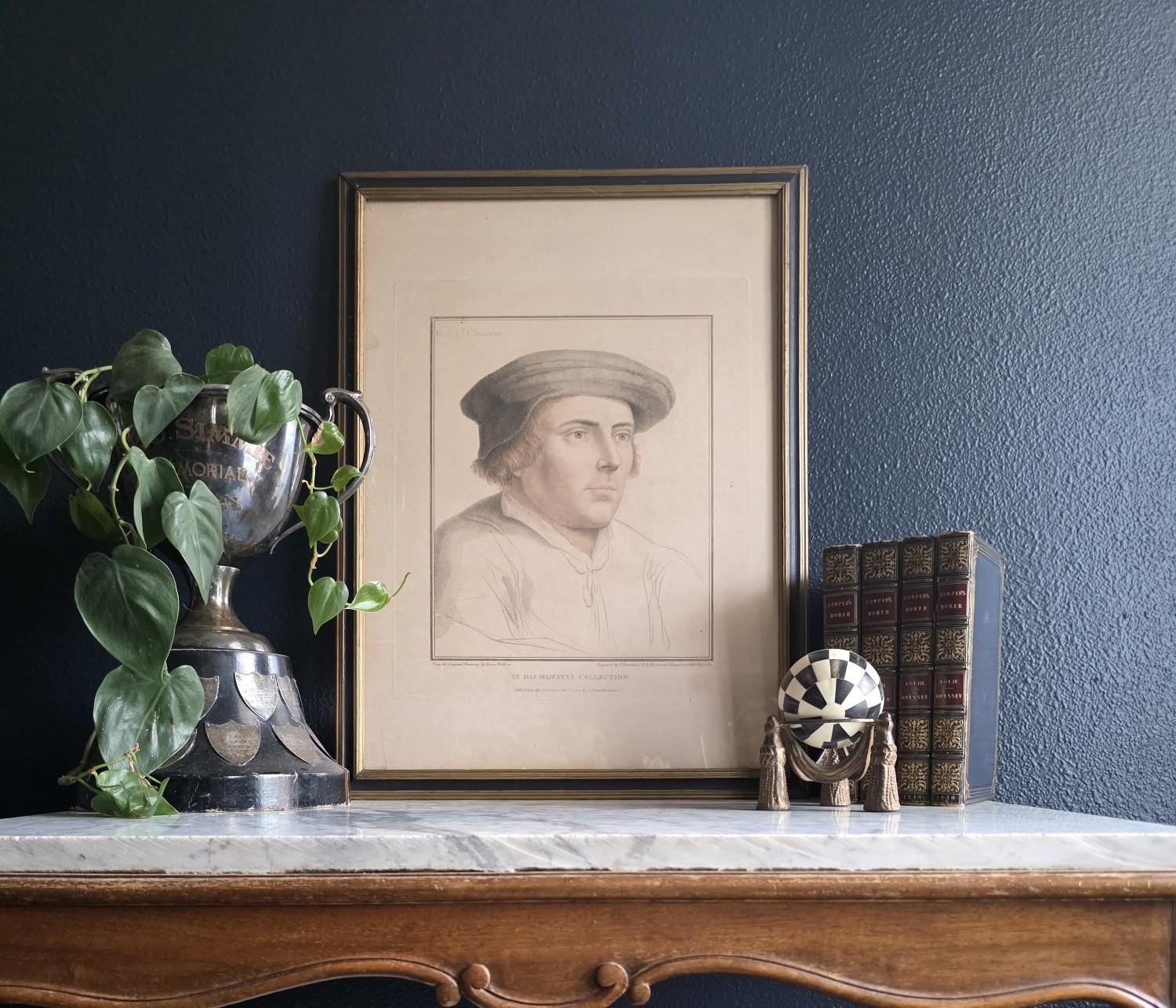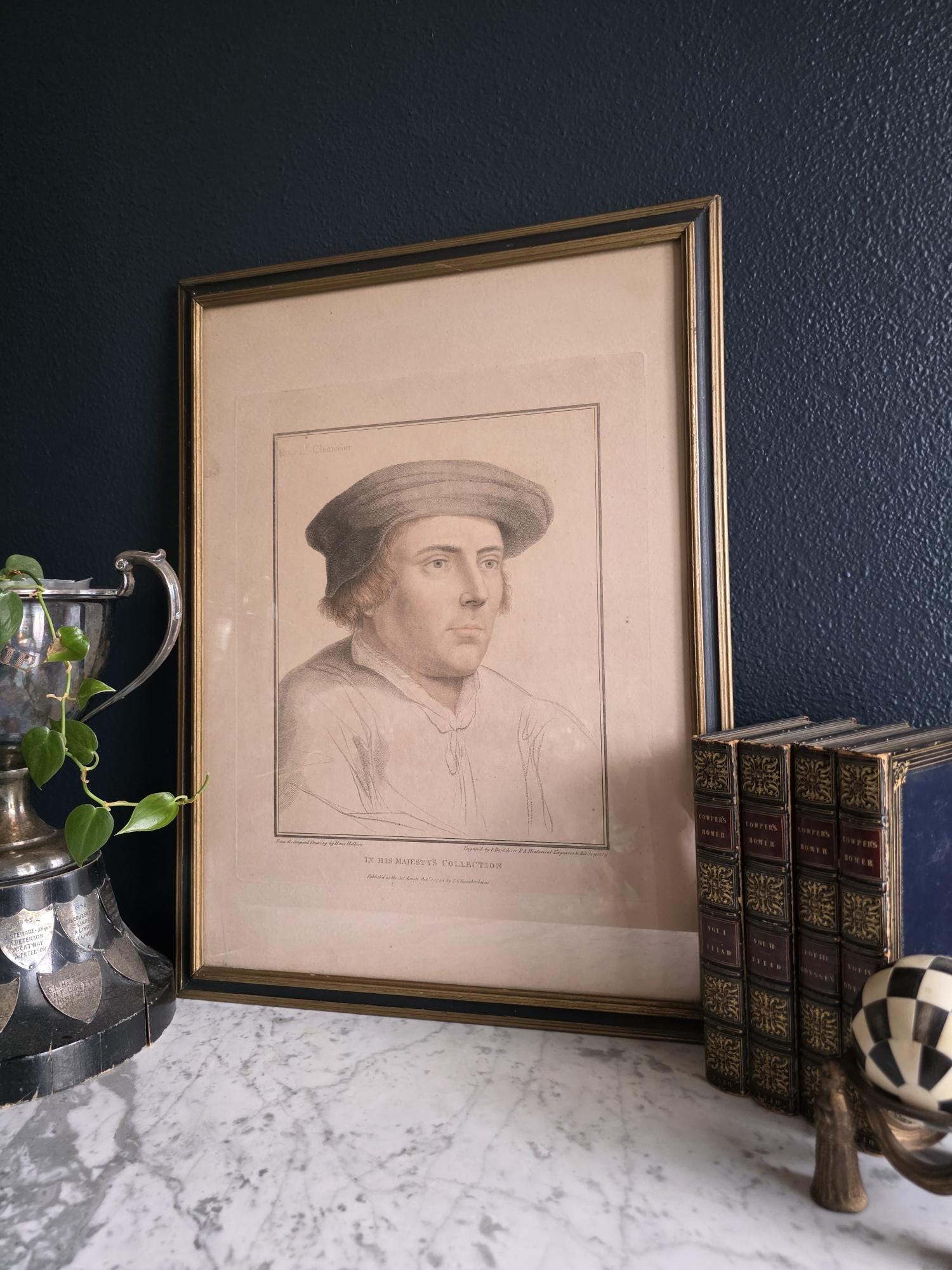 The portrait beautifully showcases Bartolozzi's mastery of the stipple engraving technique, rendering the Lord Chancellor's features with incredible softness, depth, and character. The artwork is housed in a handsome antique wooden frame featuring a dark painted finish and a delicate gilt inner border, perfectly complementing the gravitas of the Tudor subject. As expected with a piece over 200 years old, the print exhibits a warm, age-appropriate patina, including natural toning and minor foxing that authenticate its history. The reverse reveals an aged wooden frame assembly with old browned backing paper, vintage cloth tape reinforcements, and a wire hanger. This is an exceptional opportunity to acquire a verified 1794 Bartolozzi engraving of a prominent historical figure, perfect for elevating a gallery wall, a study, or a dark academia aesthetic.
