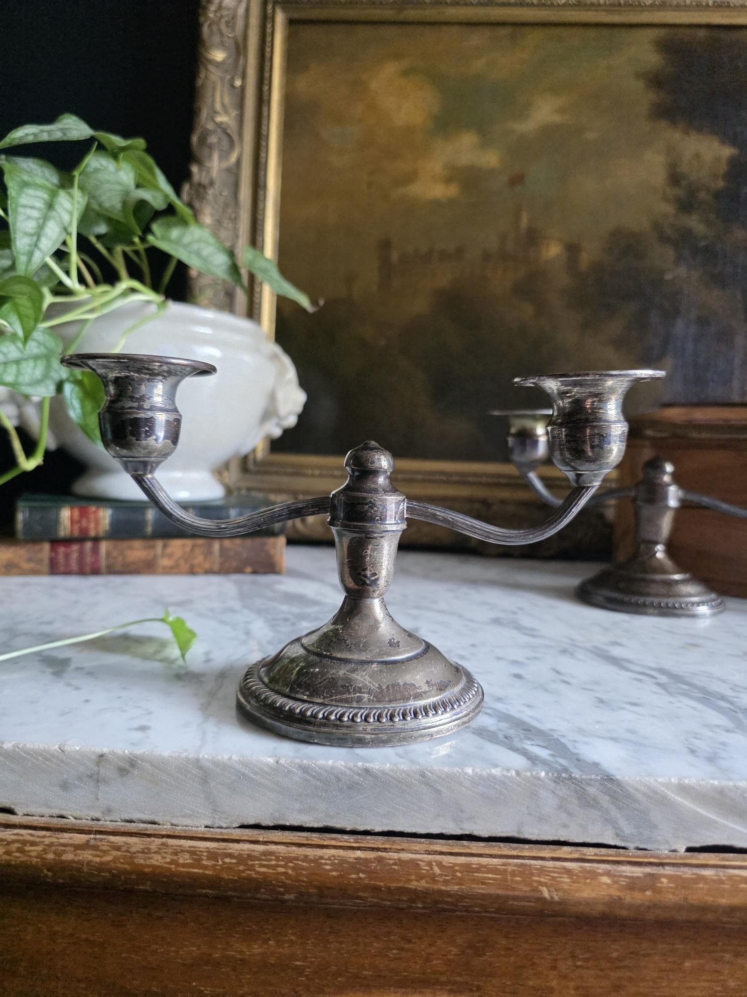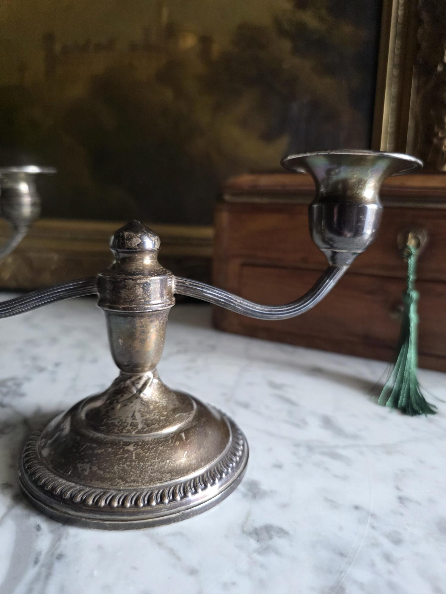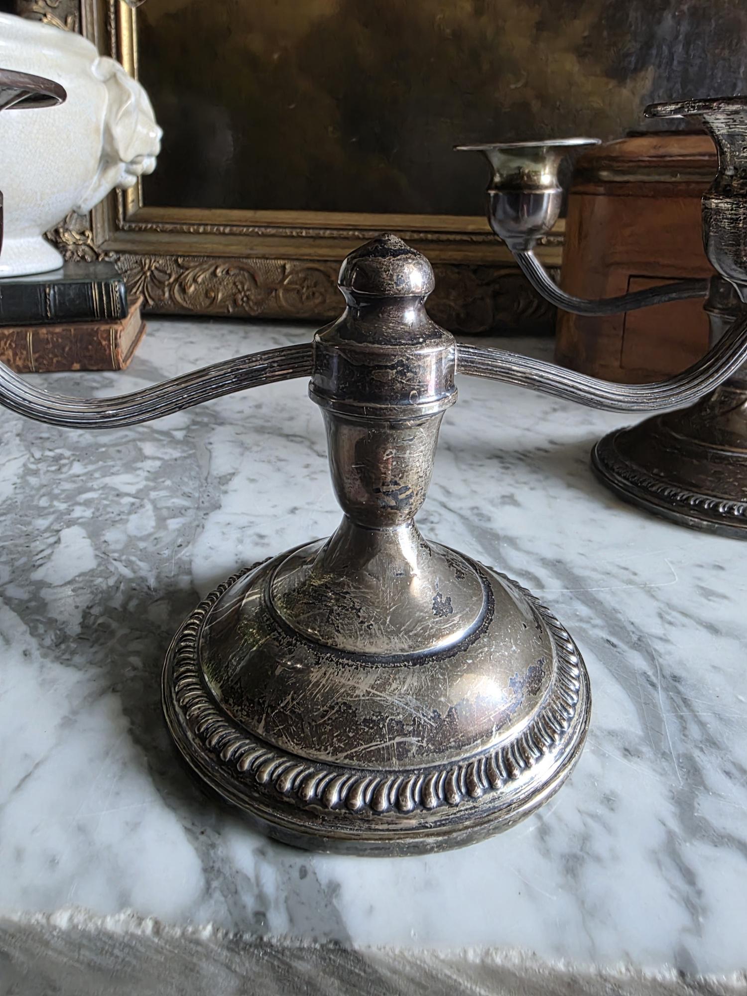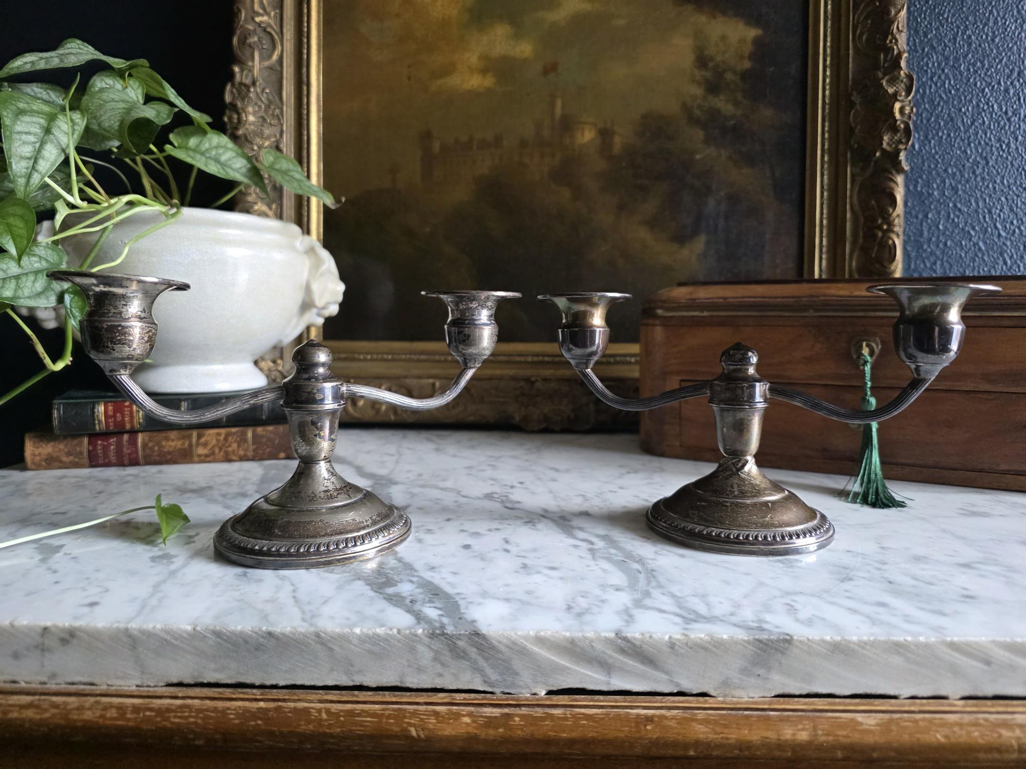Presenting a stunning pair of vintage sterling silver double-arm candelabras, perfect for adding a touch of timeless elegance to your dining table, mantle, or curated display. Crafted with a beautiful, graceful curvature, each candelabra features ribbed arms extending from a central finial, supported by a weighted pedestal base with a classic gadroon border. The silver currently boasts a rich, natural tarnish and dark patina, making them ideal for a moody, dark academia, or English country-inspired aesthetic, though they could easily be polished to a brilliant shine for a more traditional look. The hallmark on the bottom reads "Empire Sterling Weighted 48," identifying them as the work of the Empire Silver Company of Brooklyn, New York. The company was founded in 1946, and this specific style of weighted silver was highly popular in the post-war era, placing the creation of these pieces in the mid-20th century, likely between the late 1940s and 1960s.
