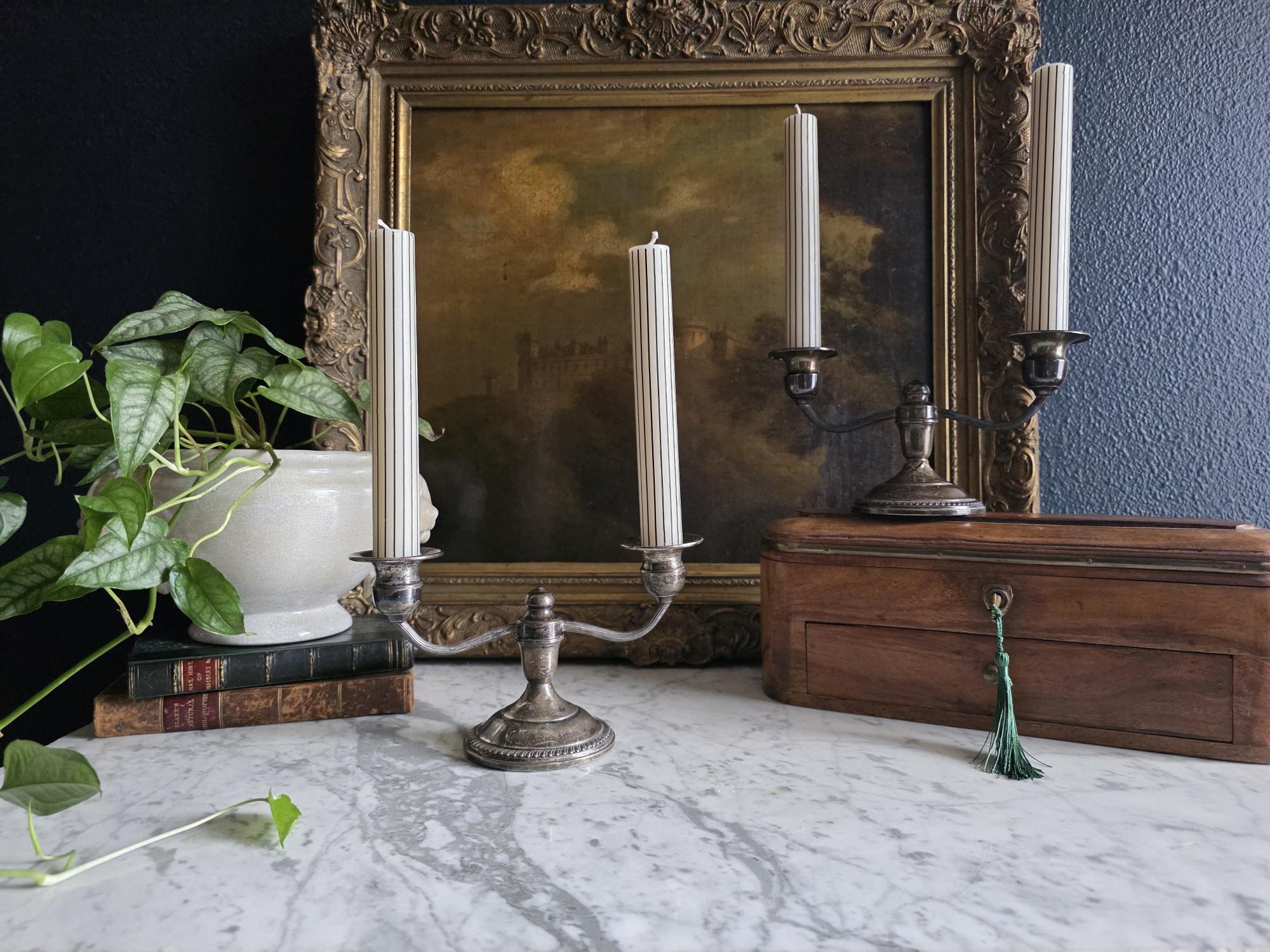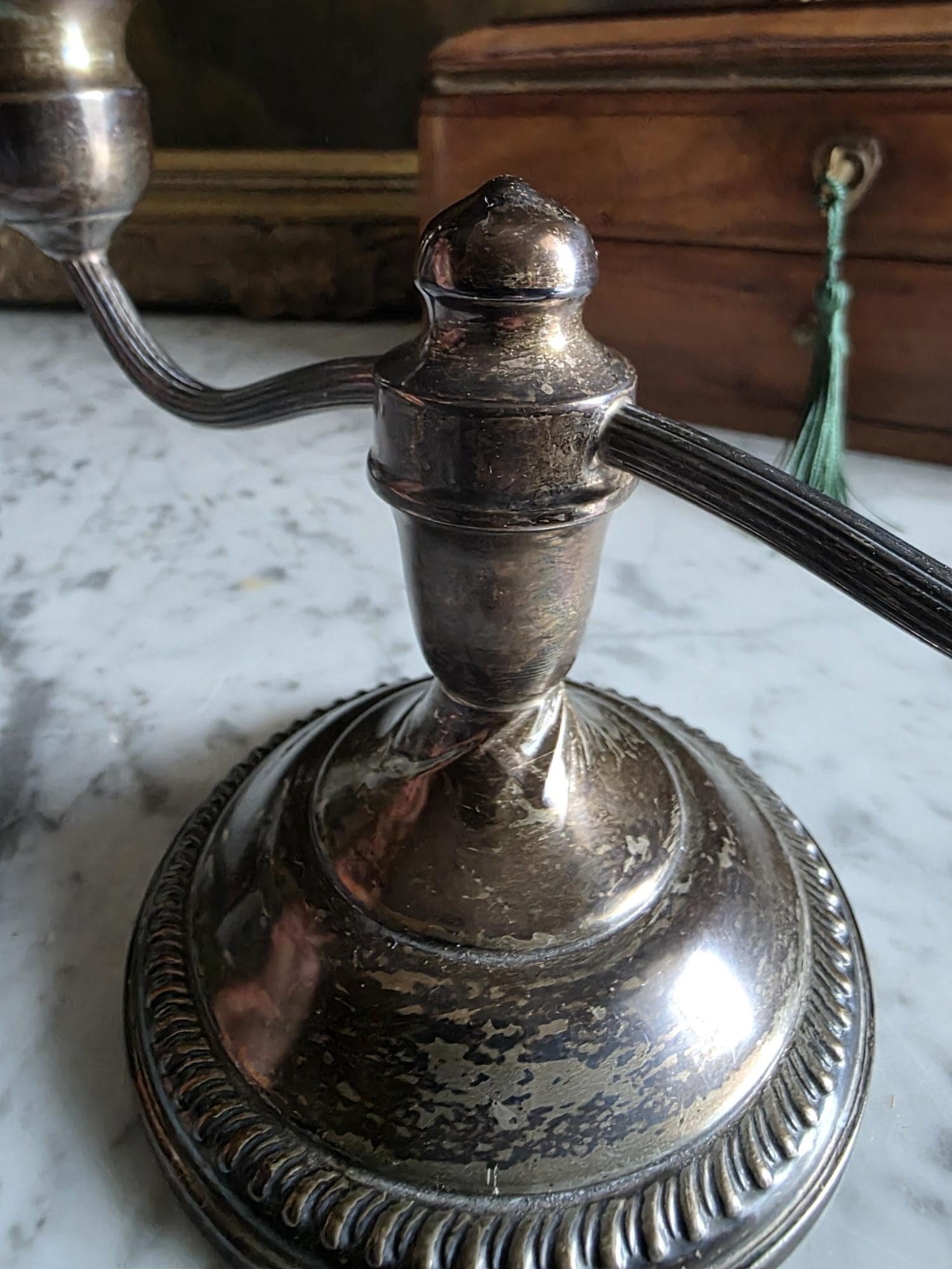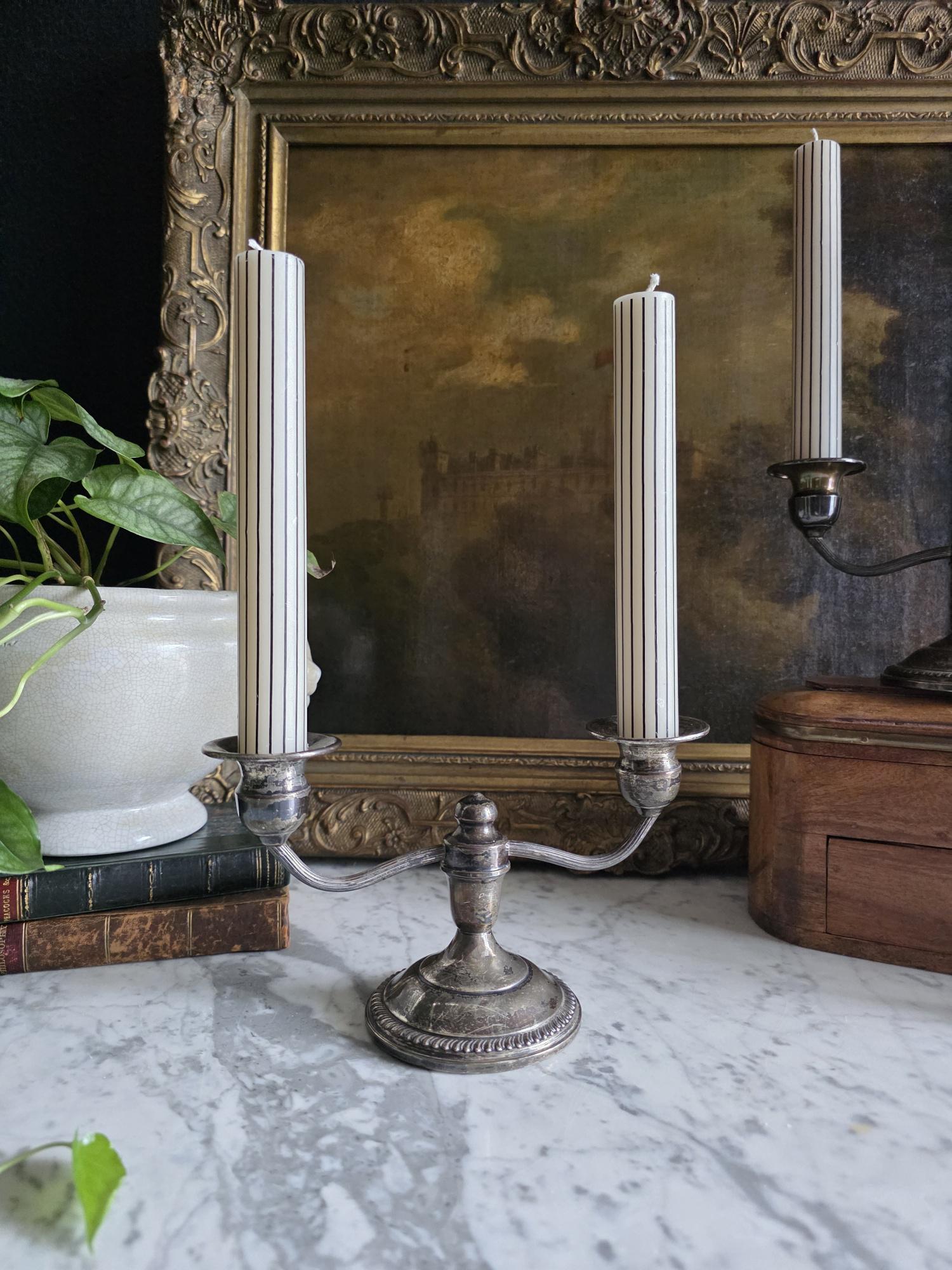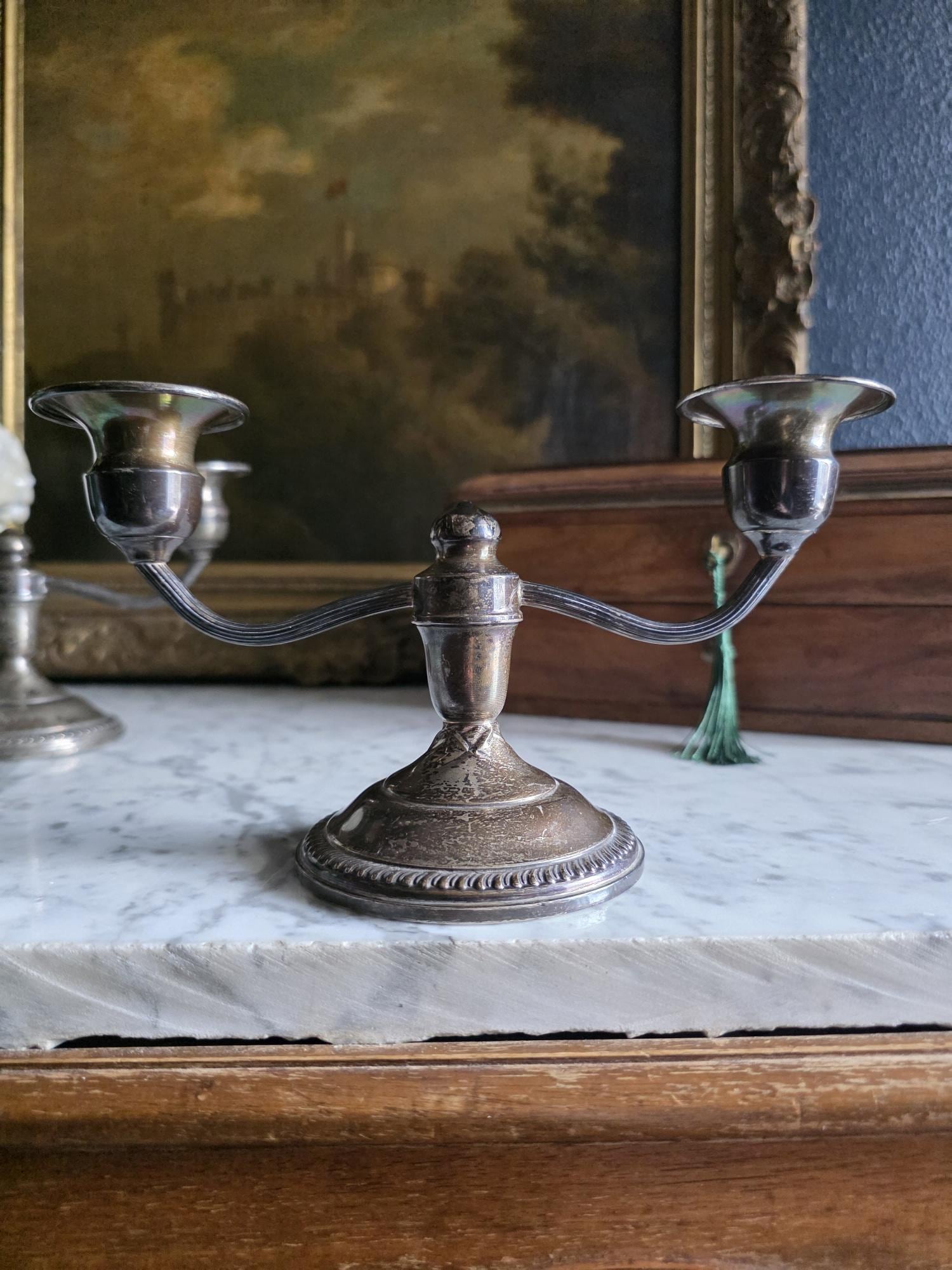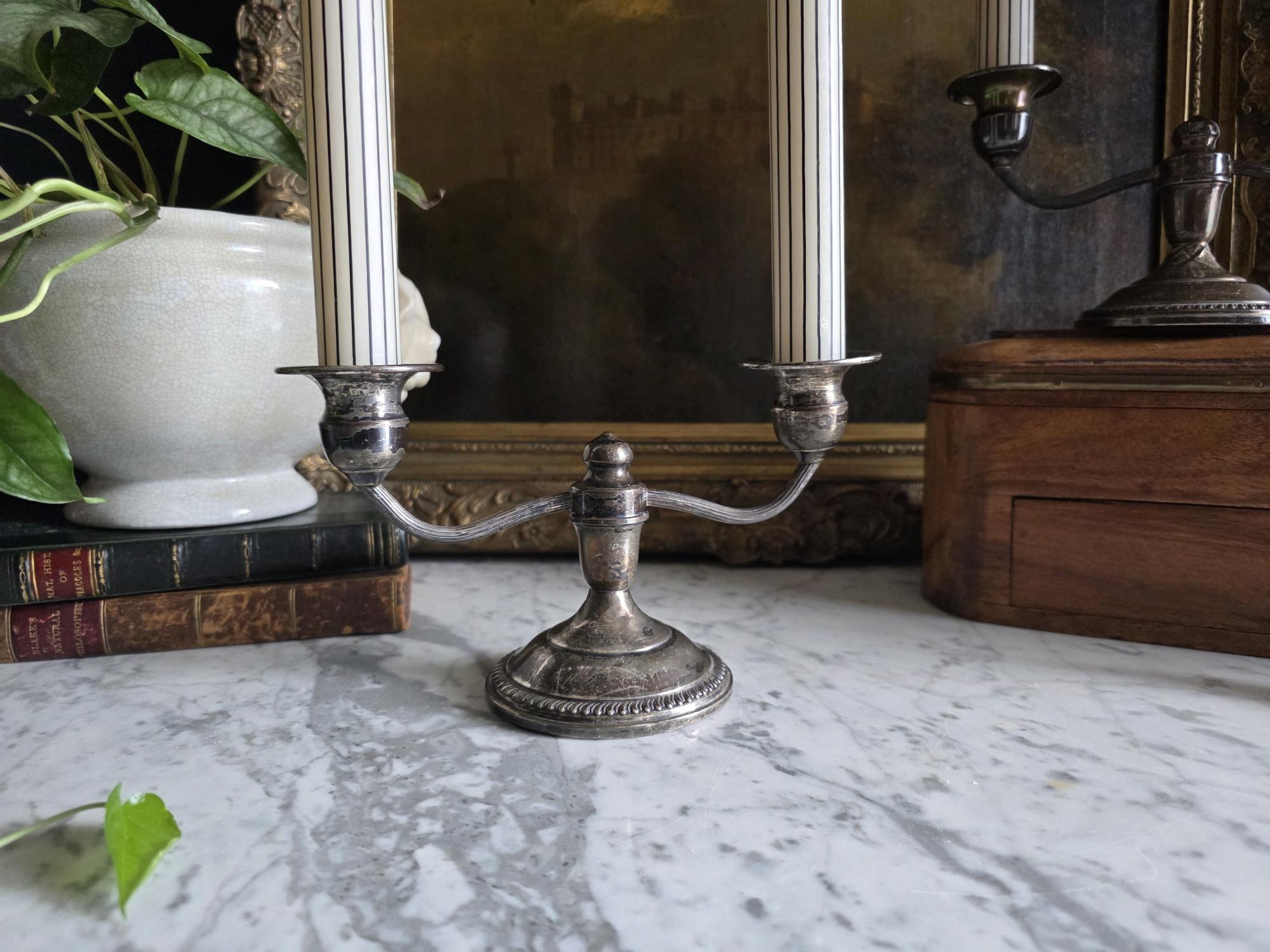 Presenting a stunning pair of vintage sterling silver double-arm candelabras, perfect for adding a touch of timeless elegance to your dining table, mantle, or curated display. Crafted with a beautiful, graceful curvature, each candelabra features ribbed arms extending from a central finial, supported by a weighted pedestal base with a classic gadroon border. The silver currently boasts a rich, natural tarnish and dark patina, making them ideal for a moody, dark academia, or English country-inspired aesthetic, though they could easily be polished to a brilliant shine for a more traditional look. The hallmark on the bottom reads "Empire Sterling Weighted 48," identifying them as the work of the Empire Silver Company of Brooklyn, New York. The company was founded in 1946, and this specific style of weighted silver was highly popular in the post-war era, placing the creation of these pieces in the mid-20th century, likely between the late 1940s and 1960s.