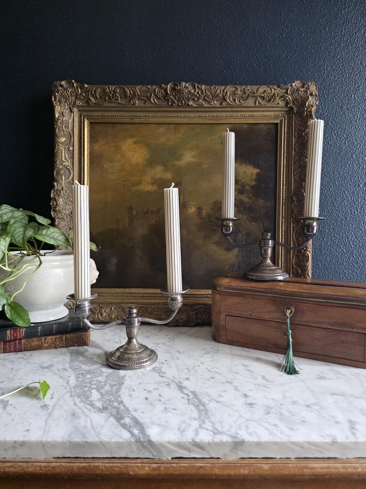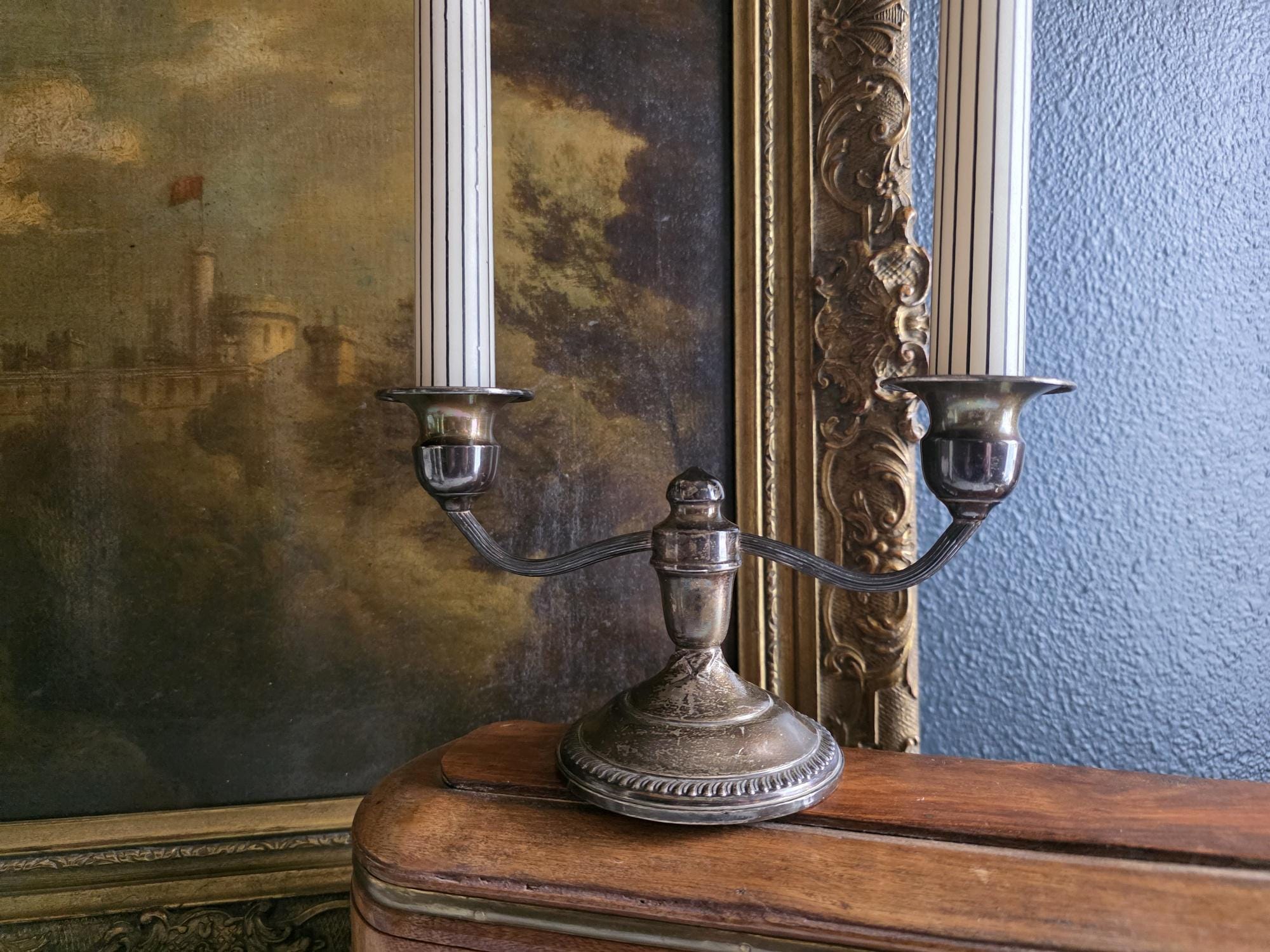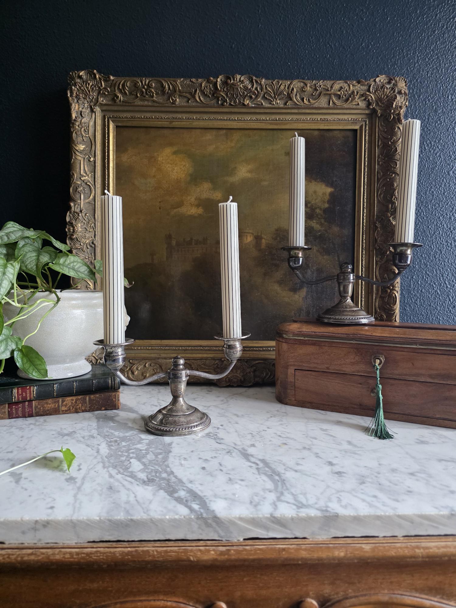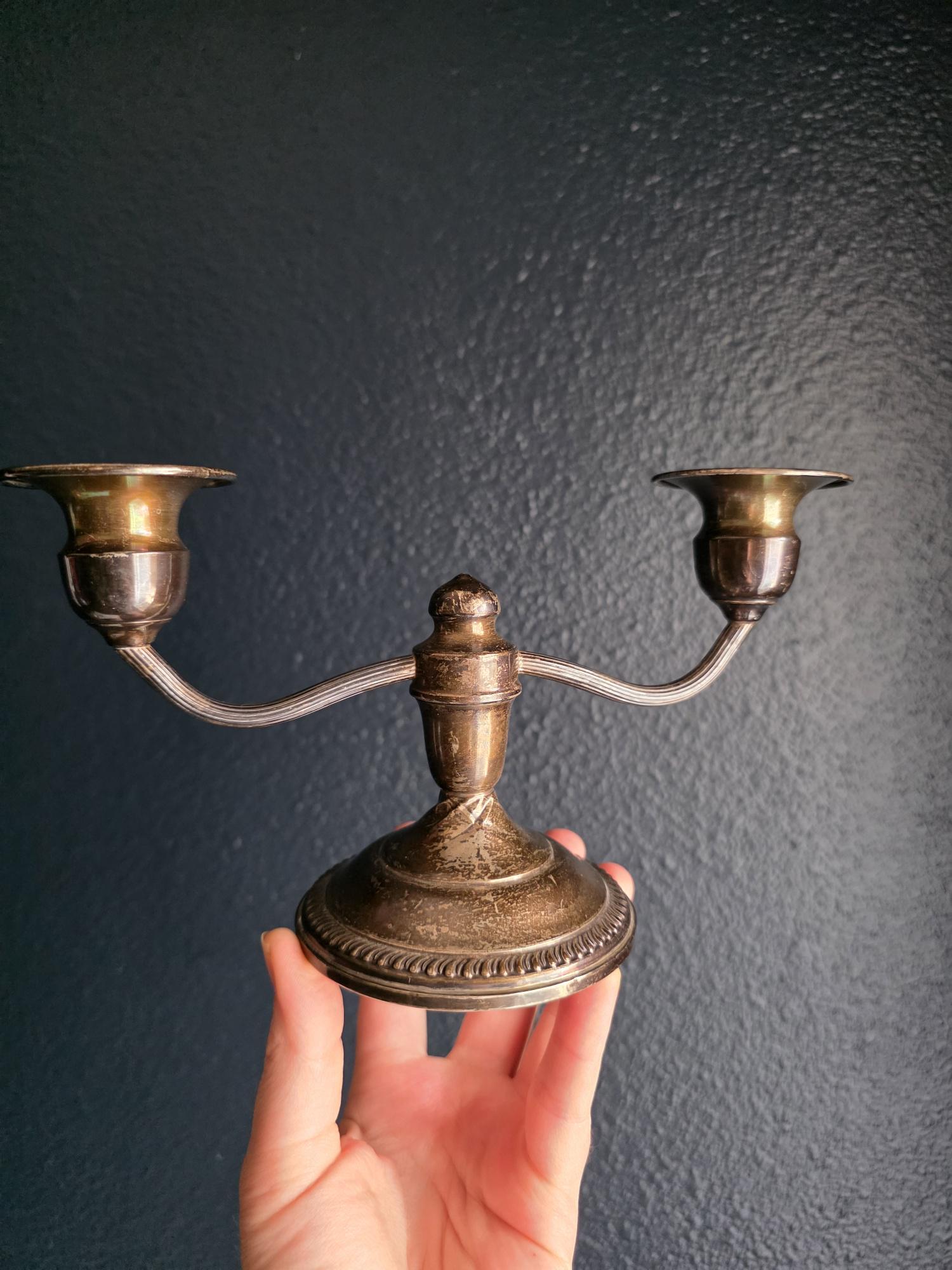Presenting a stunning pair of vintage sterling silver double-arm candelabras, perfect for adding a touch of timeless elegance to your dining table, mantle, or curated display. Crafted with a beautiful, graceful curvature, each candelabra features ribbed arms extending from a central finial, supported by a weighted pedestal base with a classic gadroon border. The silver currently boasts a rich, natural tarnish and dark patina, making them ideal for a moody, dark academia, or English country-inspired aesthetic, though they could easily be polished to a brilliant shine for a more traditional look. The hallmark on the bottom reads "Empire Sterling Weighted 48," identifying them as the work of the Empire Silver Company of Brooklyn, New York. The company was founded in 1946, and this specific style of weighted silver was highly popular in the post-war era, placing the creation of these pieces in the mid-20th century, likely between the late 1940s and 1960s.