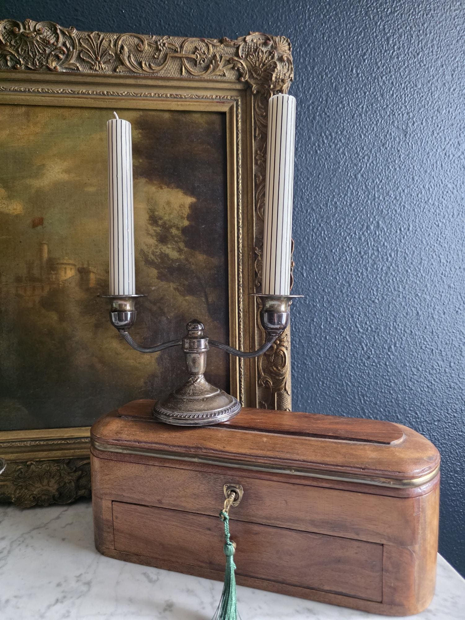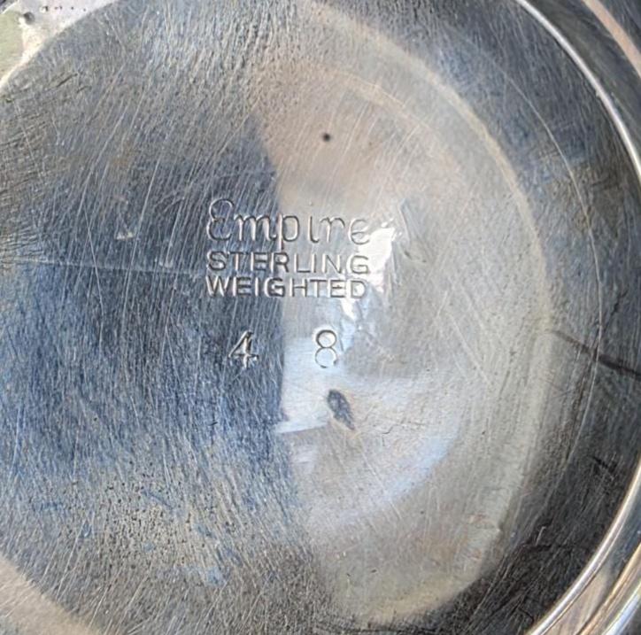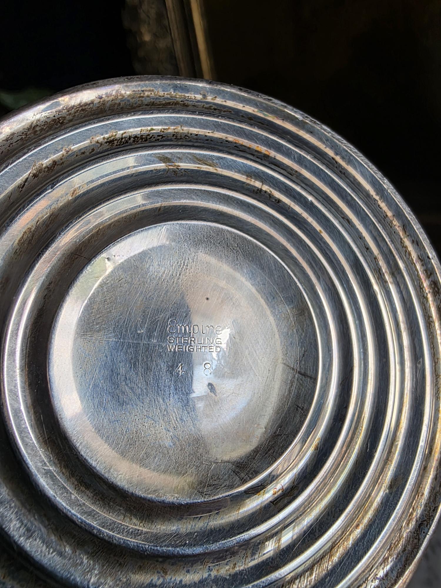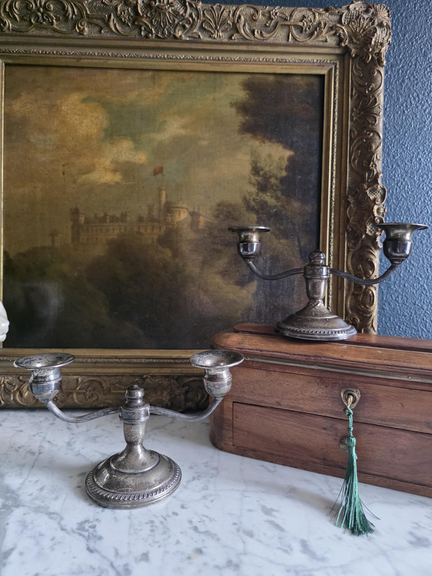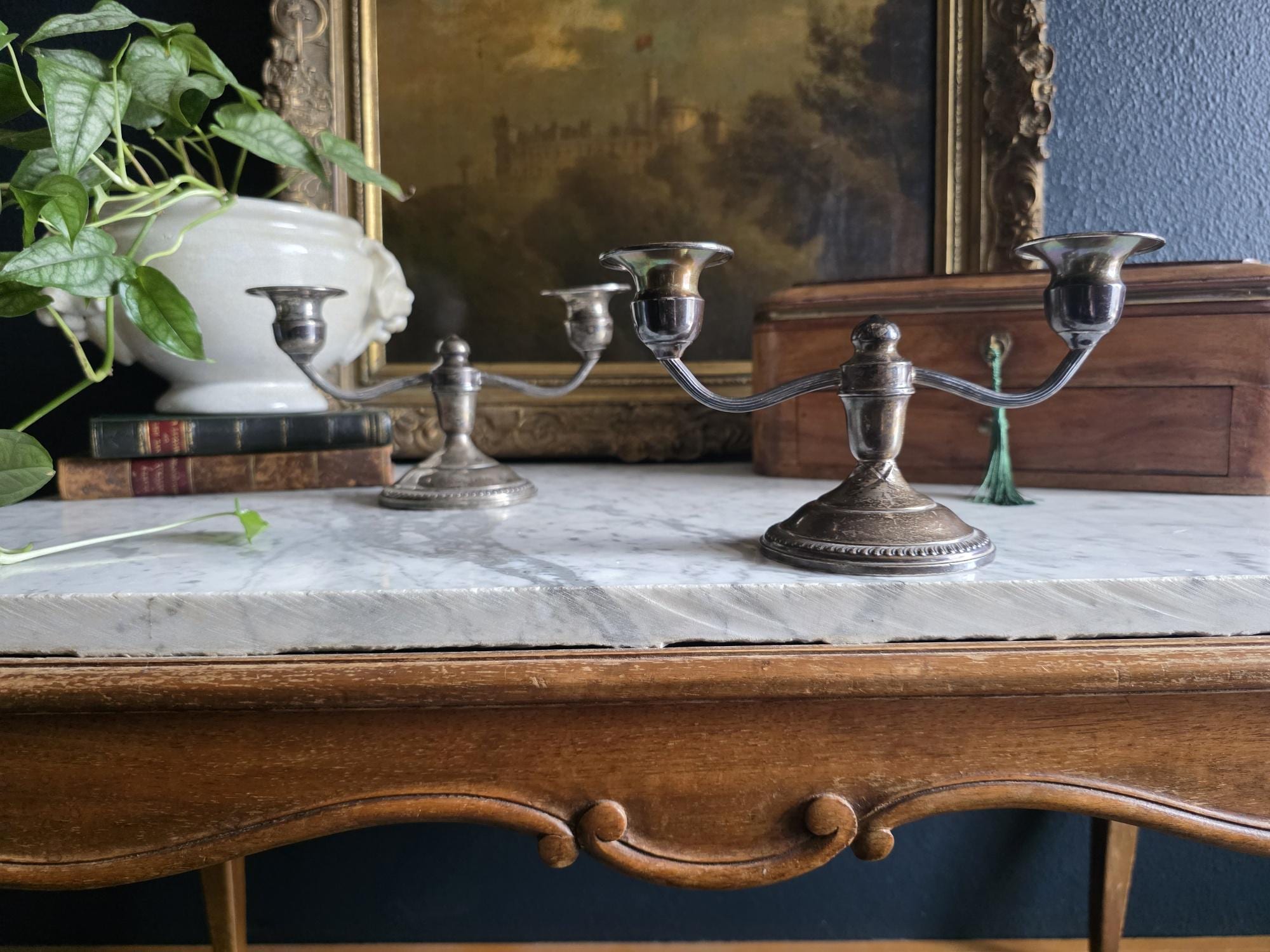 Presenting a stunning pair of vintage sterling silver double-arm candelabras, perfect for adding a touch of timeless elegance to your dining table, mantle, or curated display. Crafted with a beautiful, graceful curvature, each candelabra features ribbed arms extending from a central finial, supported by a weighted pedestal base with a classic gadroon border. The silver currently boasts a rich, natural tarnish and dark patina, making them ideal for a moody, dark academia, or English country-inspired aesthetic, though they could easily be polished to a brilliant shine for a more traditional look. The hallmark on the bottom reads "Empire Sterling Weighted 48," identifying them as the work of the Empire Silver Company of Brooklyn, New York. The company was founded in 1946, and this specific style of weighted silver was highly popular in the post-war era, placing the creation of these pieces in the mid-20th century, likely between the late 1940s and 1960s.