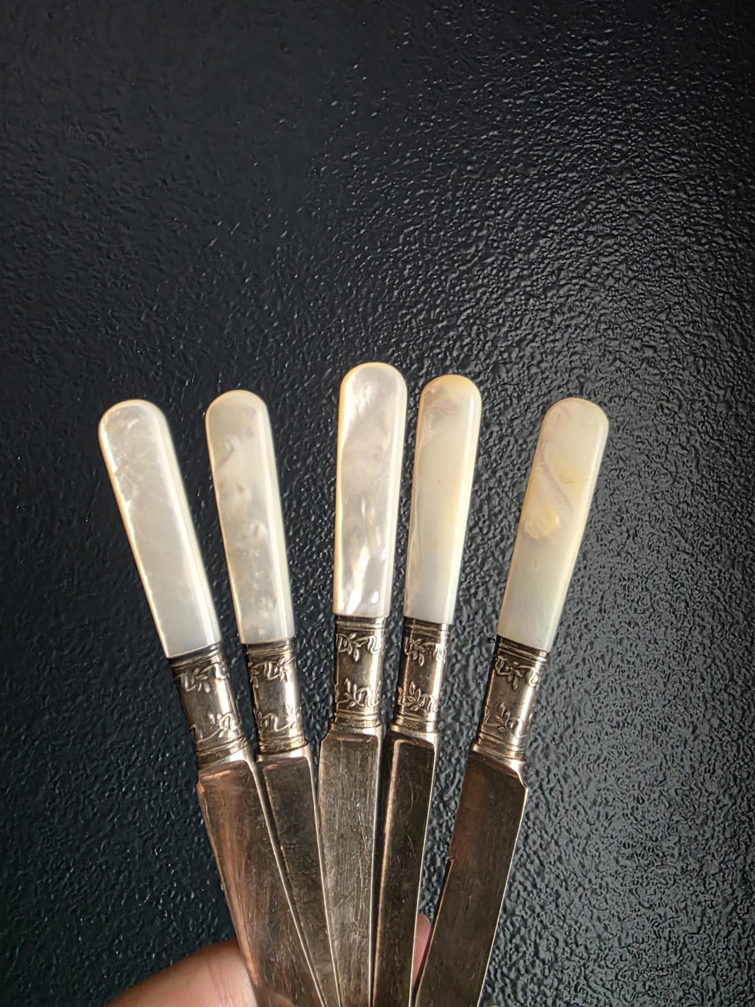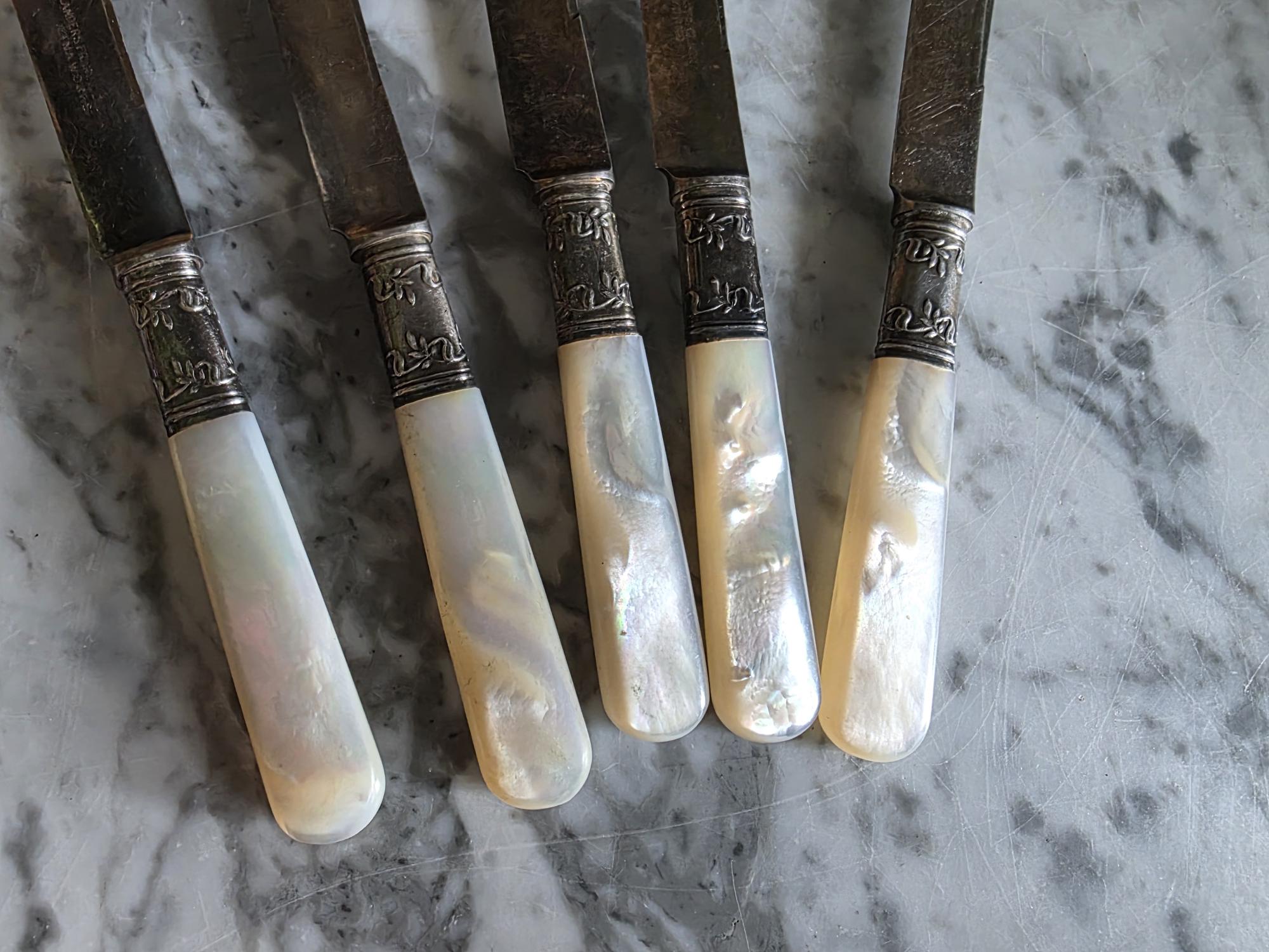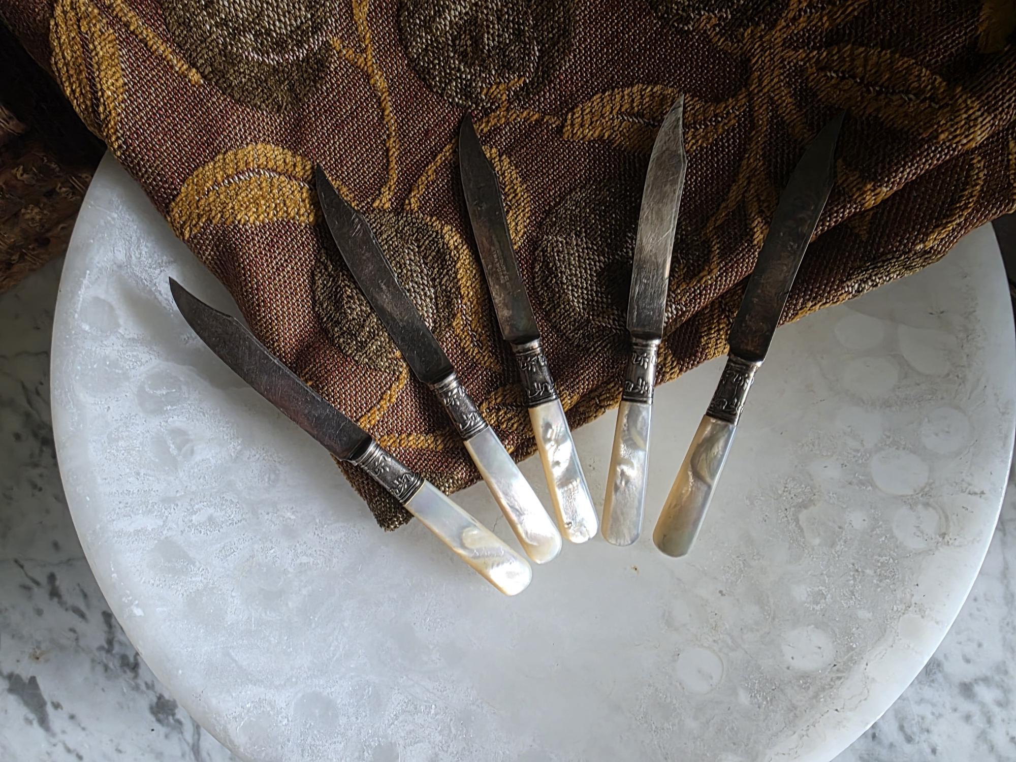 Elevate your next table setting or charcuterie board with this elegant set of five antique spreading knives by Landers, Frary & Clark (stamped Aetna Works). This set dates to between 1890-1915. Measuring exactly 6 inches in length, each knife features a beautifully contoured, iridescent mother-of-pearl handle that catches the light with a natural, luminous glow. The handles are seamlessly joined to the curved steel blades by striking sterling silver ferrules. These ferrules are distinctly hallmarked "STERLING" and feature a deeply embossed, ornate floral and foliate motif that adds a touch of Victorian-era refinement. Perfect for serving butter, soft cheeses, or jams, this set showcases authentic, age-appropriate character. The blades and silver fittings display expected surface wear, minor scratching, and vintage patina, all of which speak to their rich history and long life of use.