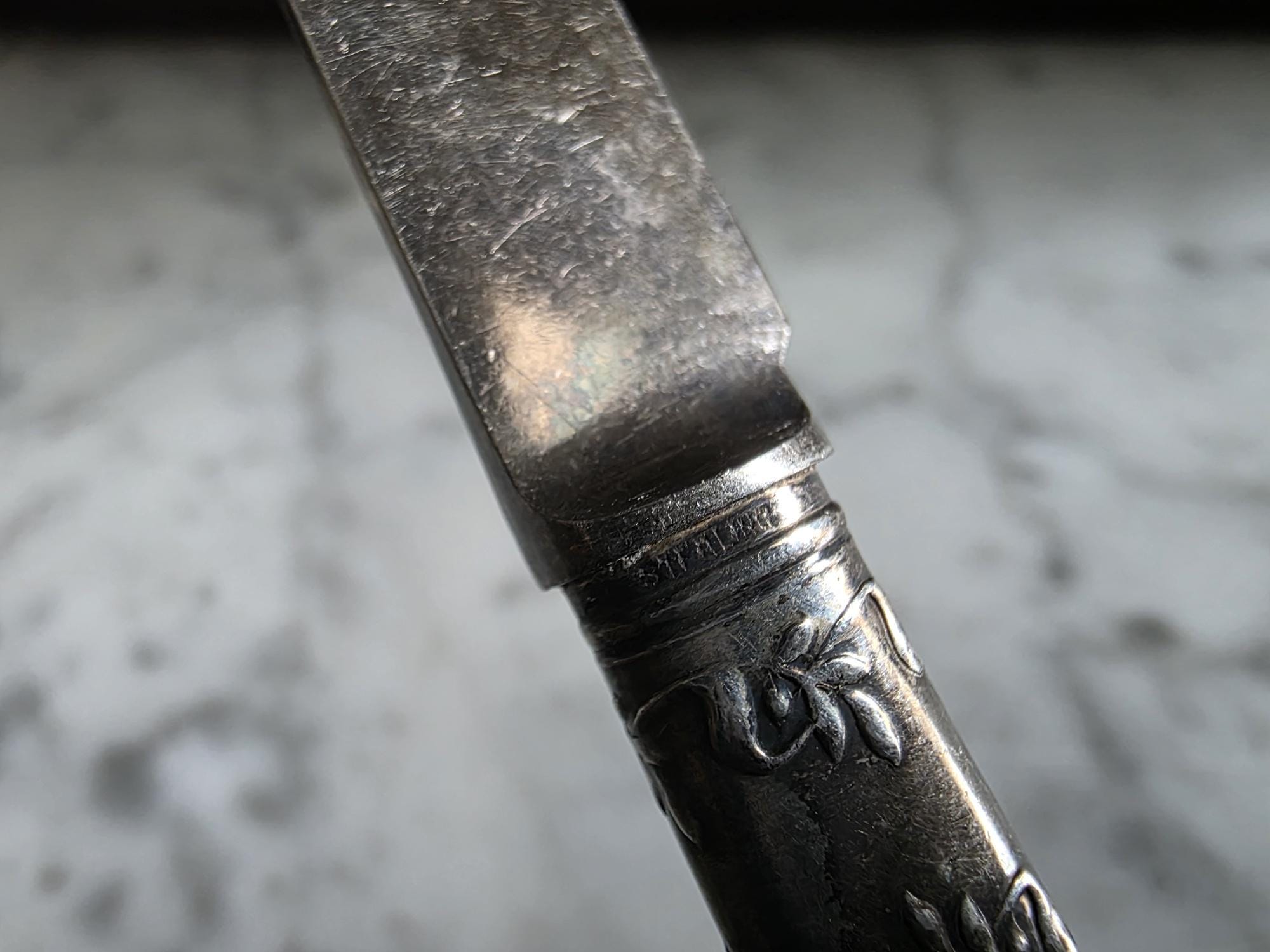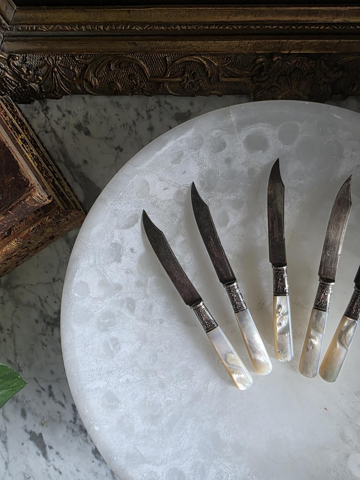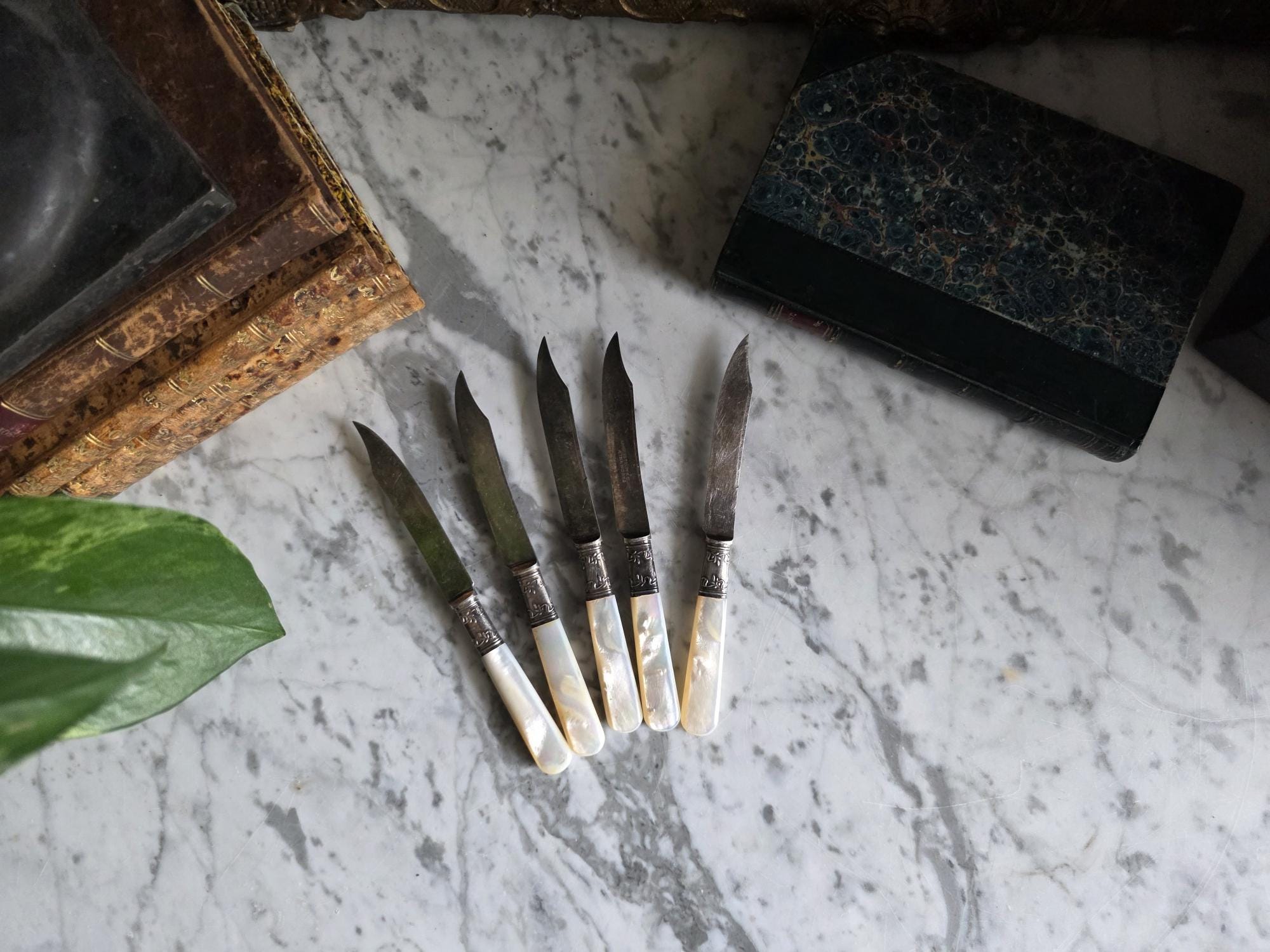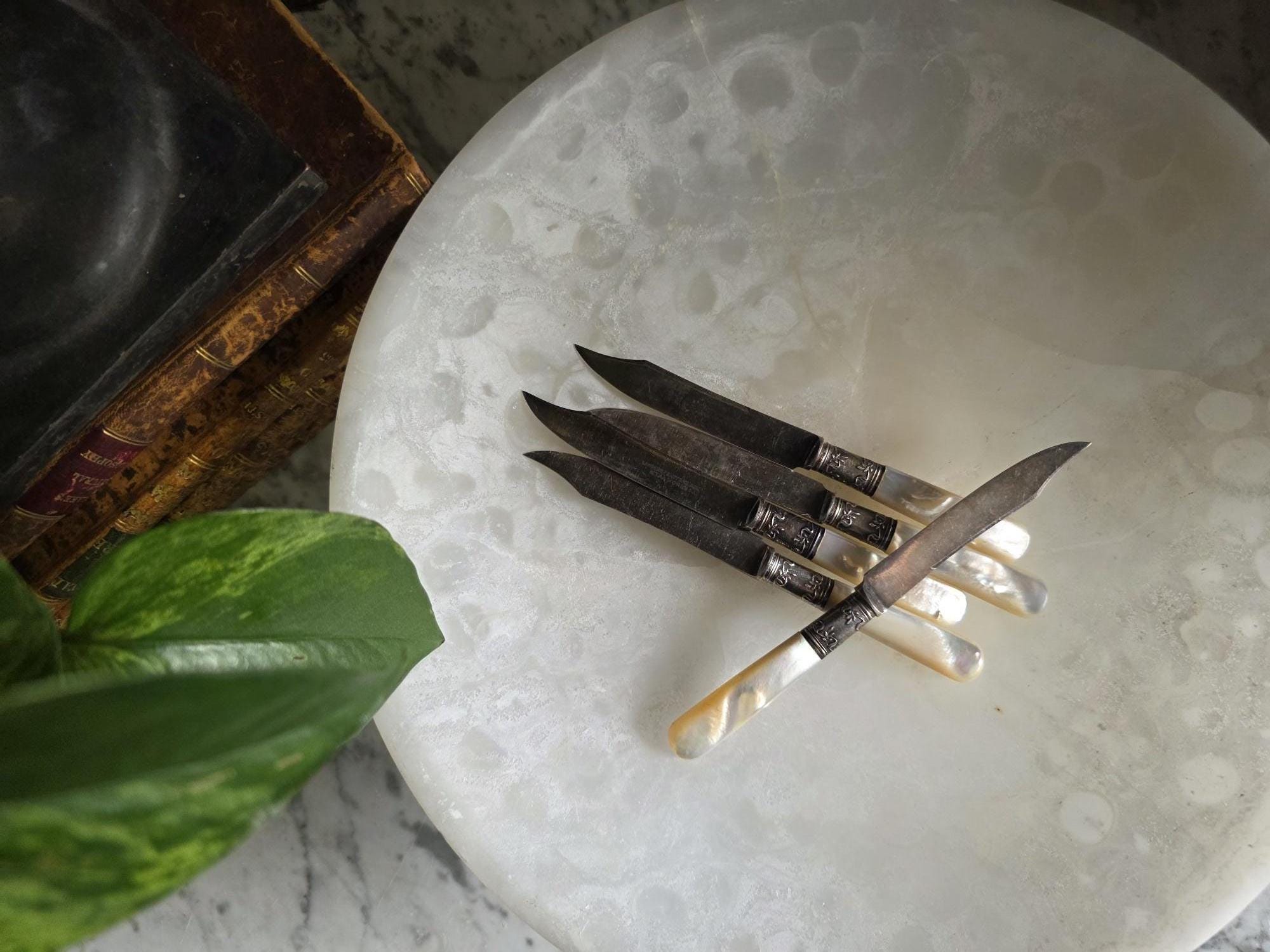 Elevate your next table setting or charcuterie board with this elegant set of five antique spreading knives by Landers, Frary & Clark (stamped Aetna Works). This set dates to between 1890-1915. Measuring exactly 6 inches in length, each knife features a beautifully contoured, iridescent mother-of-pearl handle that catches the light with a natural, luminous glow. The handles are seamlessly joined to the curved steel blades by striking sterling silver ferrules. These ferrules are distinctly hallmarked "STERLING" and feature a deeply embossed, ornate floral and foliate motif that adds a touch of Victorian-era refinement. Perfect for serving butter, soft cheeses, or jams, this set showcases authentic, age-appropriate character. The blades and silver fittings display expected surface wear, minor scratching, and vintage patina, all of which speak to their rich history and long life of use.