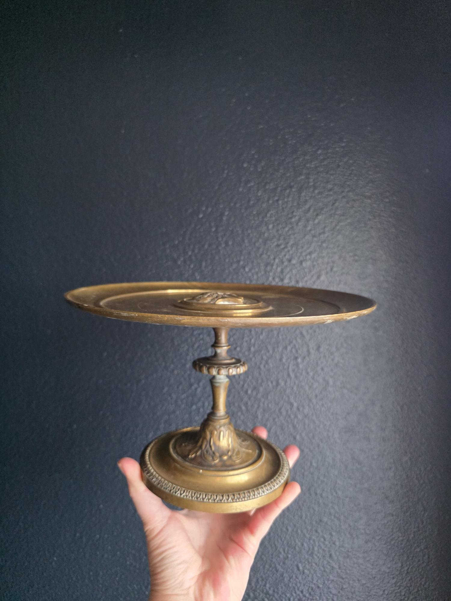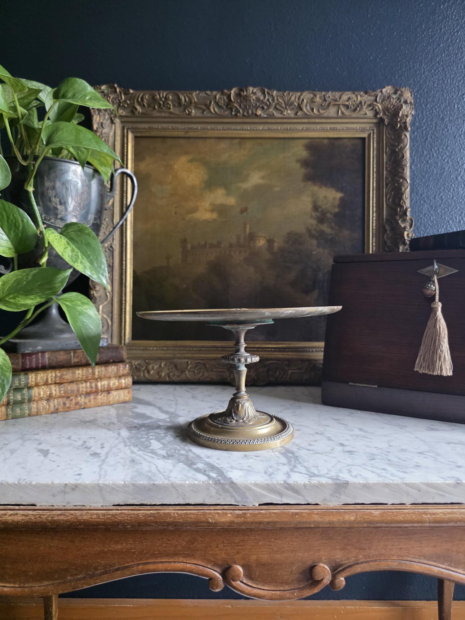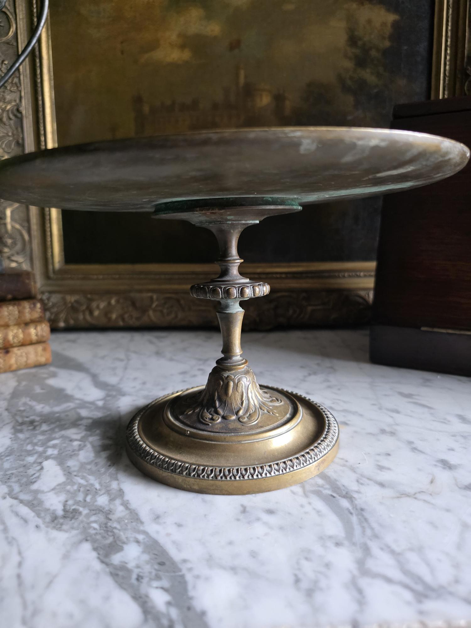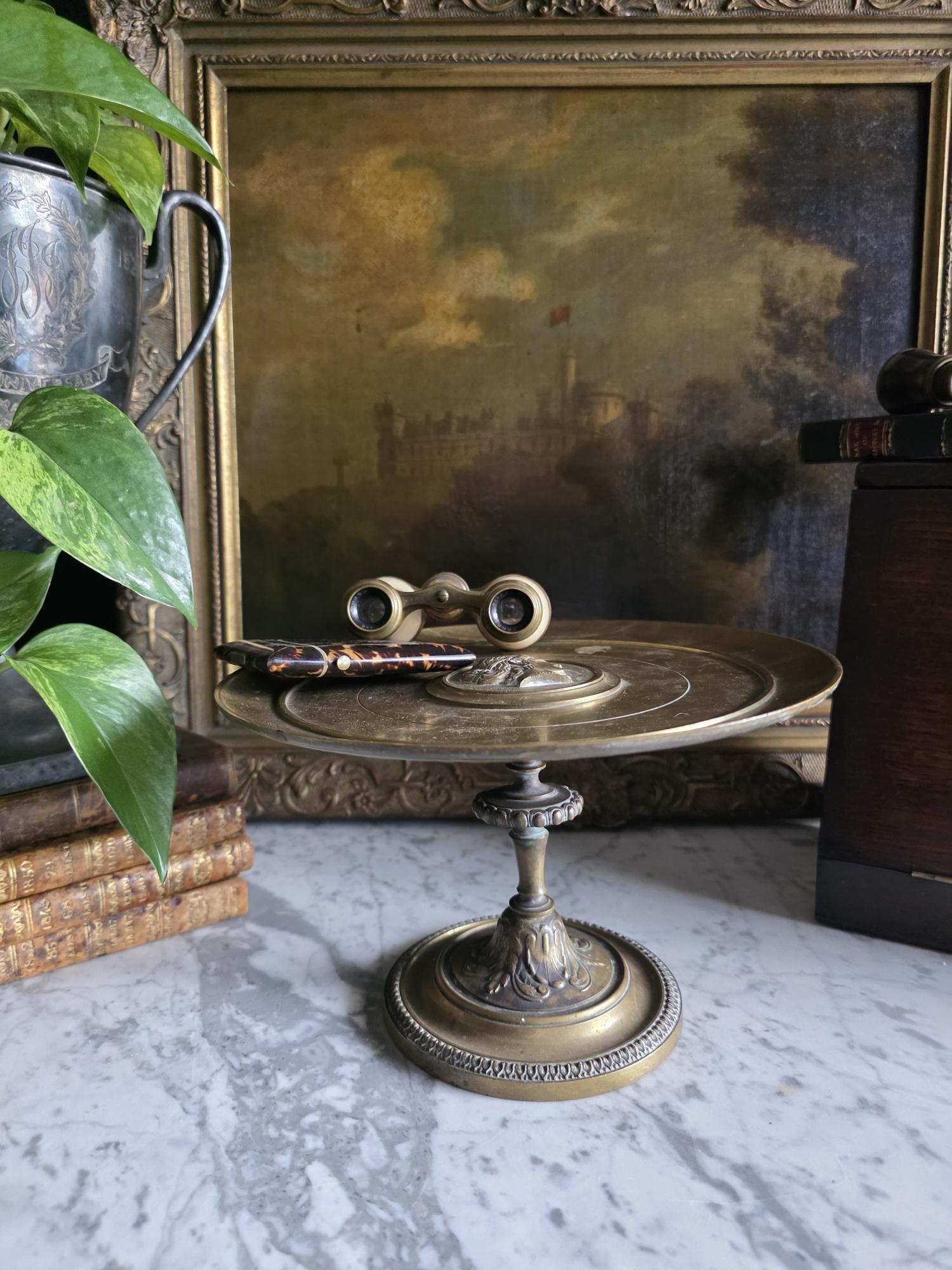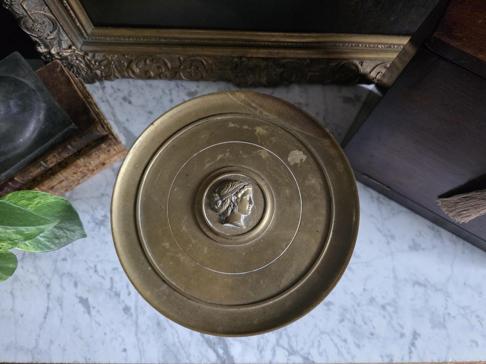 Add a touch of classical elegance to your space with this striking late 19th-century neoclassical bronze tazza. Dating to the Grand Tour era, circa 1860 to 1890, this shallow dish features a beautifully detailed relief medallion of a classical profile at its center, making it a perfect foundation for displaying your favorite curiosities, small natural specimens, or resting beautifully atop a stack of bound books in a curated vignette. It is elevated by an elegant pedestal stand detailed with ornate foliate motifs and a classic beaded rim along the base. Please note that while the original side handles are missing, the piece is structurally sound and in otherwise excellent antique condition. It boasts a rich, authentic character, evidenced by the considerable natural patina and beautiful green verdigris present on the underside and base components. Whether used as a sophisticated catchall or a standalone sculptural element, this historic tazza brings a timeless, worldly charm to any room.