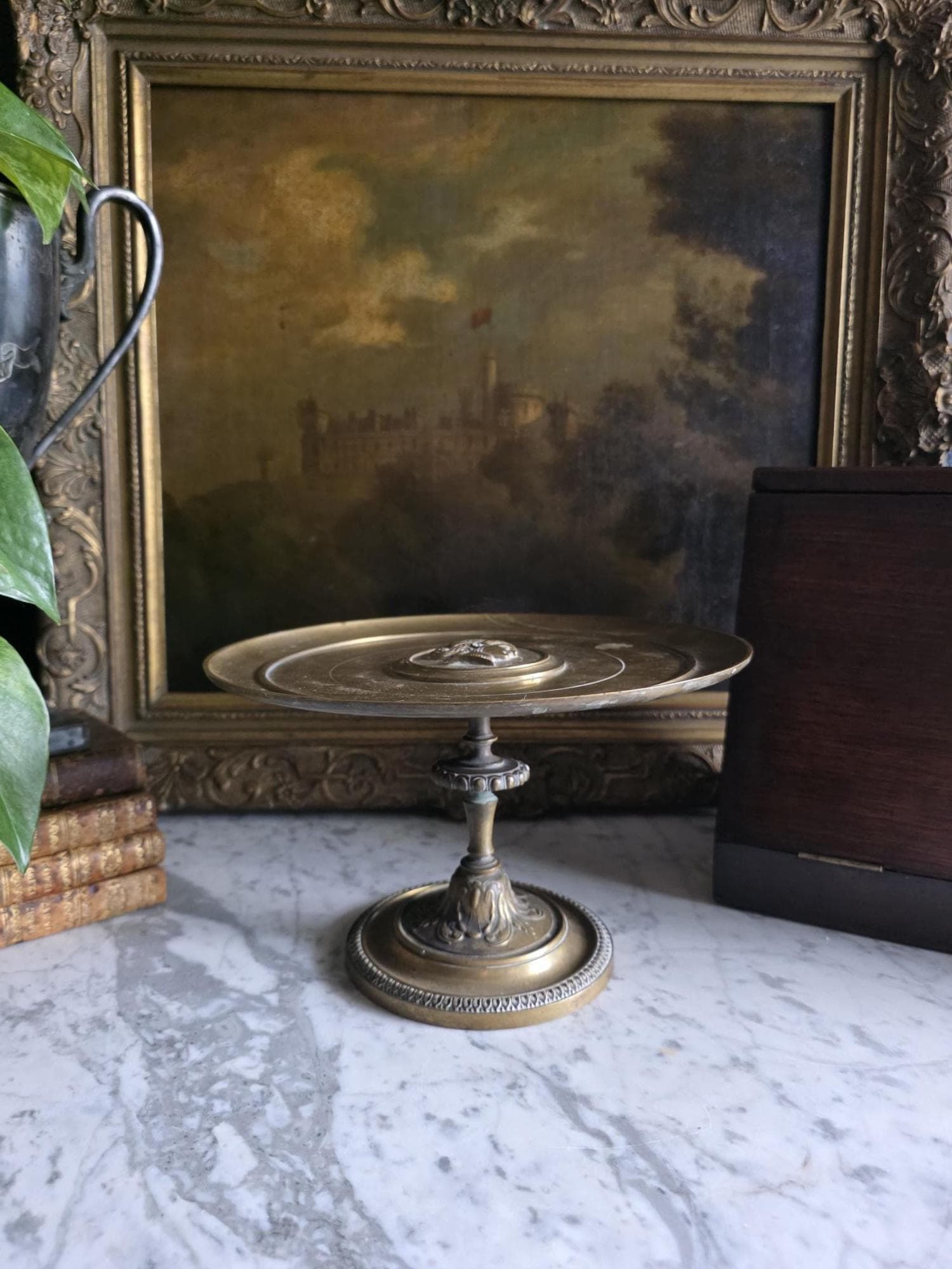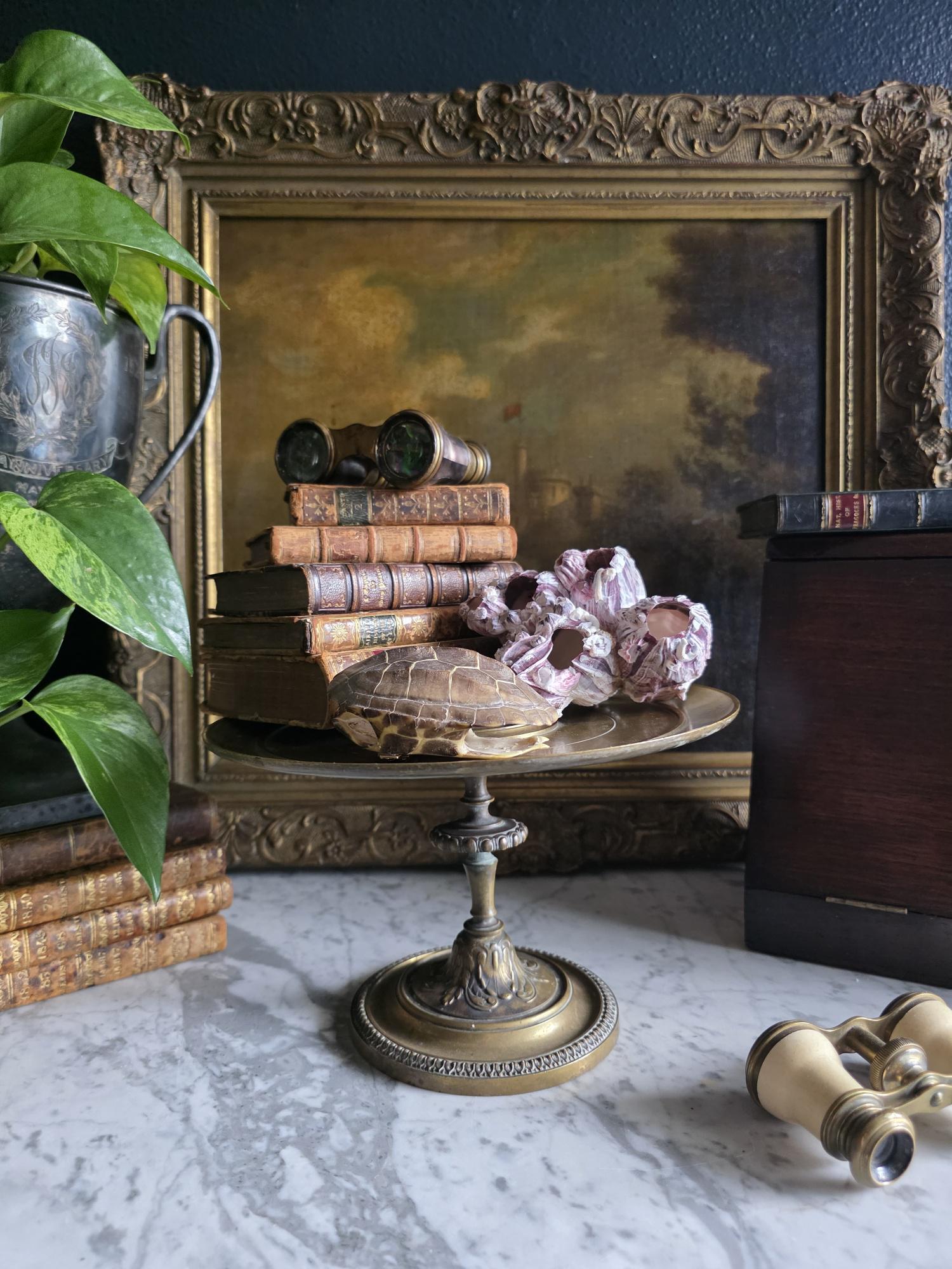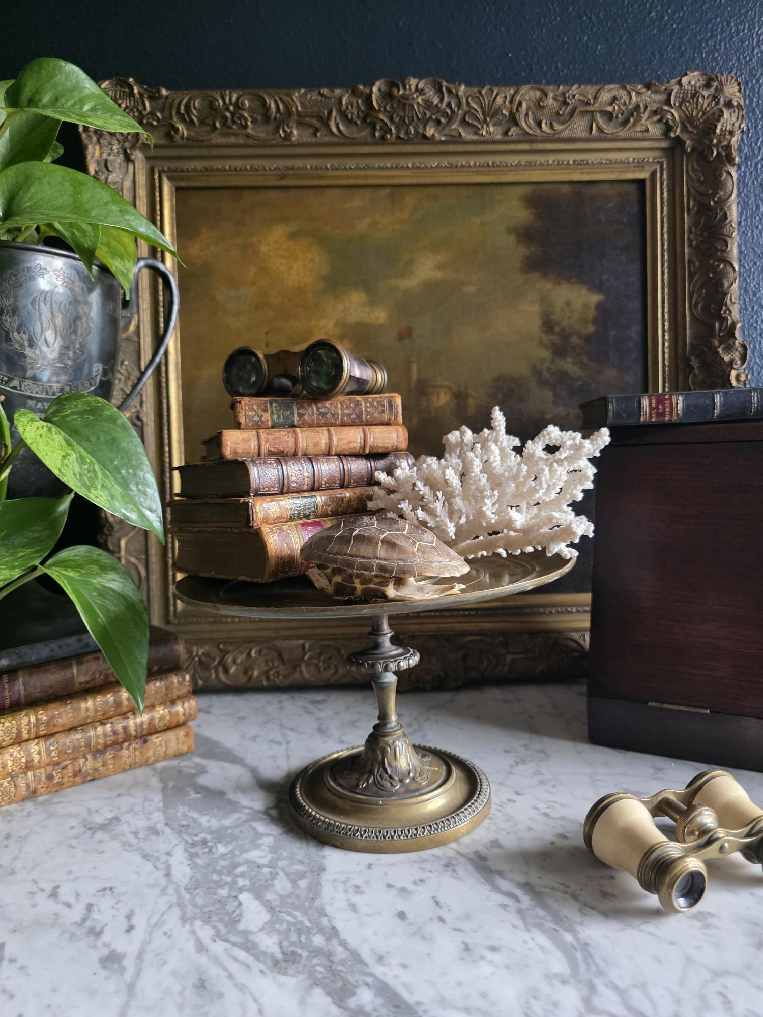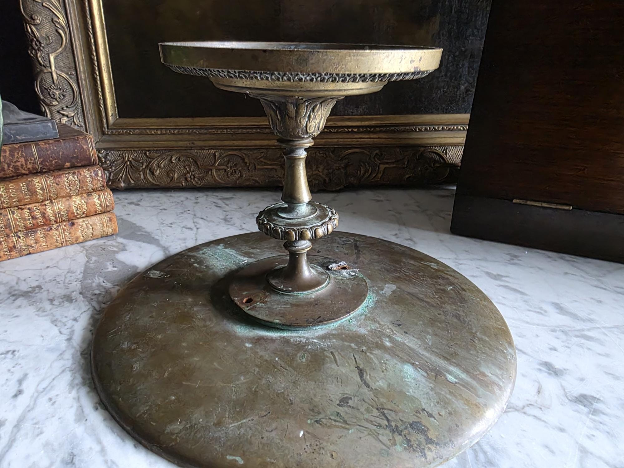 Add a touch of classical elegance to your space with this striking late 19th-century neoclassical bronze tazza. Dating to the Grand Tour era, circa 1860 to 1890, this shallow dish features a beautifully detailed relief medallion of a classical profile at its center, making it a perfect foundation for displaying your favorite curiosities, small natural specimens, or resting beautifully atop a stack of bound books in a curated vignette. It is elevated by an elegant pedestal stand detailed with ornate foliate motifs and a classic beaded rim along the base. Please note that while the original side handles are missing, the piece is structurally sound and in otherwise excellent antique condition. It boasts a rich, authentic character, evidenced by the considerable natural patina and beautiful green verdigris present on the underside and base components. Whether used as a sophisticated catchall or a standalone sculptural element, this historic tazza brings a timeless, worldly charm to any room.