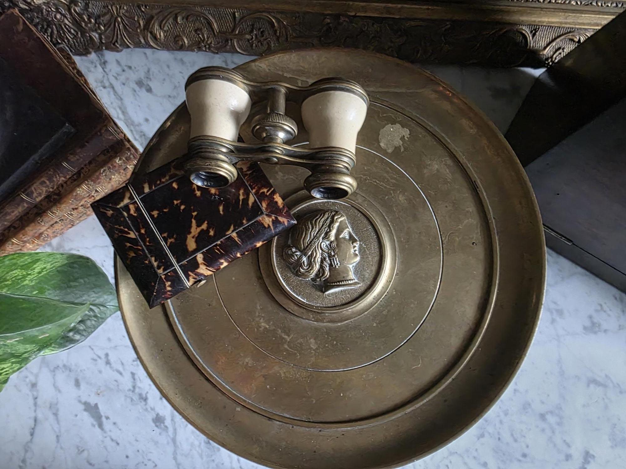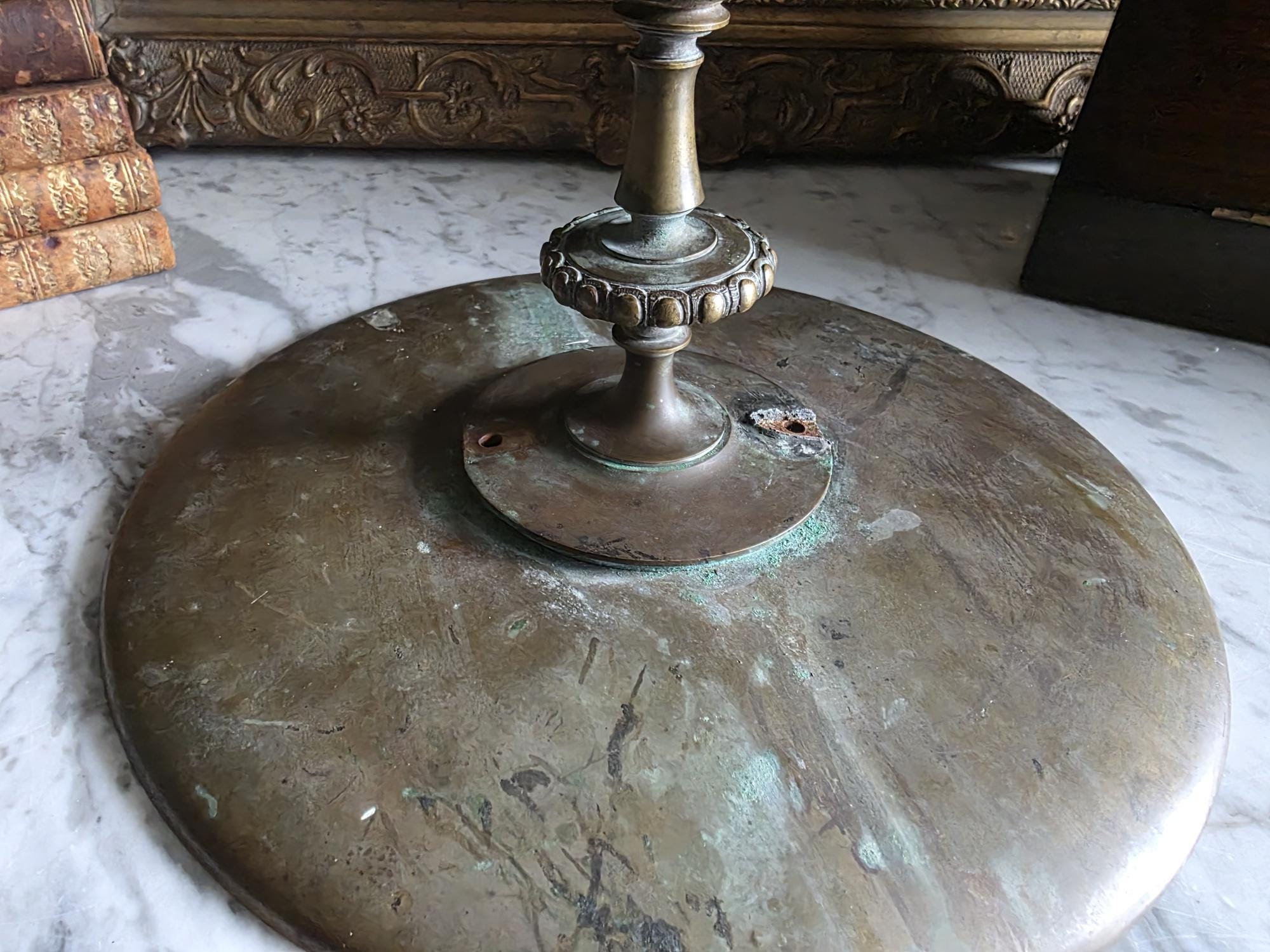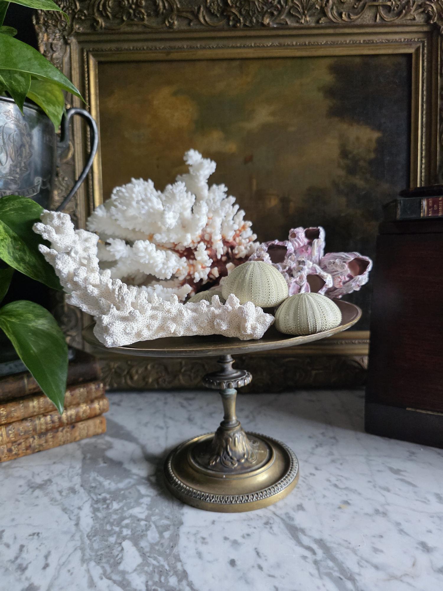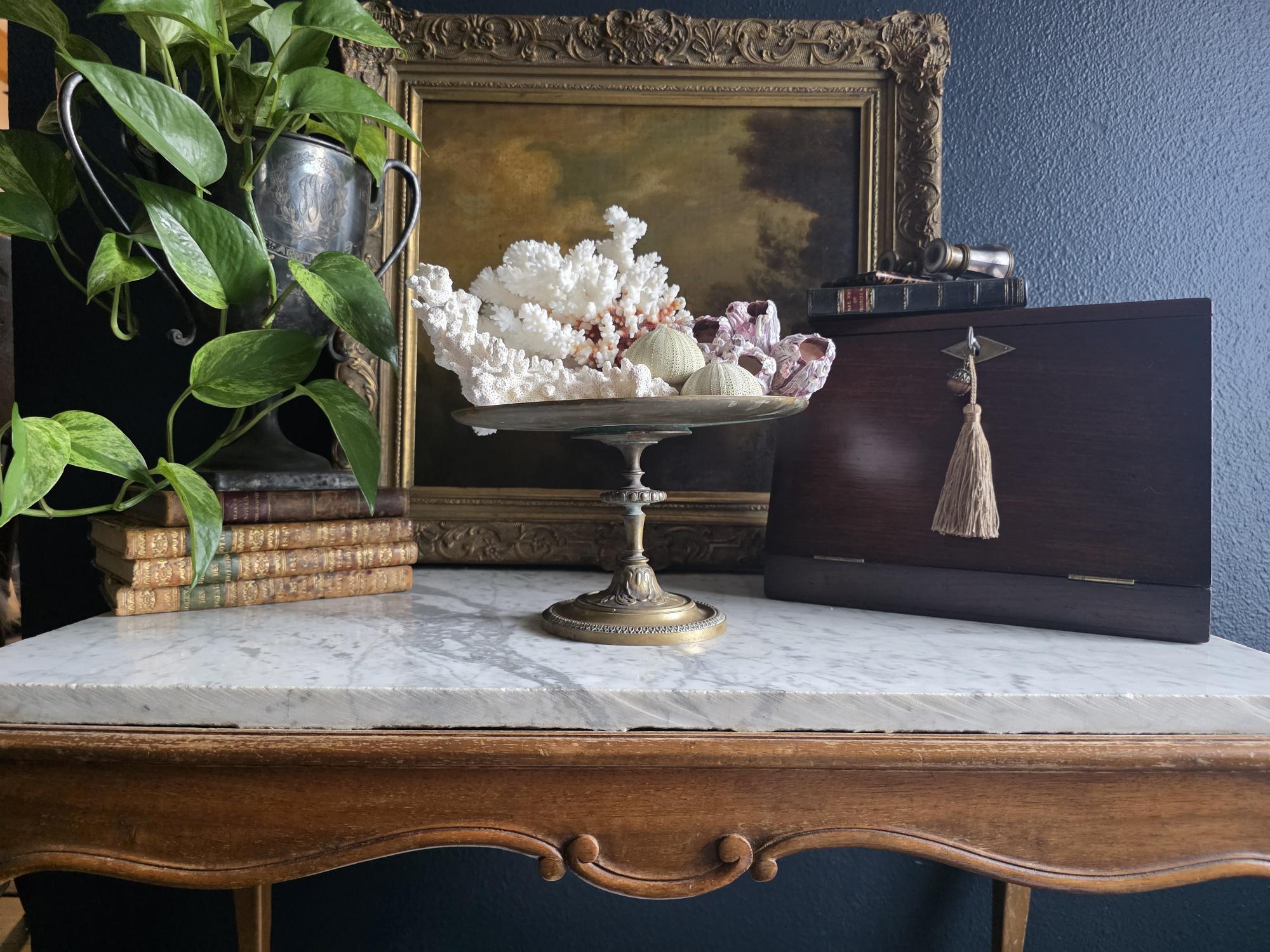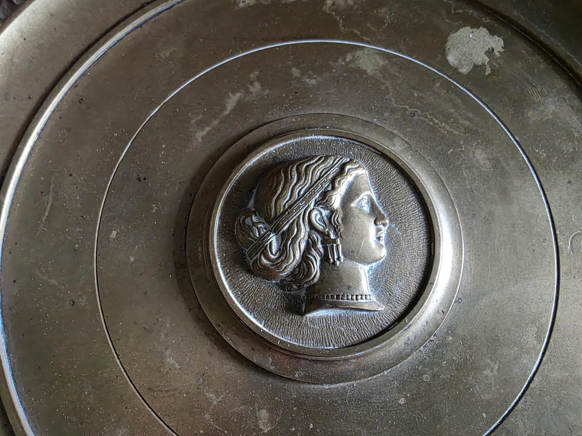 Add a touch of classical elegance to your space with this striking late 19th-century neoclassical bronze tazza. Dating to the Grand Tour era, circa 1860 to 1890, this shallow dish features a beautifully detailed relief medallion of a classical profile at its center, making it a perfect foundation for displaying your favorite curiosities, small natural specimens, or resting beautifully atop a stack of bound books in a curated vignette. It is elevated by an elegant pedestal stand detailed with ornate foliate motifs and a classic beaded rim along the base. Please note that while the original side handles are missing, the piece is structurally sound and in otherwise excellent antique condition. It boasts a rich, authentic character, evidenced by the considerable natural patina and beautiful green verdigris present on the underside and base components. Whether used as a sophisticated catchall or a standalone sculptural element, this historic tazza brings a timeless, worldly charm to any room.
