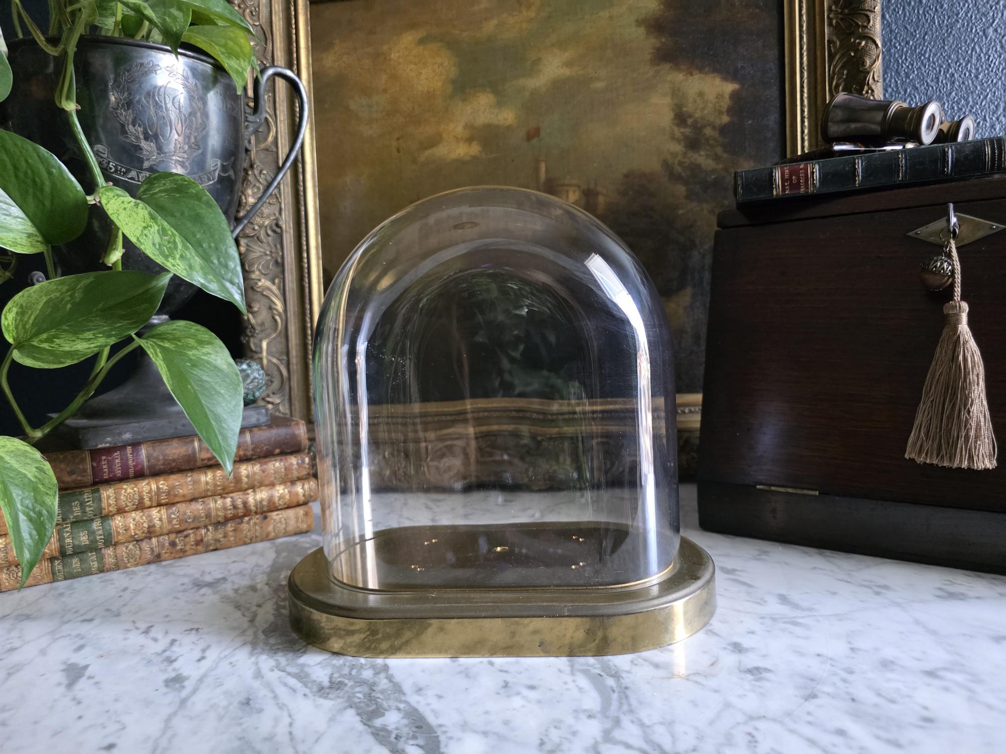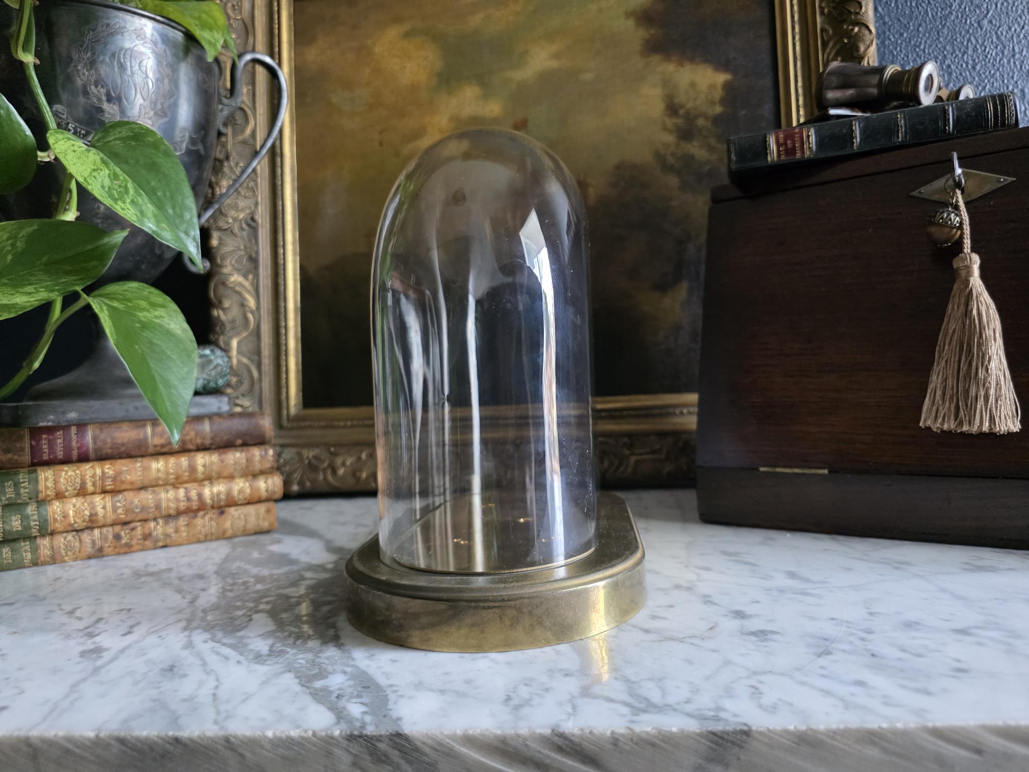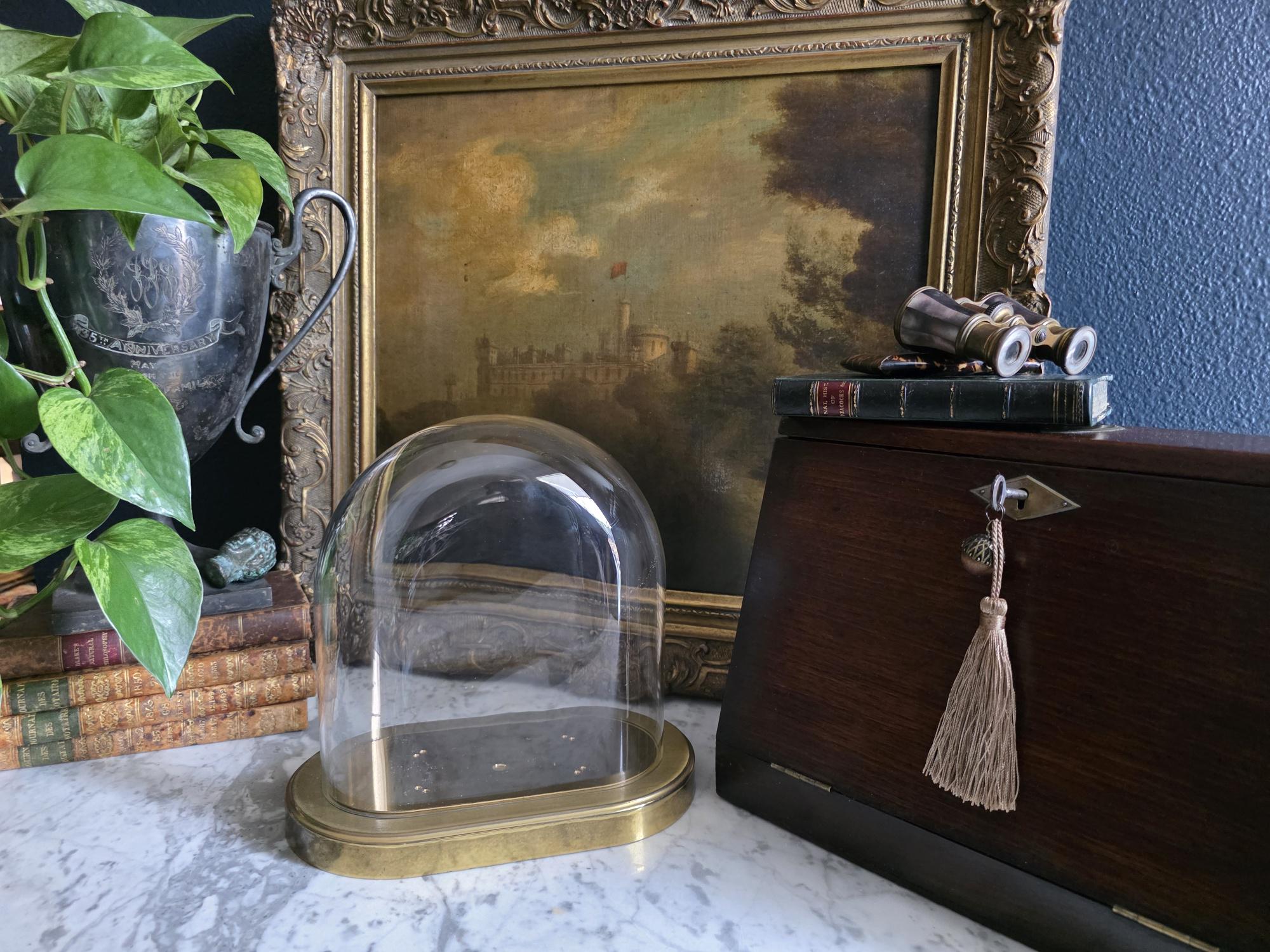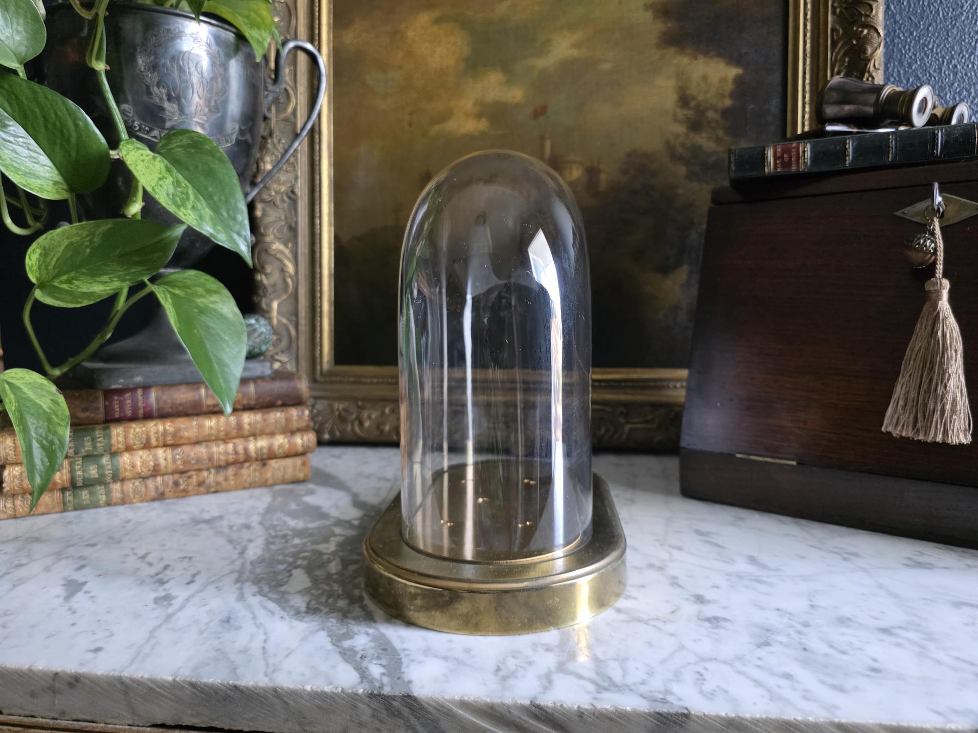 Showcase your most treasured curiosities, small sculptures, or favorite vintage finds with this authentic mid-century glass and brass cloche dome. Originally crafted in West Germany by the renowned clockmakers Kieninger & Obergfell, this piece was initially designed to house and protect a delicate torsion anniversary clock. Today, it serves as a stunning, repurposed display case perfect for taxidermy, miniature art, or delicate botanicals. The crystal-clear glass dome rests securely on a beautifully patinated oval brass base, which still features the small pre-drilled holes from its original clockwork mounting—a subtle, authentic nod to its horological history. Whether you are curating a Victorian-inspired cabinet of curiosities or simply looking to elevate a special decor piece on your mantel, this versatile and elegant Kundo dome adds an instant touch of historic charm to any space.