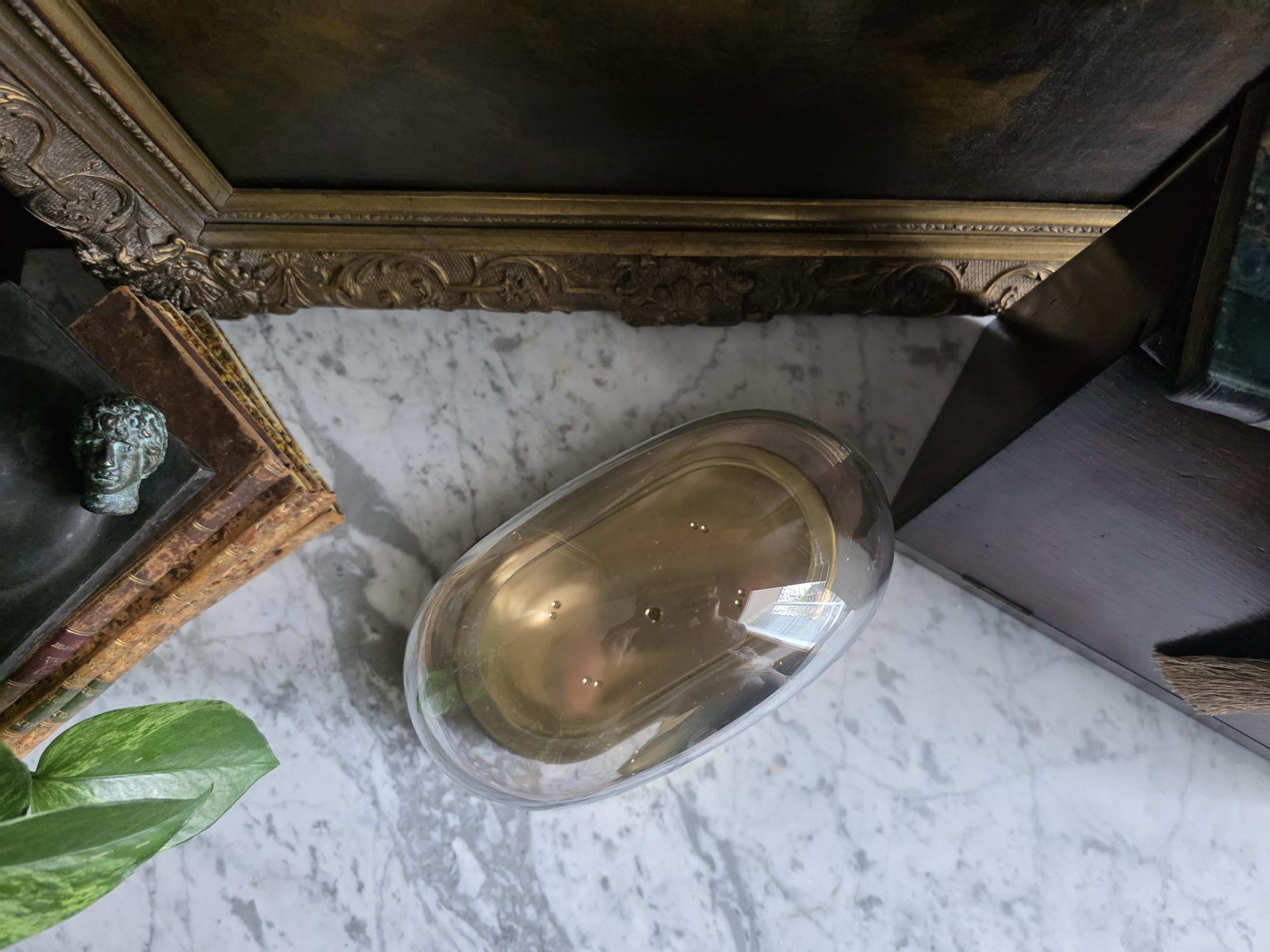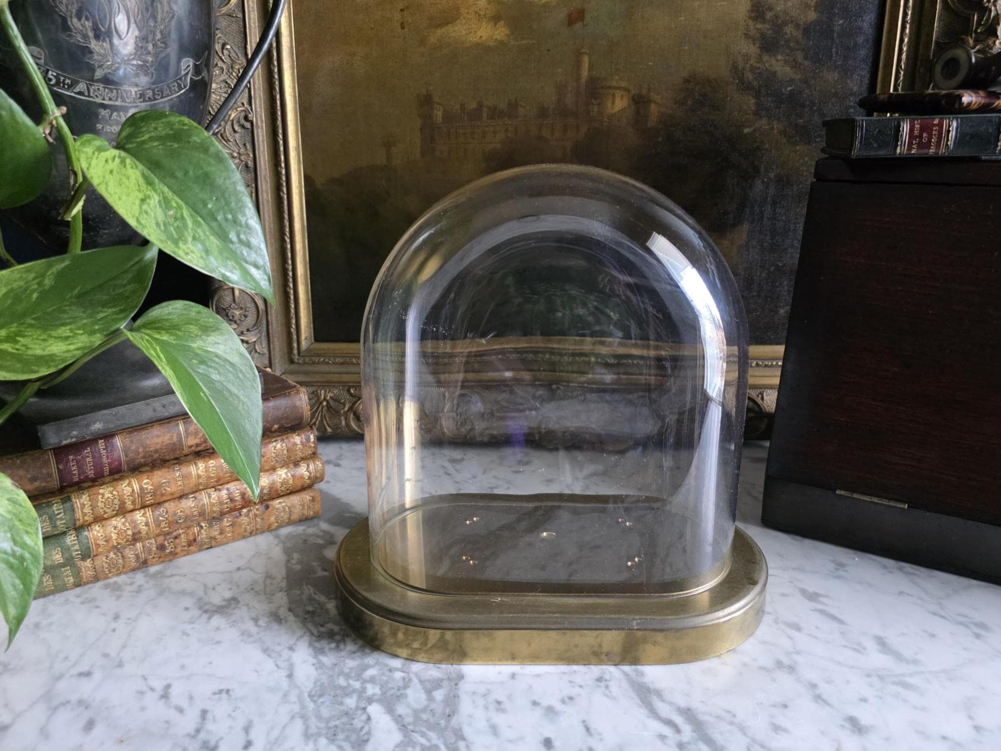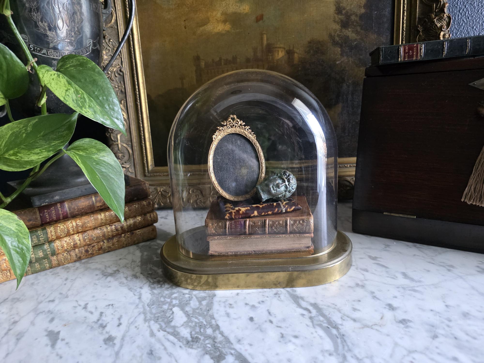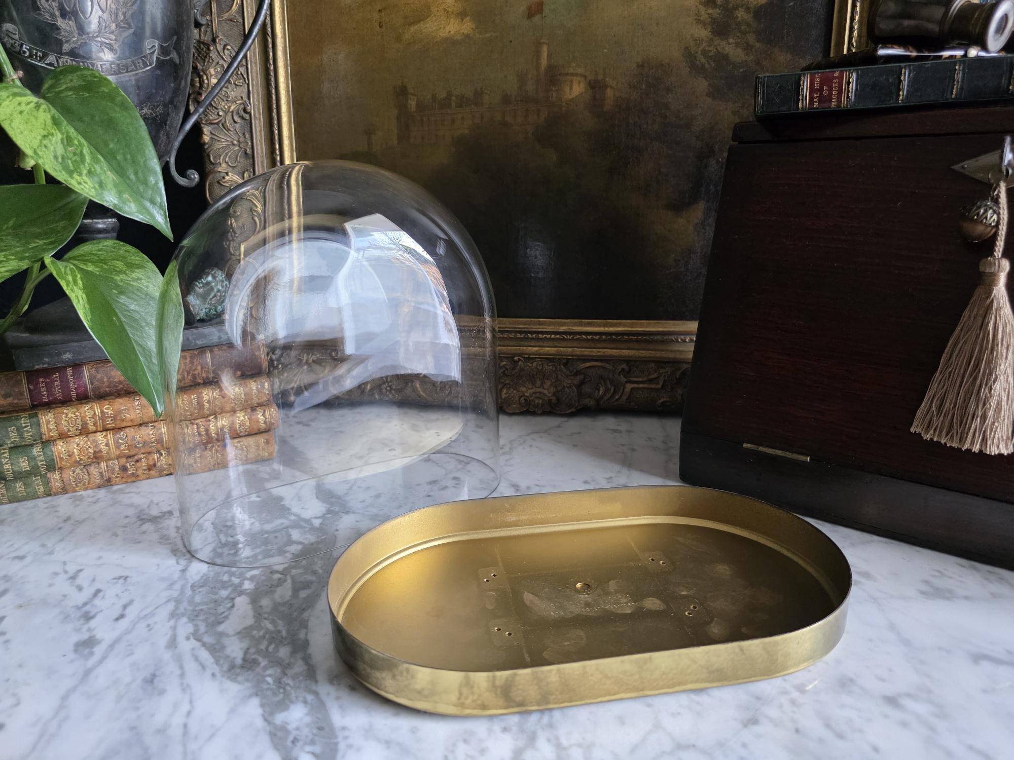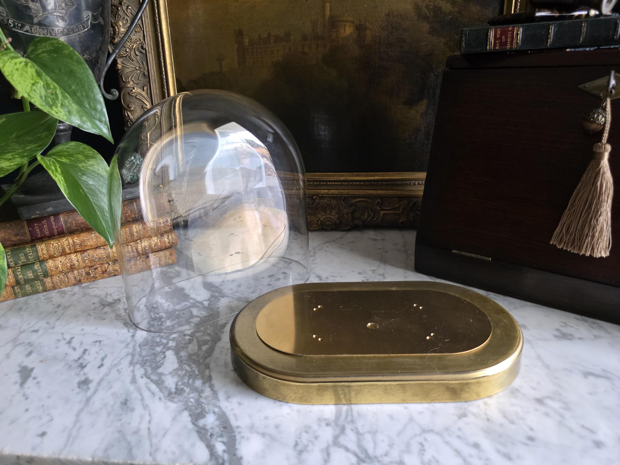 Showcase your most treasured curiosities, small sculptures, or favorite vintage finds with this authentic mid-century glass and brass cloche dome. Originally crafted in West Germany by the renowned clockmakers Kieninger & Obergfell, this piece was initially designed to house and protect a delicate torsion anniversary clock. Today, it serves as a stunning, repurposed display case perfect for taxidermy, miniature art, or delicate botanicals. The crystal-clear glass dome rests securely on a beautifully patinated oval brass base, which still features the small pre-drilled holes from its original clockwork mounting—a subtle, authentic nod to its horological history. Whether you are curating a Victorian-inspired cabinet of curiosities or simply looking to elevate a special decor piece on your mantel, this versatile and elegant Kundo dome adds an instant touch of historic charm to any space.