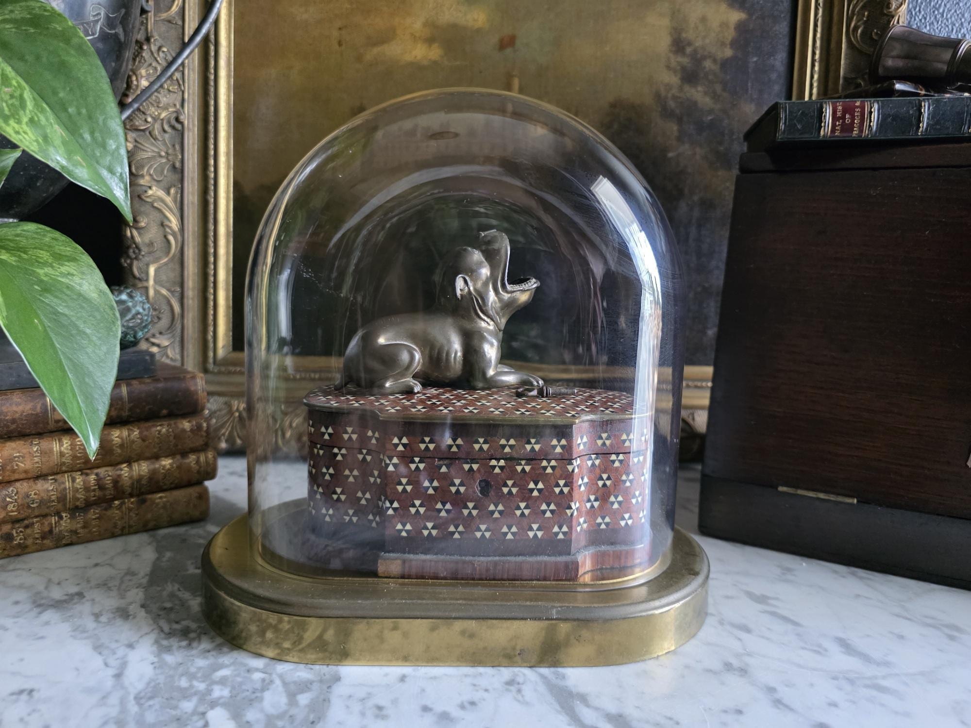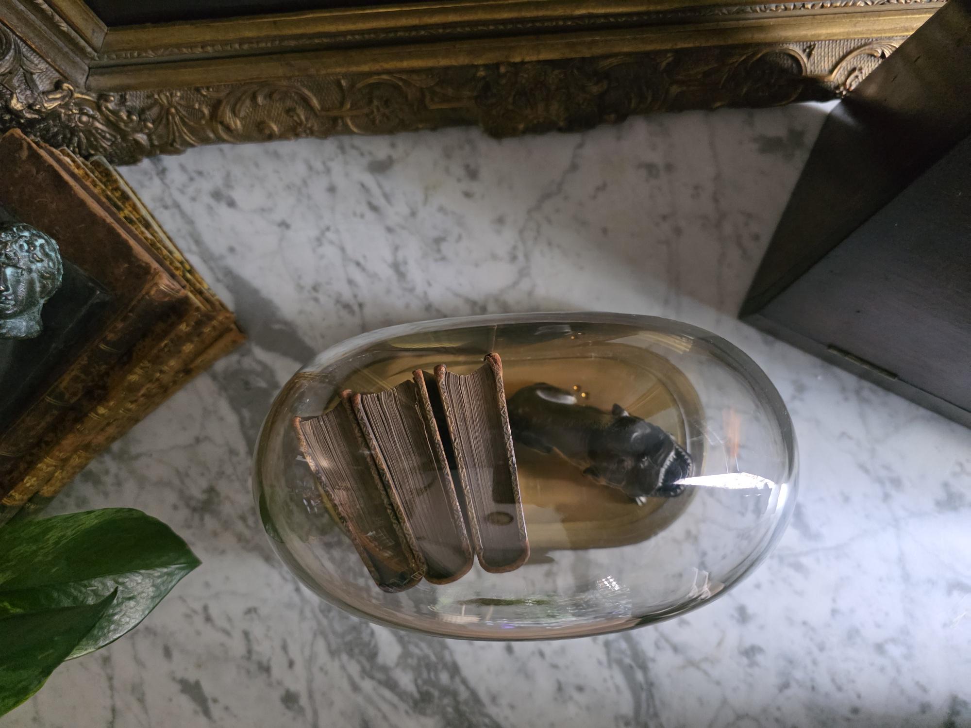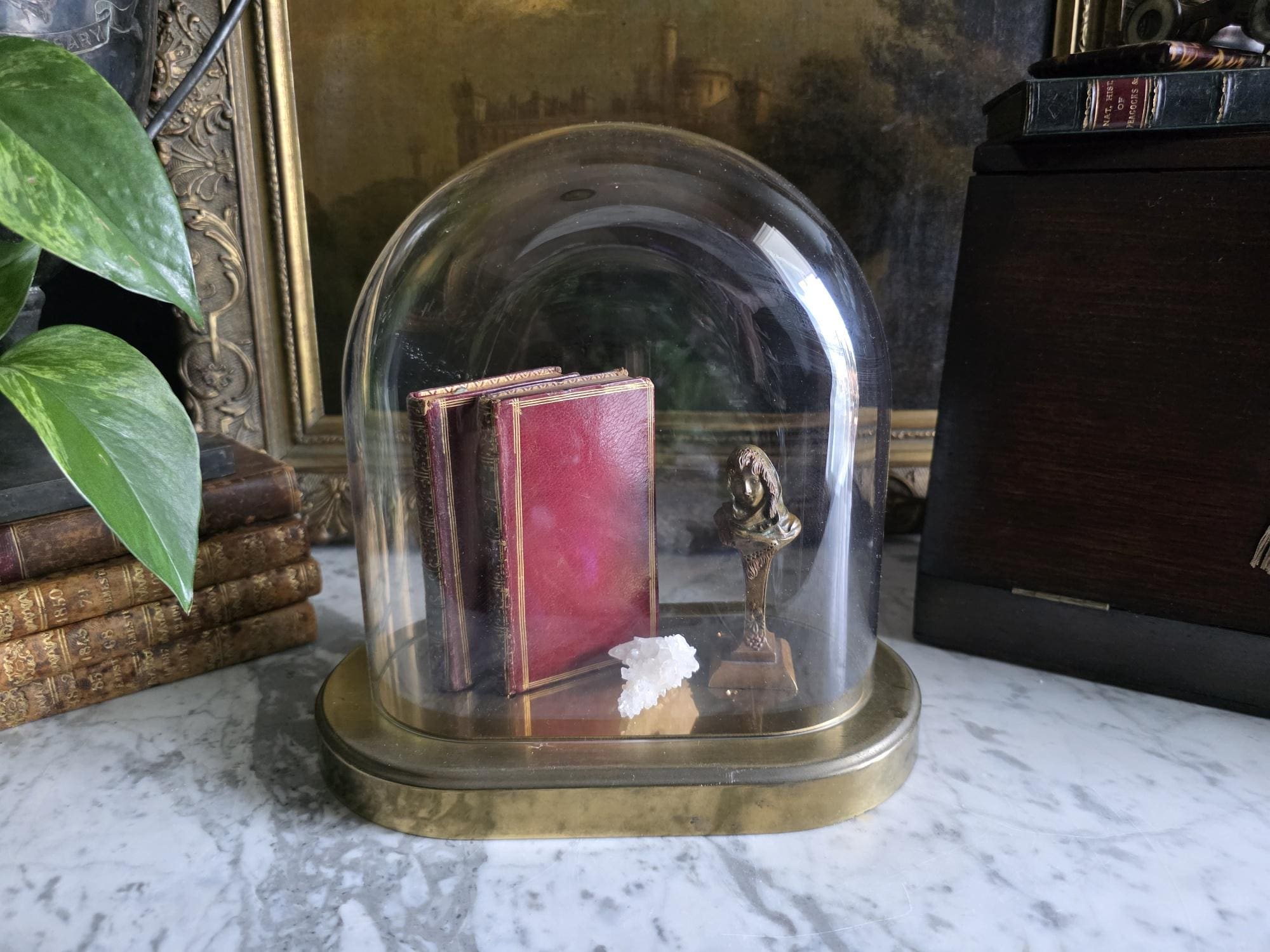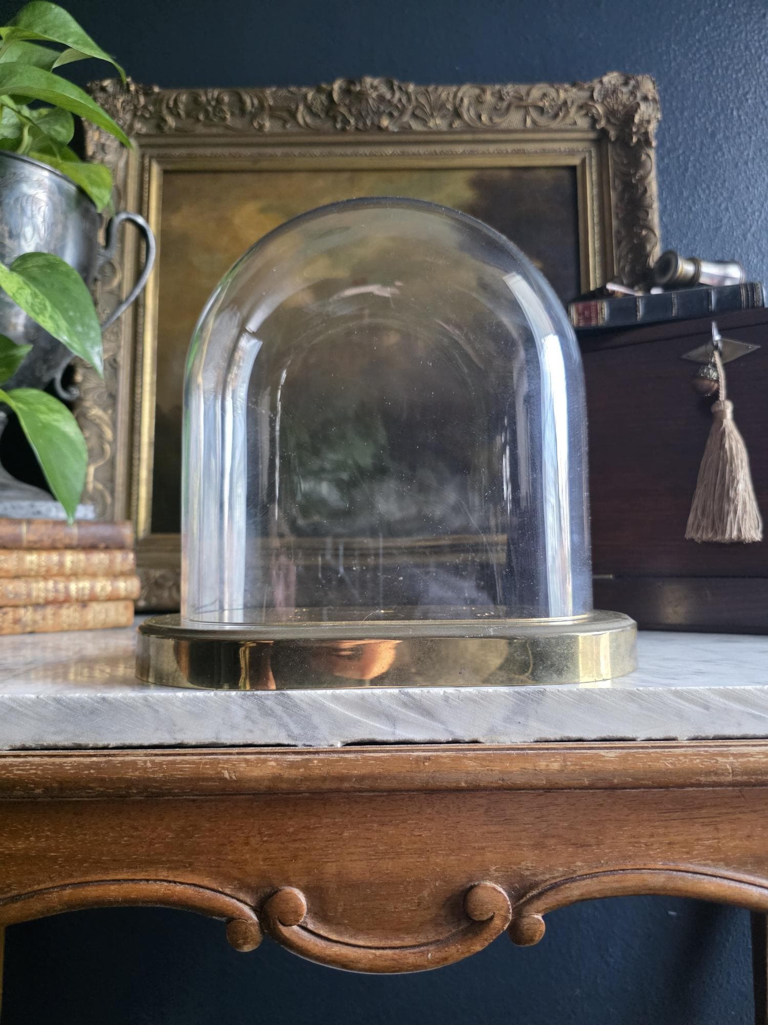 Showcase your most treasured curiosities, small sculptures, or favorite vintage finds with this authentic mid-century glass and brass cloche dome. Originally crafted in West Germany by the renowned clockmakers Kieninger & Obergfell, this piece was initially designed to house and protect a delicate torsion anniversary clock. Today, it serves as a stunning, repurposed display case perfect for taxidermy, miniature art, or delicate botanicals. The crystal-clear glass dome rests securely on a beautifully patinated oval brass base, which still features the small pre-drilled holes from its original clockwork mounting—a subtle, authentic nod to its horological history. Whether you are curating a Victorian-inspired cabinet of curiosities or simply looking to elevate a special decor piece on your mantel, this versatile and elegant Kundo dome adds an instant touch of historic charm to any space.