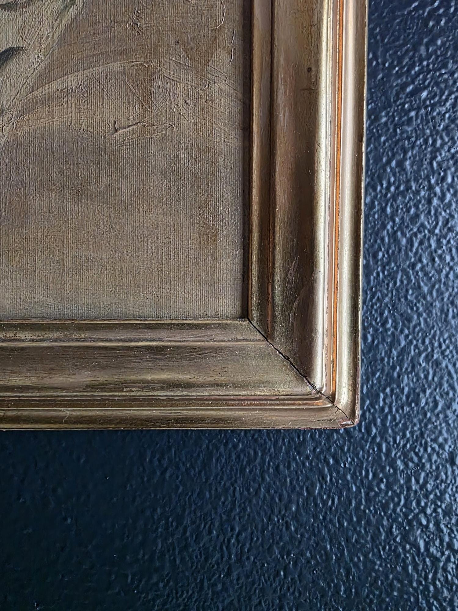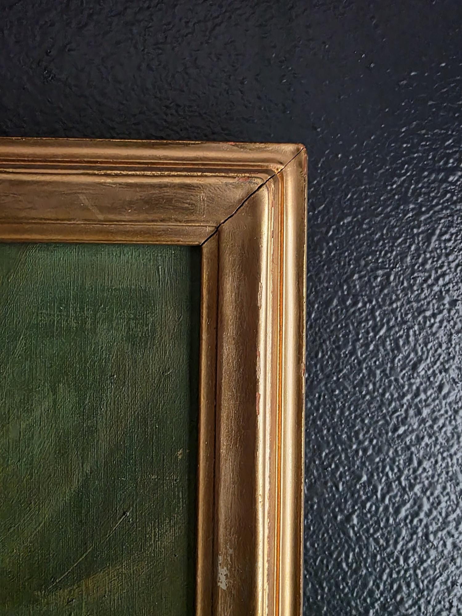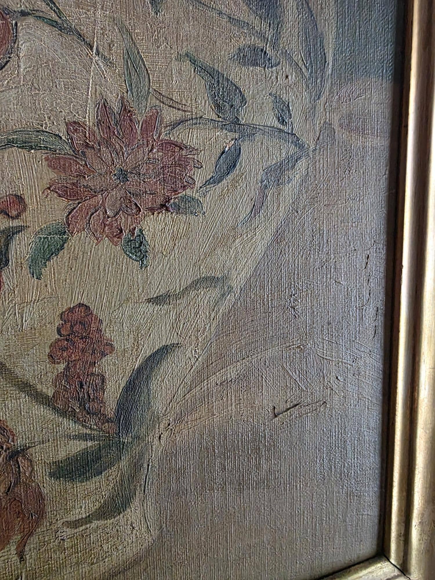 The surface of the painting bare substantial signs of age (see listing photos). In addition to the paintings surface age, there is a slight bow in two places at the bottom of the painting (see listing photos). The wear and slight bowing do not detract from the beauty or integrity of this piece.