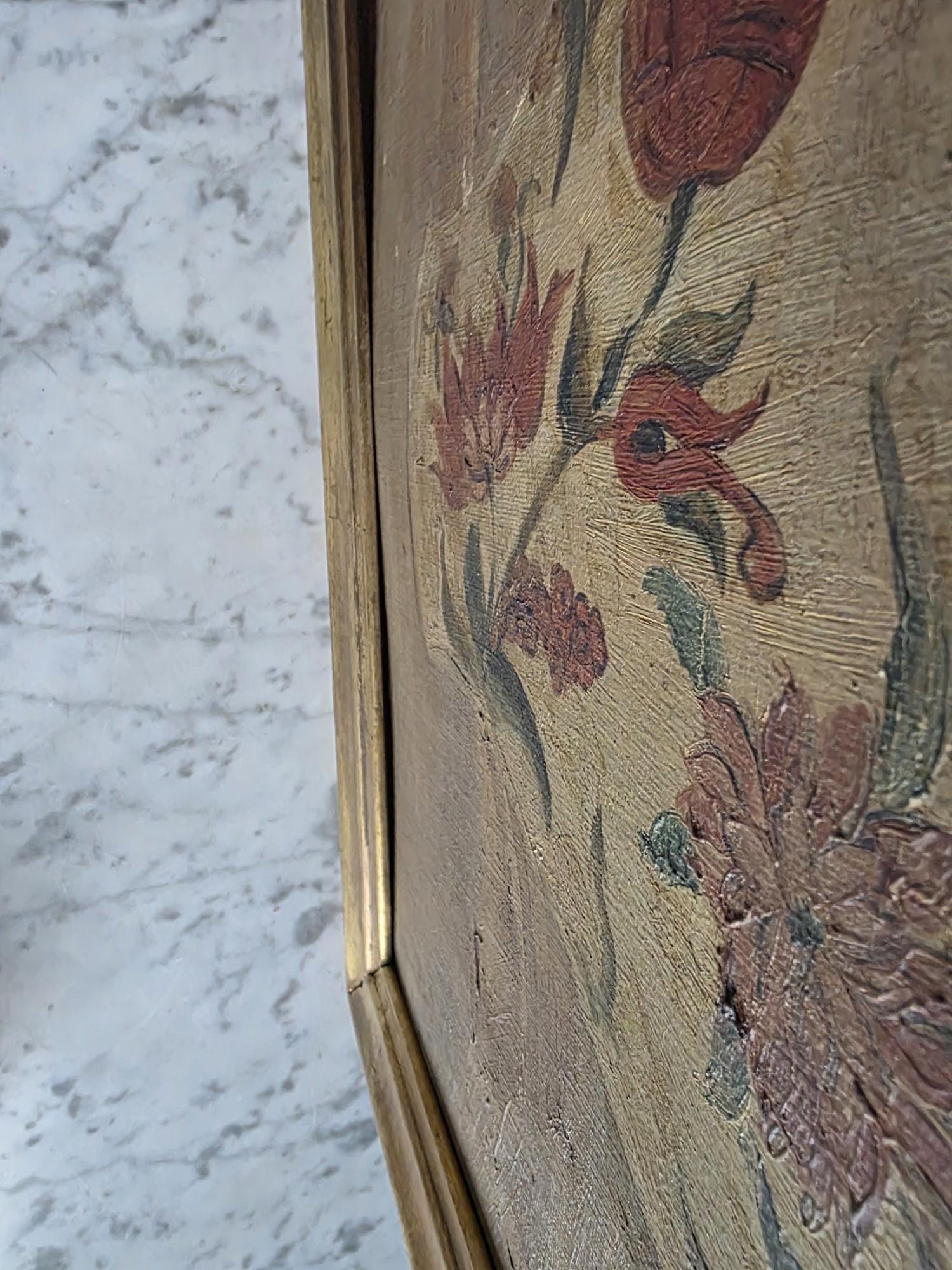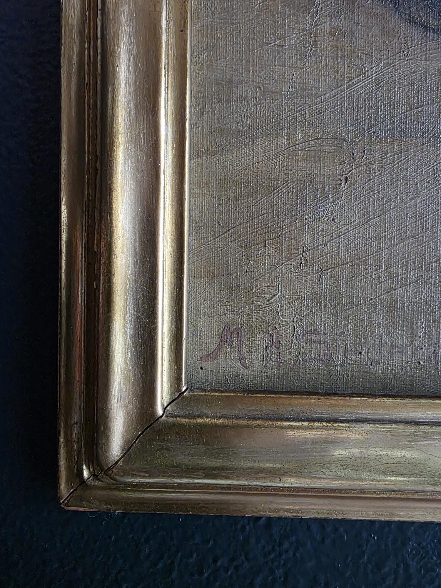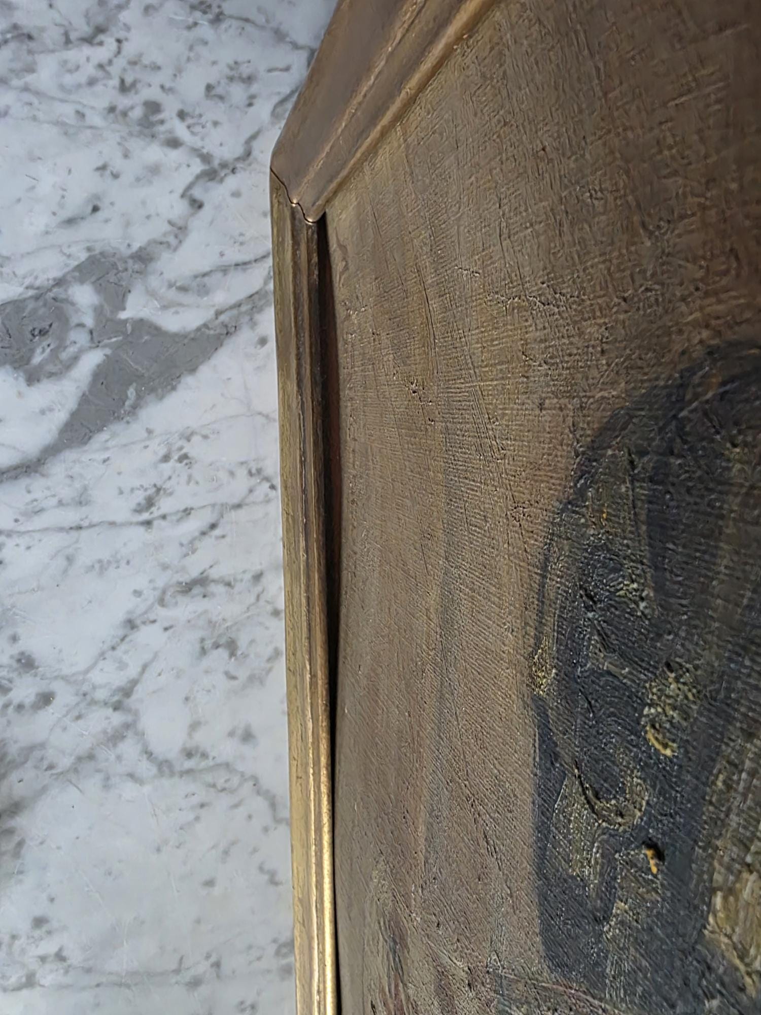 The surface of the painting bare substantial signs of age (see listing photos). In addition to the paintings surface age, there is a slight bow in two places at the bottom of the painting (see listing photos). The wear and slight bowing do not detract from the beauty or integrity of this piece.