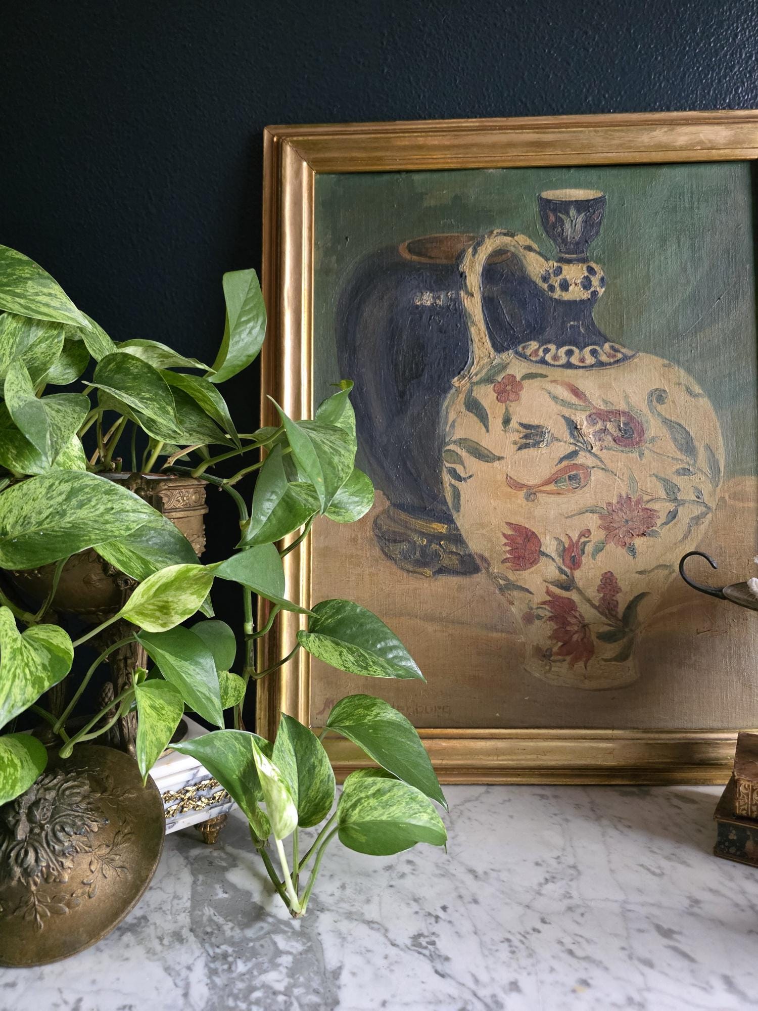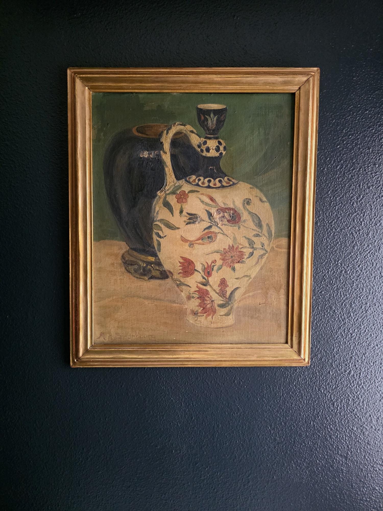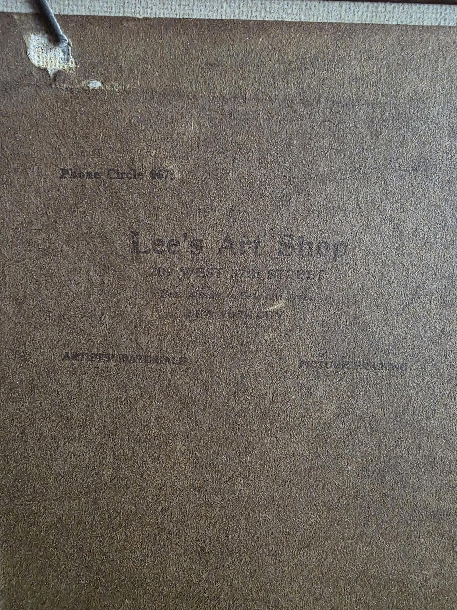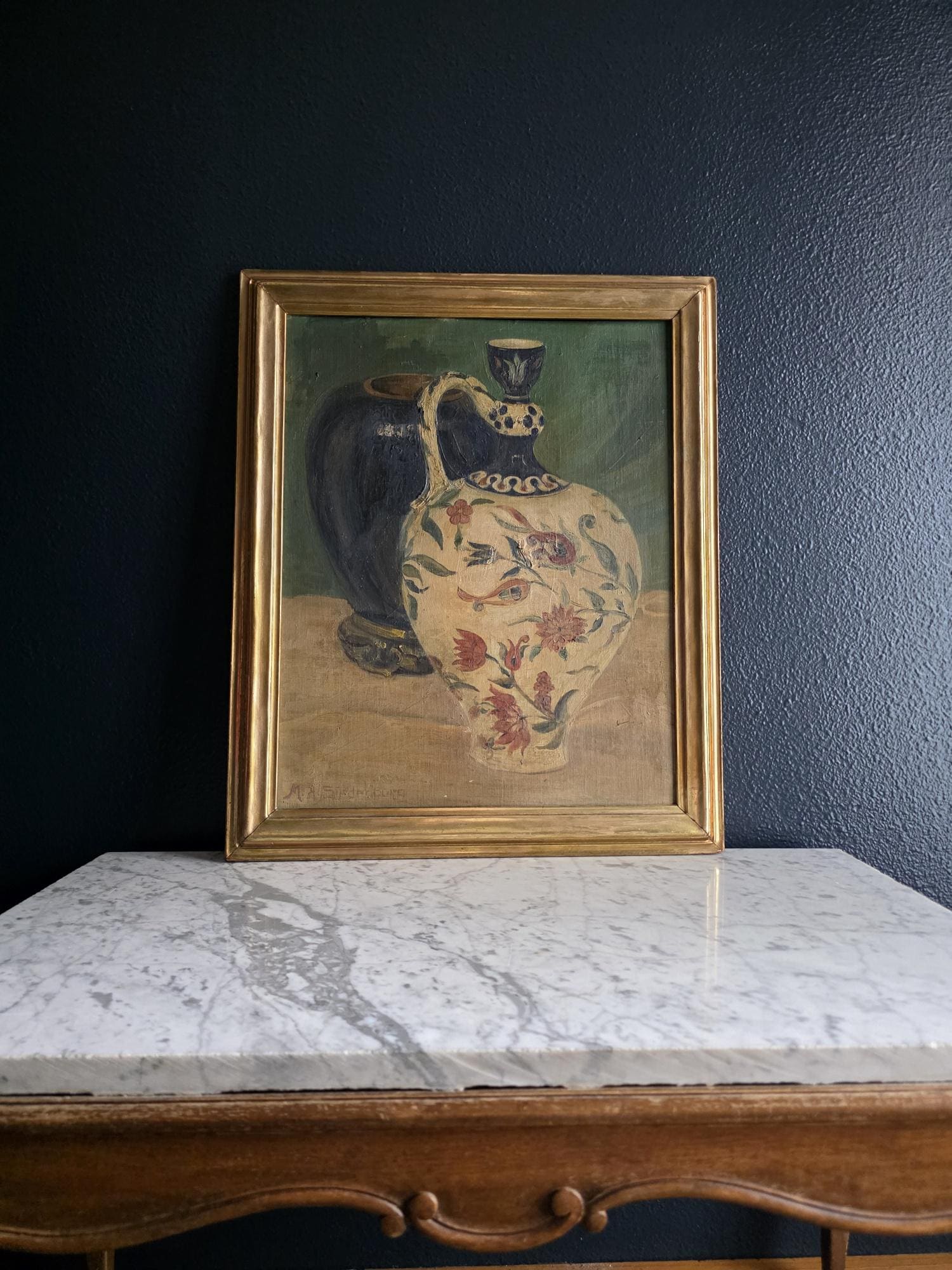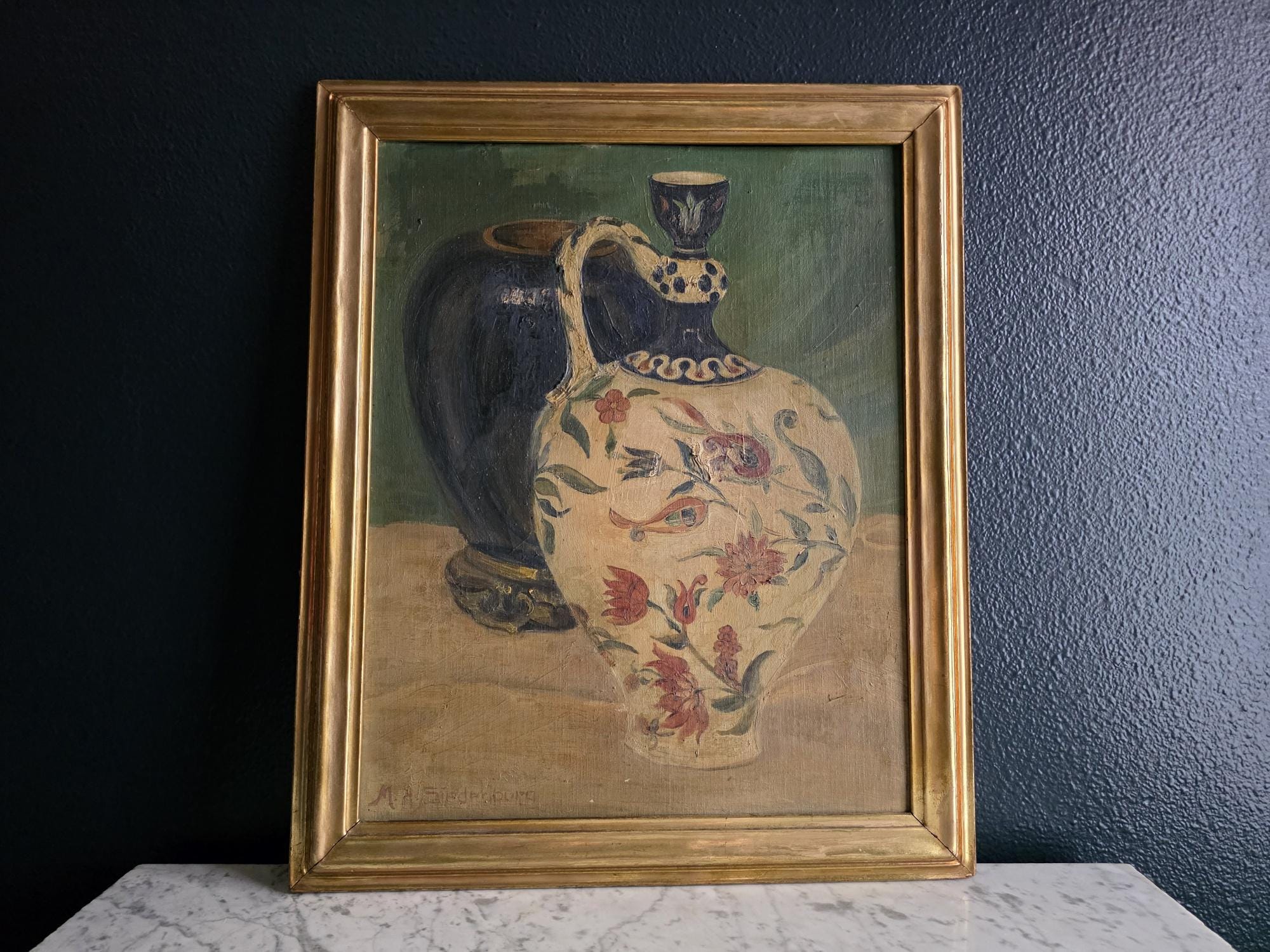Add a touch of mid-century New York history to your collection with this captivating still life oil painting on canvas board. The composition features a striking study of two ceramic vessels—a dark, subtly textured jug standing behind a beautifully detailed pitcher adorned with scrolling floral patterns, rich red blooms, and an ornate handle. Signed "M.A. Siedenburg" in the lower left corner, the piece showcases expressive brushwork and a masterful use of earthy greens, warm tans, and deep contrasting shadows. While extensive research into auction records and artist databases does not yield a widely recorded or formally listed painter by the name M.A. Siedenburg, the artwork's confident execution points to a highly skilled, perhaps locally recognized mid-century talent. Adding significantly to the piece's provenance and historical intrigue is an original framer's label on the reverse from the legendary, now-closed Lee's Art Shop at 209 West 57th Street in New York City. The label features a vintage "CIrcle 7" telephone exchange number, firmly dating the framing to the mid-20th century and suggesting the artist was part of the vibrant NYC art scene of the era. Housed in a classic gold-toned wood frame that exhibits natural, age-appropriate wear and a beautifully distressed patina, this painting is a wonderful, character-filled find for lovers of vintage still life art and authentic local history alike.