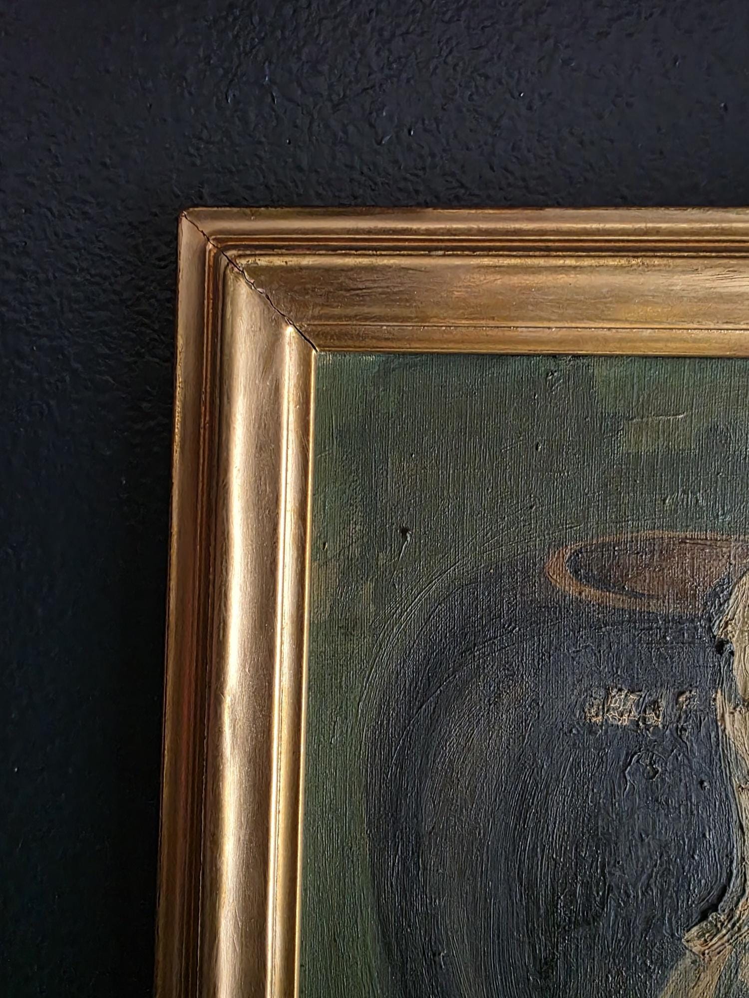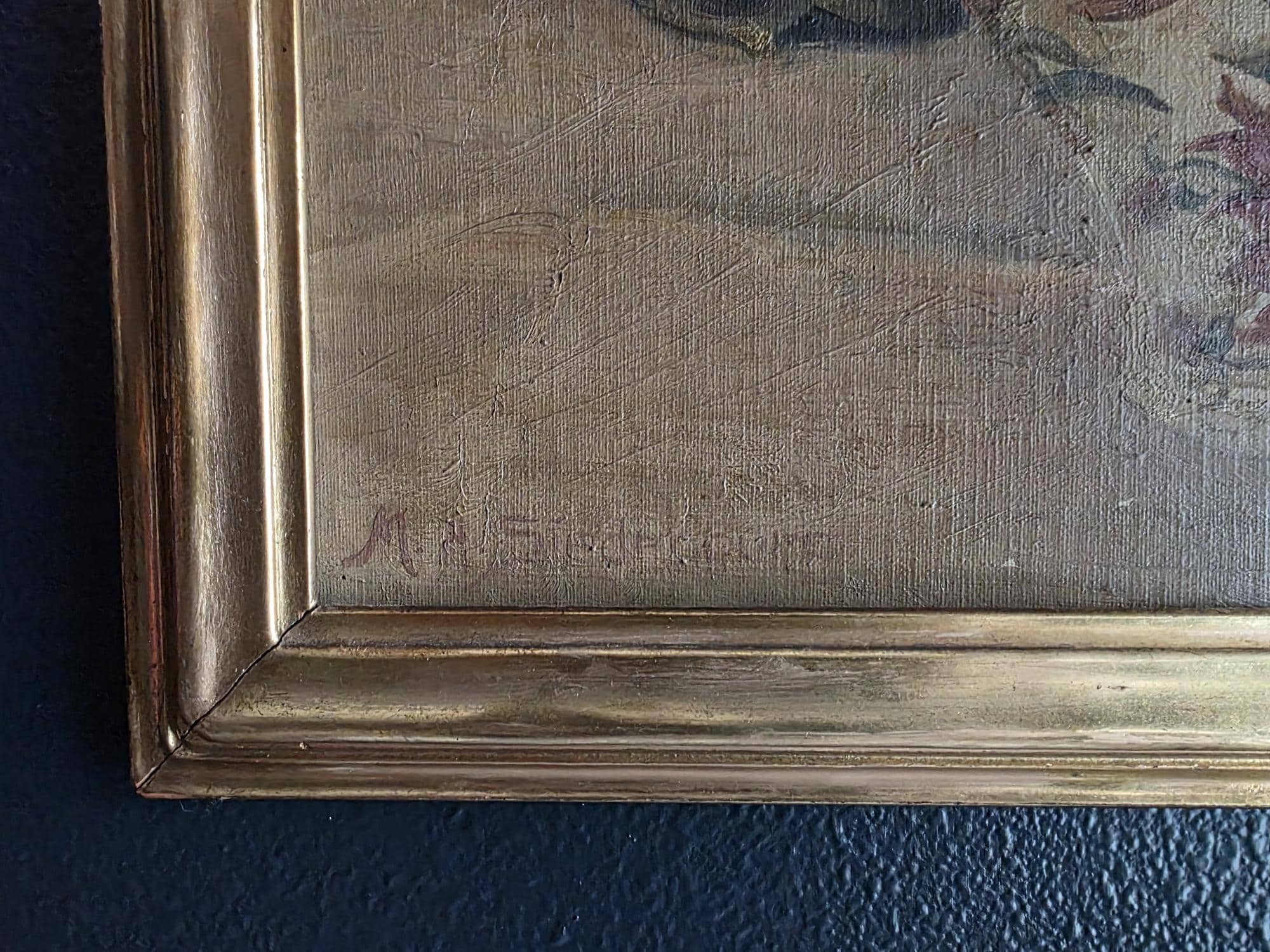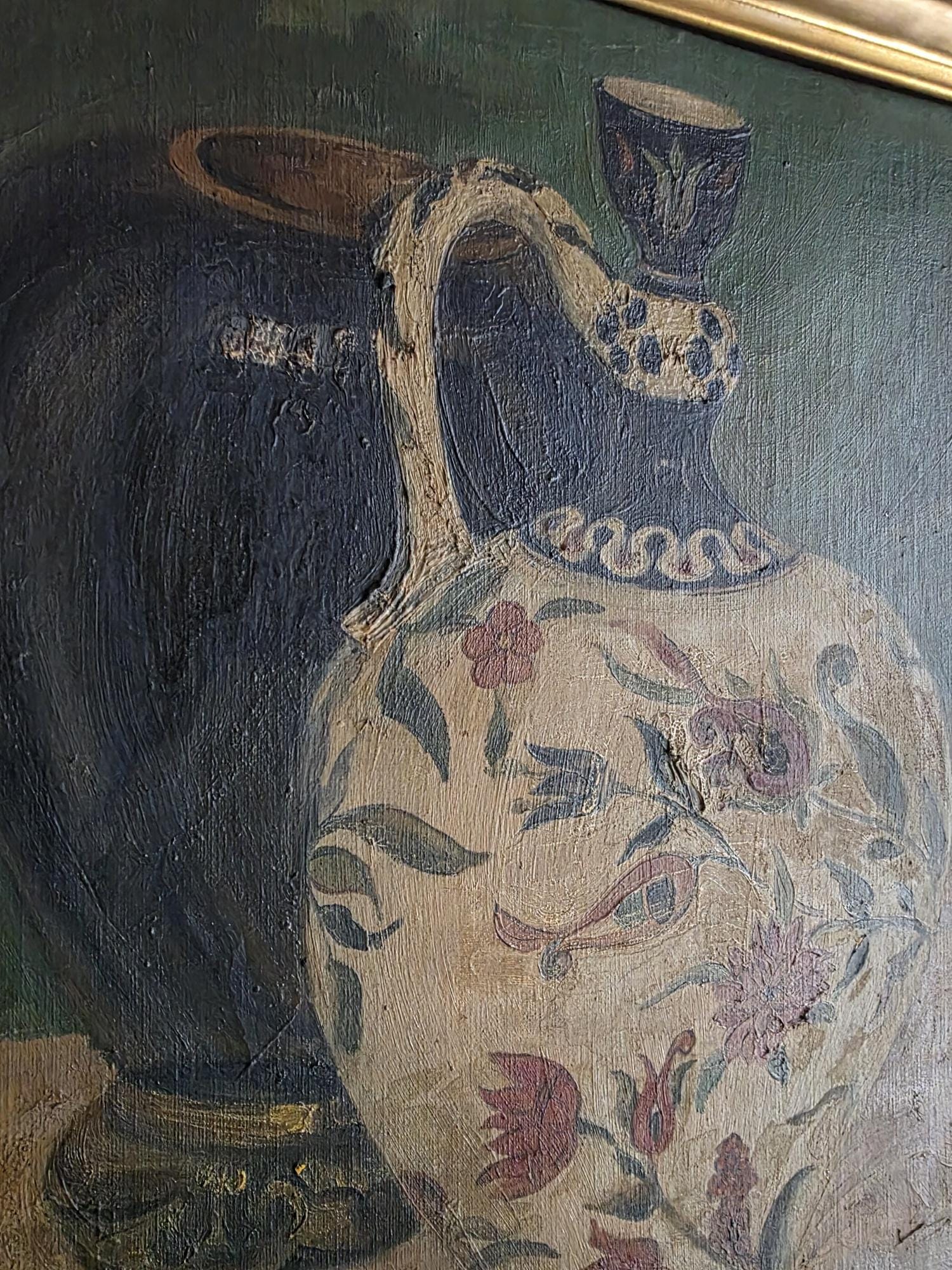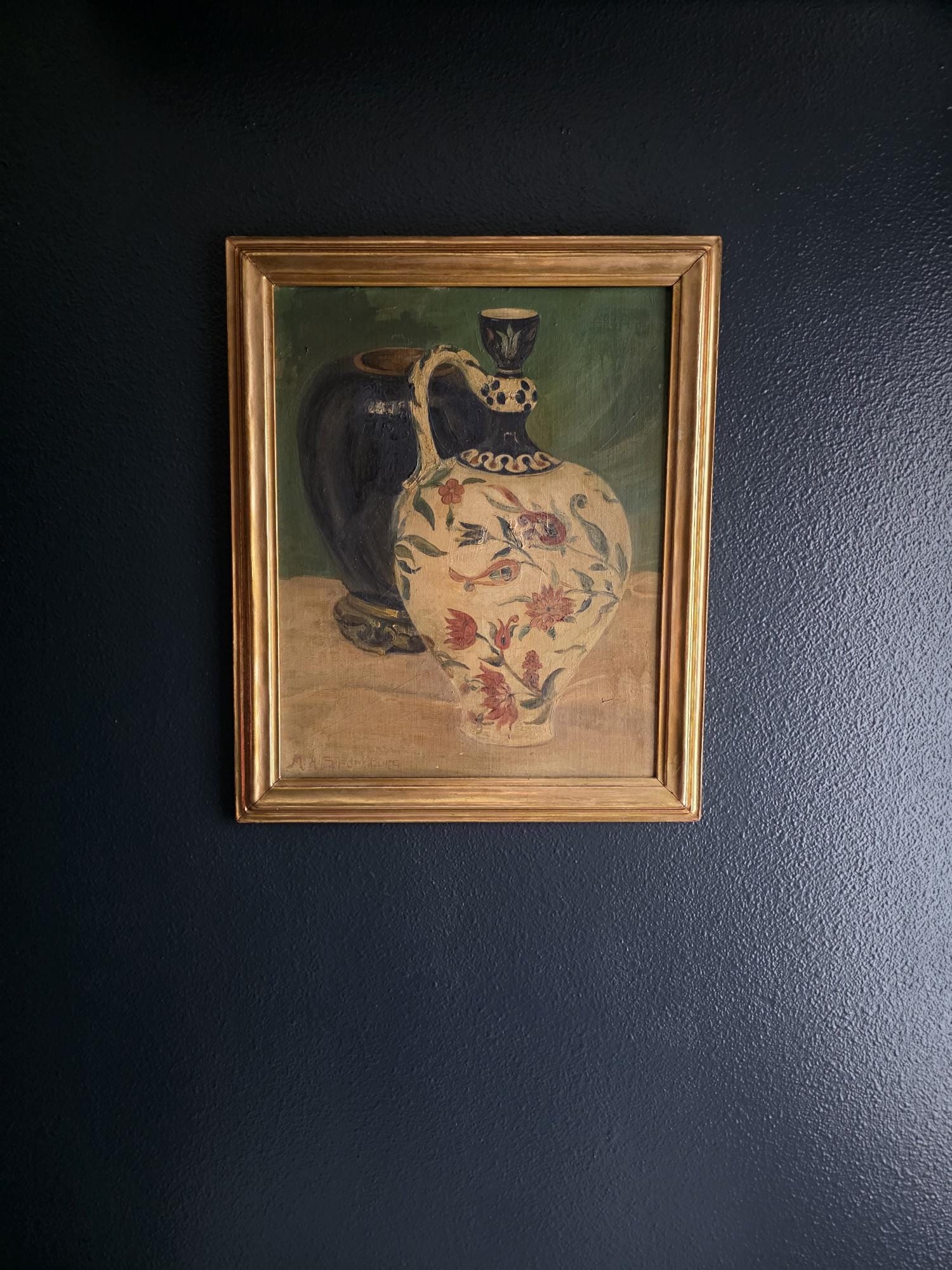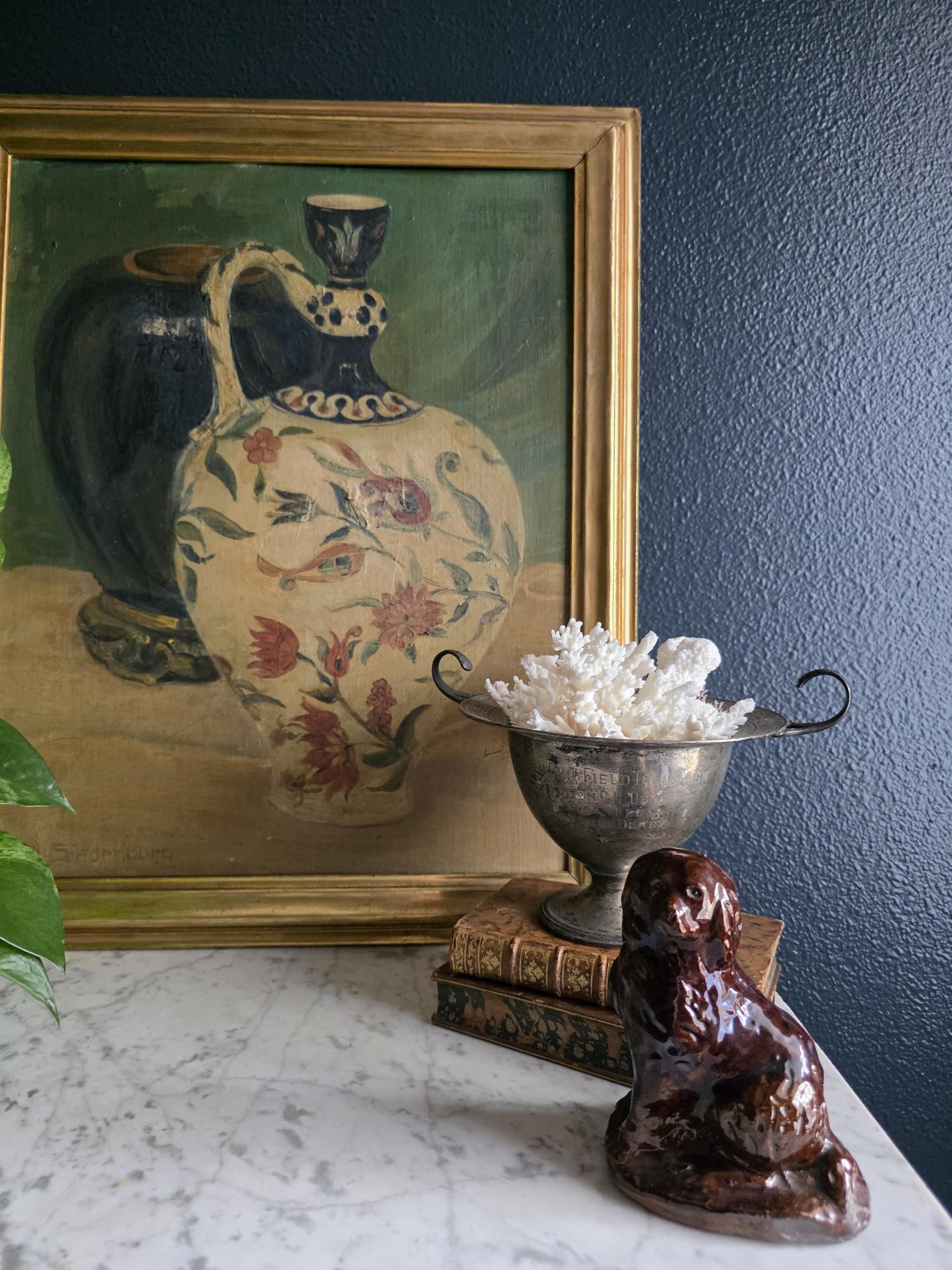 Add a touch of mid-century New York history to your collection with this captivating still life oil painting on canvas board. The composition features a striking study of two ceramic vessels—a dark, subtly textured jug standing behind a beautifully detailed pitcher adorned with scrolling floral patterns, rich red blooms, and an ornate handle. Signed "M.A. Siedenburg" in the lower left corner, the piece showcases expressive brushwork and a masterful use of earthy greens, warm tans, and deep contrasting shadows. While extensive research into auction records and artist databases does not yield a widely recorded or formally listed painter by the name M.A. Siedenburg, the artwork's confident execution points to a highly skilled, perhaps locally recognized mid-century talent. Adding significantly to the piece's provenance and historical intrigue is an original framer's label on the reverse from the legendary, now-closed Lee's Art Shop at 209 West 57th Street in New York City. The label features a vintage "CIrcle 7" telephone exchange number, firmly dating the framing to the mid-20th century and suggesting the artist was part of the vibrant NYC art scene of the era. Housed in a classic gold-toned wood frame that exhibits natural, age-appropriate wear and a beautifully distressed patina, this painting is a wonderful, character-filled find for lovers of vintage still life art and authentic local history alike.
