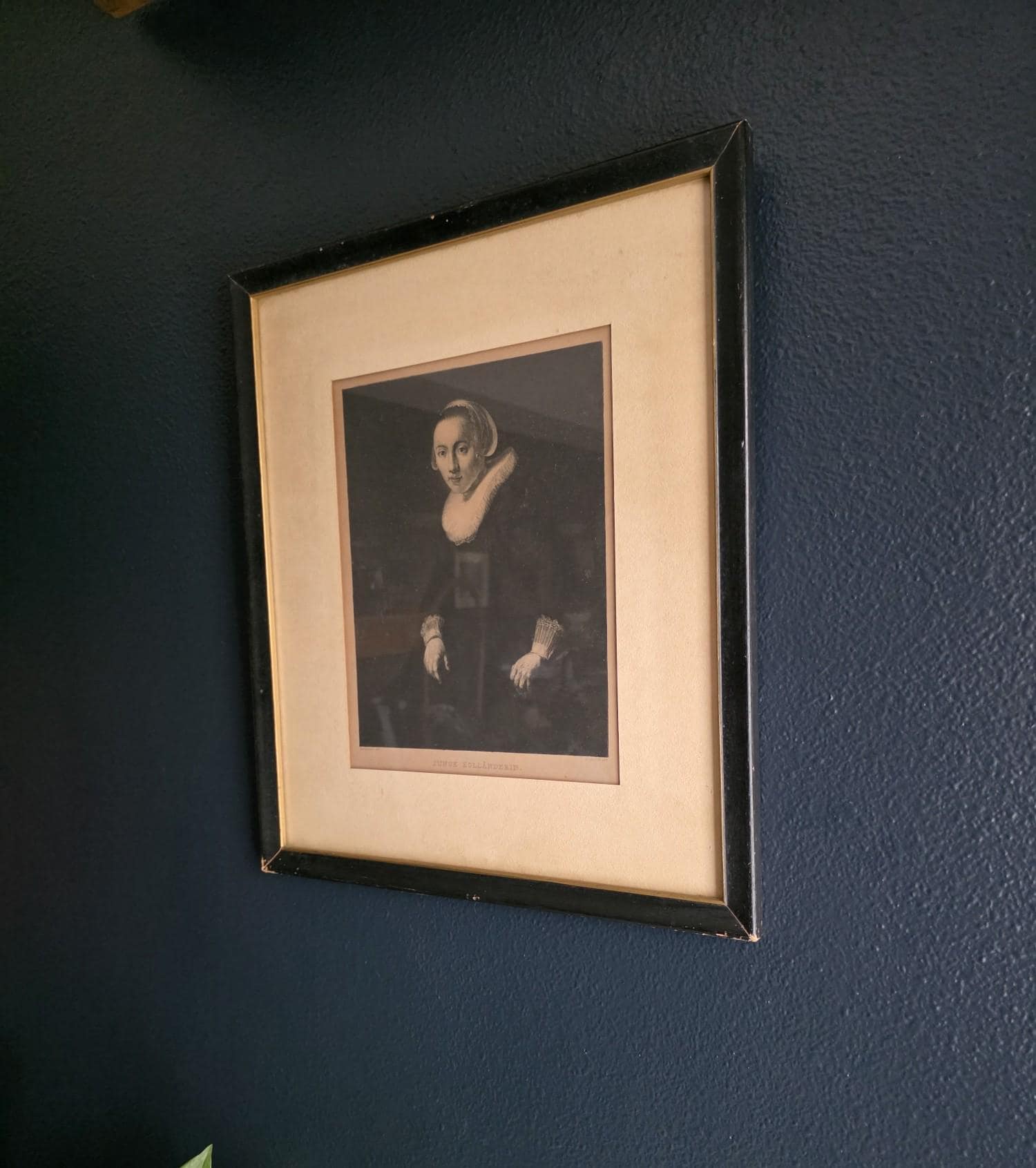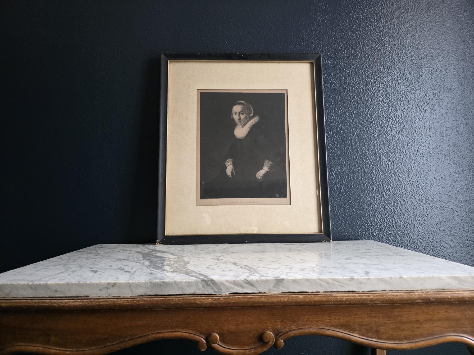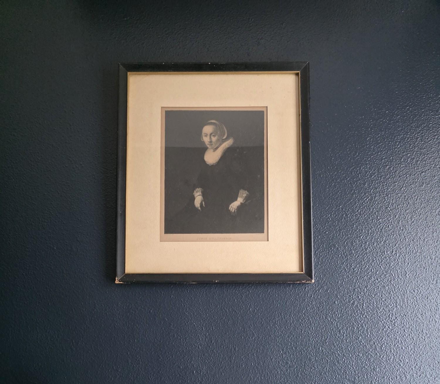 Add a touch of profound Dutch Golden Age elegance to your space with this striking antique engraving of a "Junge Holländerin" (Young Dutch Woman). Rendered with incredible depth and moody contrast, this piece was meticulously engraved by the notable German printmaker Wilhelm Hecht, based on an original masterwork painted by Rembrandt (indicated by the traditional "Rembrandt Pxt" and "W. Hecht Sct" markings in the lower margins). Dating to the late 19th or early 20th century (circa 1870–1910) during Hecht's active studio years, this museum-quality piece hails from a golden era of printmaking, crafted for art enthusiasts before the rise of modern mass-produced photography. The portrait beautifully captures the solemn grace of its subject, highlighting the crisp, intricate details of her traditional ruffled collar and cap against a rich, dark background. Housed in a handsome vintage black frame with a subtle gold-toned inner lip, this piece perfectly embodies the "Dark Academia" and moody eclectic aesthetics. It remains in wonderful antique condition, proudly displaying its history through age-appropriate wear, including a minor, unobtrusive nick on the gold inner trim. The reverse of the frame serves as a fantastic testament to its genuine age, retaining its deeply aged, brittle dust cover and the original rusted brad nails. Ready to hang and deeply atmospheric, this beautifully preserved antique engraving is the perfect addition to a curated gallery wall, library, or historic portrait collection.