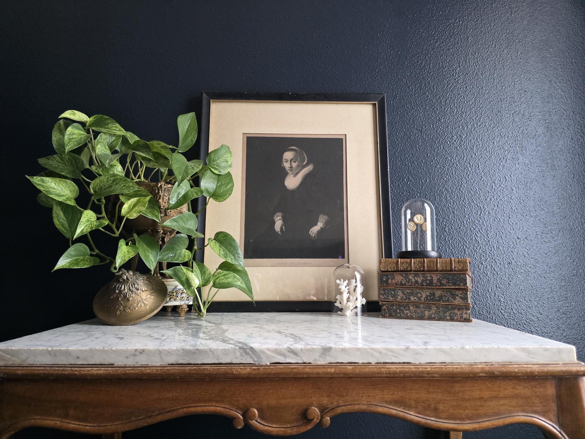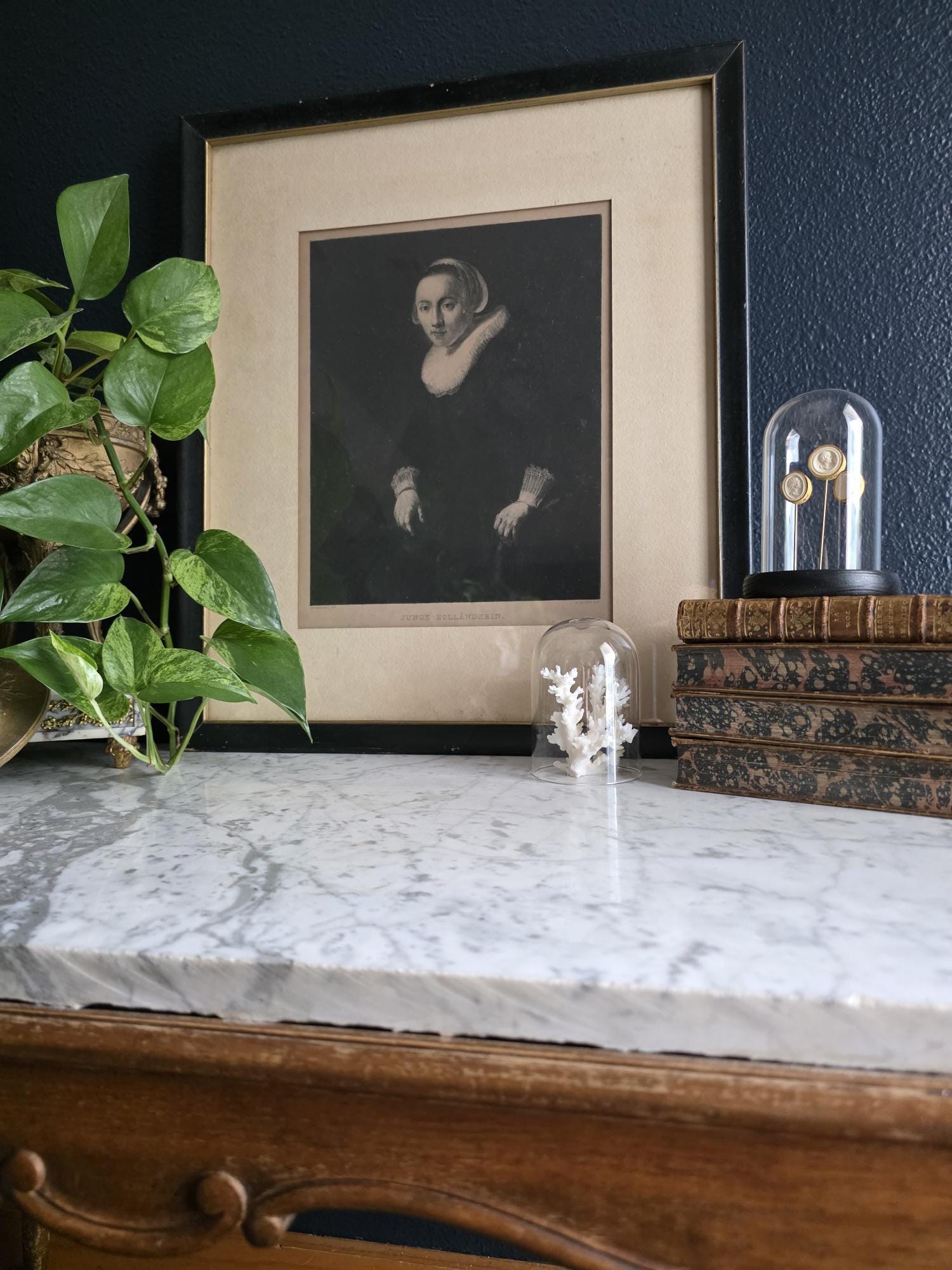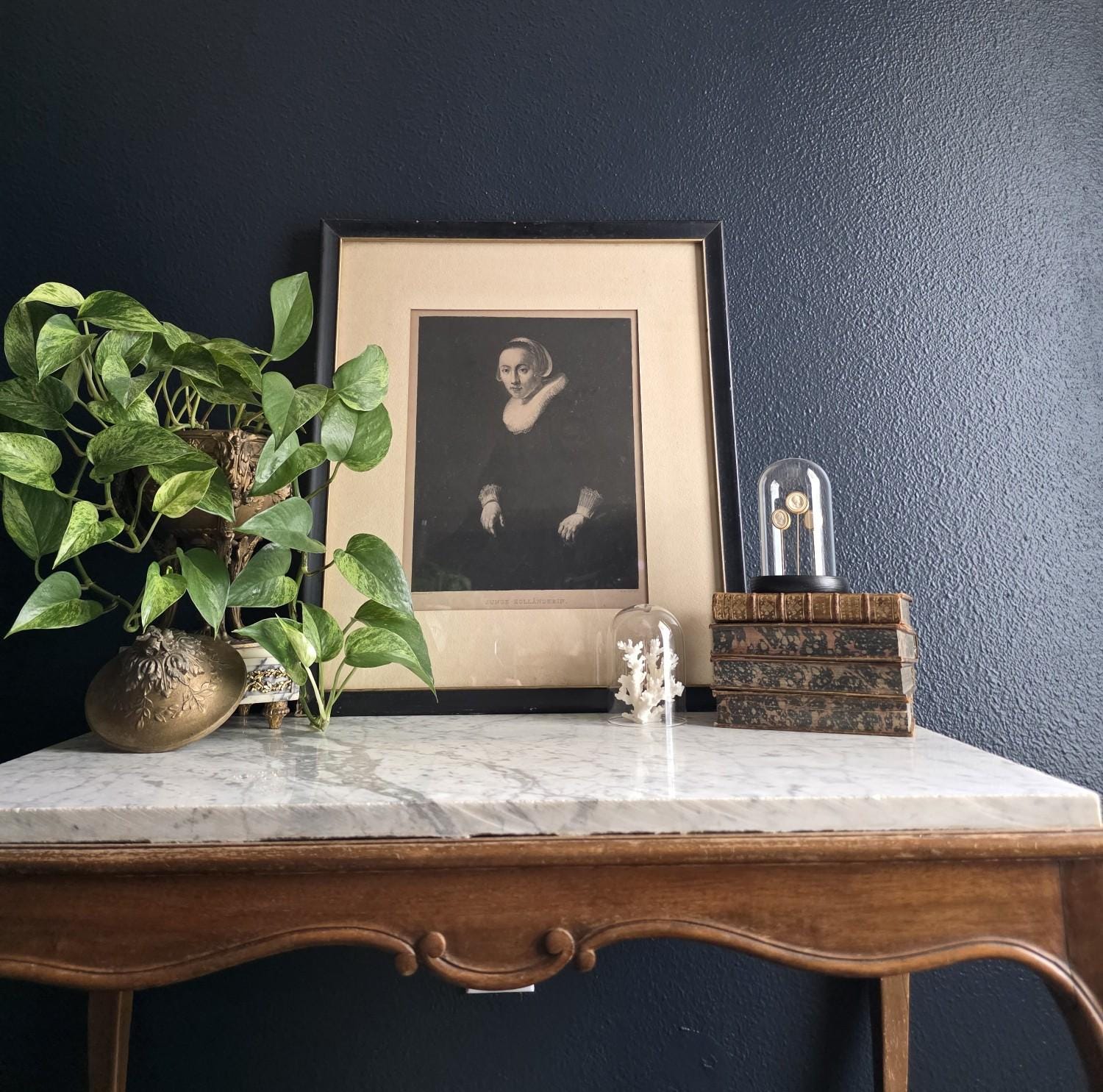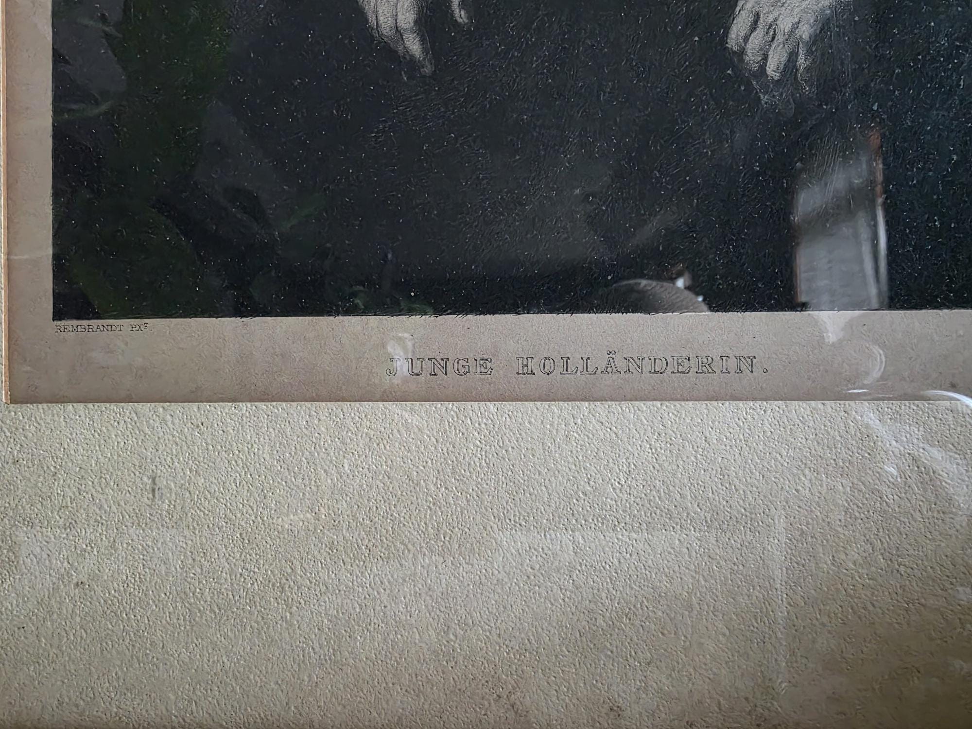 Add a touch of profound Dutch Golden Age elegance to your space with this striking antique engraving of a "Junge Holländerin" (Young Dutch Woman). Rendered with incredible depth and moody contrast, this piece was meticulously engraved by the notable German printmaker Wilhelm Hecht, based on an original masterwork painted by Rembrandt (indicated by the traditional "Rembrandt Pxt" and "W. Hecht Sct" markings in the lower margins). Dating to the late 19th or early 20th century (circa 1870–1910) during Hecht's active studio years, this museum-quality piece hails from a golden era of printmaking, crafted for art enthusiasts before the rise of modern mass-produced photography. The portrait beautifully captures the solemn grace of its subject, highlighting the crisp, intricate details of her traditional ruffled collar and cap against a rich, dark background. Housed in a handsome vintage black frame with a subtle gold-toned inner lip, this piece perfectly embodies the "Dark Academia" and moody eclectic aesthetics. It remains in wonderful antique condition, proudly displaying its history through age-appropriate wear, including a minor, unobtrusive nick on the gold inner trim. The reverse of the frame serves as a fantastic testament to its genuine age, retaining its deeply aged, brittle dust cover and the original rusted brad nails. Ready to hang and deeply atmospheric, this beautifully preserved antique engraving is the perfect addition to a curated gallery wall, library, or historic portrait collection.