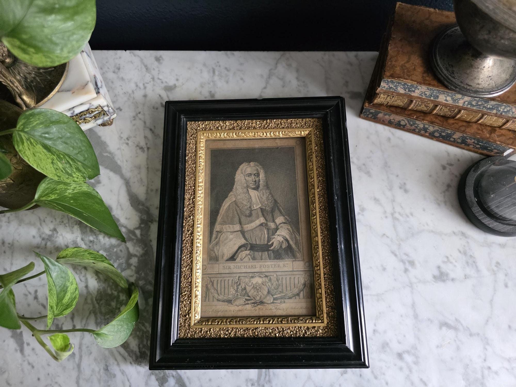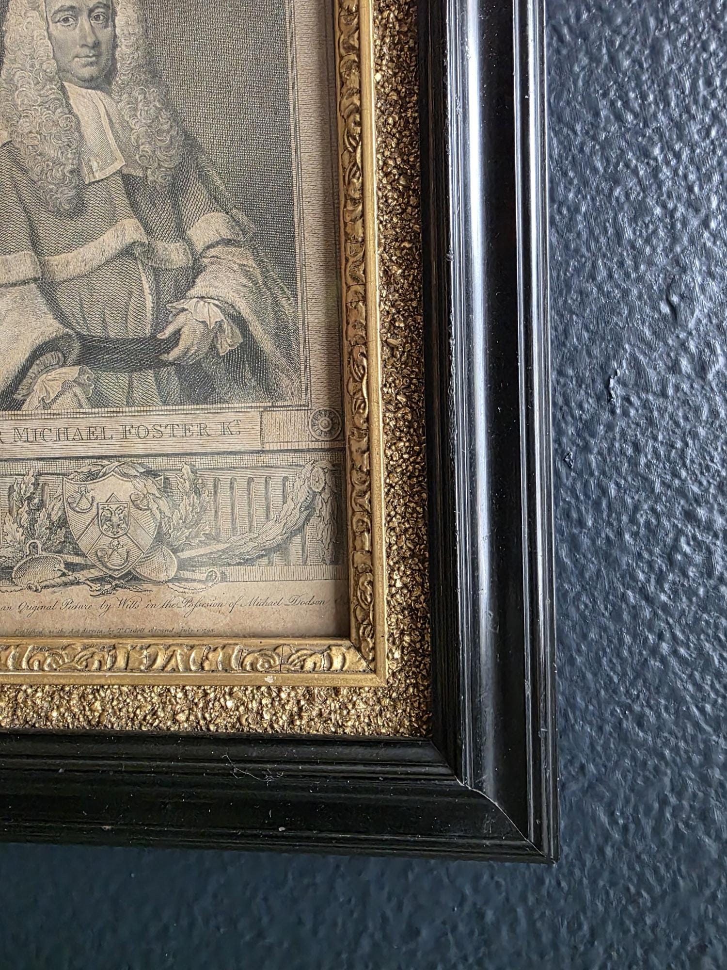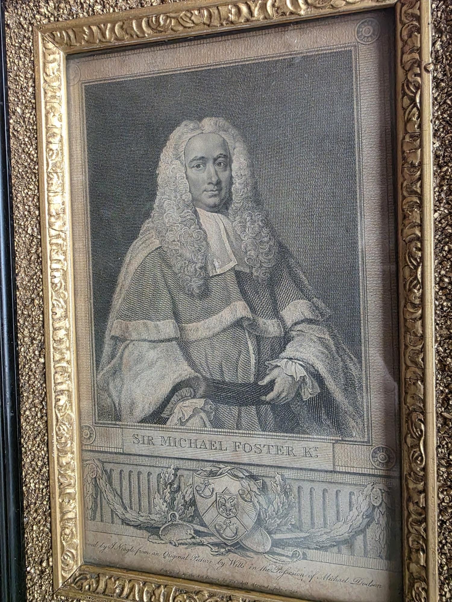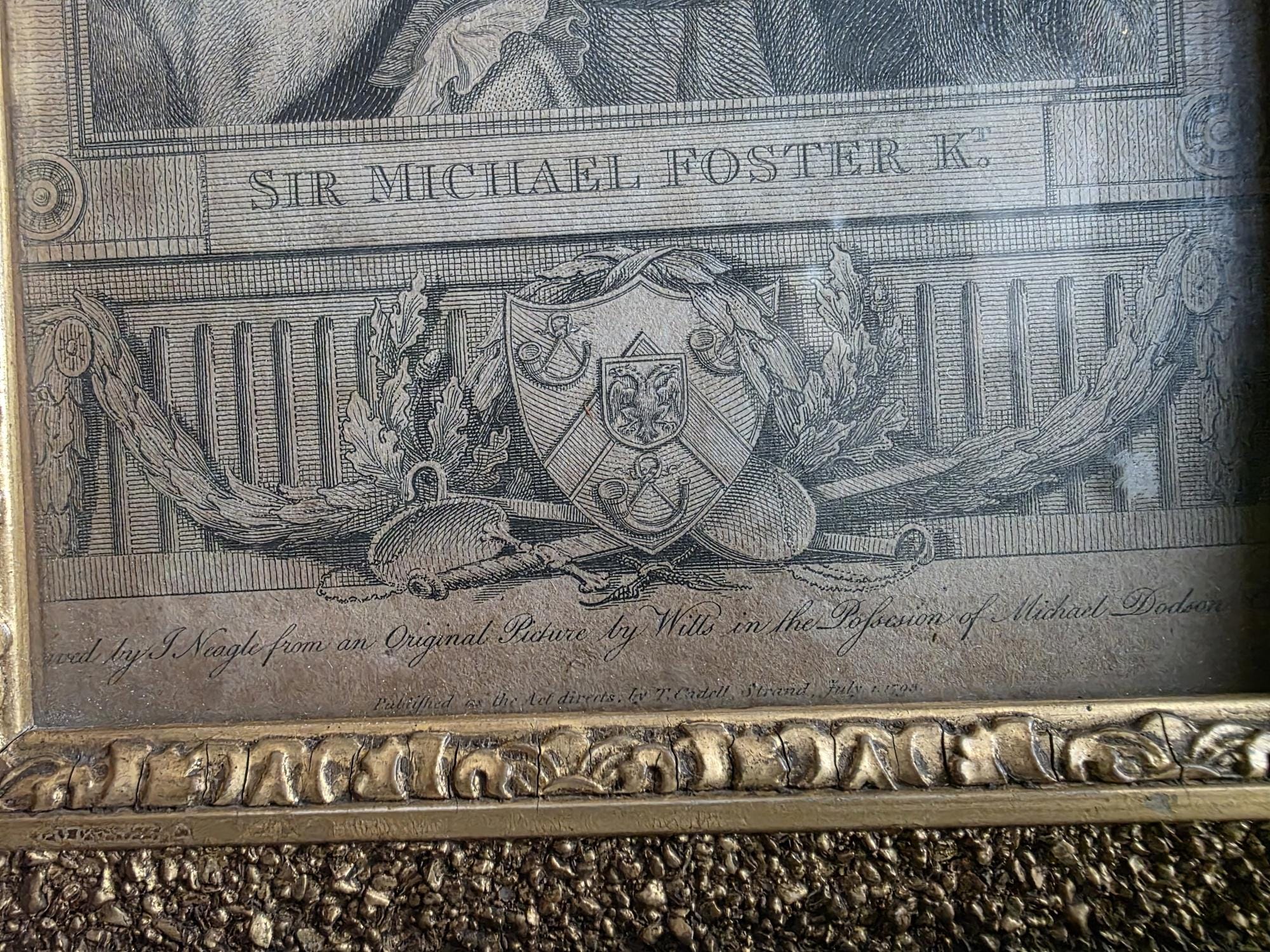 Presenting an exquisite late 18th-century framed engraving of Sir Michael Foster, Kt., a distinguished piece of British legal history officially published by T. Cadell of the Strand on July 1, 1793. Engraved by J. Neagle from an original painting by Wills, the portrait captures the eminent judge in his traditional judicial wig and robes, positioned elegantly above a finely detailed heraldic shield and banner. The engraving is handsomely housed in an antique ebonized wood frame featuring a striking, highly textured early brutalist style gilt inner border. Notably, the frame itself boasts its own rich history; the reverse bears the early trade label of "Geo Hughes, Carver, Gilder & Picture Frame Manufacturer" at 46 Pilgrim Street in Newcastle upon Tyne. This specific address dates the gallery's expert reframing of this piece precisely to the late Victorian era, between 1890 and 1899, just before Hughes expanded to a larger premises. The piece exhibits wonderful authentic age, with minor expected wear and small chips to the black finish of the frame that only enhance its historical character. Backed with a solid wood panel secured by old square brads and retaining its original twisted hanging wire, this handsome portrait is a superb, ready-to-hang find for collectors of antiquarian prints, 18th-century engravings, or legal memorabilia.