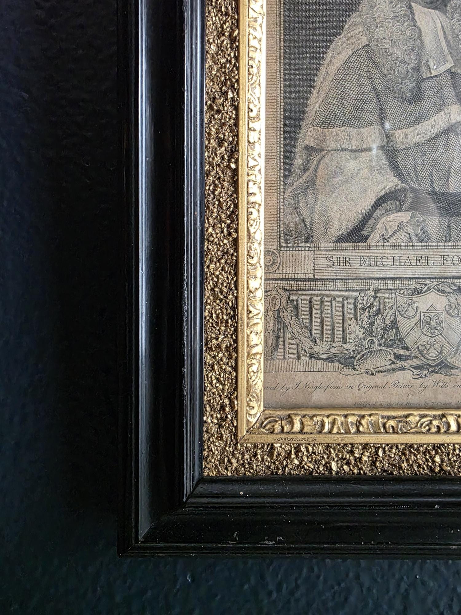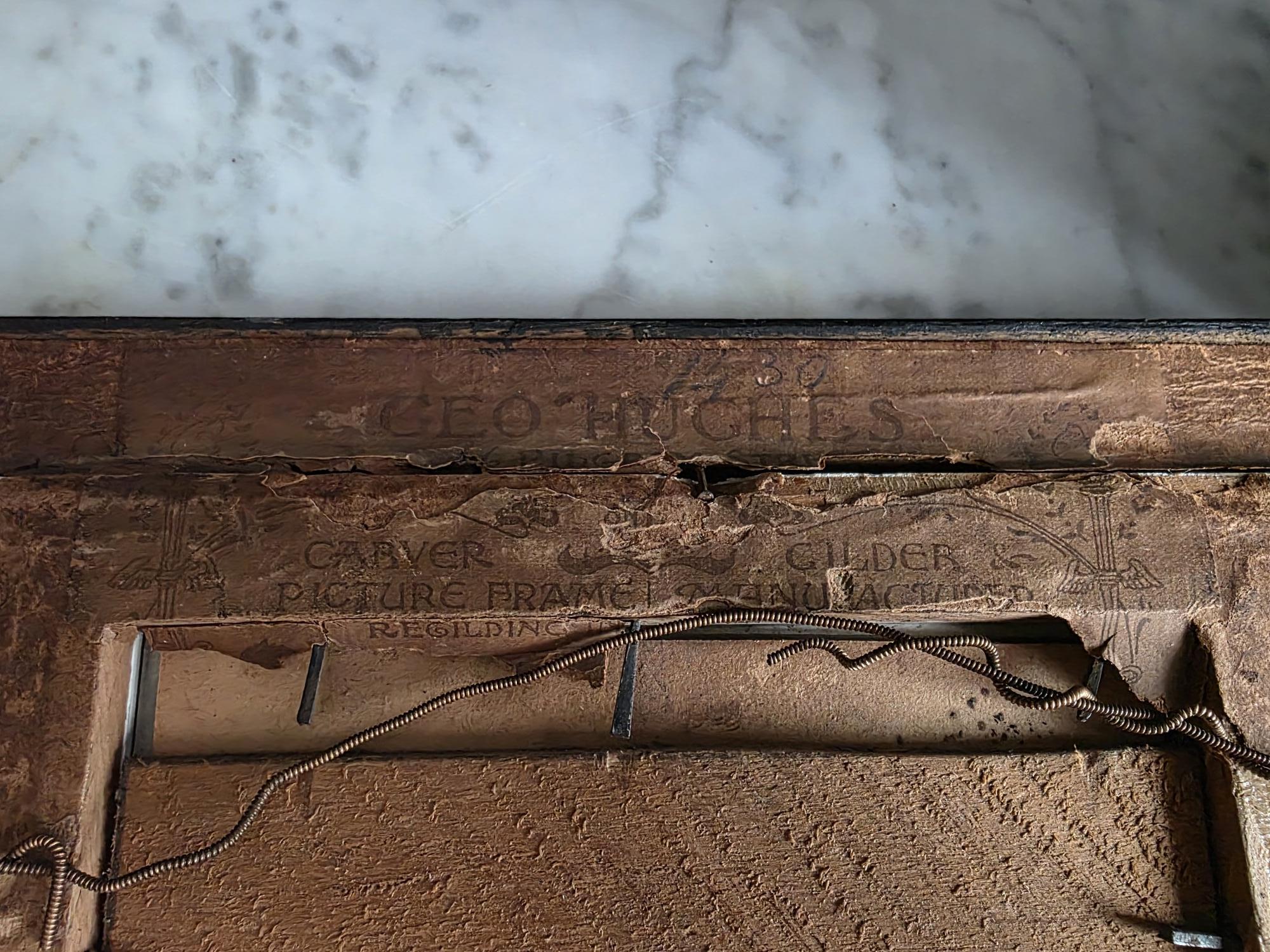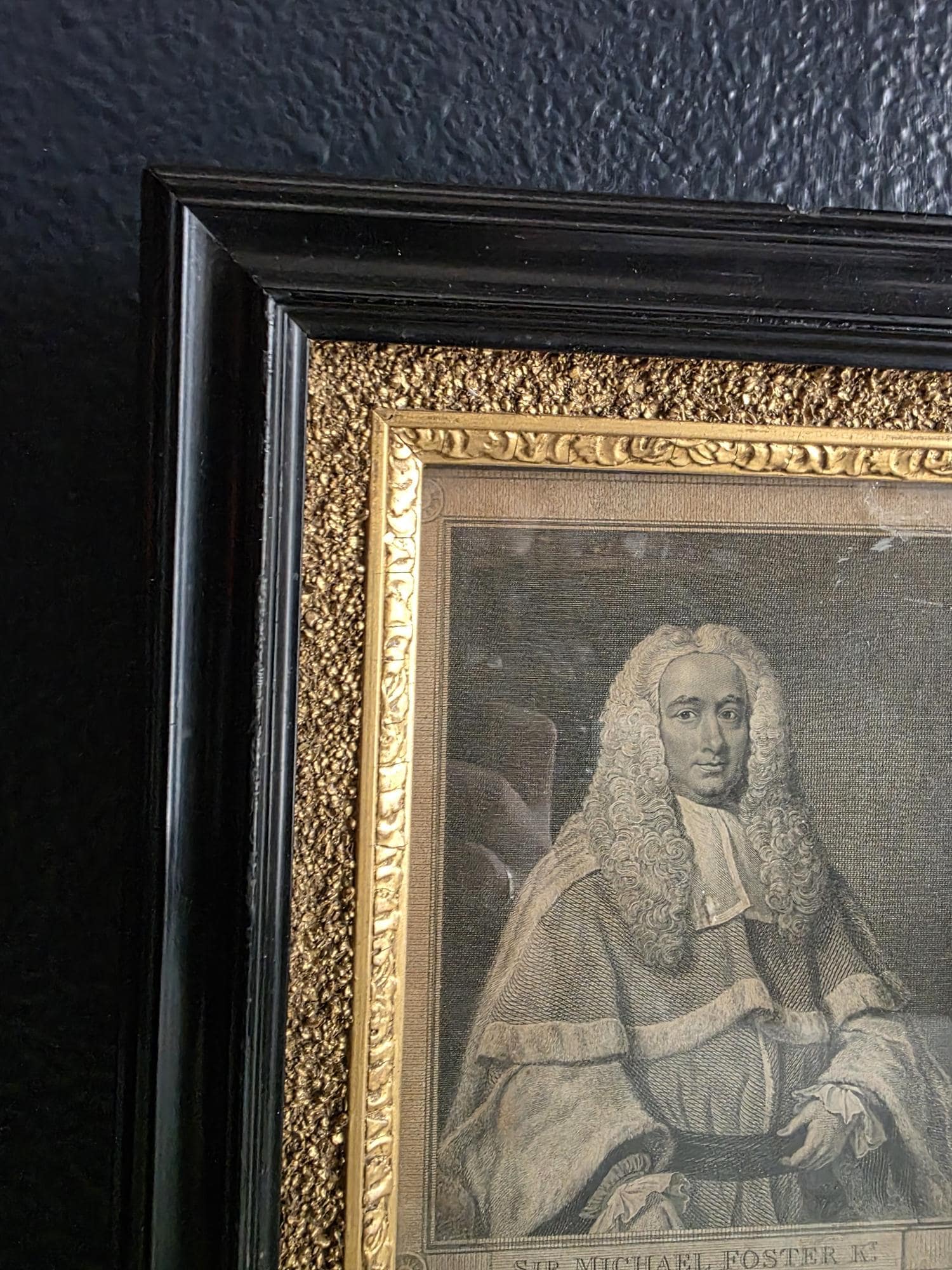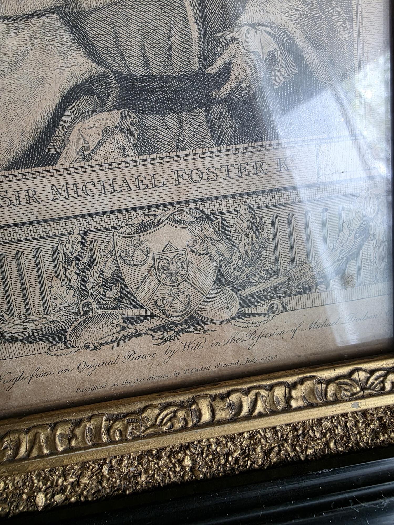 Presenting an exquisite late 18th-century framed engraving of Sir Michael Foster, Kt., a distinguished piece of British legal history officially published by T. Cadell of the Strand on July 1, 1793. Engraved by J. Neagle from an original painting by Wills, the portrait captures the eminent judge in his traditional judicial wig and robes, positioned elegantly above a finely detailed heraldic shield and banner. The engraving is handsomely housed in an antique ebonized wood frame featuring a striking, highly textured early brutalist style gilt inner border. Notably, the frame itself boasts its own rich history; the reverse bears the early trade label of "Geo Hughes, Carver, Gilder & Picture Frame Manufacturer" at 46 Pilgrim Street in Newcastle upon Tyne. This specific address dates the gallery's expert reframing of this piece precisely to the late Victorian era, between 1890 and 1899, just before Hughes expanded to a larger premises. The piece exhibits wonderful authentic age, with minor expected wear and small chips to the black finish of the frame that only enhance its historical character. Backed with a solid wood panel secured by old square brads and retaining its original twisted hanging wire, this handsome portrait is a superb, ready-to-hang find for collectors of antiquarian prints, 18th-century engravings, or legal memorabilia.