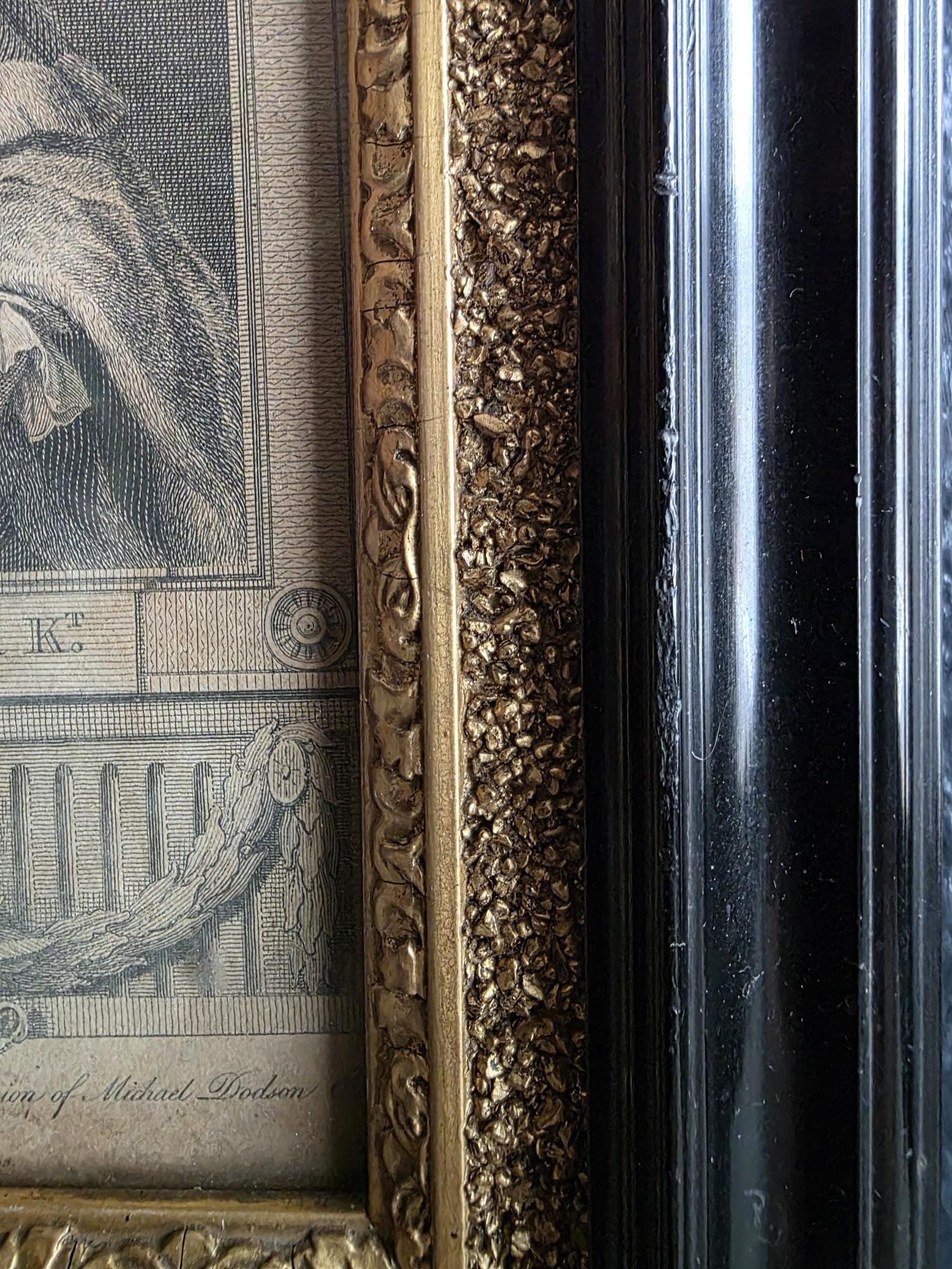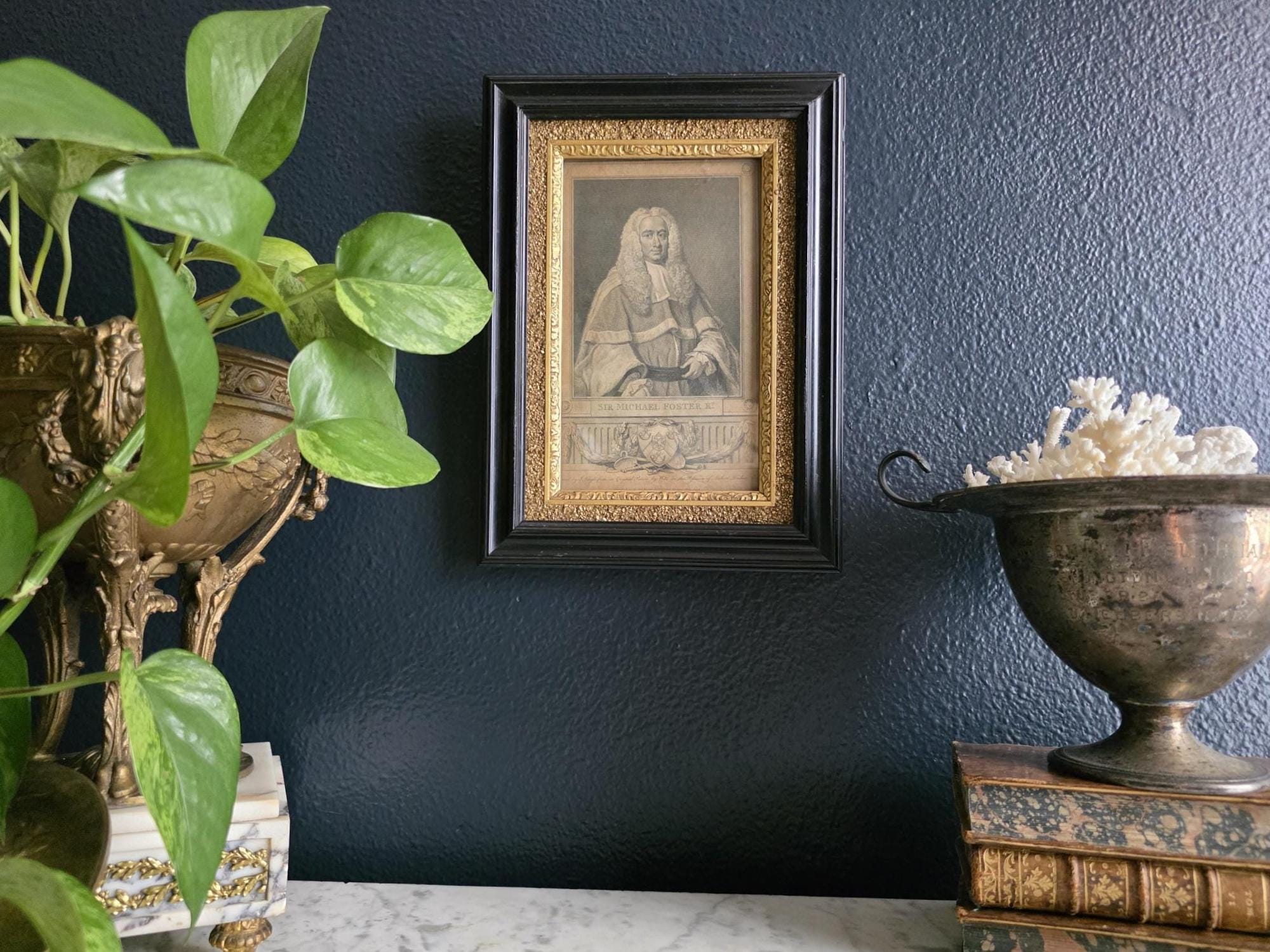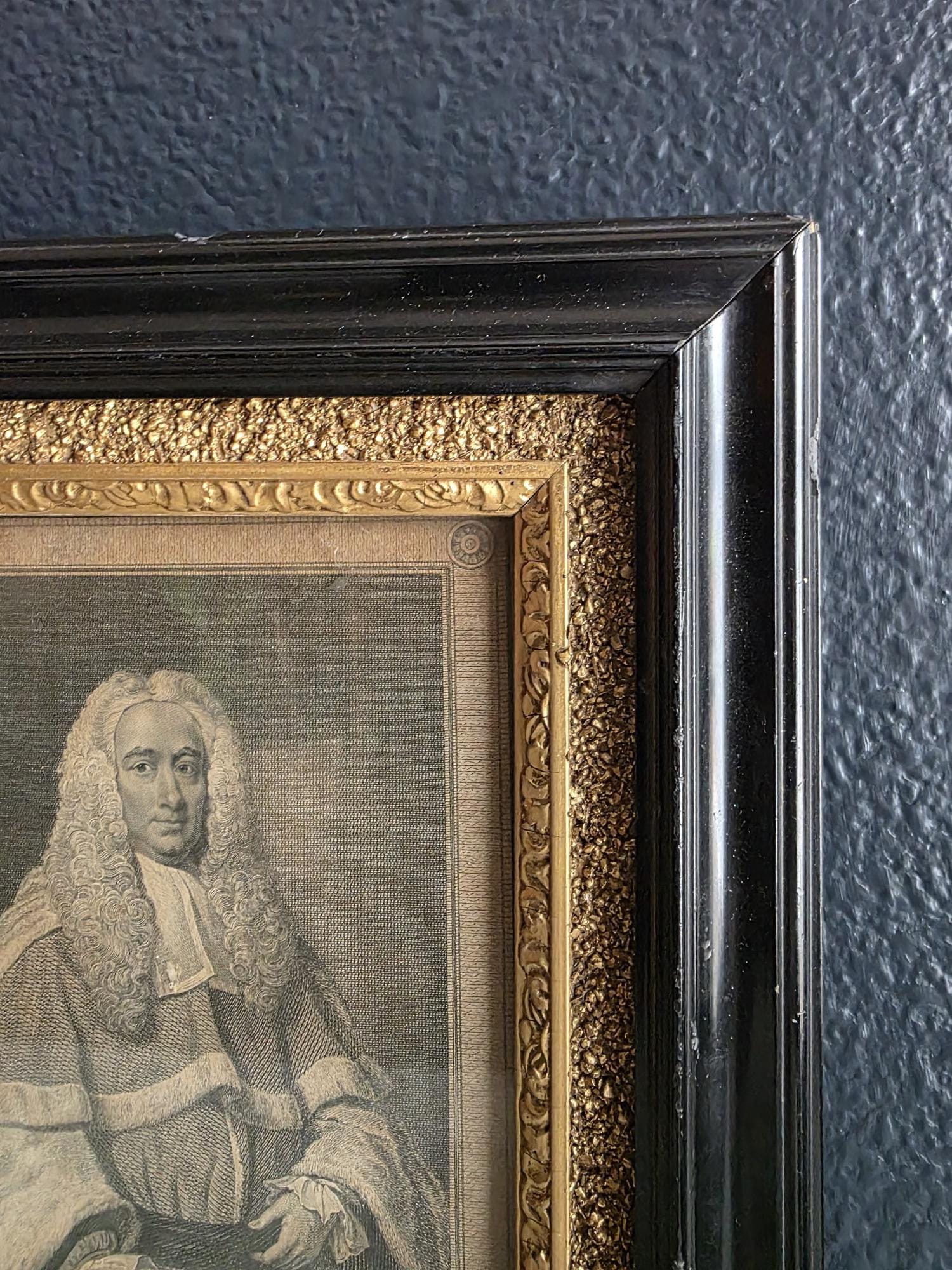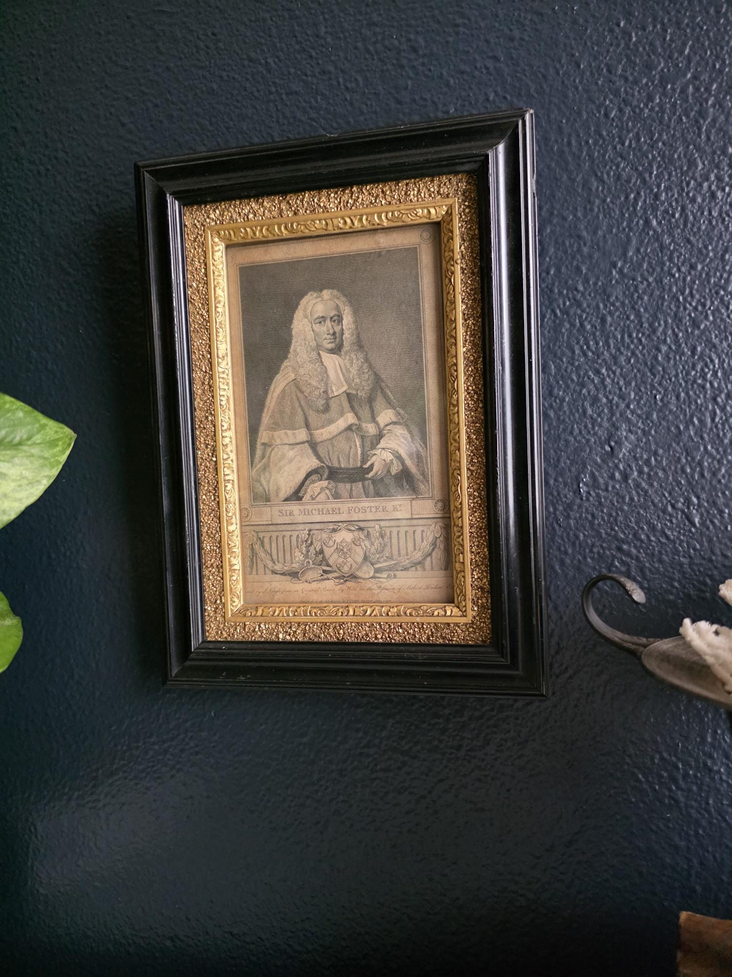 Presenting an exquisite late 18th-century framed engraving of Sir Michael Foster, Kt., a distinguished piece of British legal history officially published by T. Cadell of the Strand on July 1, 1793. Engraved by J. Neagle from an original painting by Wills, the portrait captures the eminent judge in his traditional judicial wig and robes, positioned elegantly above a finely detailed heraldic shield and banner. The engraving is handsomely housed in an antique ebonized wood frame featuring a striking, highly textured early brutalist style gilt inner border. Notably, the frame itself boasts its own rich history; the reverse bears the early trade label of "Geo Hughes, Carver, Gilder & Picture Frame Manufacturer" at 46 Pilgrim Street in Newcastle upon Tyne. This specific address dates the gallery's expert reframing of this piece precisely to the late Victorian era, between 1890 and 1899, just before Hughes expanded to a larger premises. The piece exhibits wonderful authentic age, with minor expected wear and small chips to the black finish of the frame that only enhance its historical character. Backed with a solid wood panel secured by old square brads and retaining its original twisted hanging wire, this handsome portrait is a superb, ready-to-hang find for collectors of antiquarian prints, 18th-century engravings, or legal memorabilia.