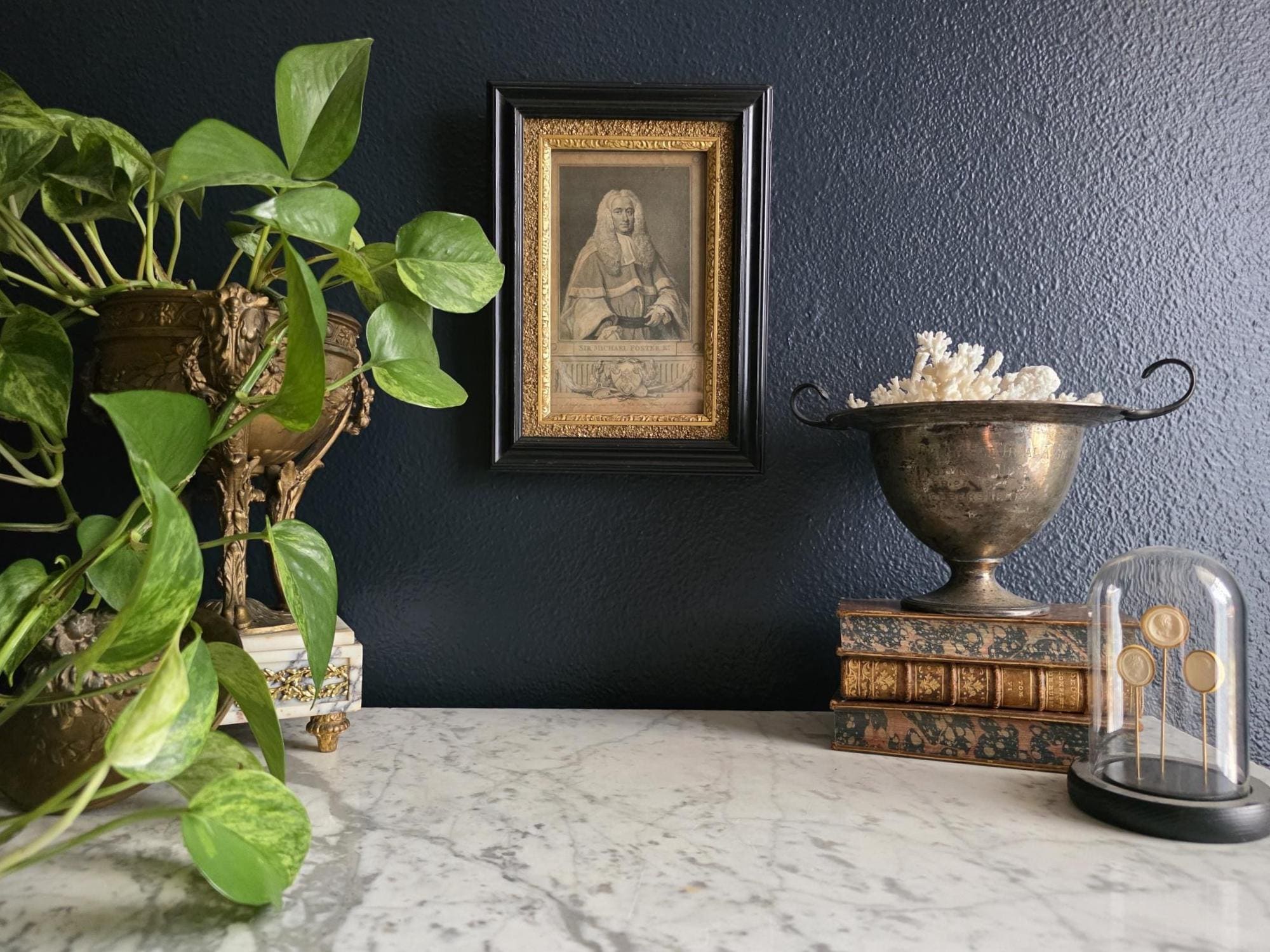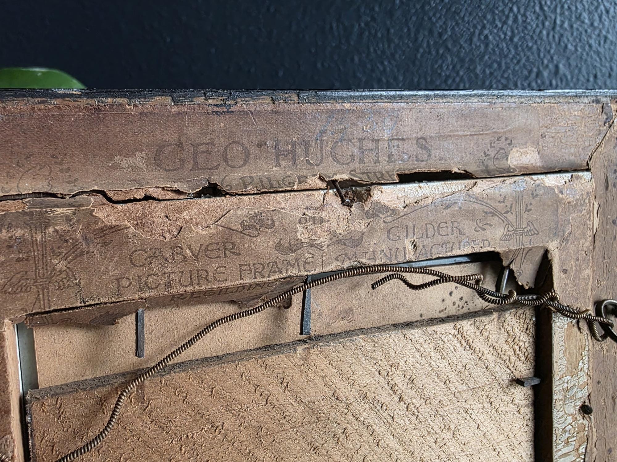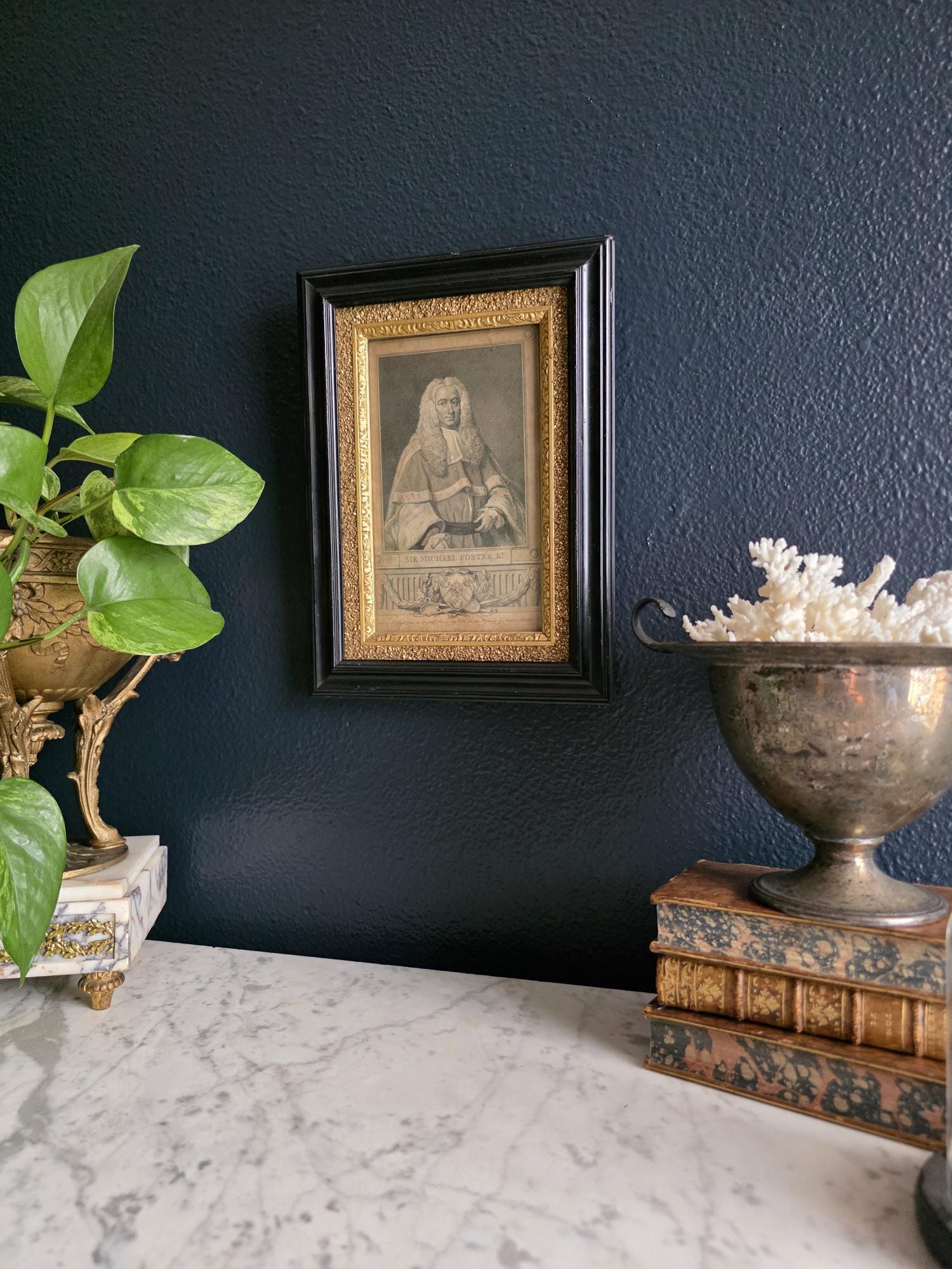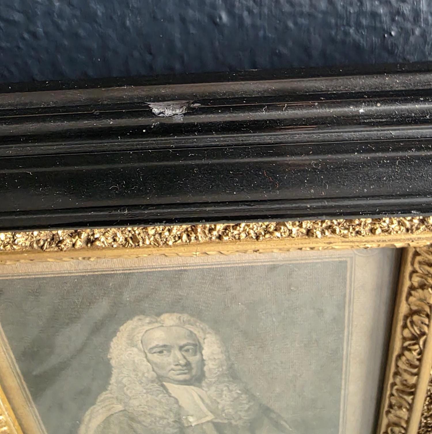 Presenting an exquisite late 18th-century framed engraving of Sir Michael Foster, Kt., a distinguished piece of British legal history officially published by T. Cadell of the Strand on July 1, 1793. Engraved by J. Neagle from an original painting by Wills, the portrait captures the eminent judge in his traditional judicial wig and robes, positioned elegantly above a finely detailed heraldic shield and banner. The engraving is handsomely housed in an antique ebonized wood frame featuring a striking, highly textured early brutalist style gilt inner border. Notably, the frame itself boasts its own rich history; the reverse bears the early trade label of "Geo Hughes, Carver, Gilder & Picture Frame Manufacturer" at 46 Pilgrim Street in Newcastle upon Tyne. This specific address dates the gallery's expert reframing of this piece precisely to the late Victorian era, between 1890 and 1899, just before Hughes expanded to a larger premises. The piece exhibits wonderful authentic age, with minor expected wear and small chips to the black finish of the frame that only enhance its historical character. Backed with a solid wood panel secured by old square brads and retaining its original twisted hanging wire, this handsome portrait is a superb, ready-to-hang find for collectors of antiquarian prints, 18th-century engravings, or legal memorabilia.