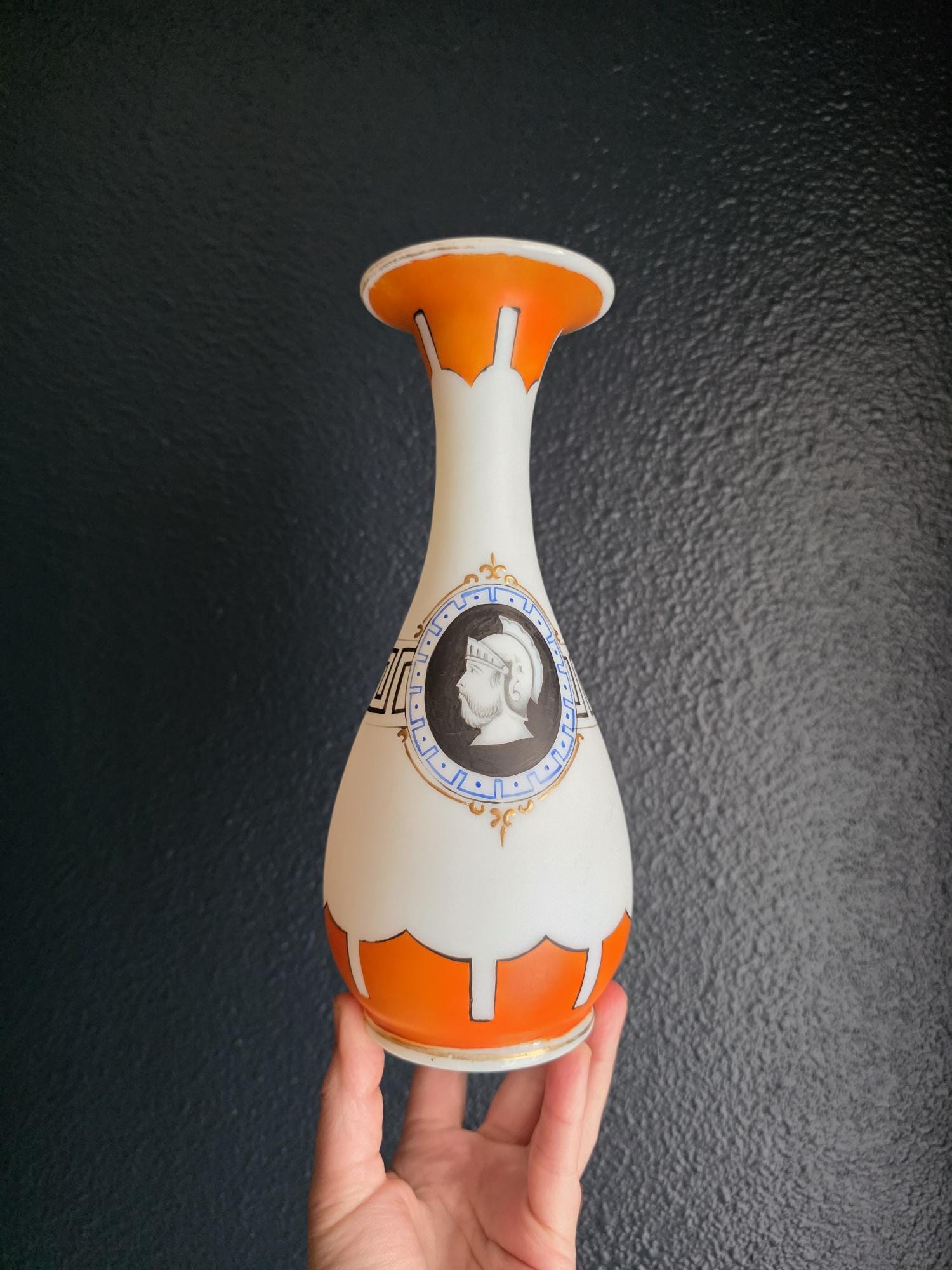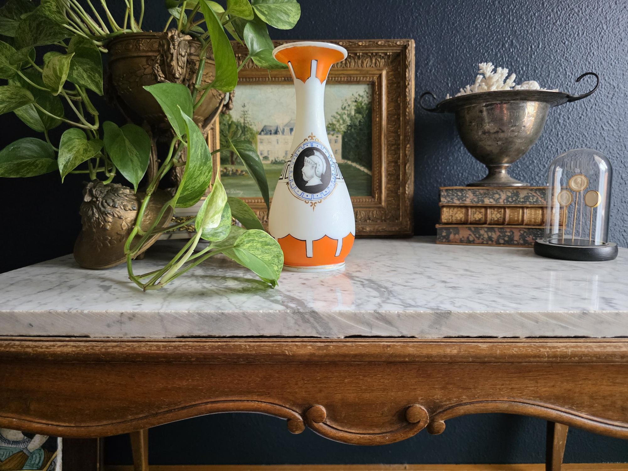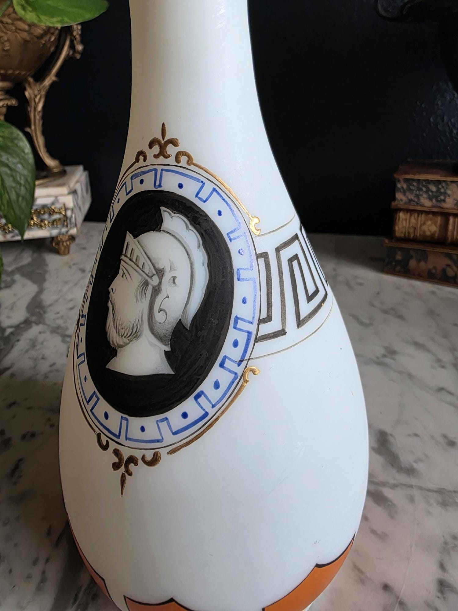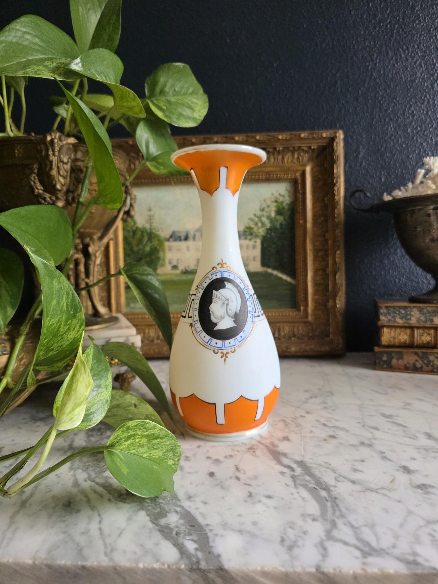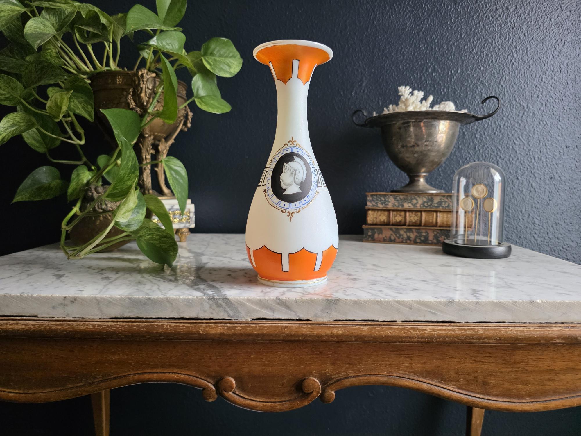 Presenting a striking 1860s hand-blown vessel, beautifully exhibiting the Neoclassical Revival style popular during the era. This exceptional piece of Victorian Opaline Bristol Glass features a classic silhouette with a flared trumpet neck and a bulbous lower body, vividly adorned with hand-painted orange geometric accents at the rim and base. A stunning central cartouche displays a finely detailed grisaille profile of a helmeted classical warrior, framed by a patterned blue border with delicate gilt flourishes. This focal point is anchored by a bold, hand-painted black Greek key band circling the neck, giving the piece a distinct Etruscan influence. The semi-opaque glass itself possesses the characteristic milky translucence prized by collectors, and the underside displays a rough pontil scar—a definitive mark of mid-19th-century artisanal glassblowing. Standing out as a highly desirable example among Antique Bristol Glass Portrait Vases, its exquisite enamel work, material quality, and striking historical themes make this English vessel a superb Neoclassical collector's piece. The guilt details around the rim of the vase and body have worn overtime and is now missing in some places.